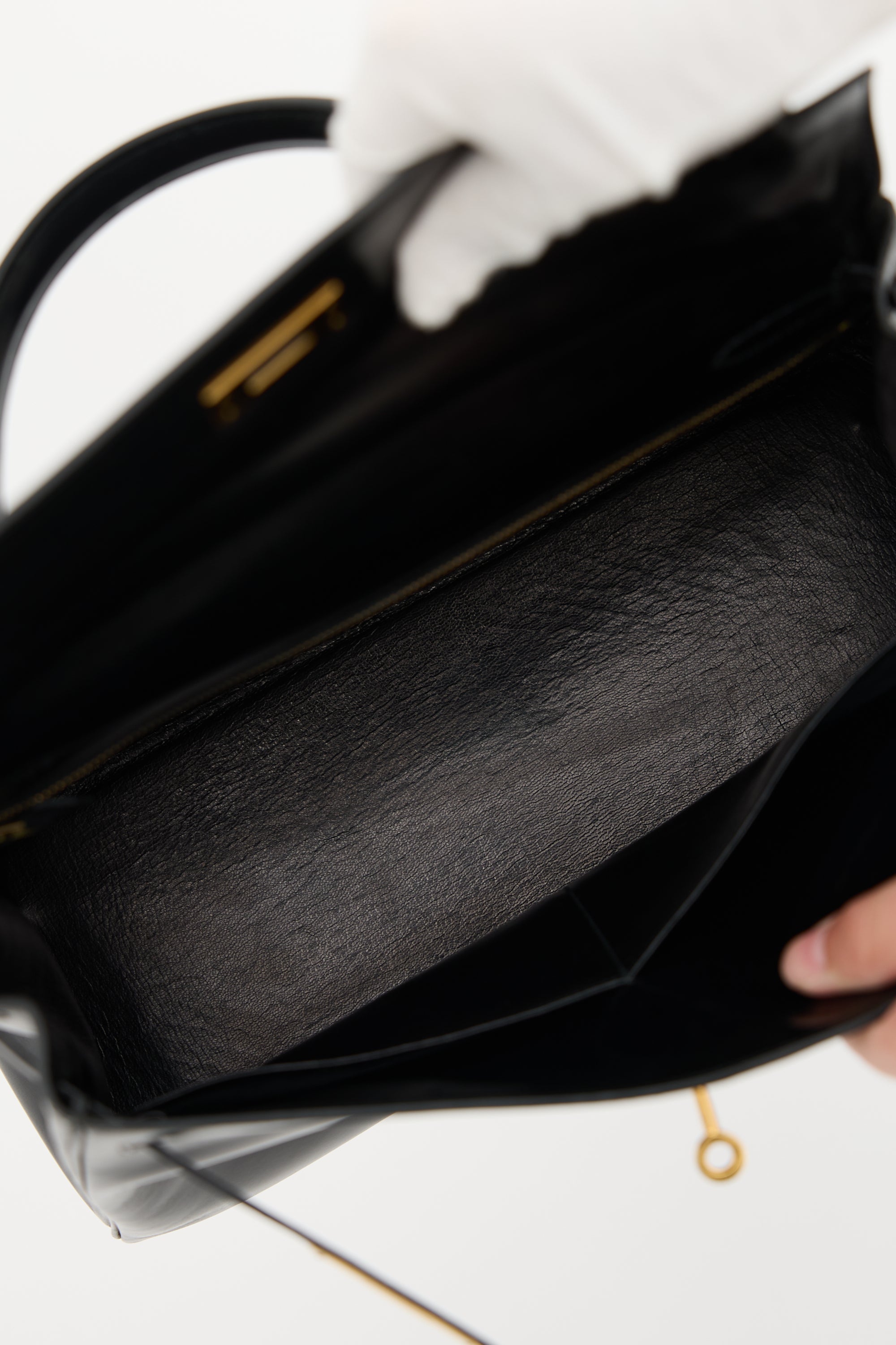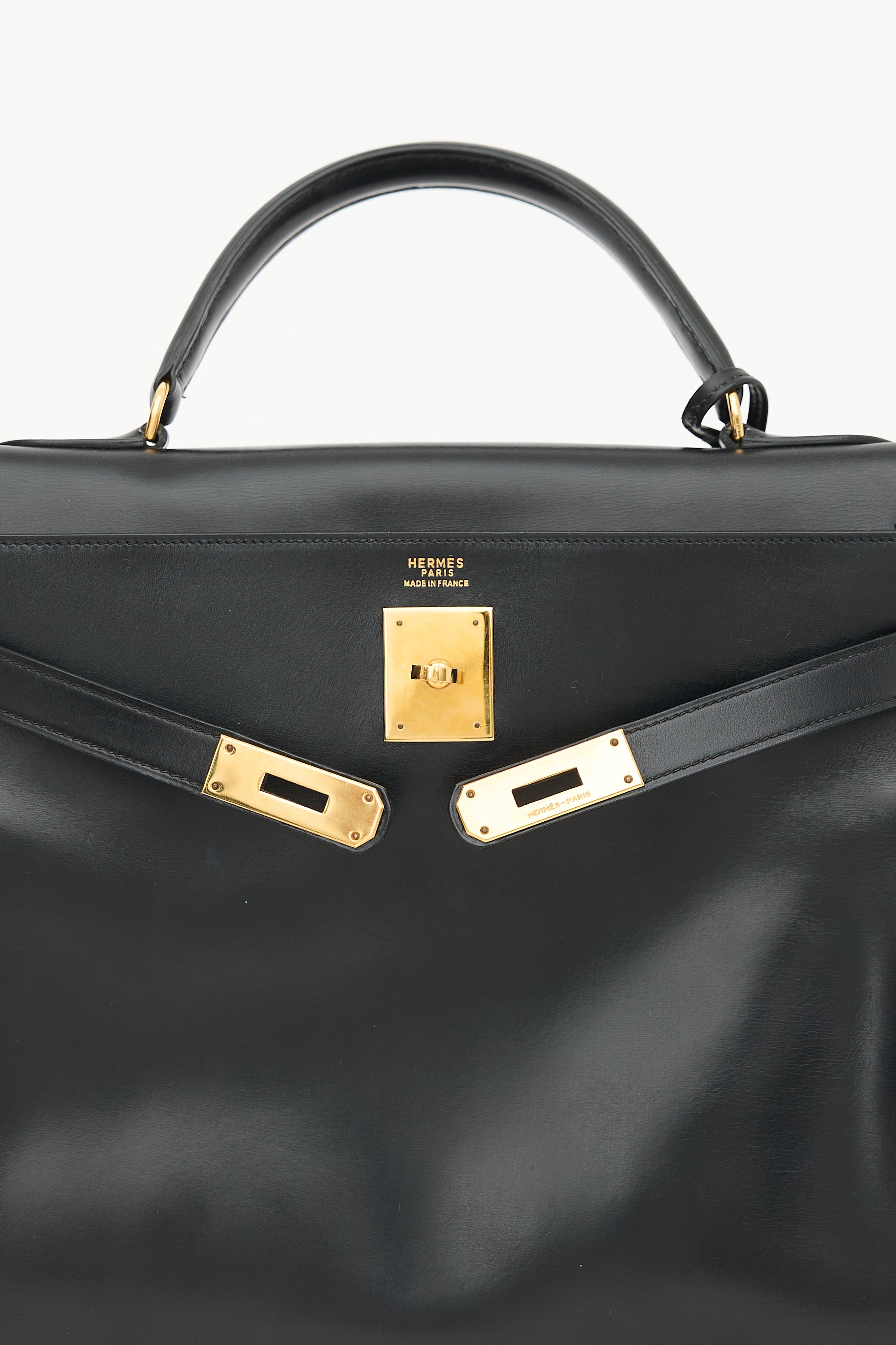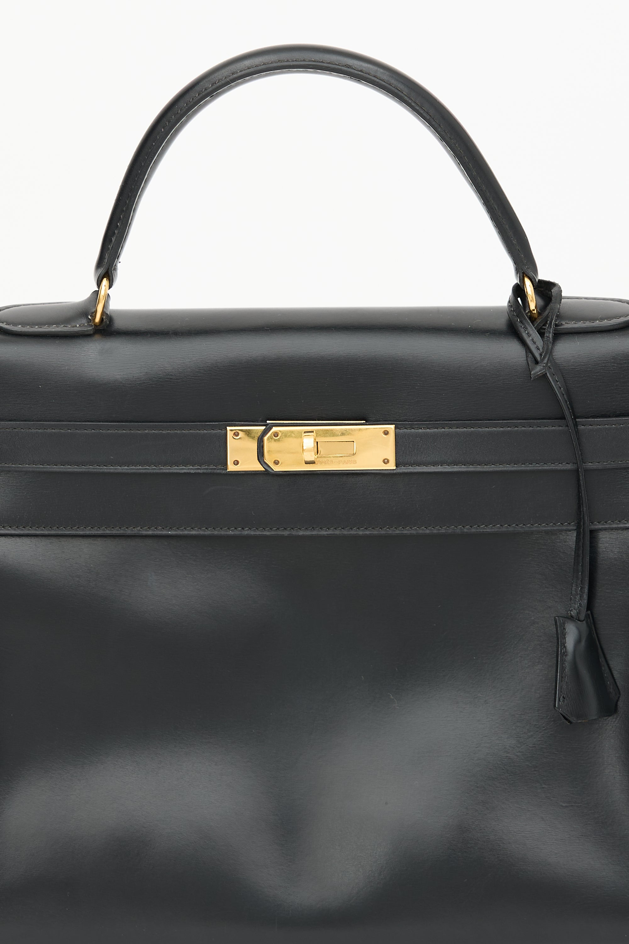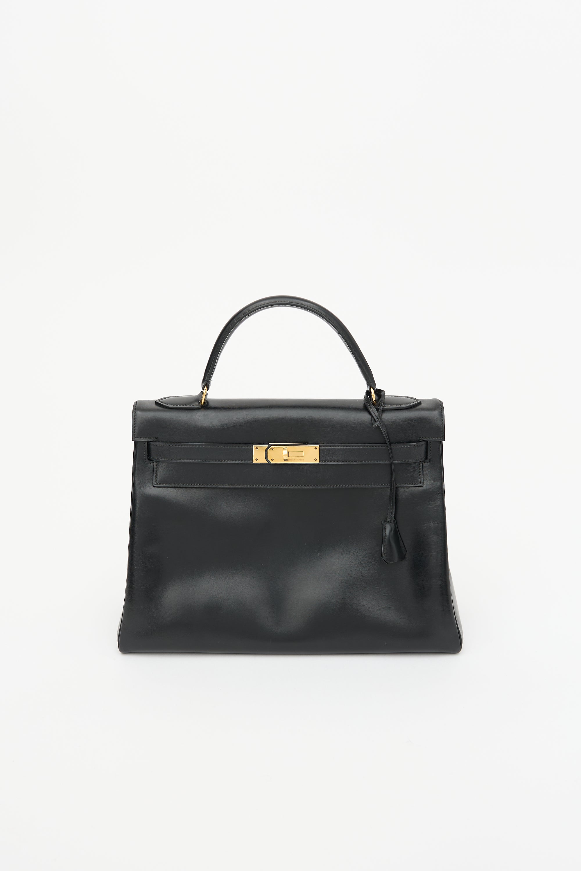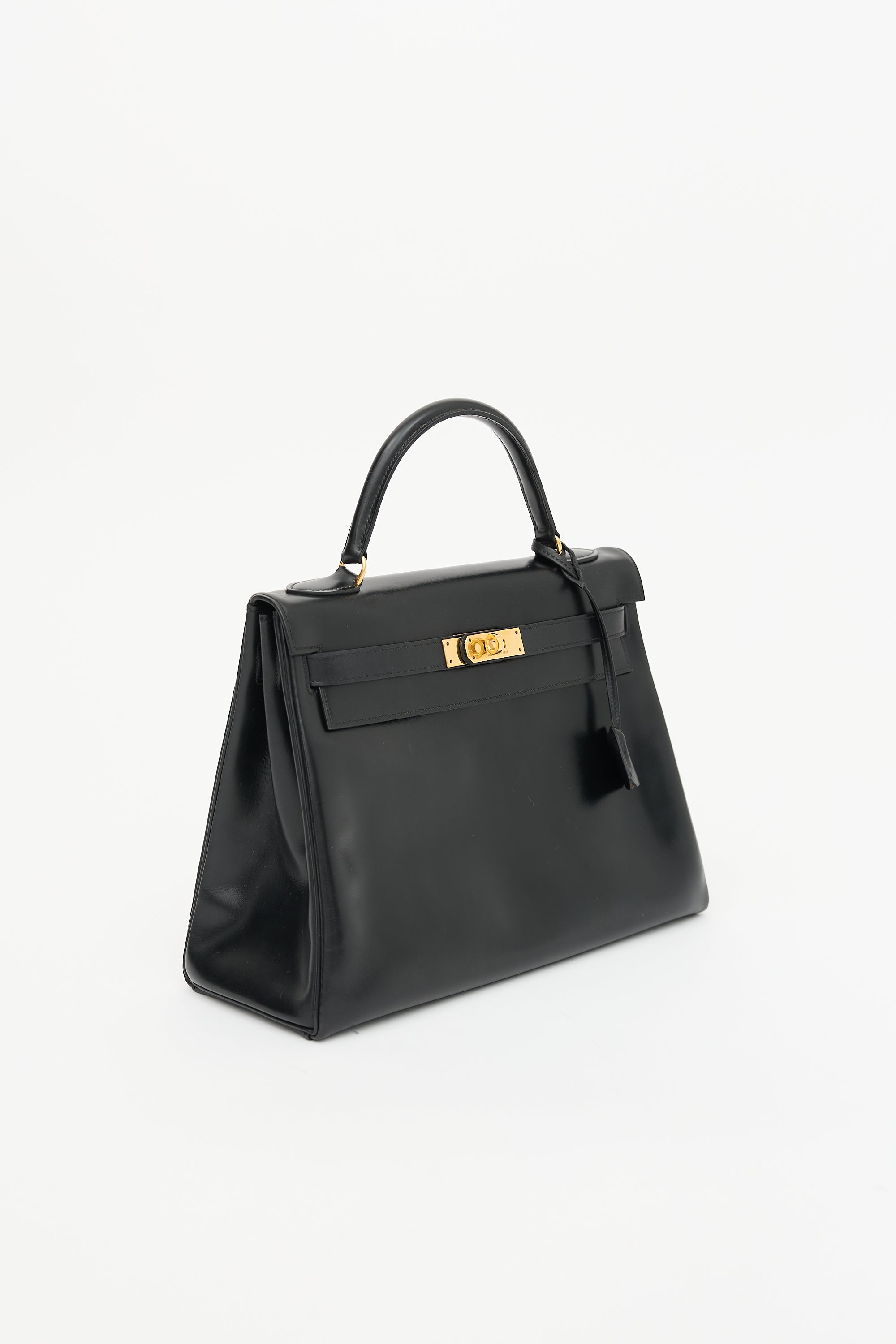 Pre-owned Hermès vintage Kelly Sellier 32 bag in Noir H Box leather featuring a single rolled top handle, gold plated hardware, gold stamped logo under flap, dual sangles, signature twist lock closure, logo engraved plaque, four clou, detachable tiret and key clochette, and one main compartment with two slip pockets and one zip pocket. Comes with original dust bag.