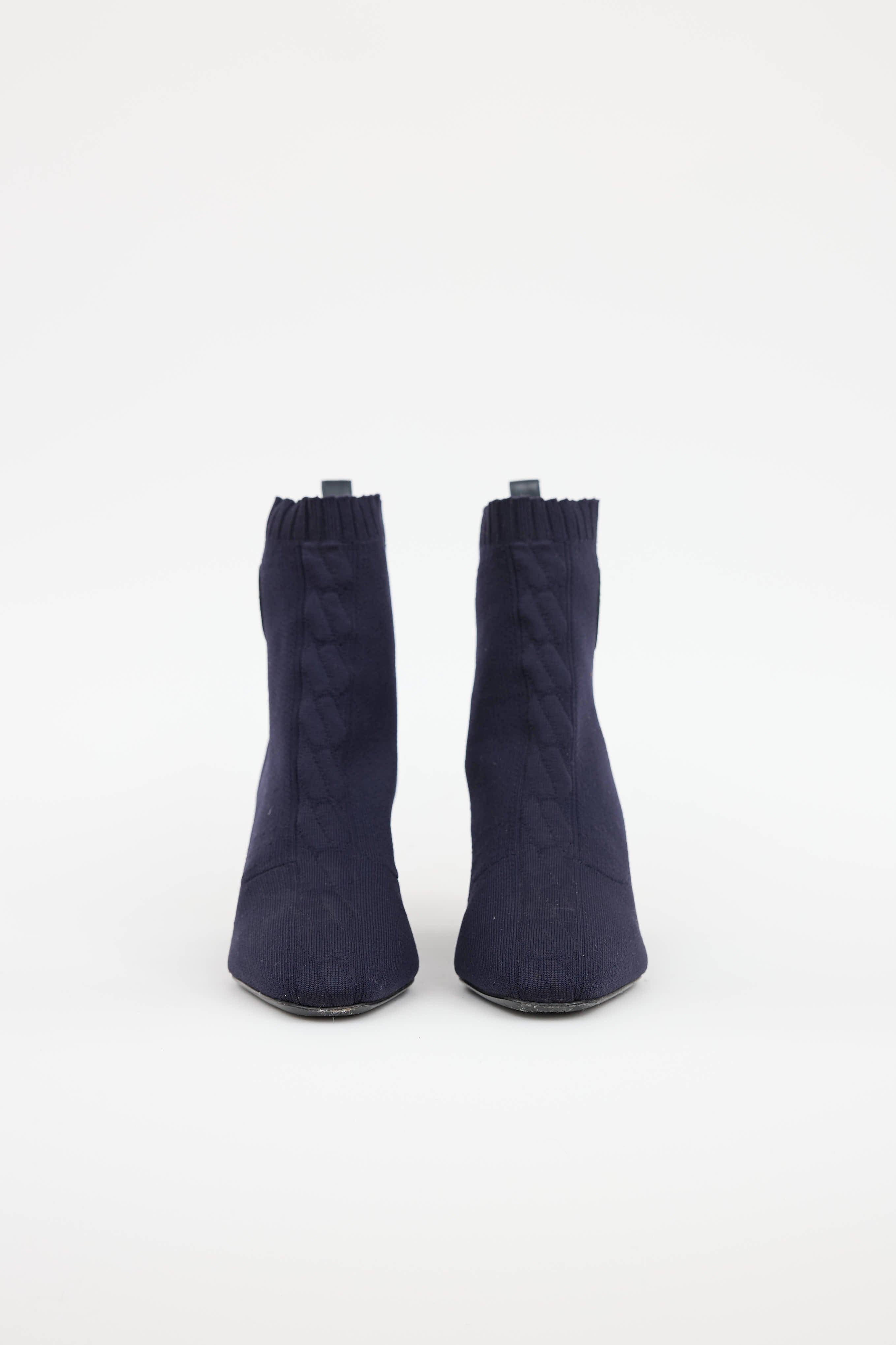 Pre-owned Hermès navy Volver 60 knit ankle boot featuring square toe, knit upper, embossed leather logo patch at side, leather pull tab at counter, and stacked heel with horseshoe detail.