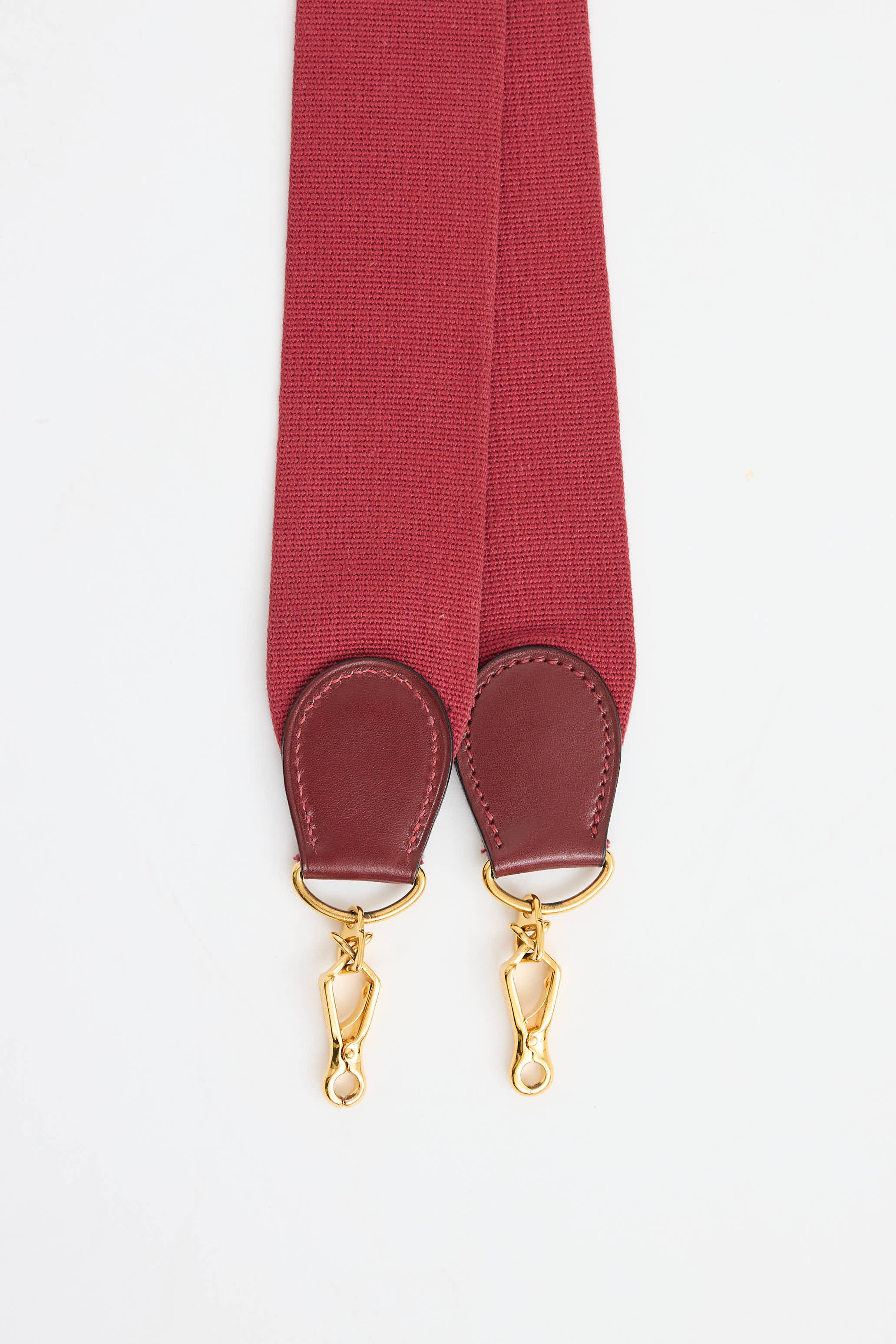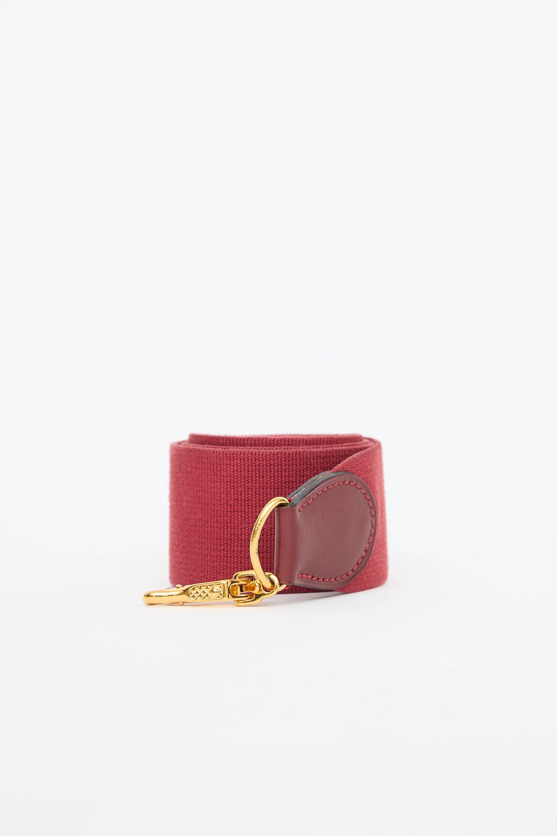 Pre-owned Hermès burgundy webbed canvas strap featuring gold tone hardware, leather trim at ends, and clasp closure.