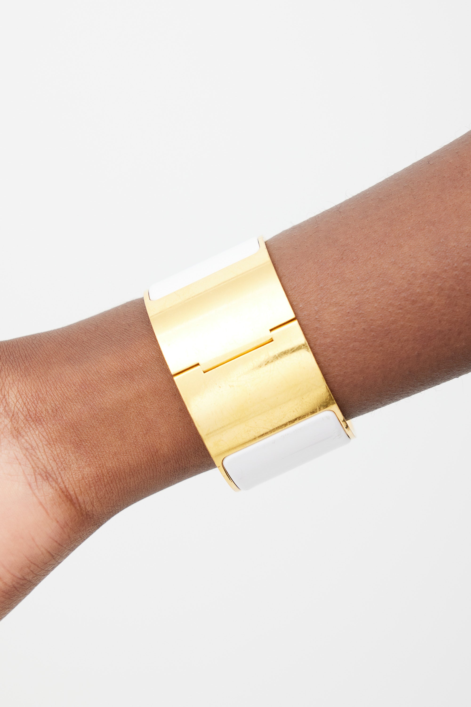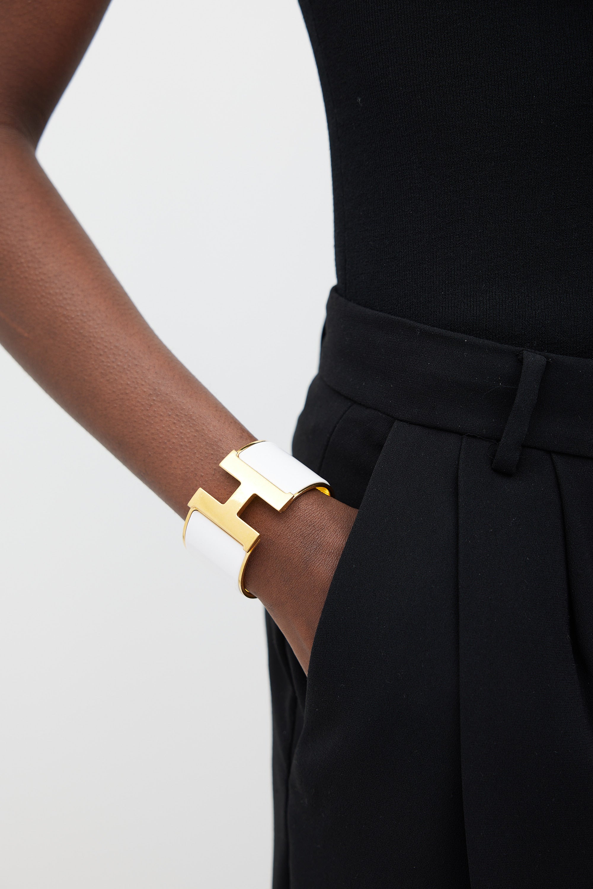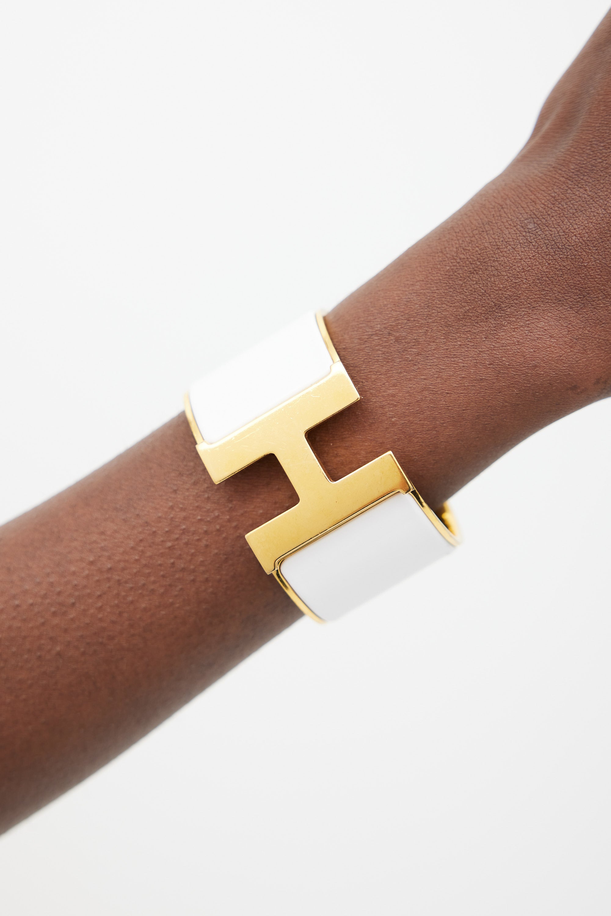 Pre-owned Hermès Clic H XL bracelet featuring a wide white enamel and gold tone plated band, hinge, and H twist clasp. "HERMES" stamped at interior.