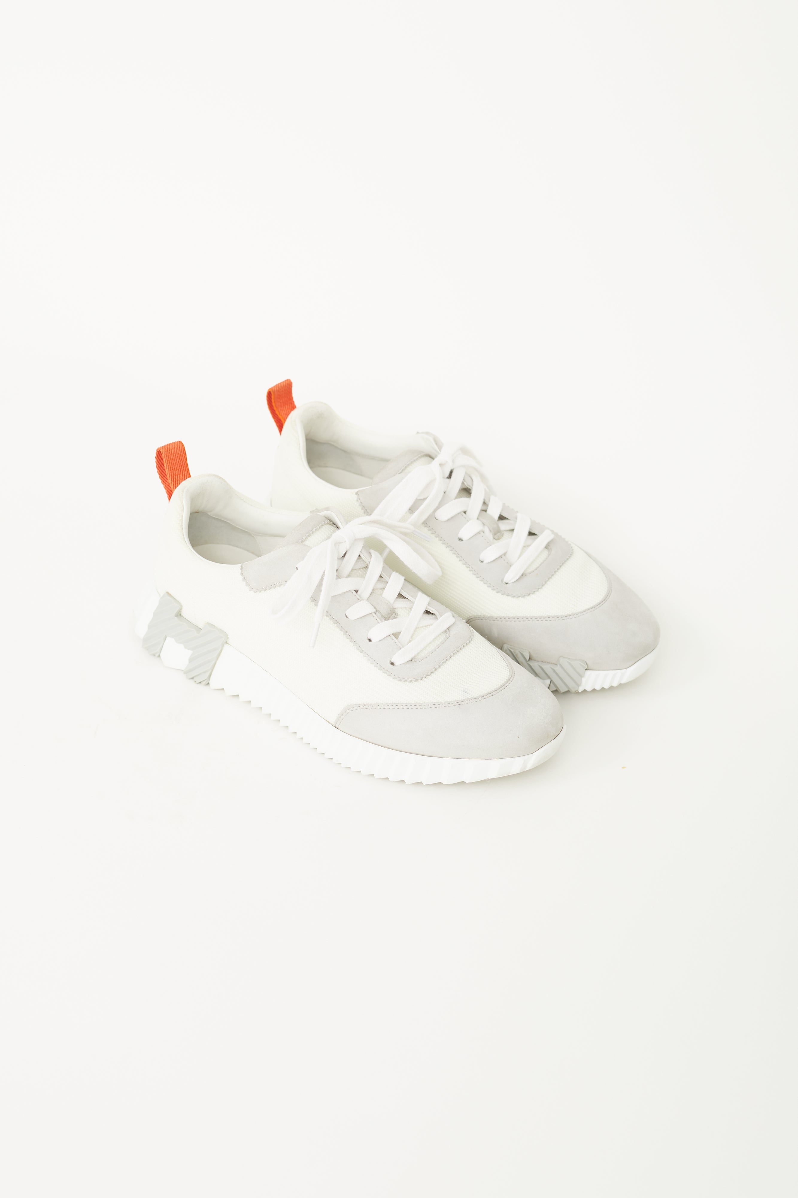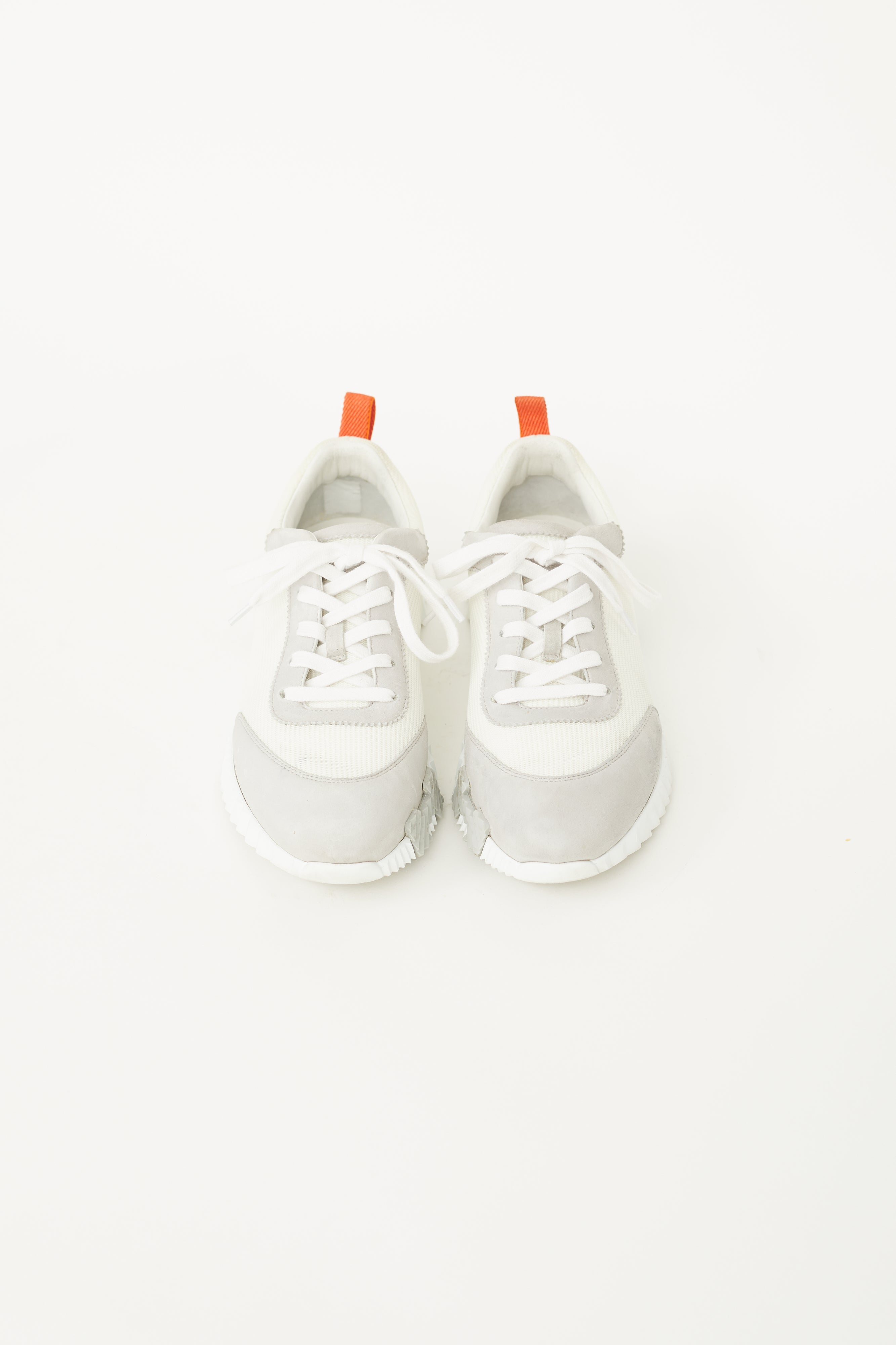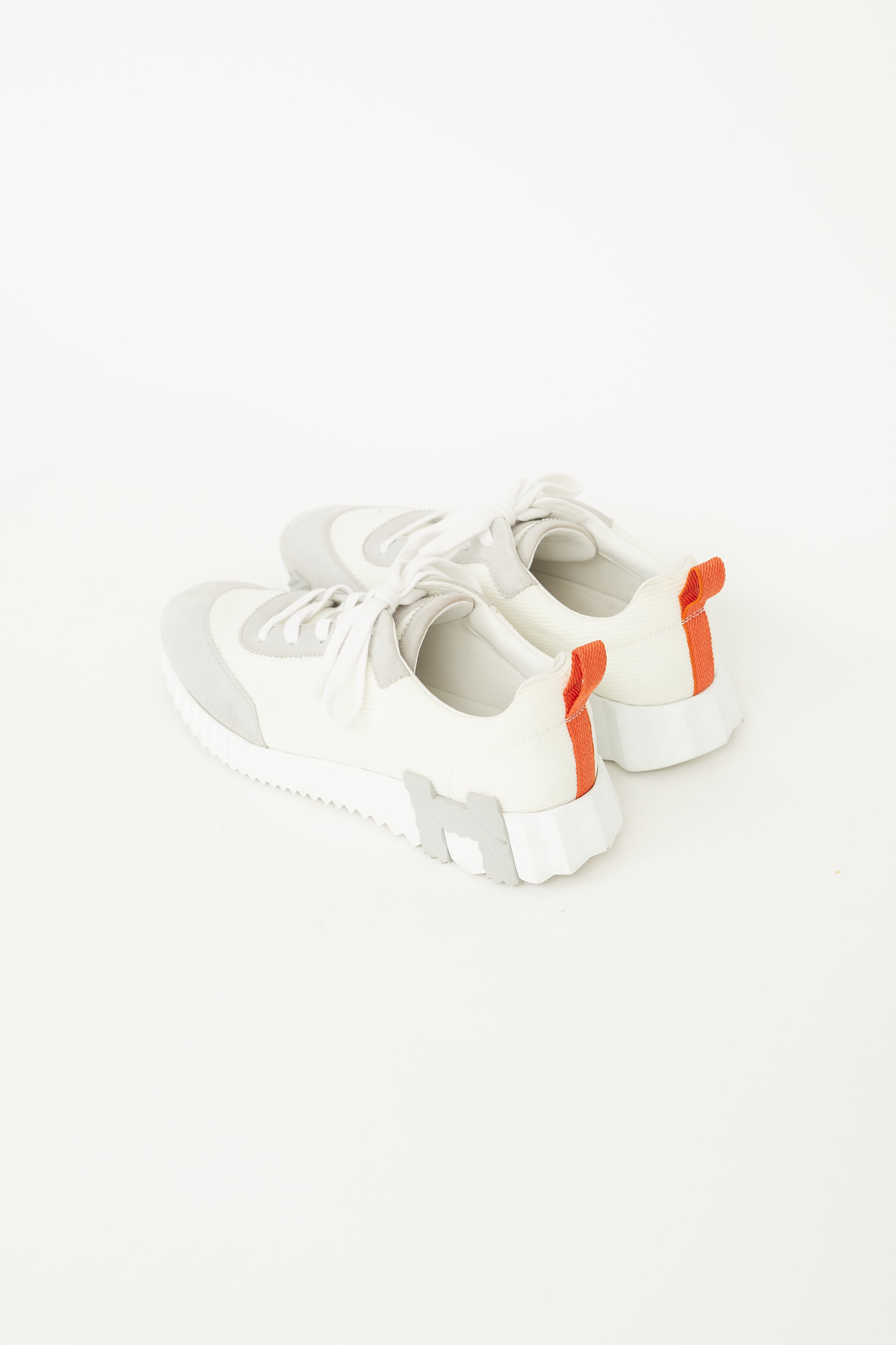 Pre-owned Hermès white, grey and orange Femme Bouncing sneaker featuring lace-up entry at vamp, white and grey contrasting design, orange pull-loop at upper back and white rubber sole with grey H rubber inserts.