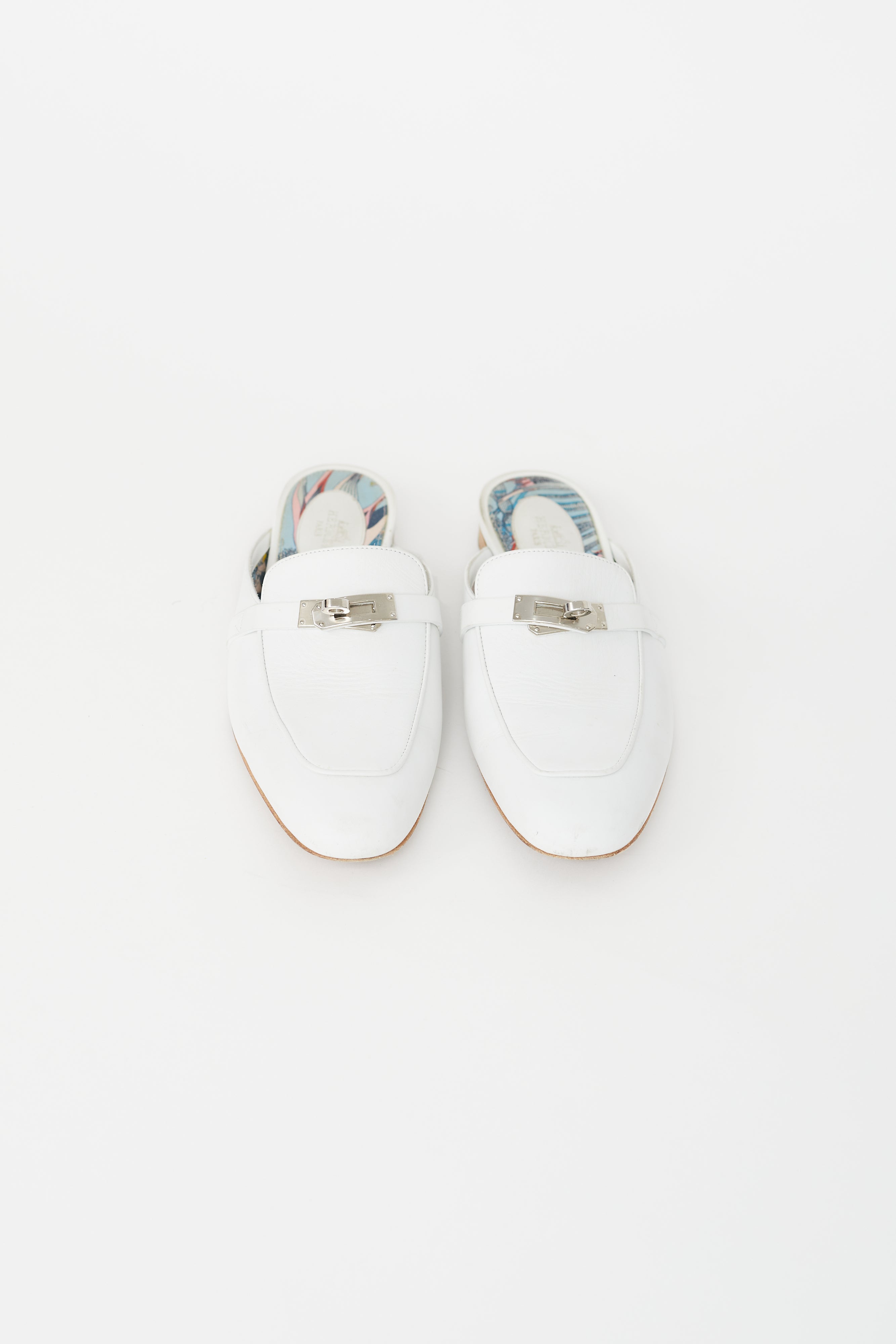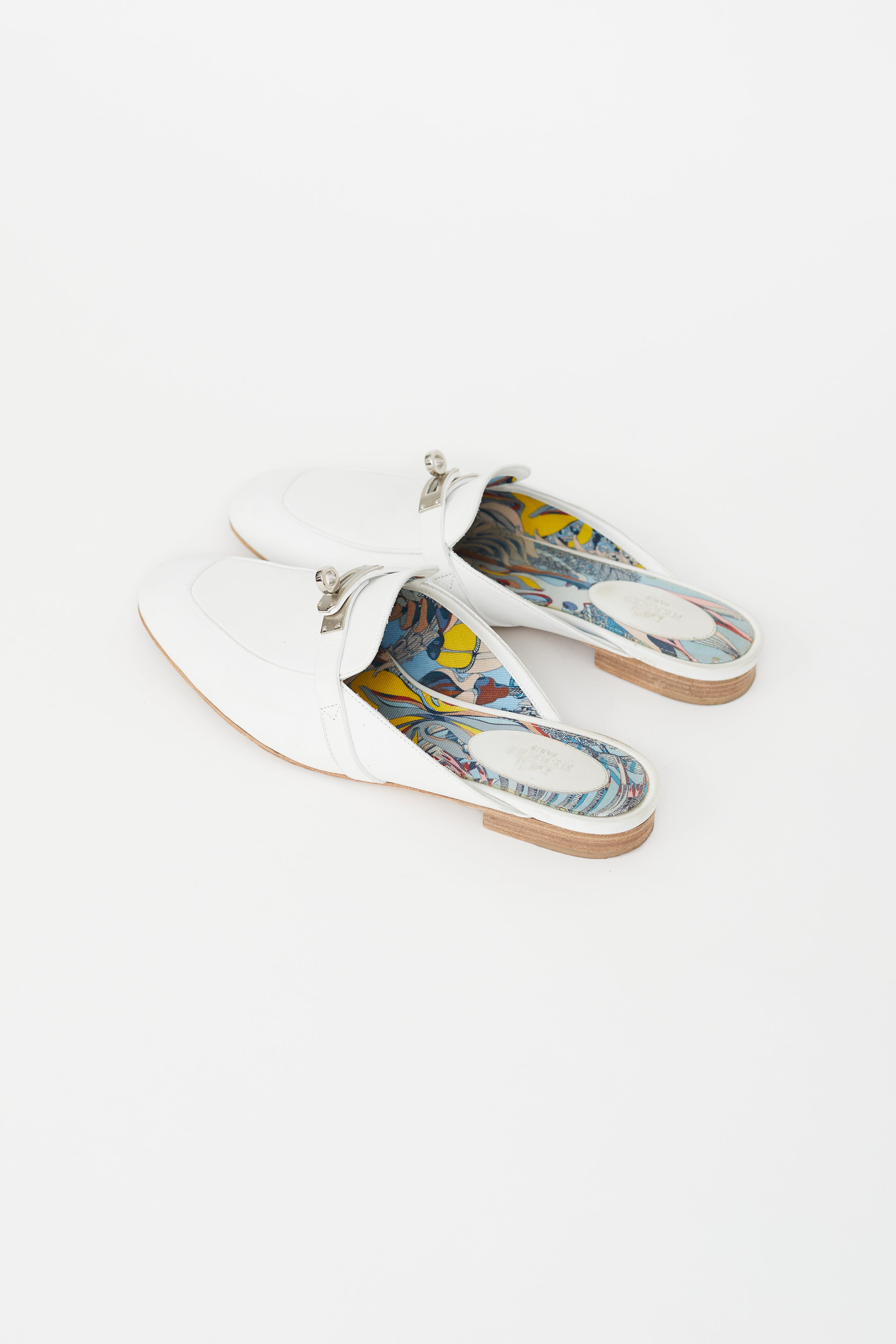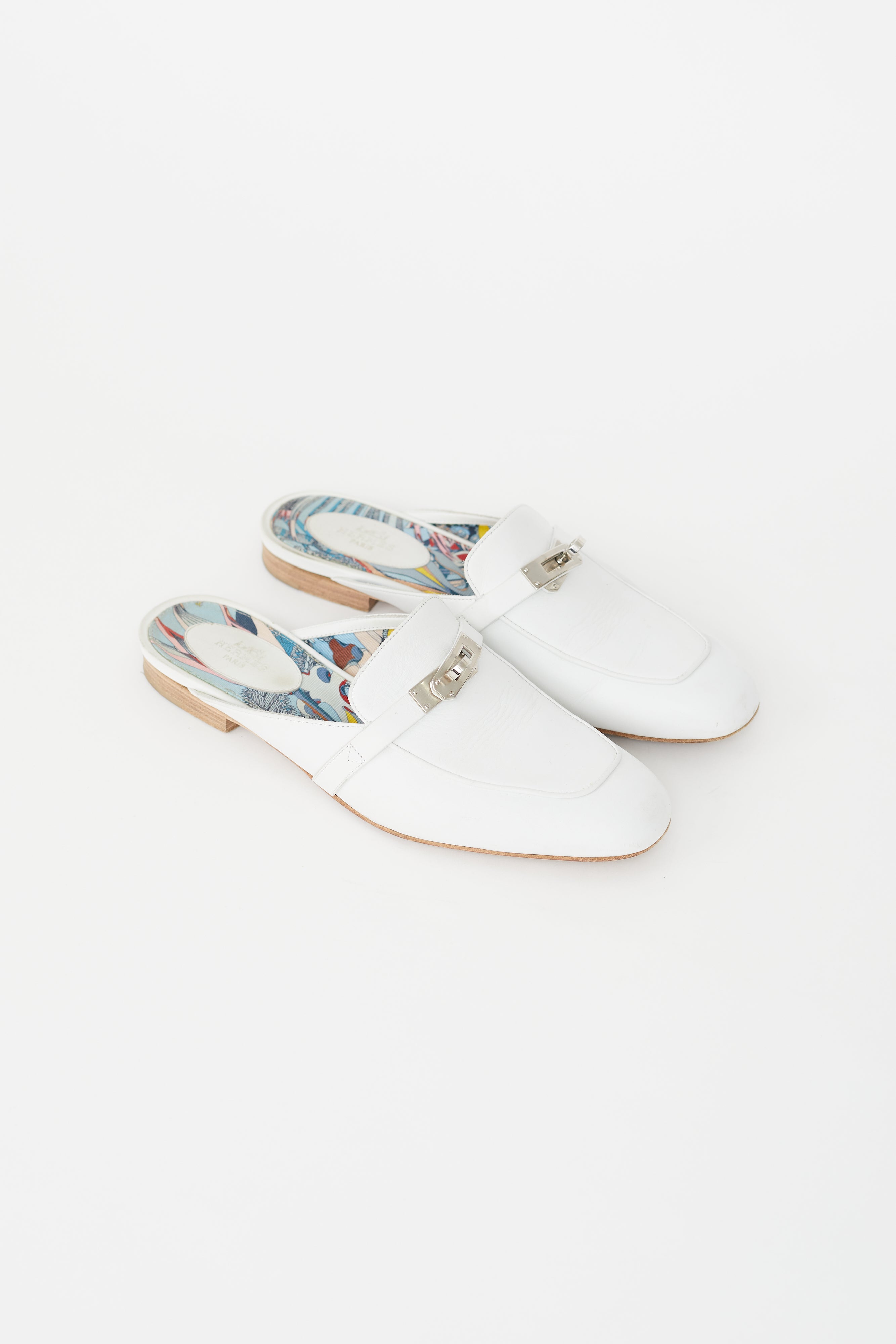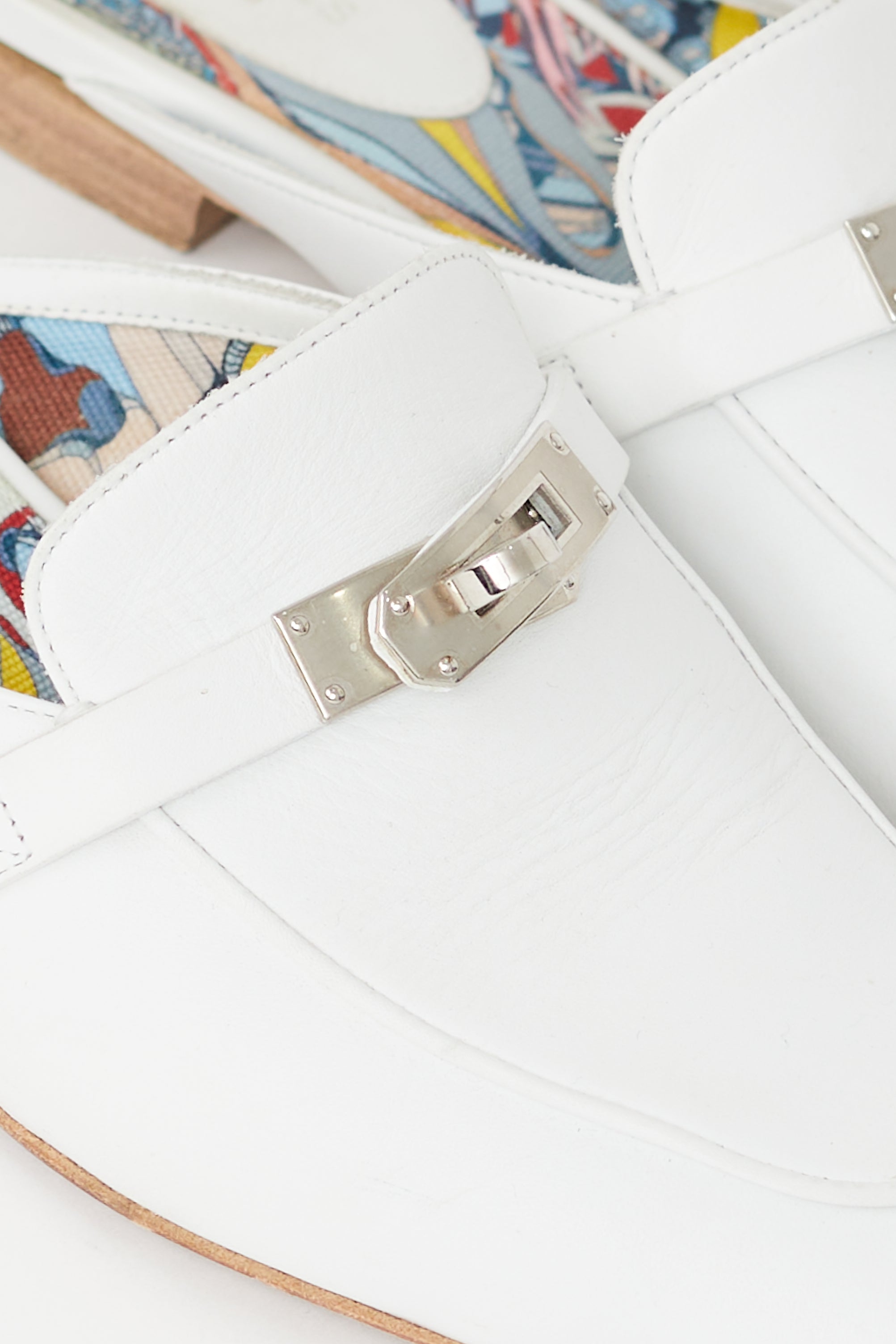 Pre-owned Hermes white leather Oz loafer mule featuring a narrow square toe, silver tone turn lock closure at vamp, white leather upper, colourful patterned interior with embossed logo patch and a slip on entry. Comes with original dust bags.