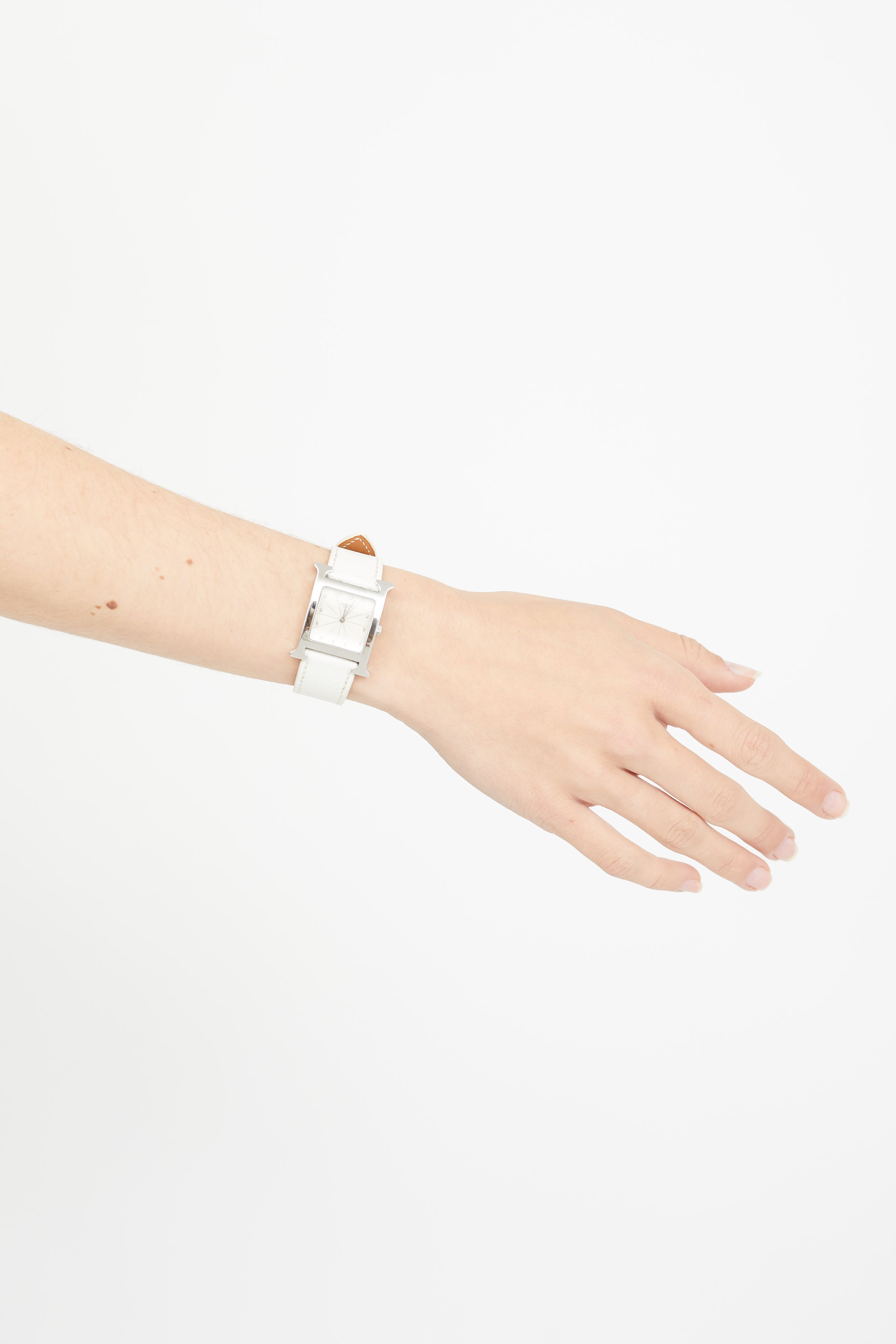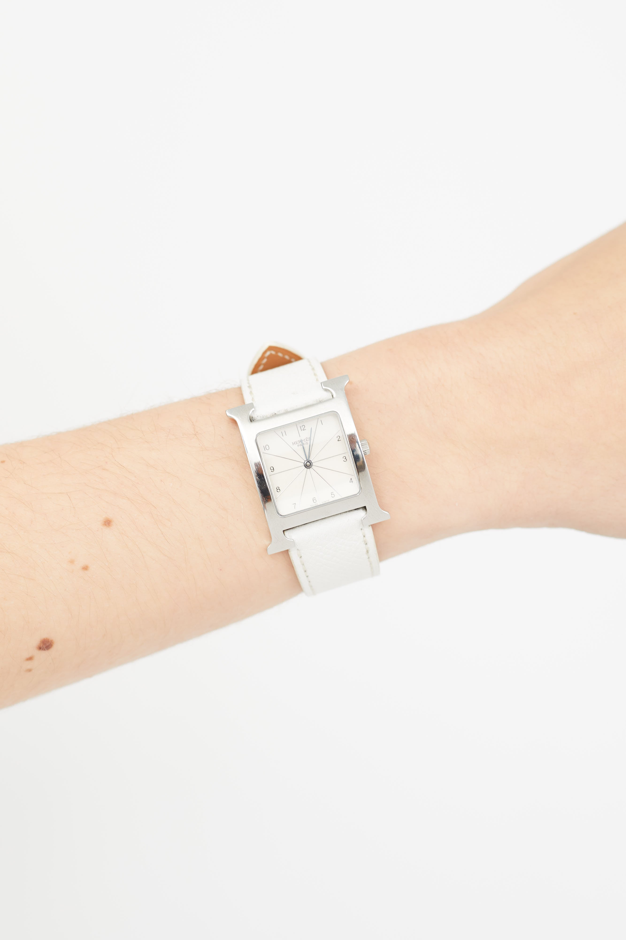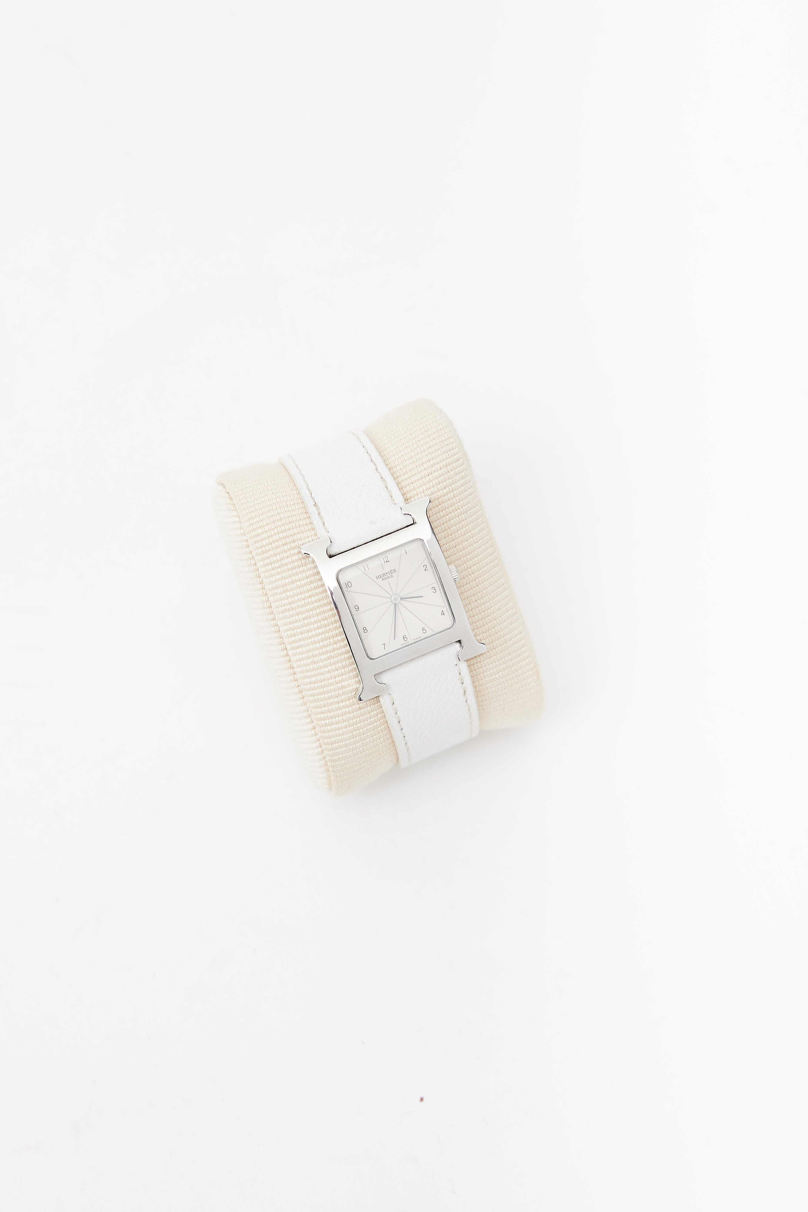 Pre-owned Hermès white leather and silver Small Heure H watch featuring white textured leather strap, white watch face with two hands, silver H shaped face outline and an adjustable strap with silver tone buckle closure. Comes with velvet pouch.