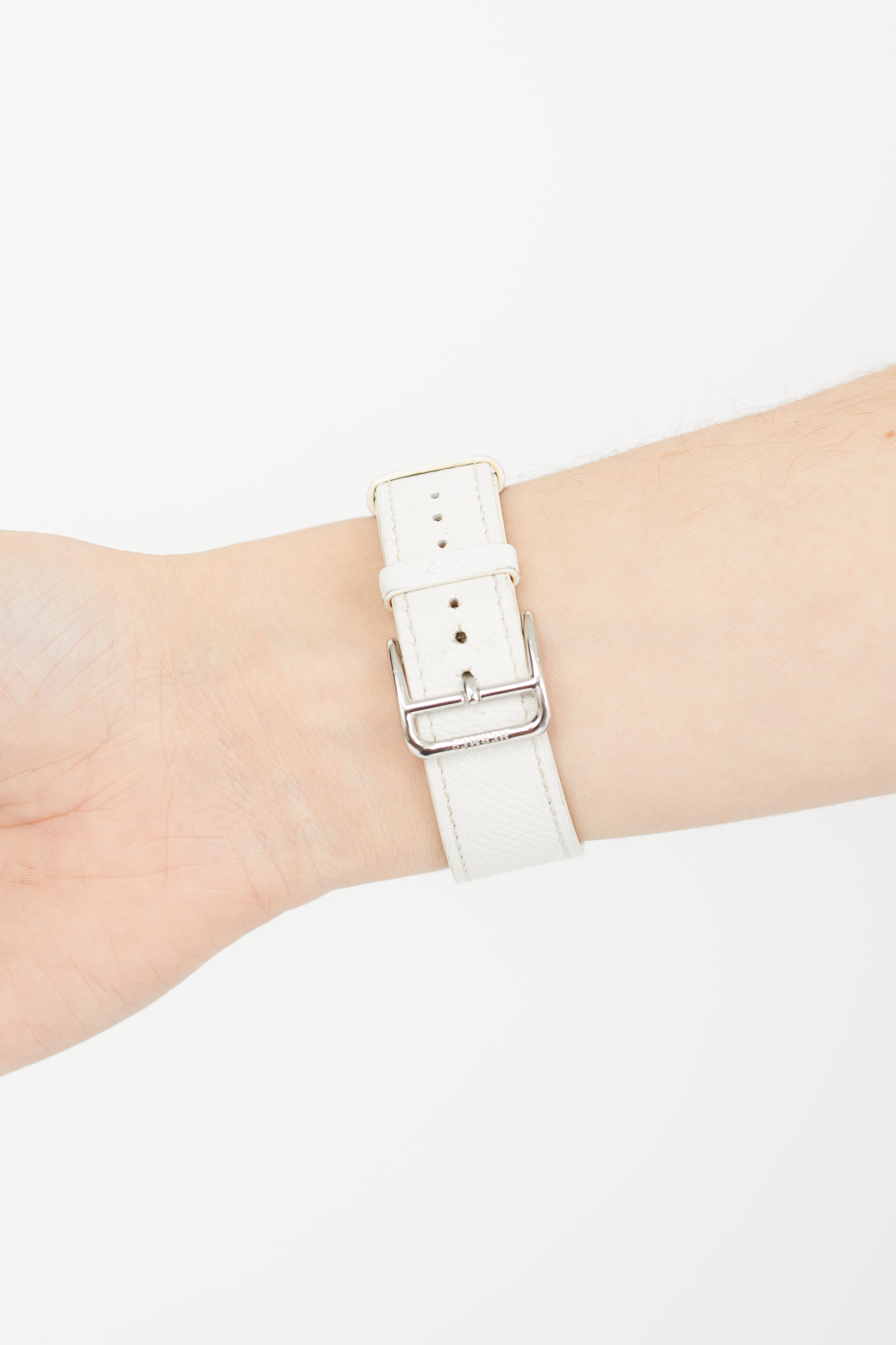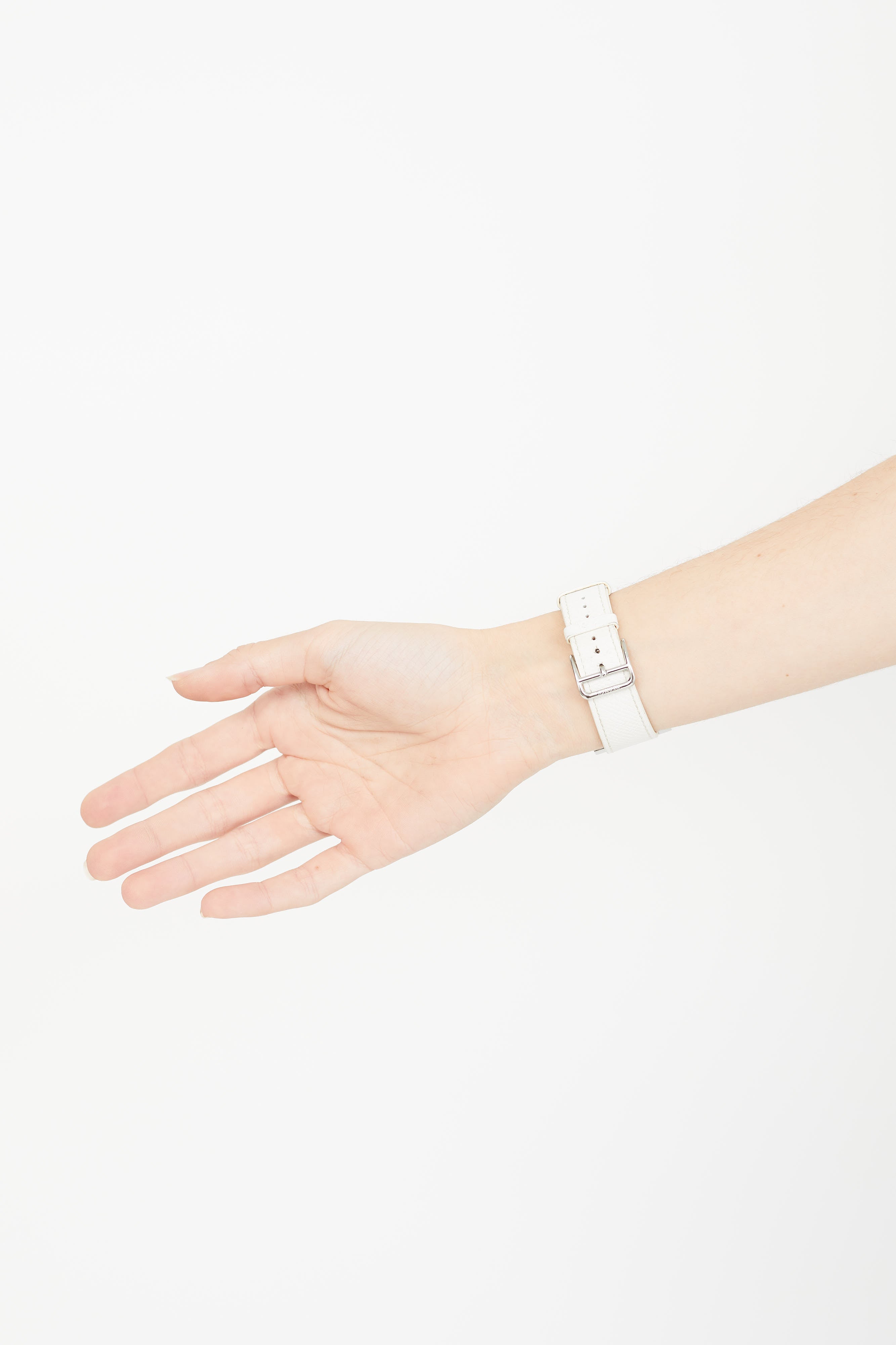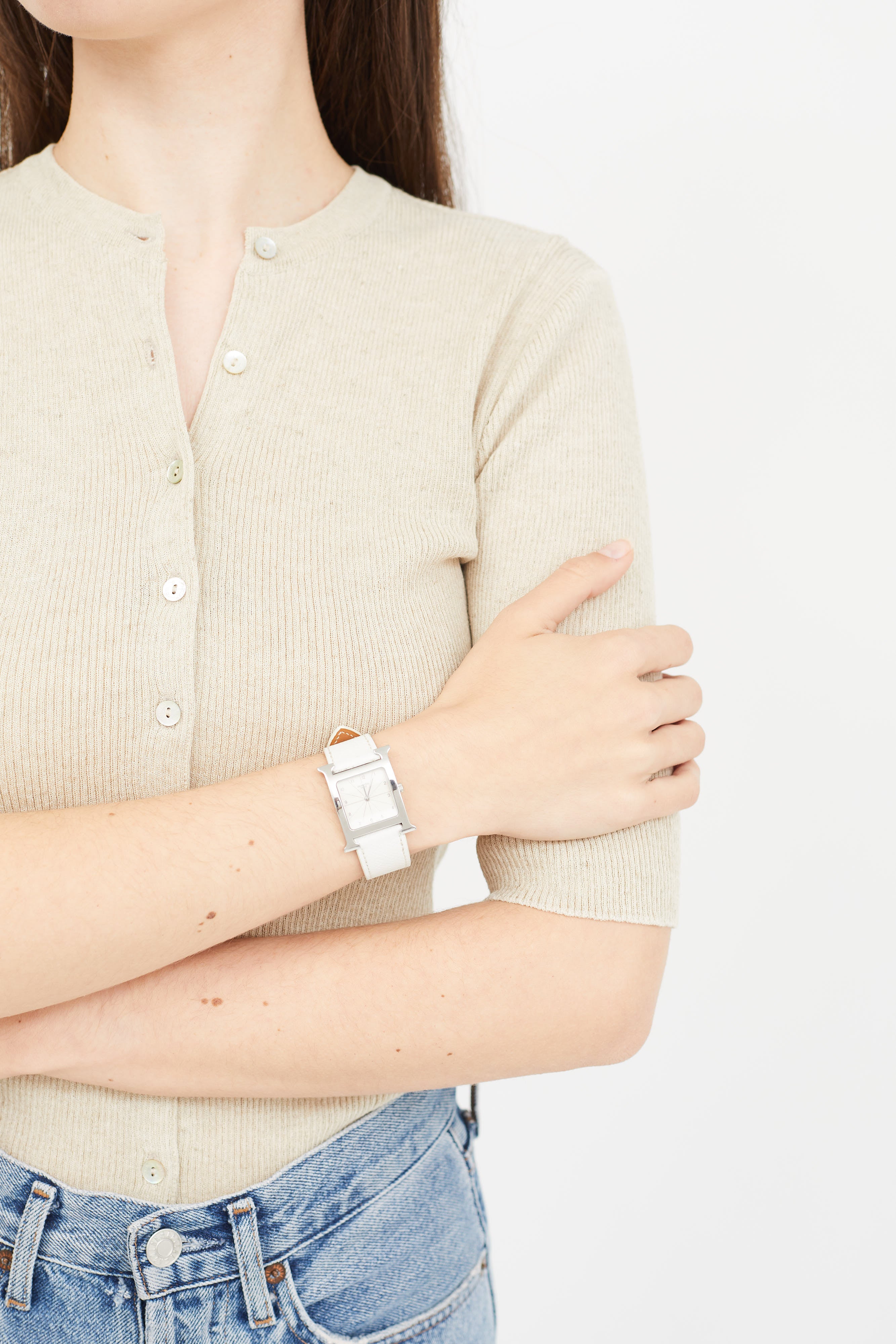 Pre-owned Hermès white leather and silver Small Heure H watch featuring white textured leather strap, white watch face with two hands, silver H shaped face outline and an adjustable strap with silver tone buckle closure. Comes with velvet pouch.