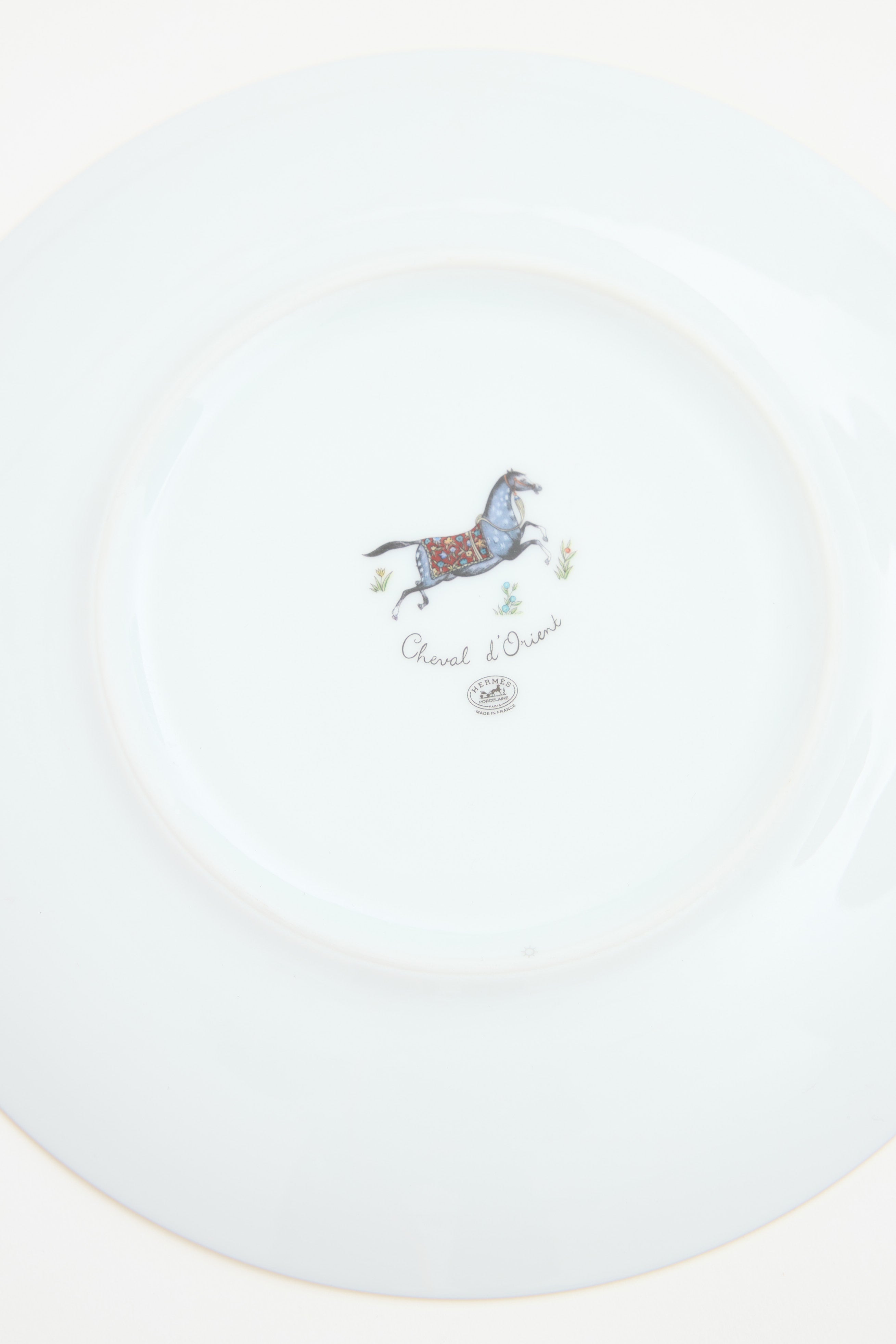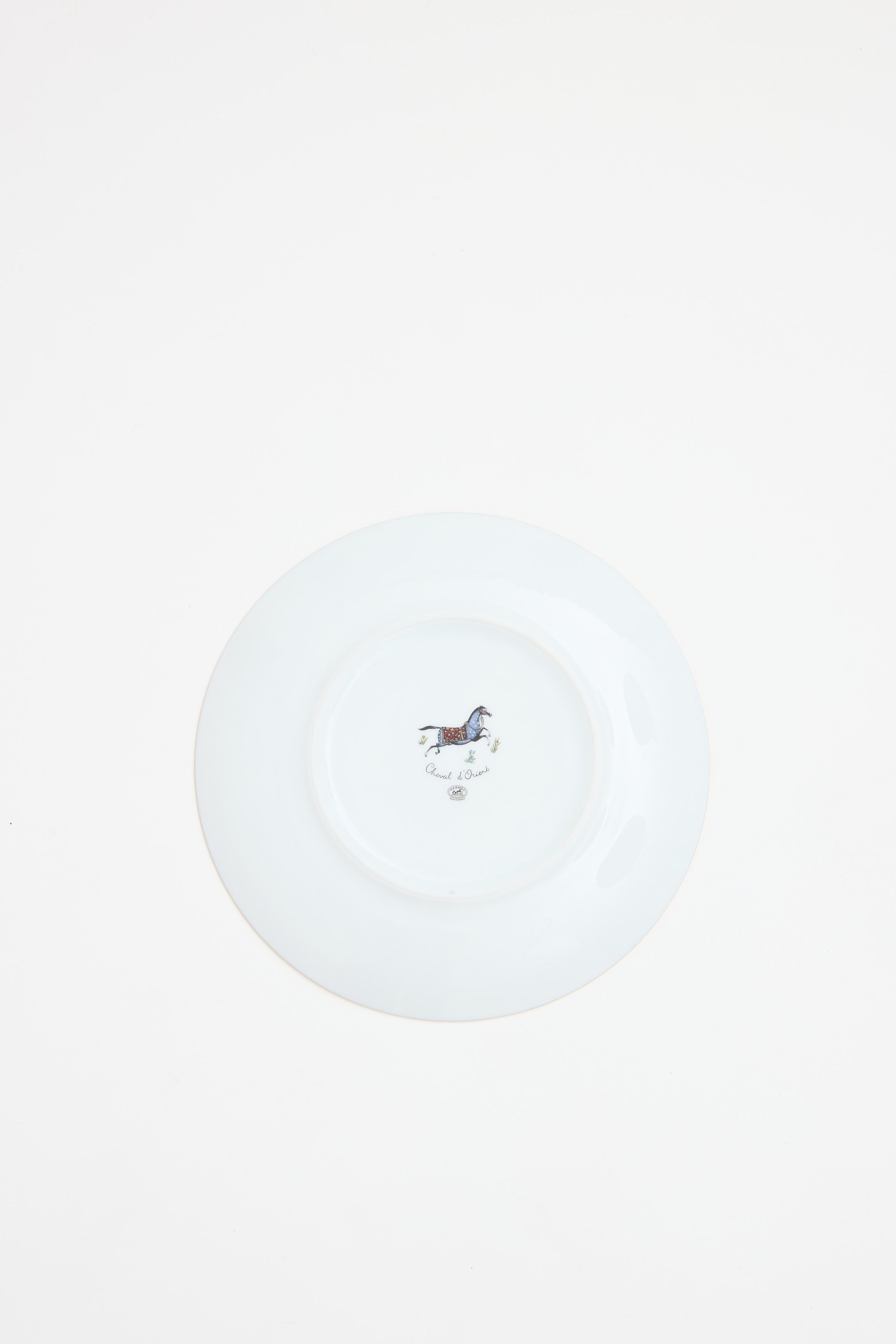 Pre-owned Hermès white and multicolour Cheval d'Orient dessert plate featuring screen-printed horse graphic applied by hand using gold thread, porcelain and design by Nathalie Rolland-Huckel.