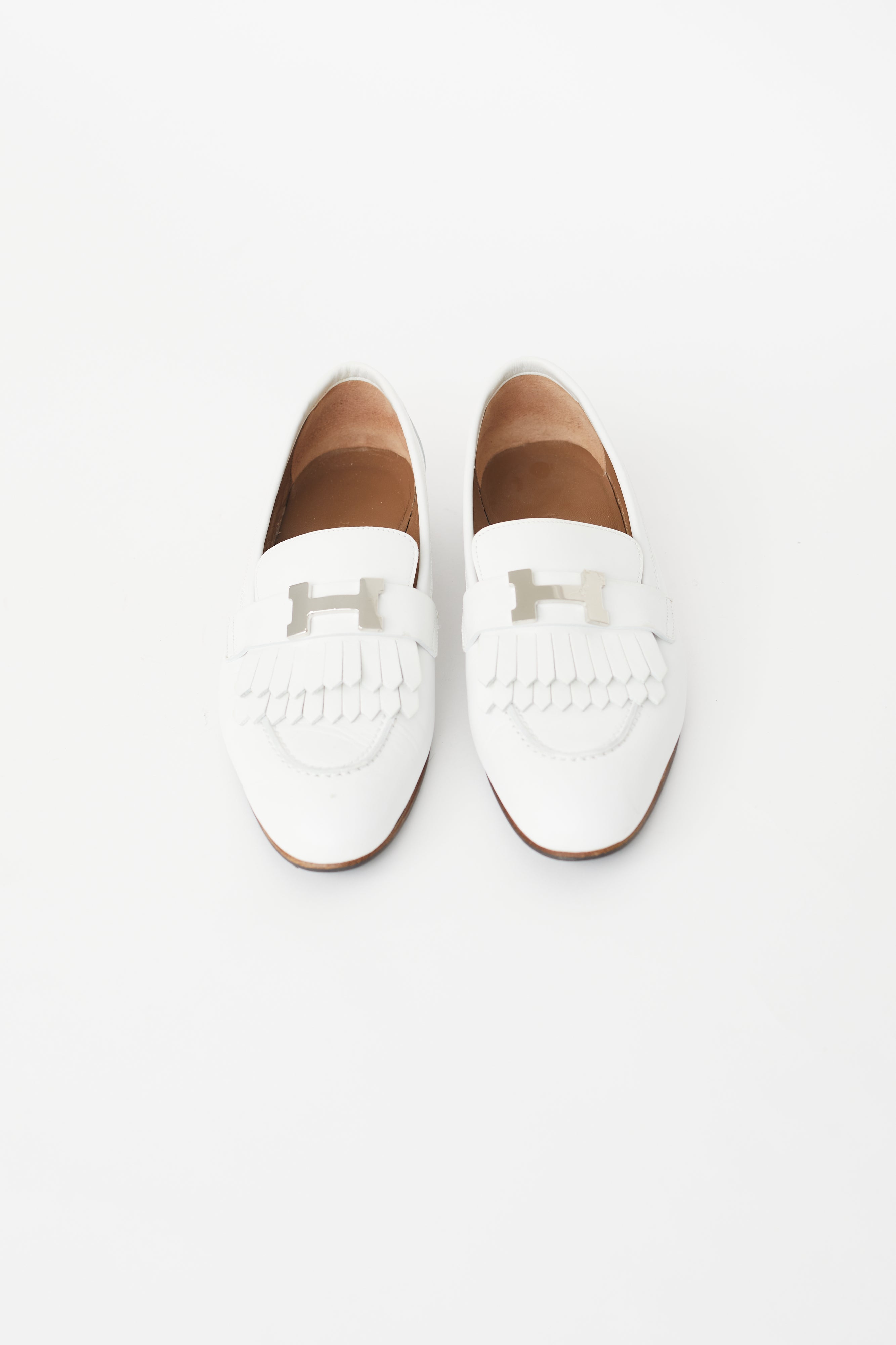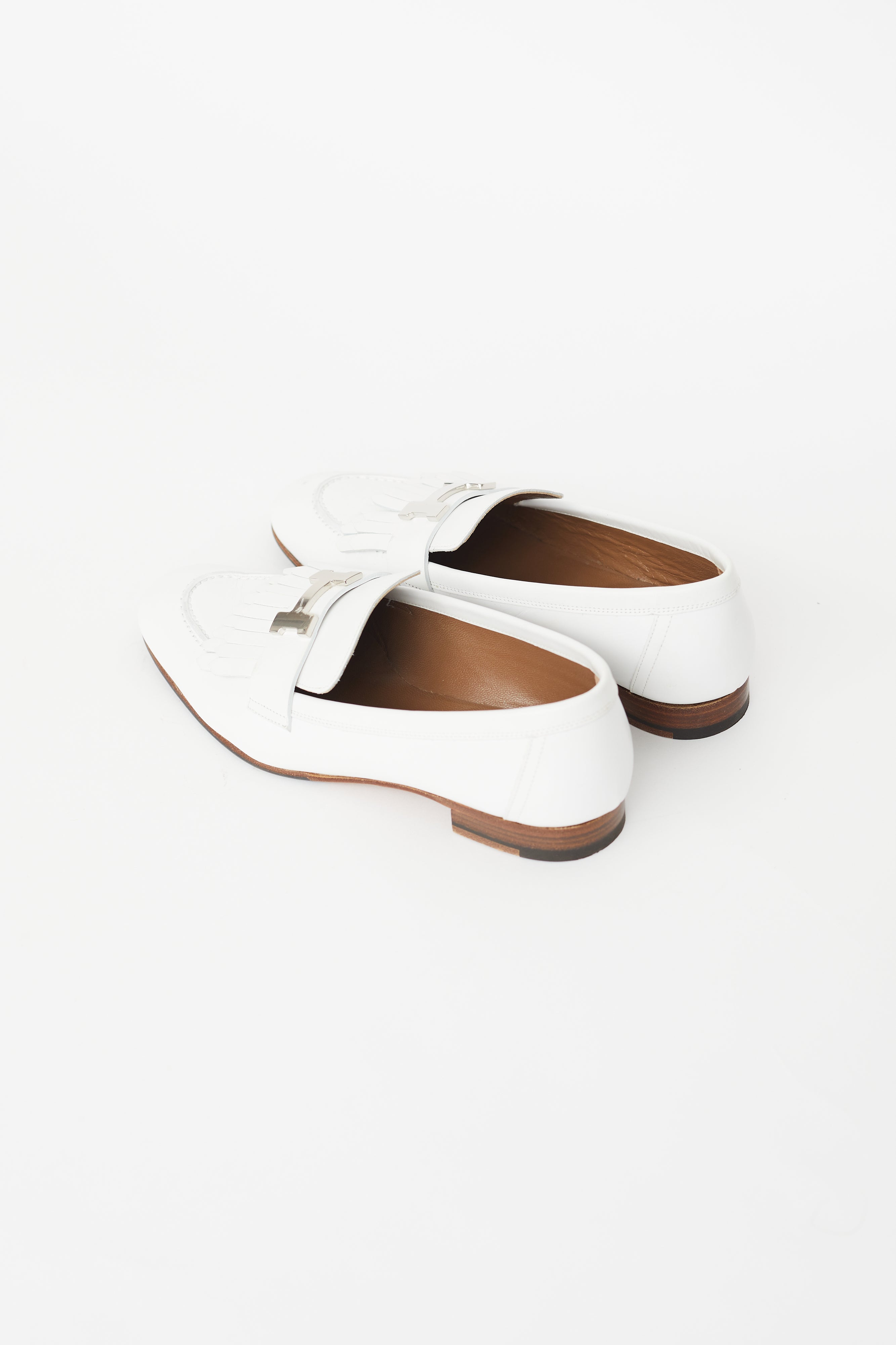 Pre-owned Hermès white Royal leather loafer featuring a round toe, kiltie detail at vamp with silver tone logo hardware, stacked heel, and slip on entry.