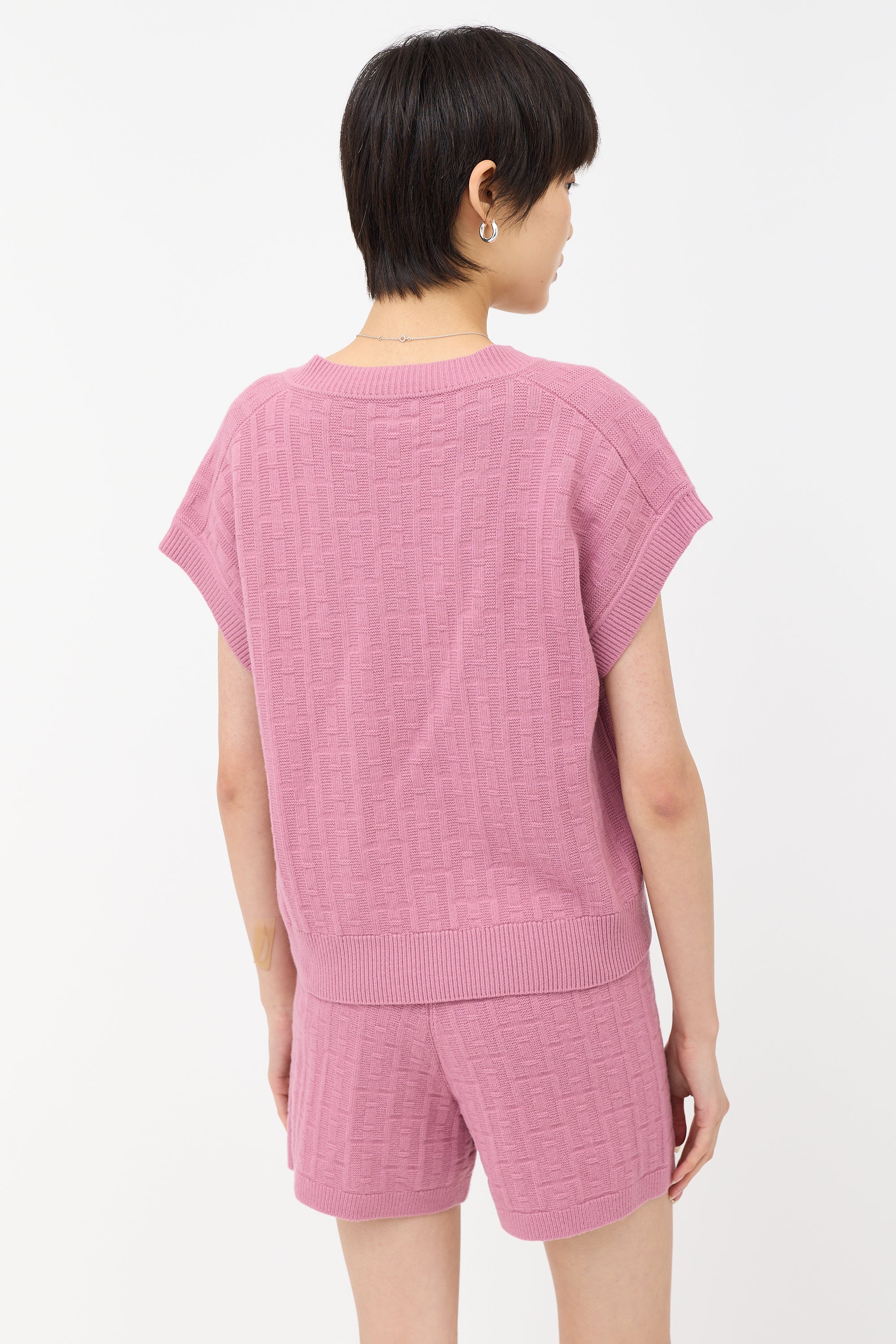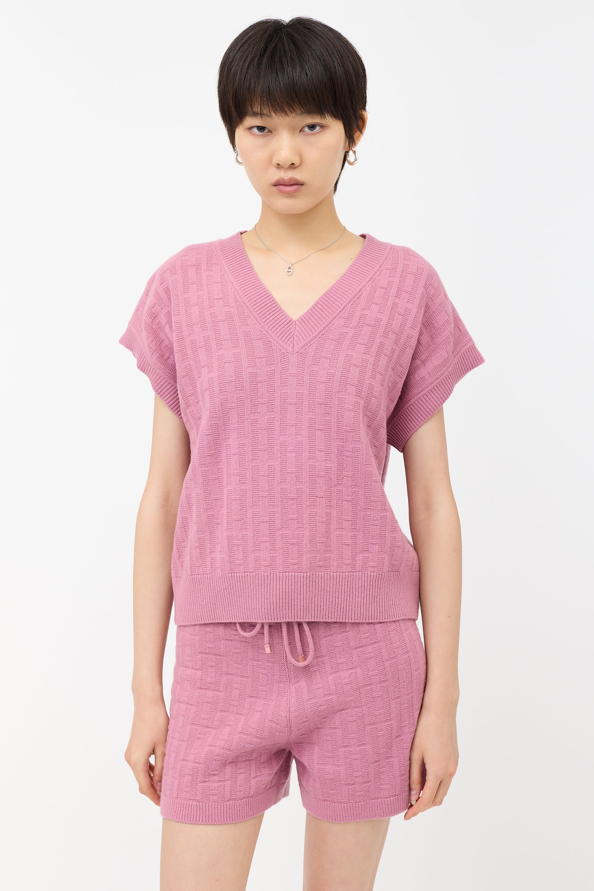 Pre-owned Hermès purple wool knit top featuring H motif pattern throughout, V-neckline, dropped shoulders, and ribbed trim.