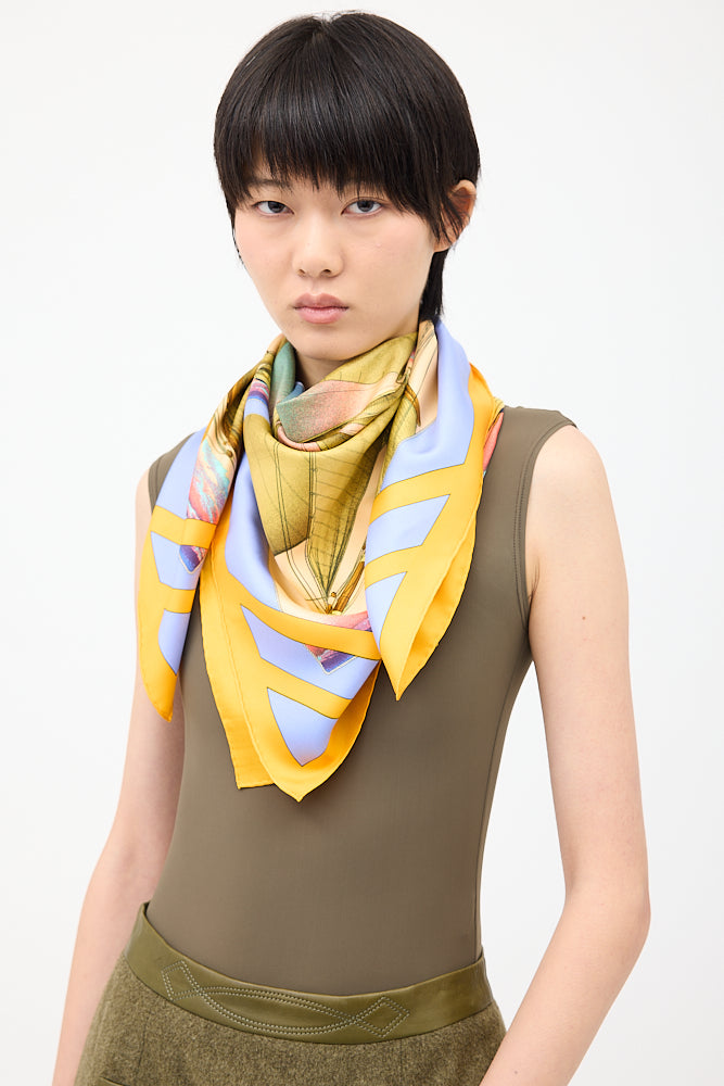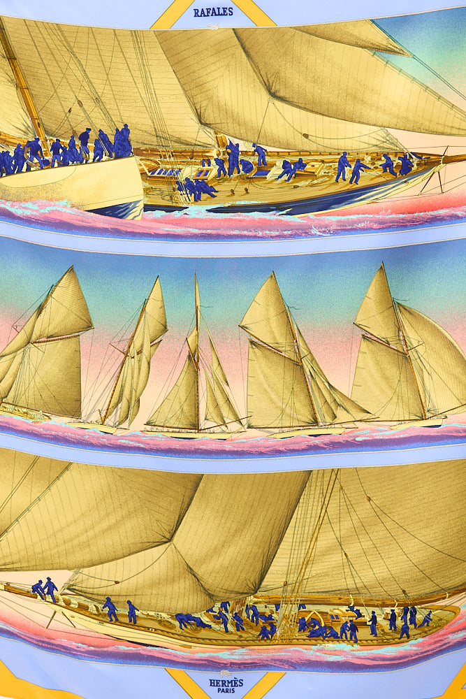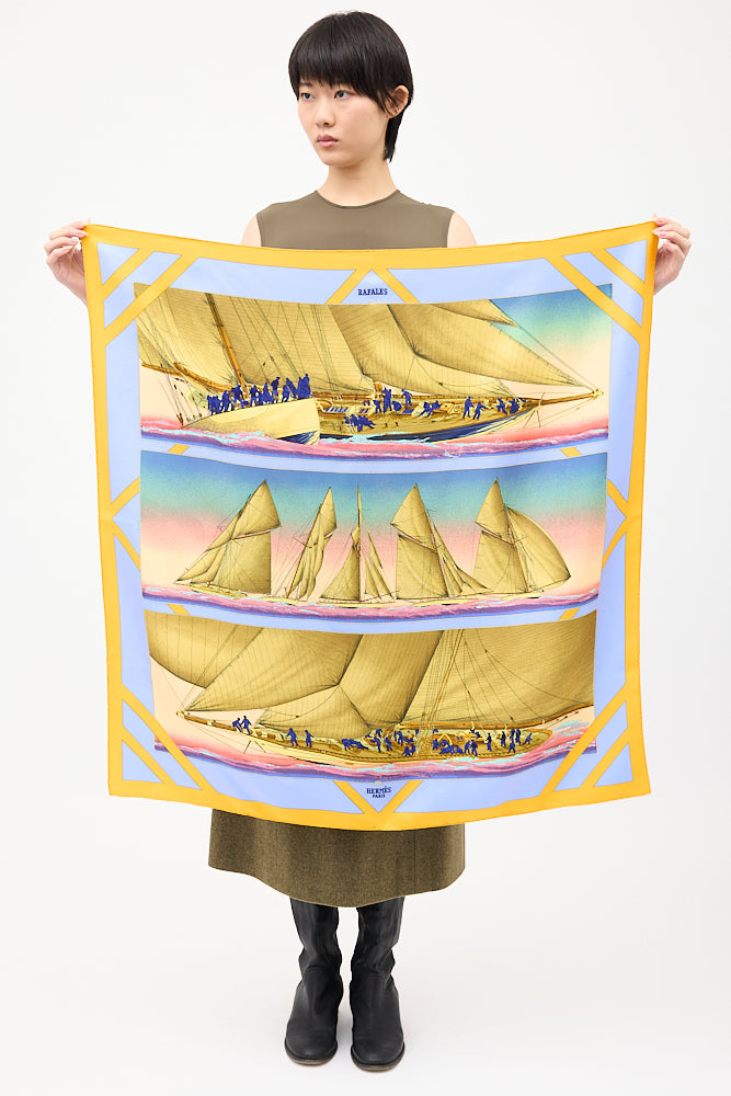 Pre-owned Hermès yellow and multicolour silk scarf featuring Rafales print designed by Yannick Manier, sailboat motif, and hand rolled edges. Comes with original box.