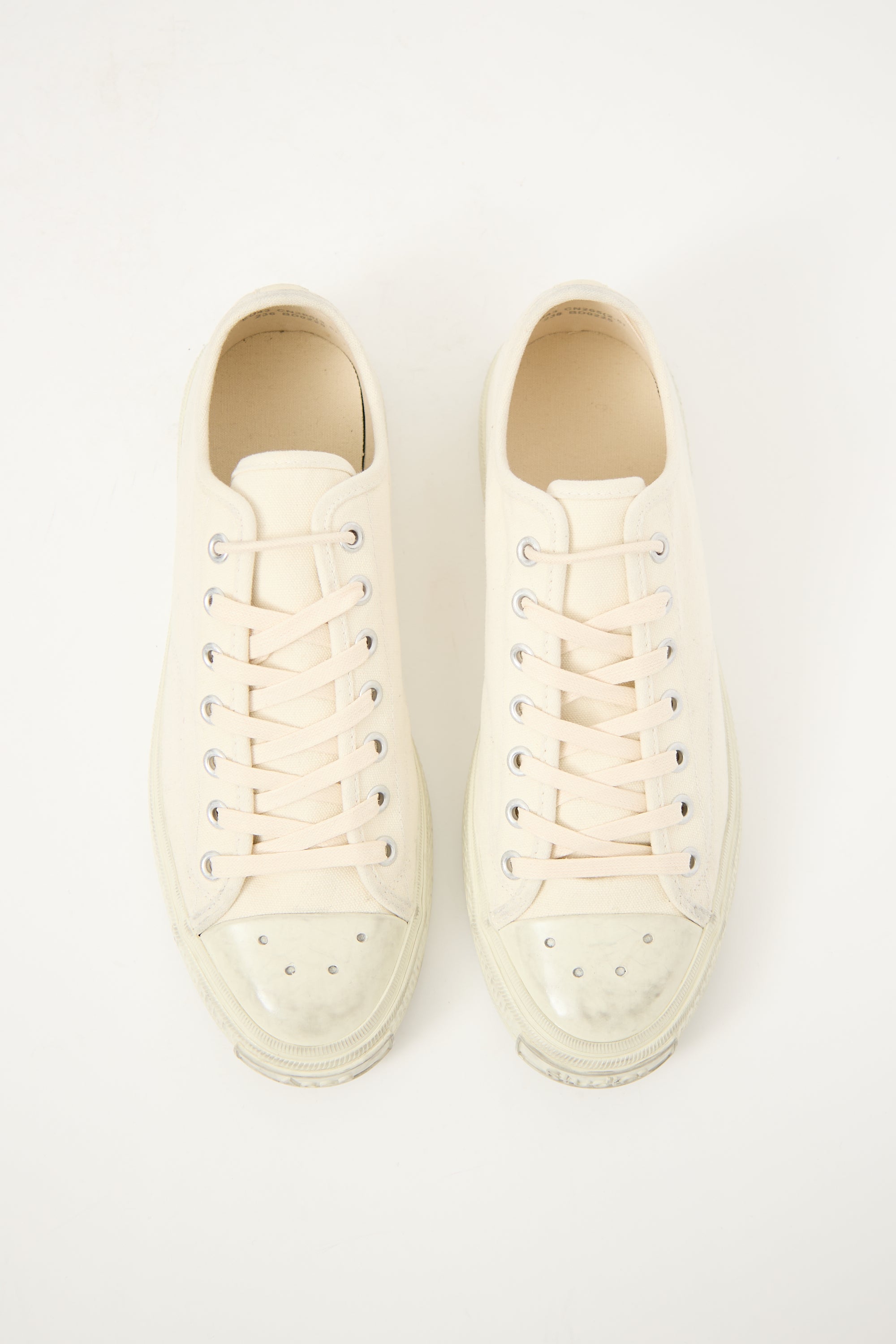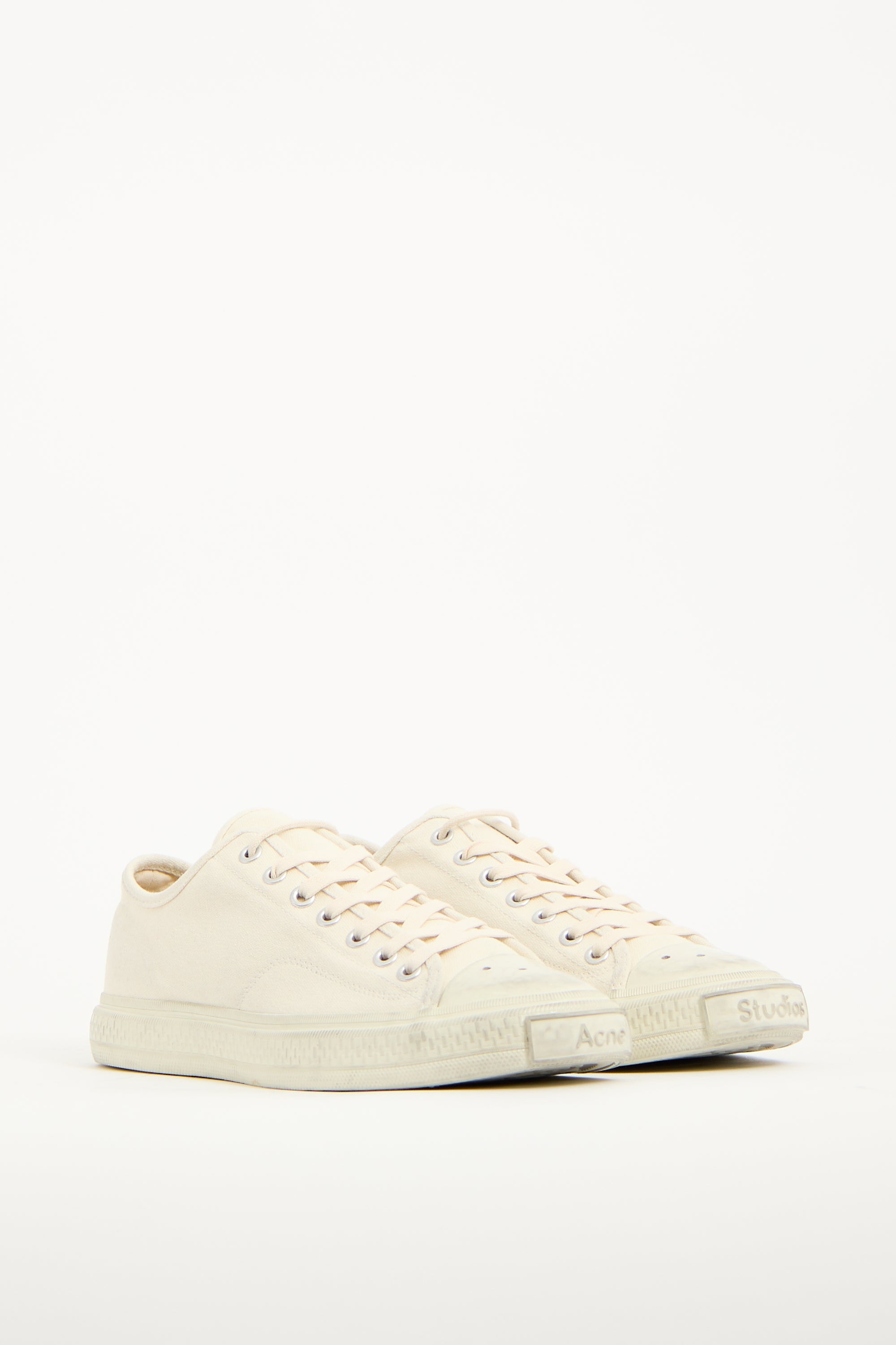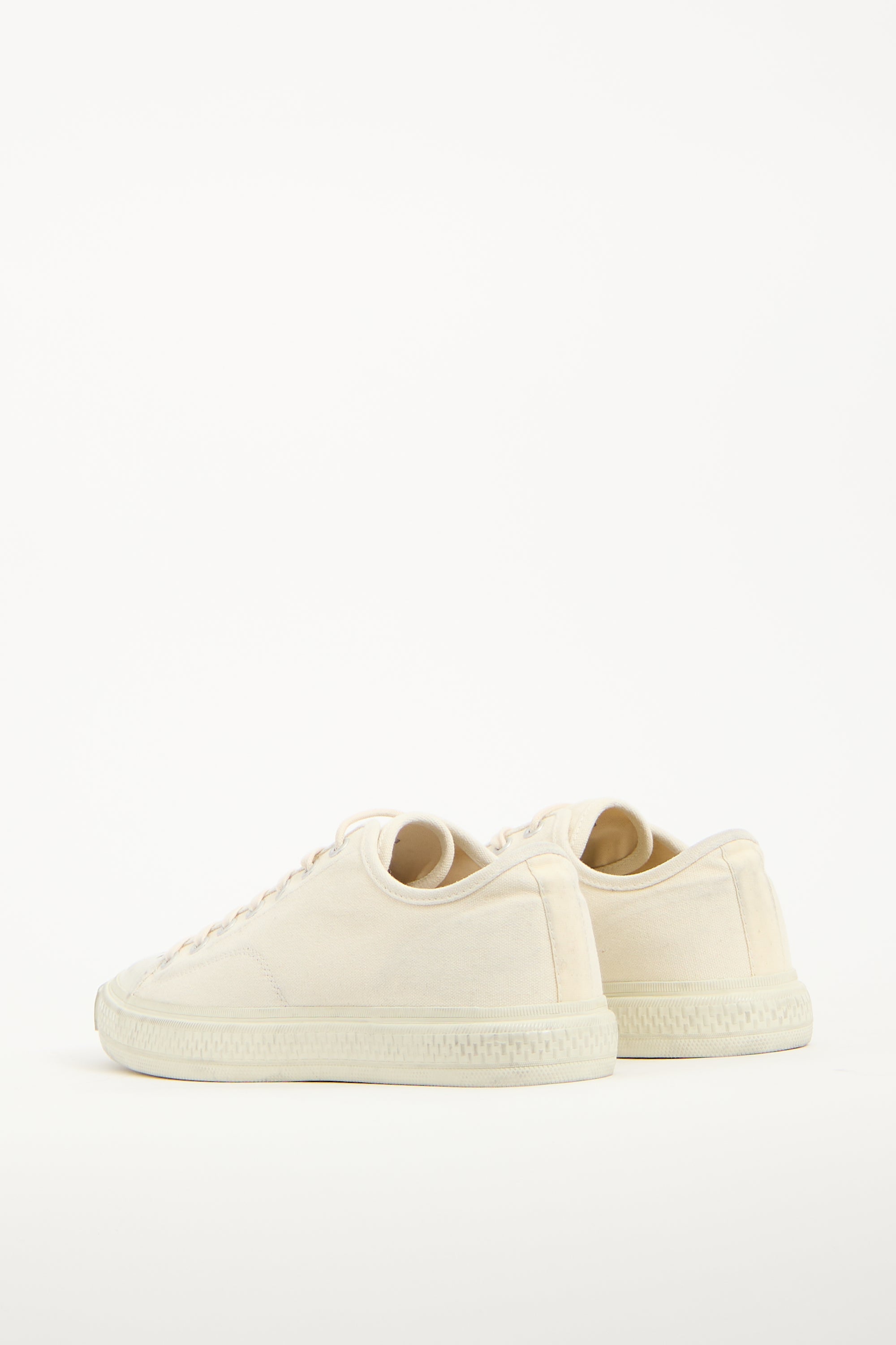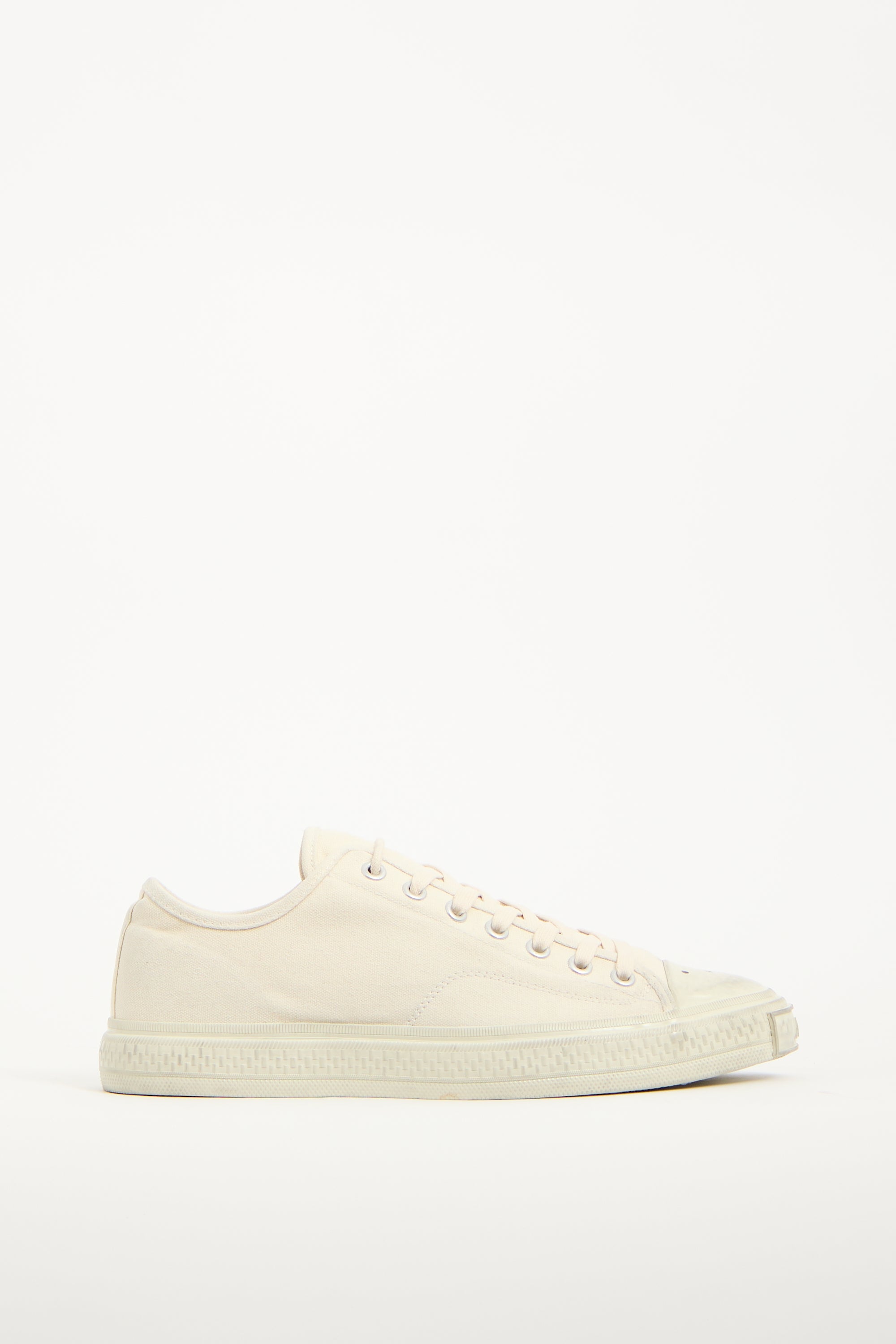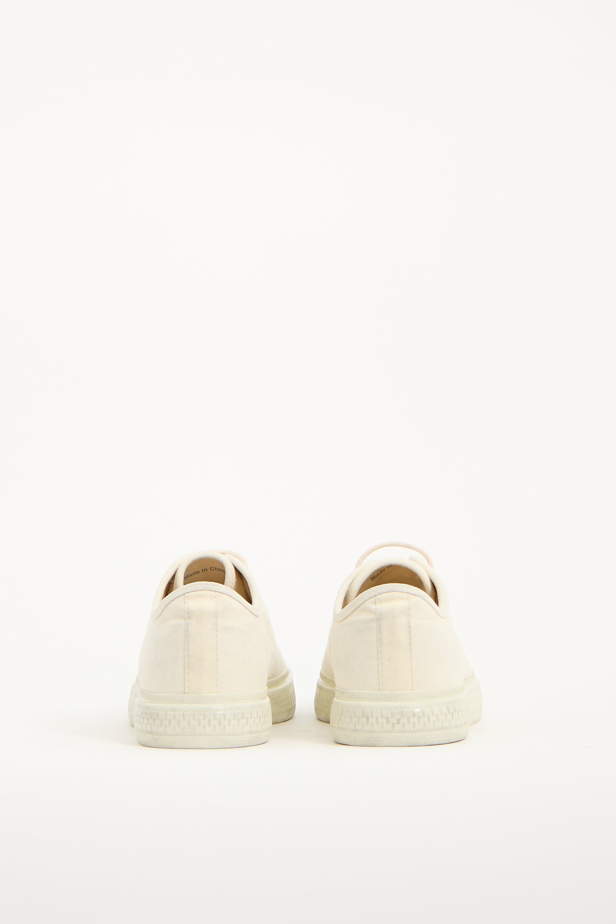 Pre-owned Acne Studios cream canvas Low Top sneakers featuring rounded rubber toe, lace up front, tonal stitching throughout, and embossed logo at toe box. Item features intentional wear at toe box.