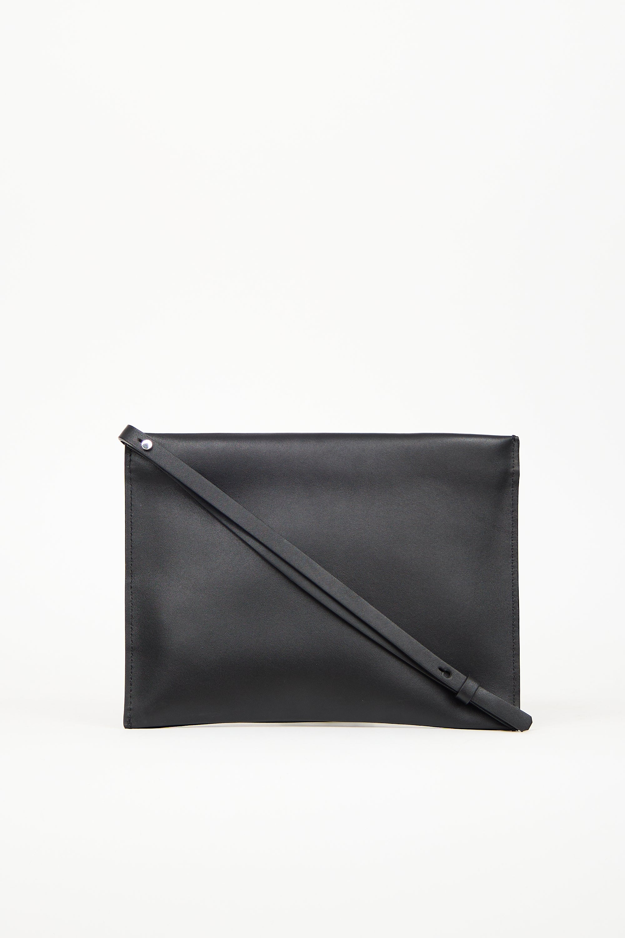 Pre-owned Aesther Ekme black leather pouch featuring zip closure at top, crossover strap at front and back, adjustable wristlet, zip closure at top, and one main compartment. Comes with original dust bag.