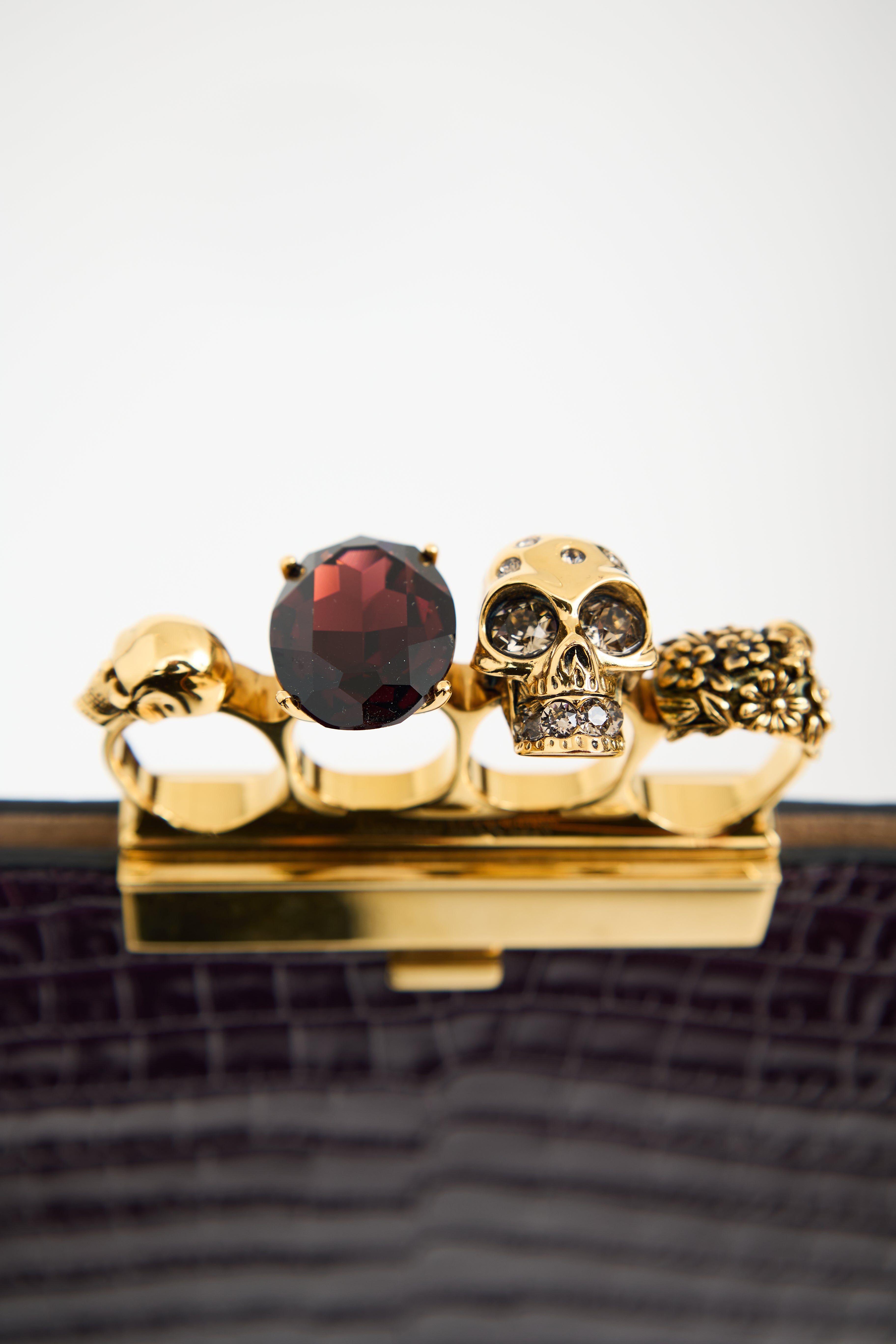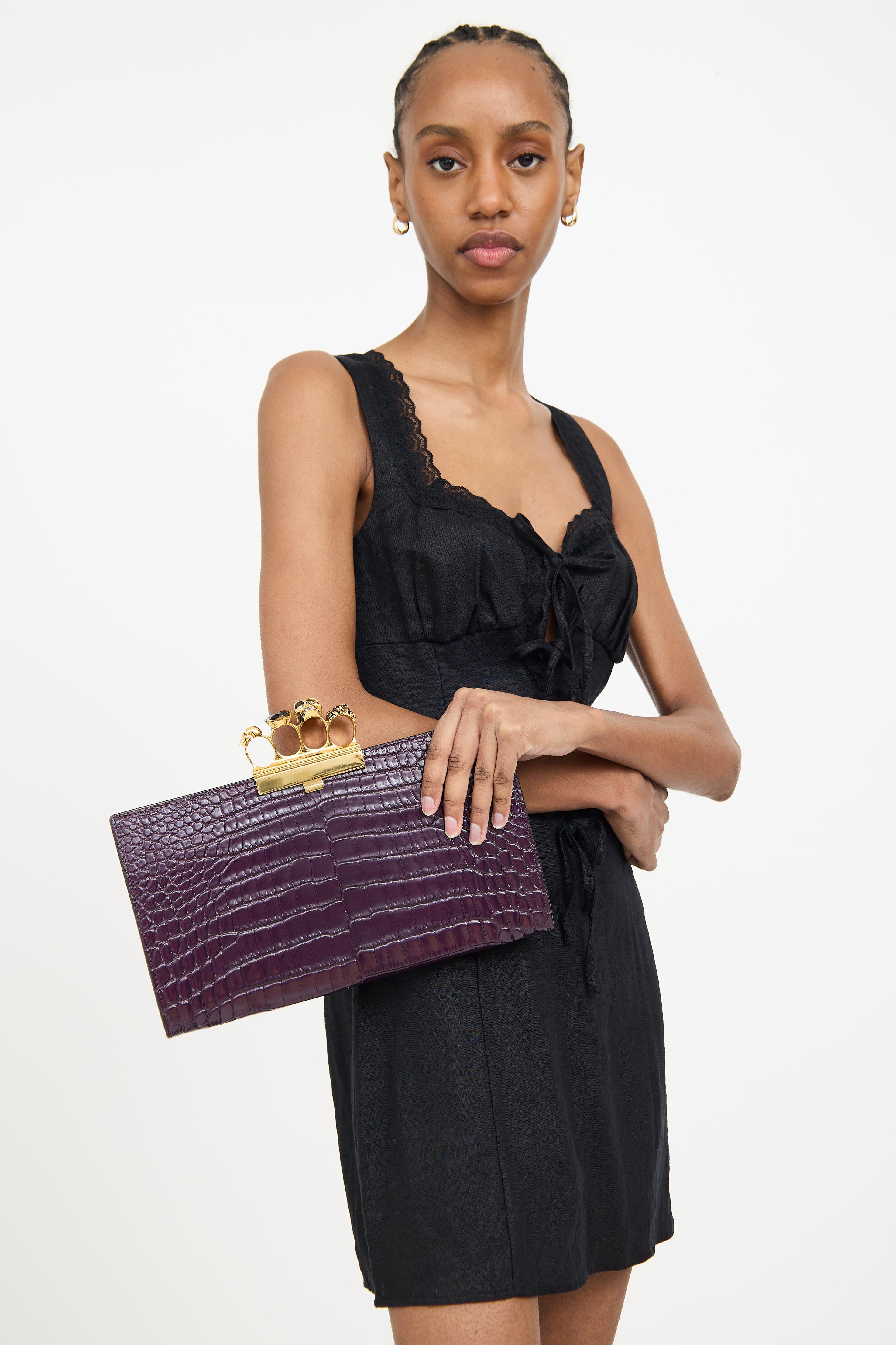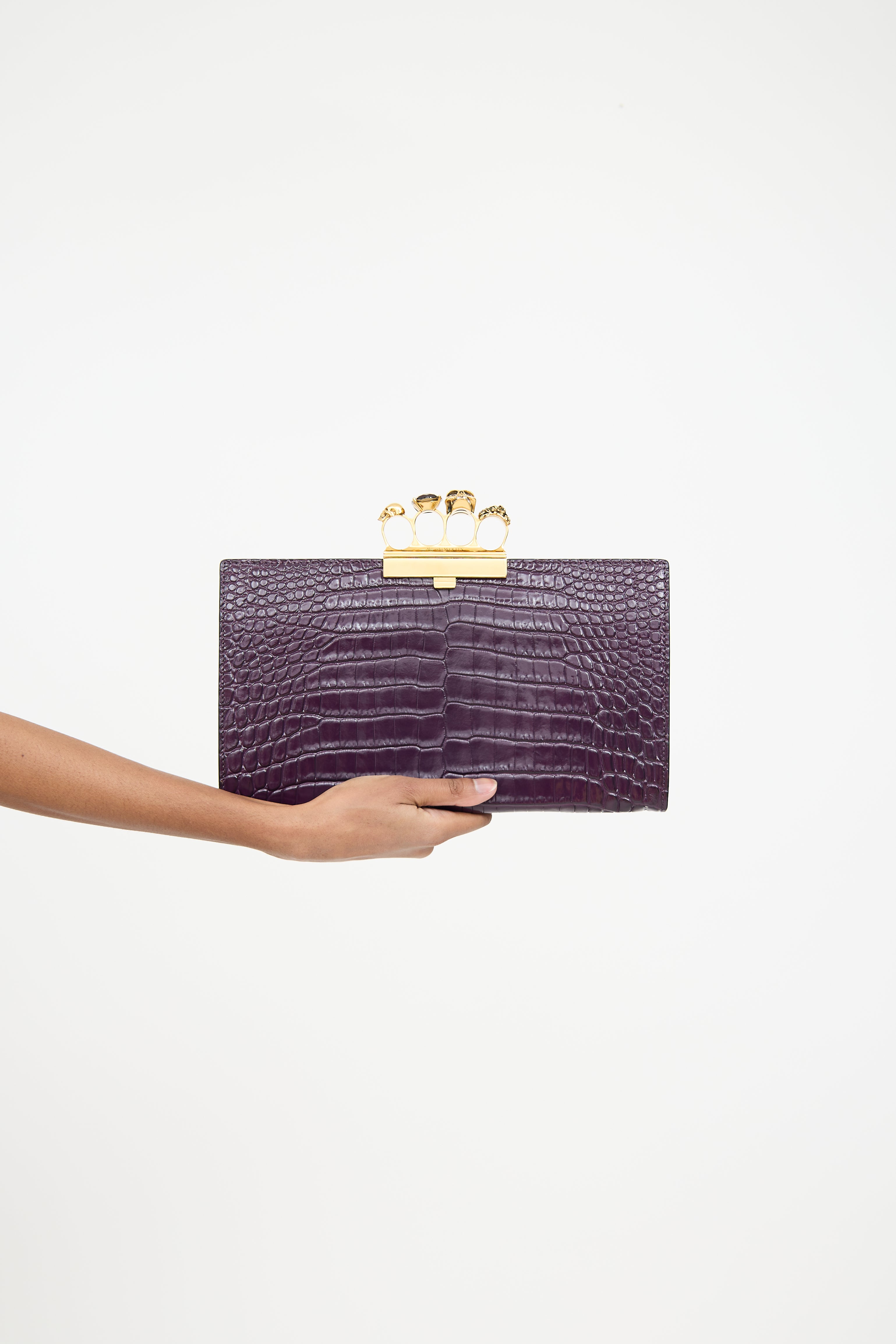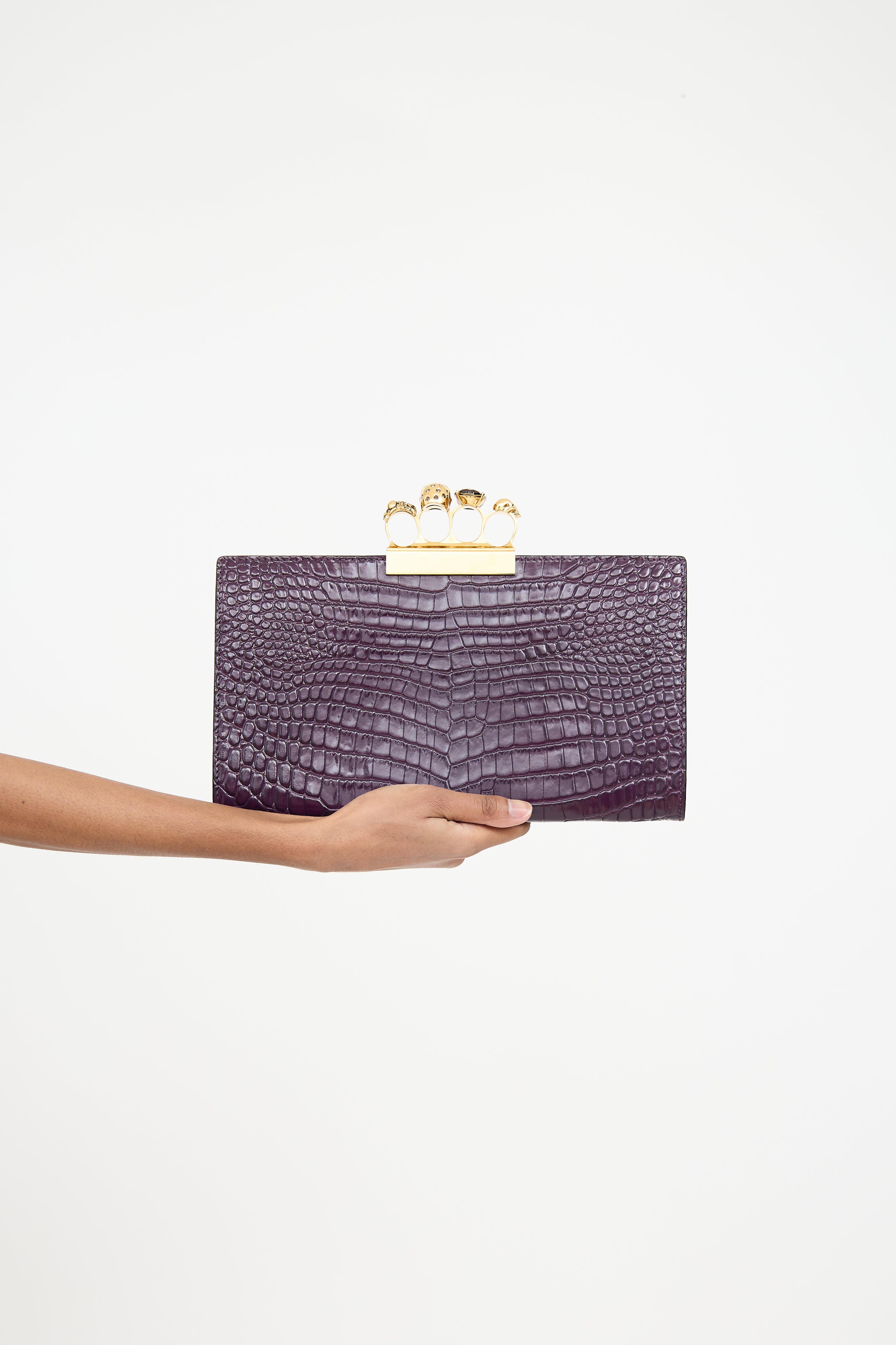 Pre-owned Alexander McQueen purple Skull Four Ring clutch in croc effect embossed leather, one main compartment with two internal zip pockets, four gold tone rings at top with skull and gem embellishment, engraved logo at front, and push lock hinge closure.