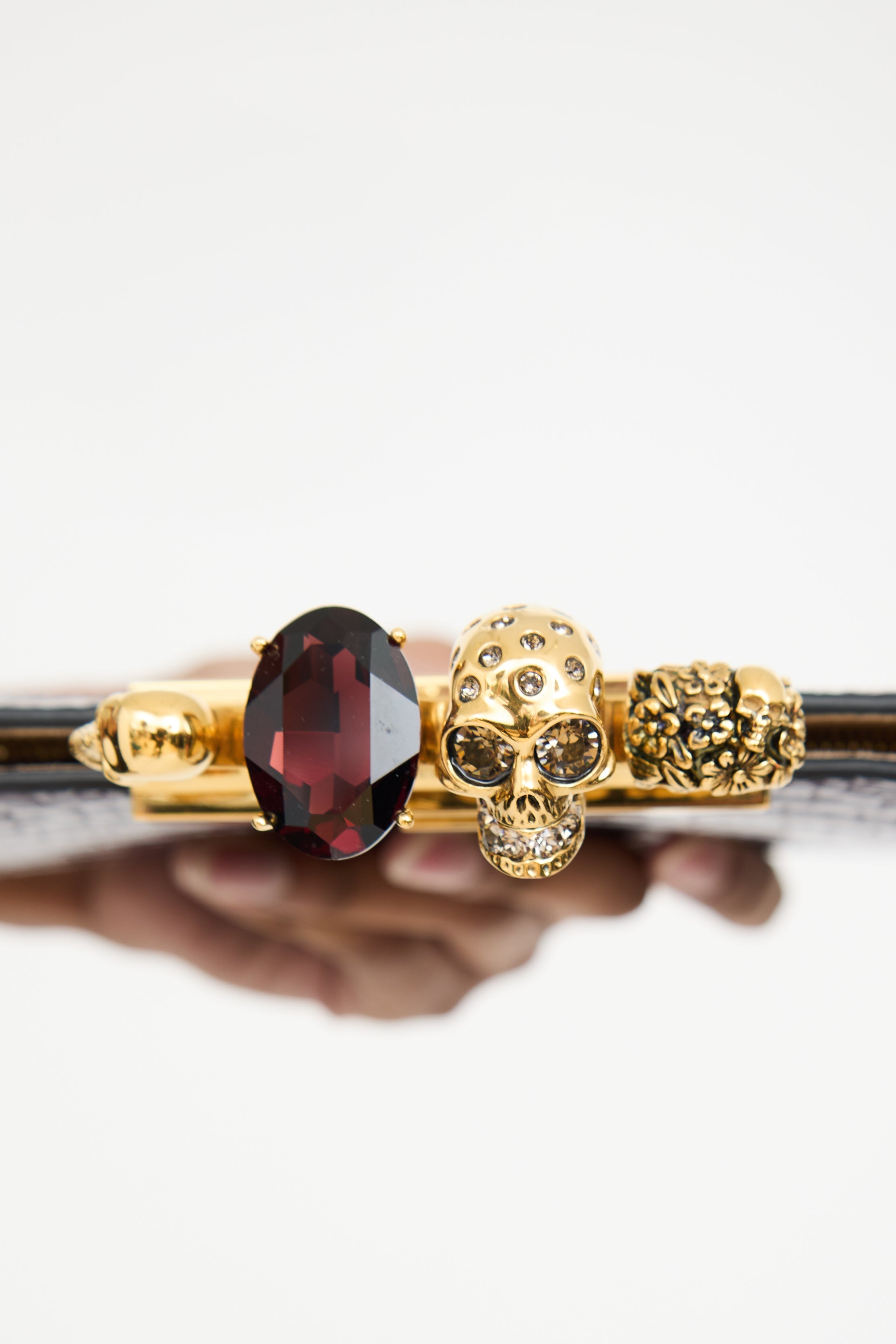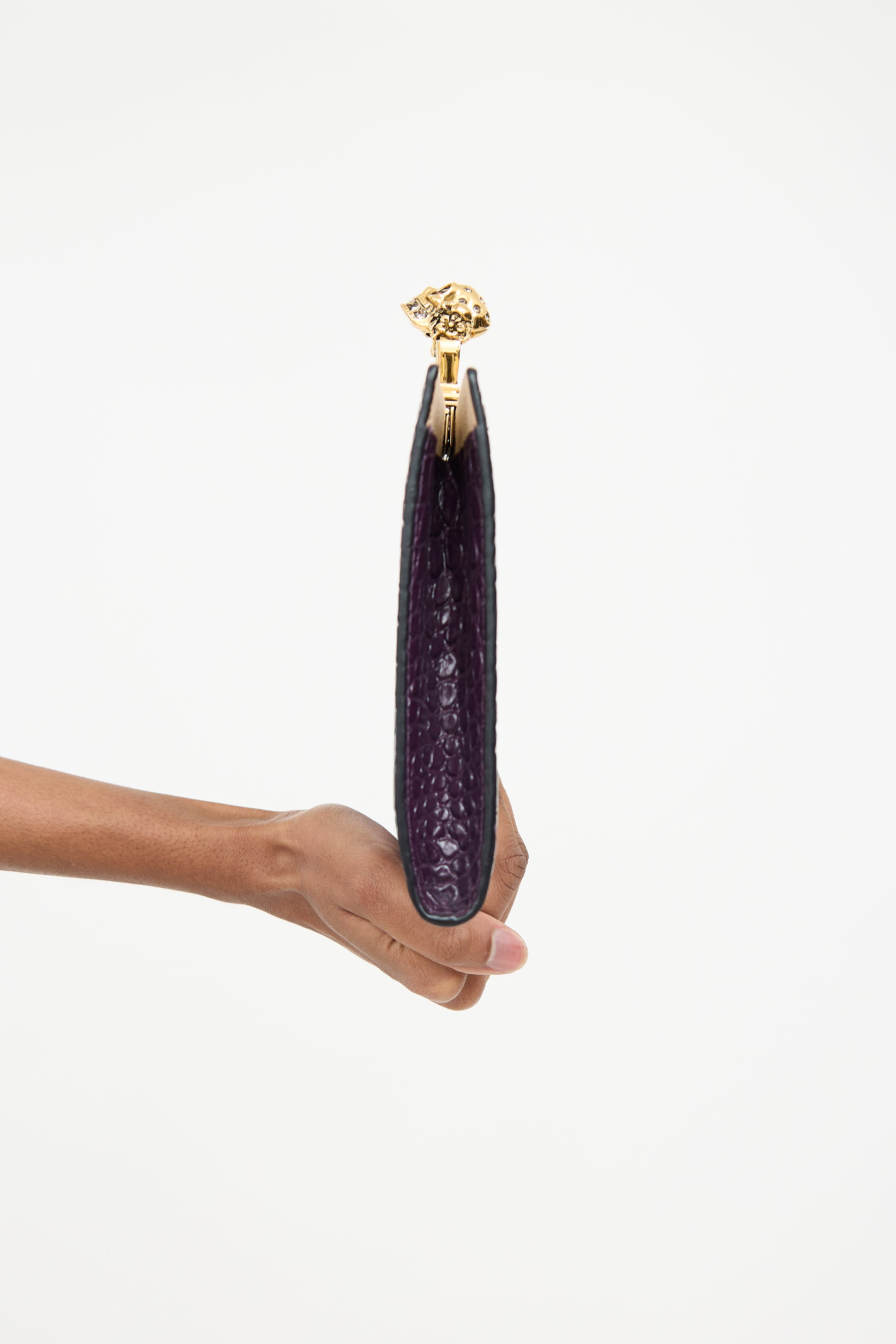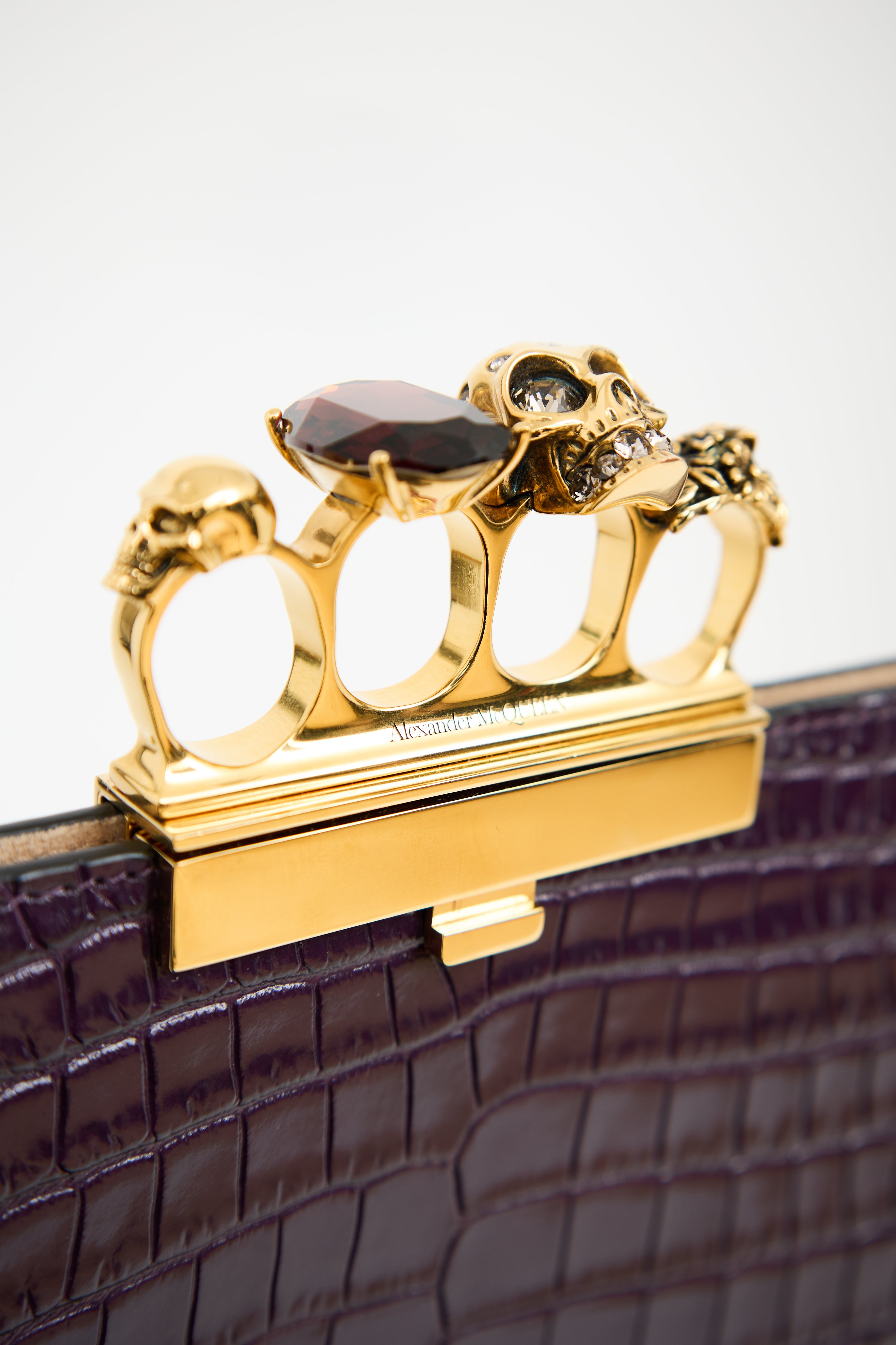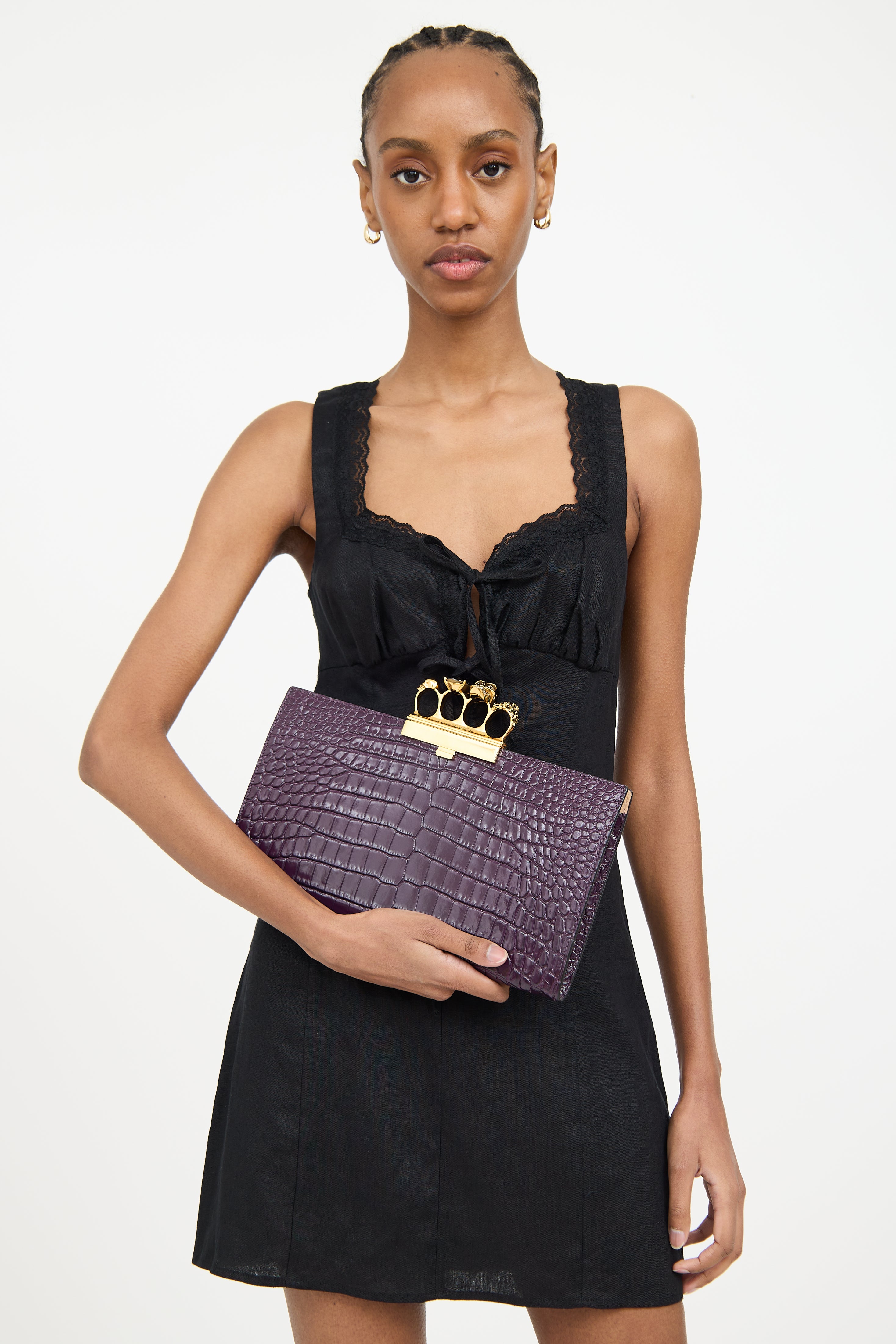Pre-owned Alexander McQueen purple Skull Four Ring clutch in croc effect embossed leather, one main compartment with two internal zip pockets, four gold tone rings at top with skull and gem embellishment, engraved logo at front, and push lock hinge closure.