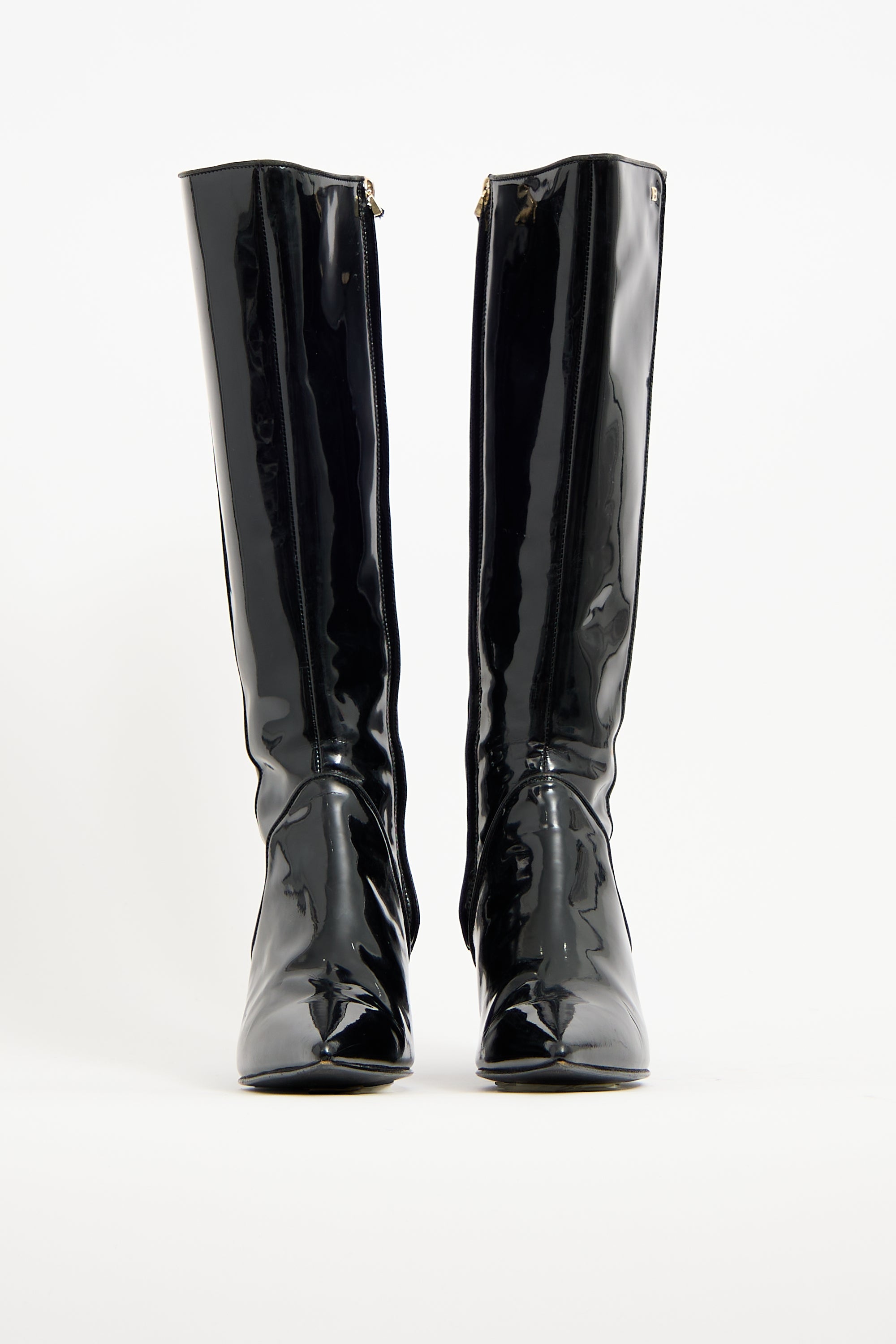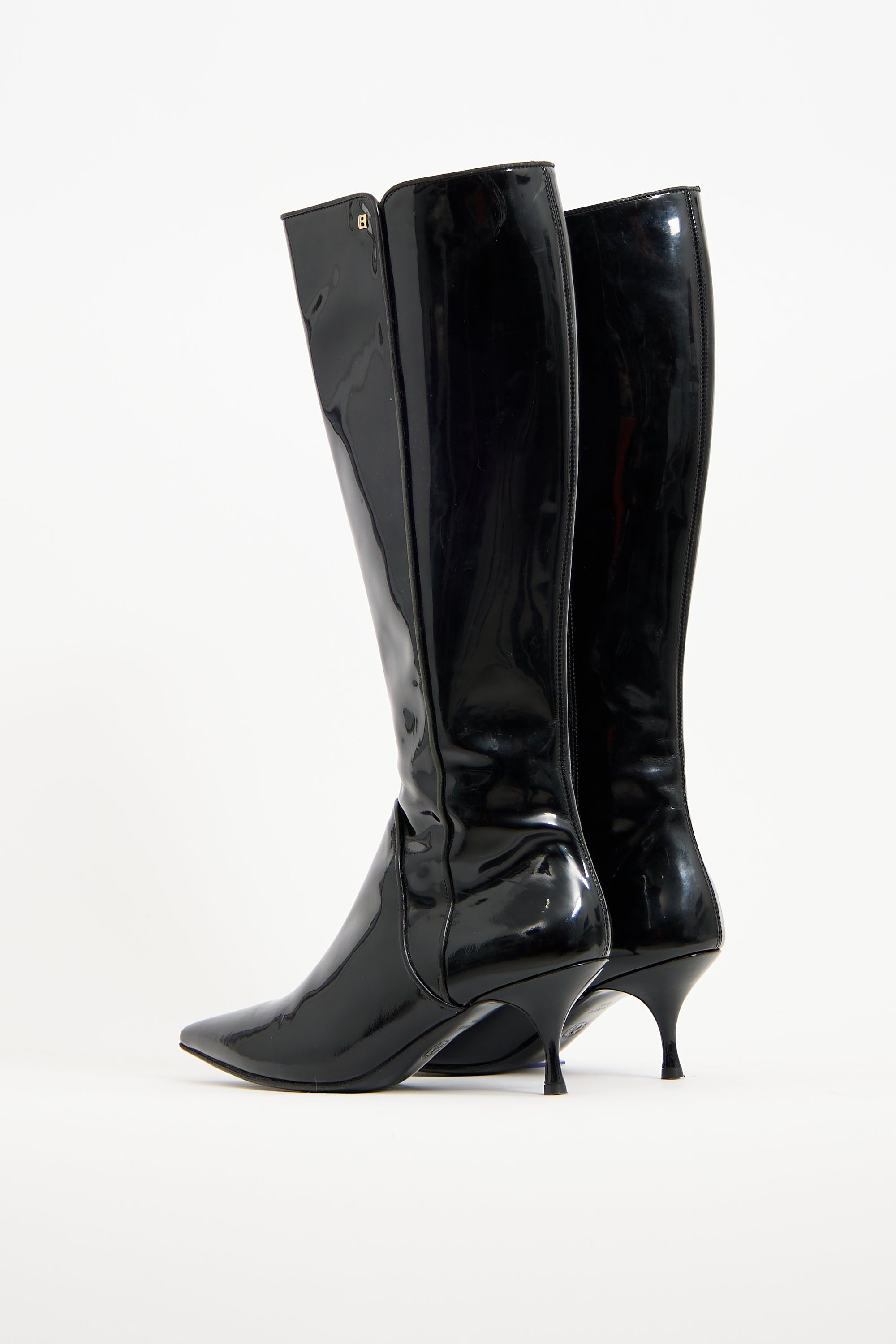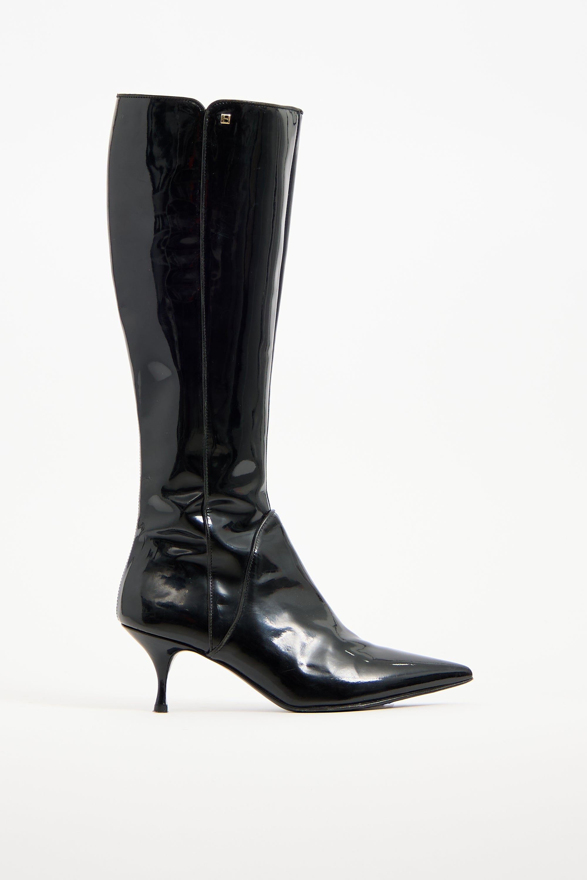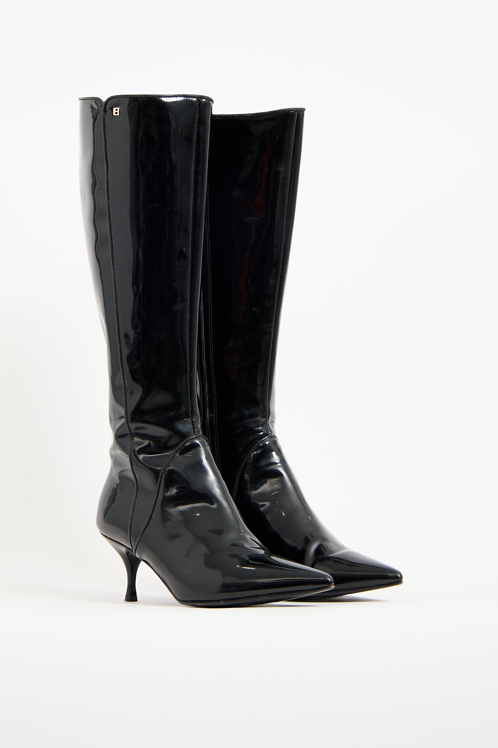 Pre-owned Bally black patent leather knee high boots featuring pointed toe, inner side zip closure, gold tone logo hardware at opening, covered kitten heel, and pull on entry.