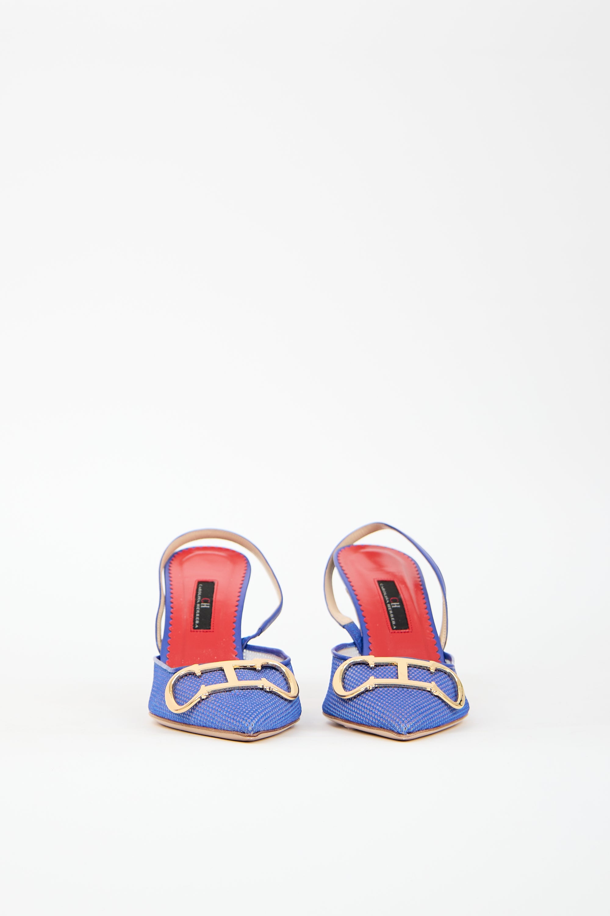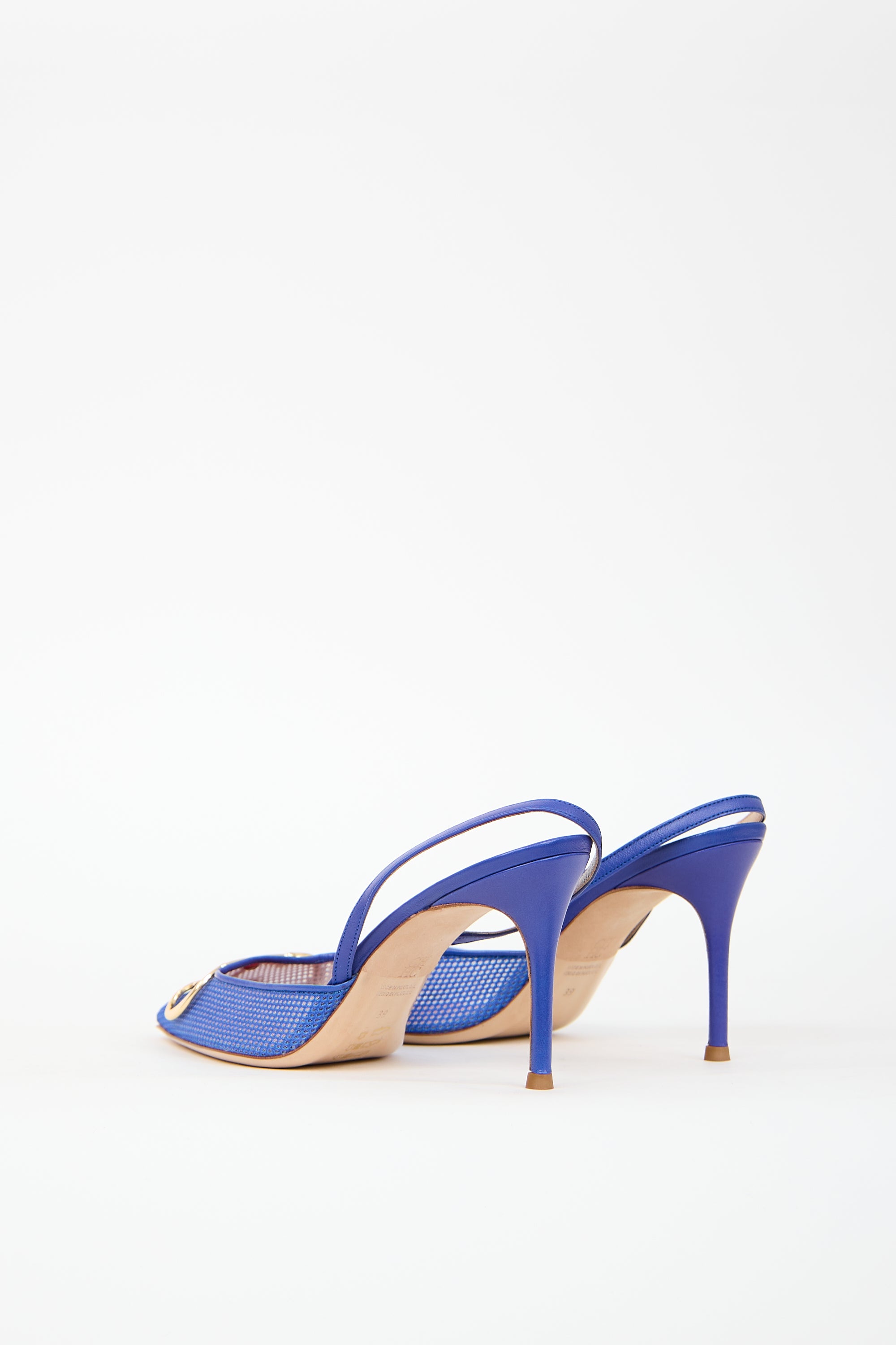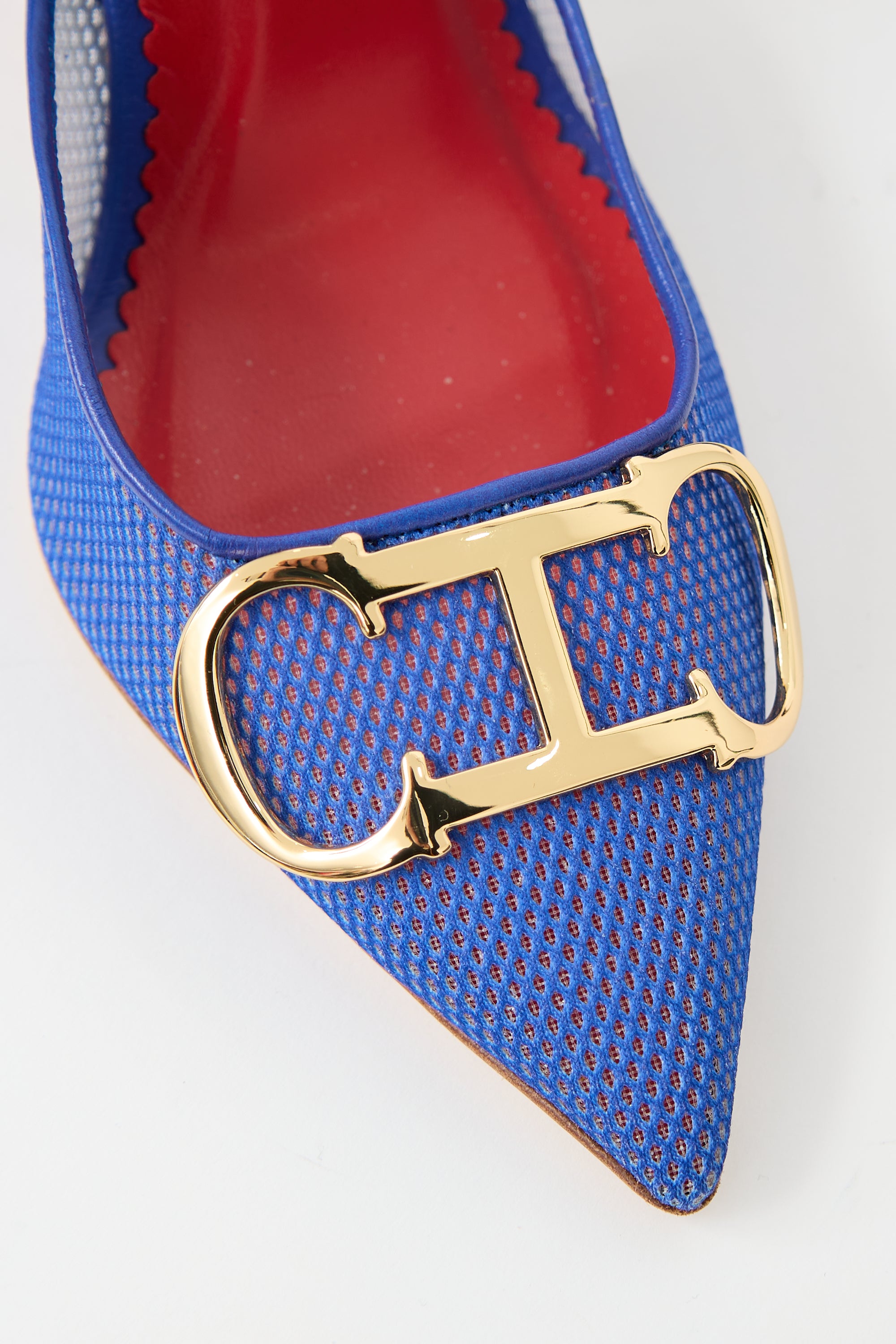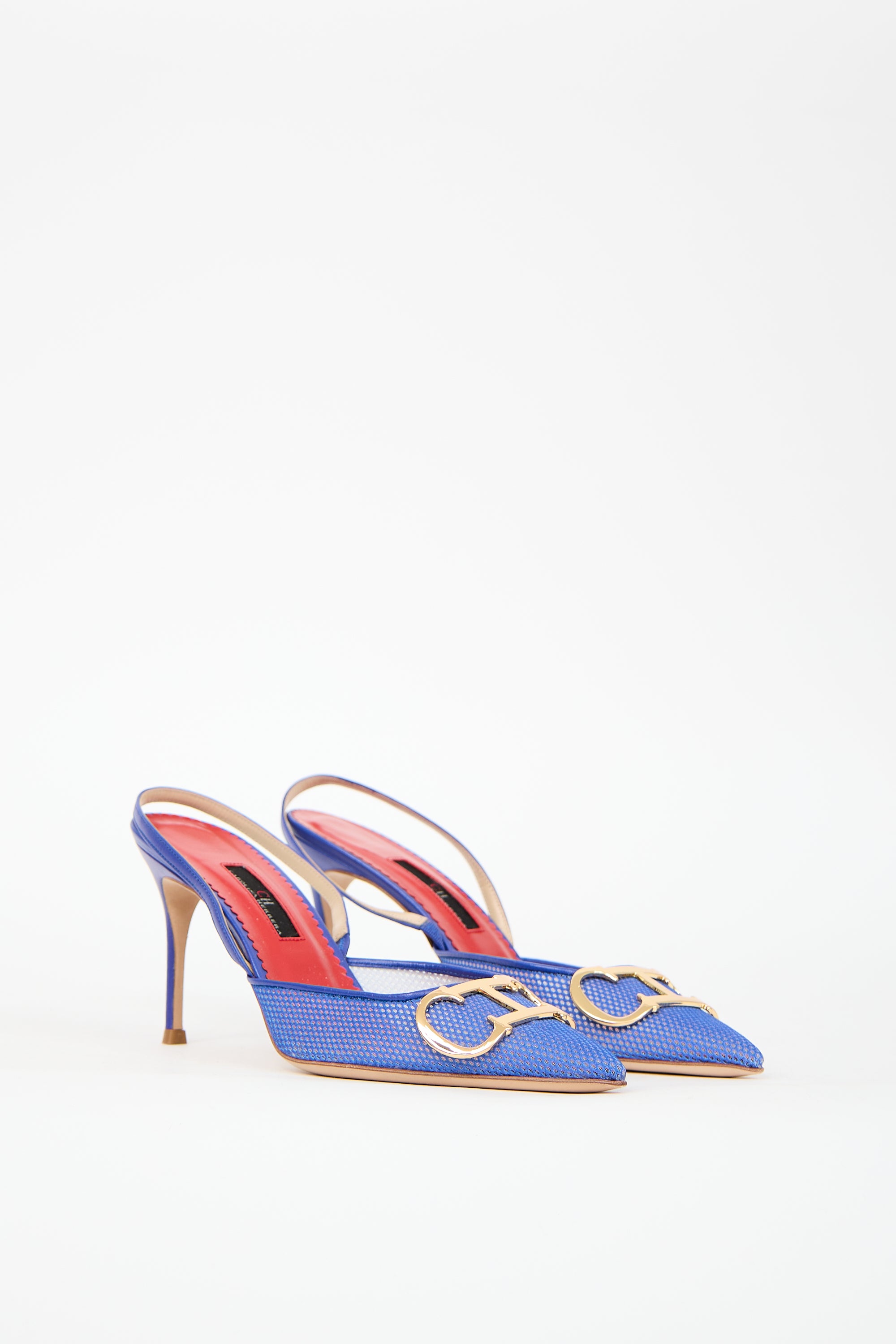 Pre-owned Carolina Herrera mesh Insignia 80 heels featuring pointed toe, gold tone hardware across vamp, perforated blue mesh upper, elasticized ankle strap, and purple covered stiletto heel. Comes with original dust bag.