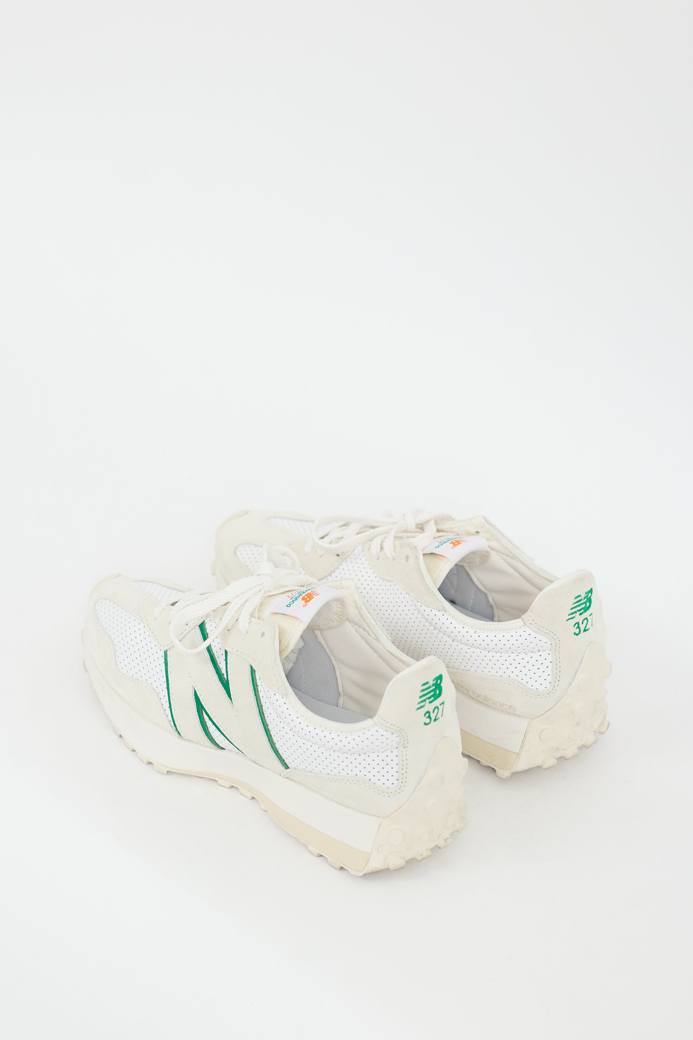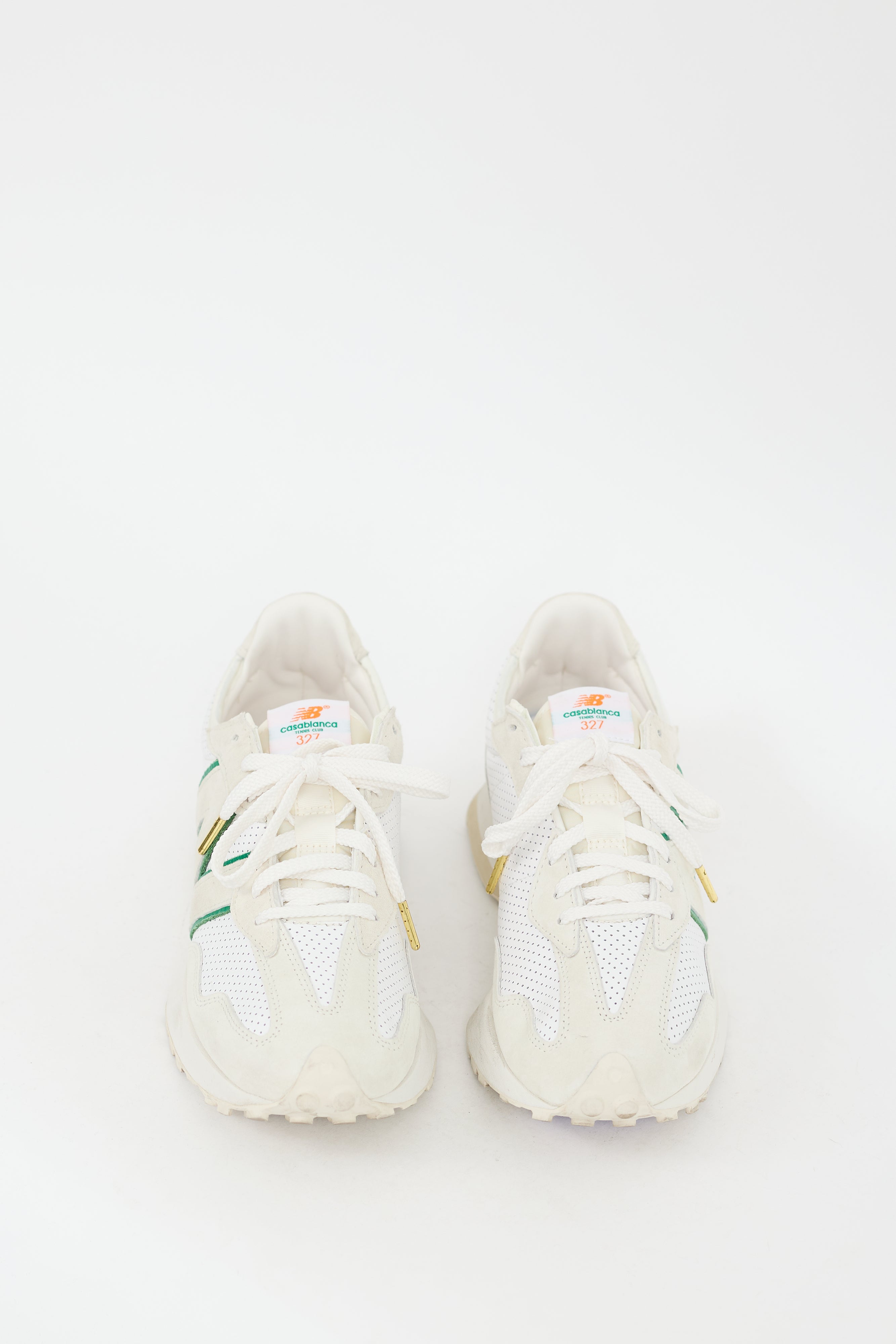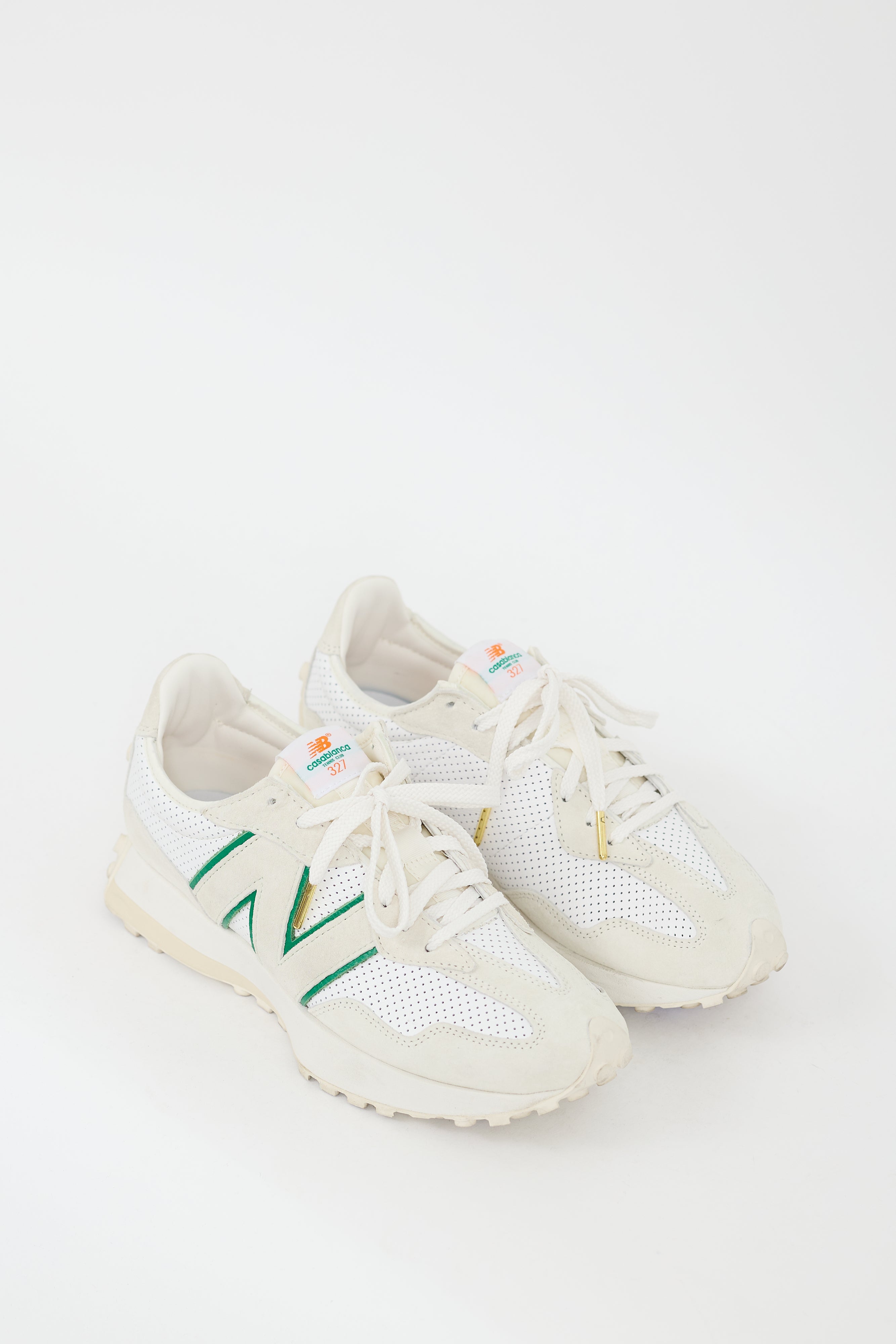 Pre-owned Casablanca X New Balance 327 sneakers featuring a rounded toe, white perforated leather body, cream suede panelling throughout, lace up front, logo label at tongue, suede panelled "N" with green leather trim at outer sides of shoe, rubberized logo at inner counter, green embroidered logo and "327" at counter, and treaded rubber sole. Comes with original box.