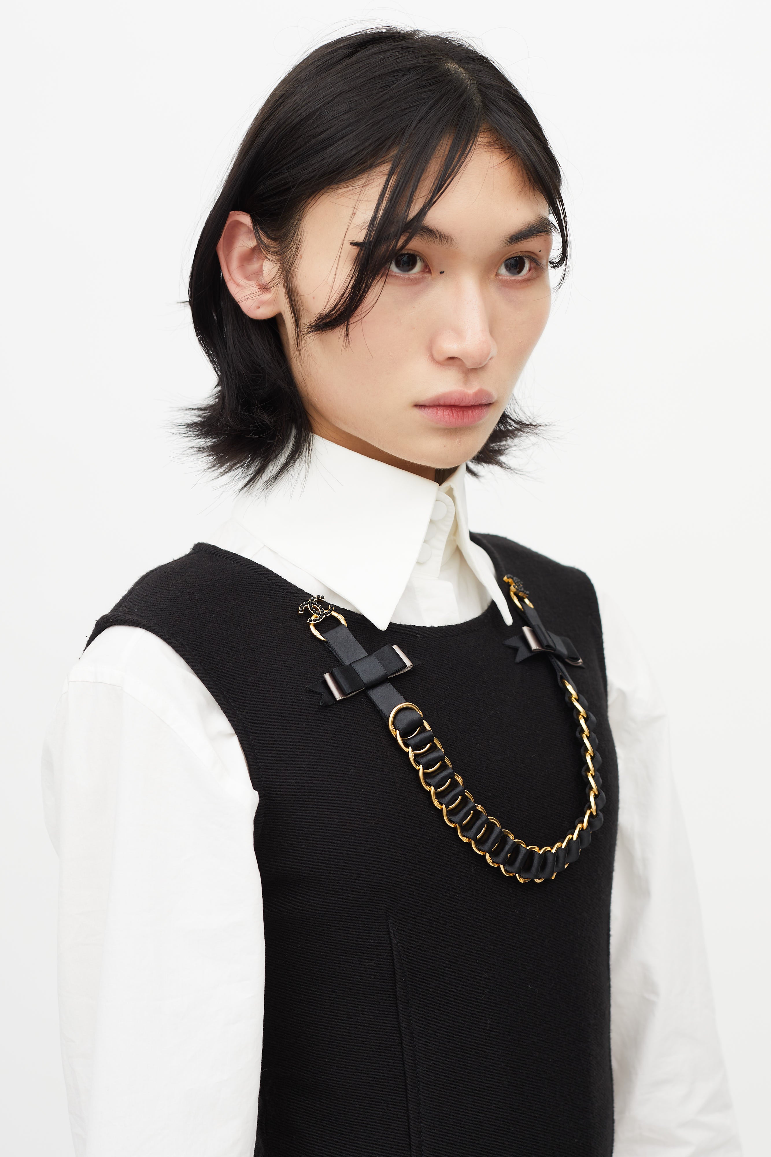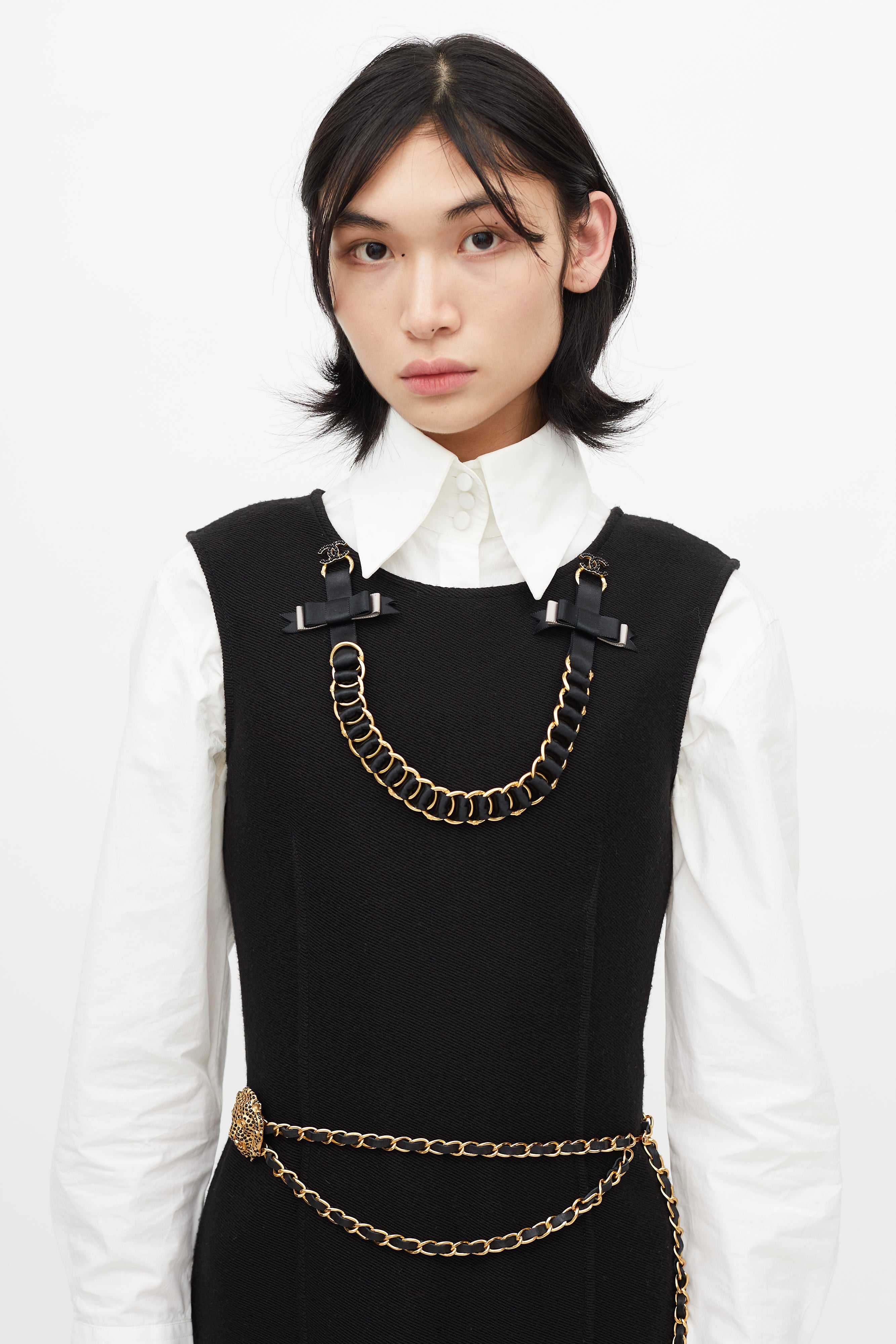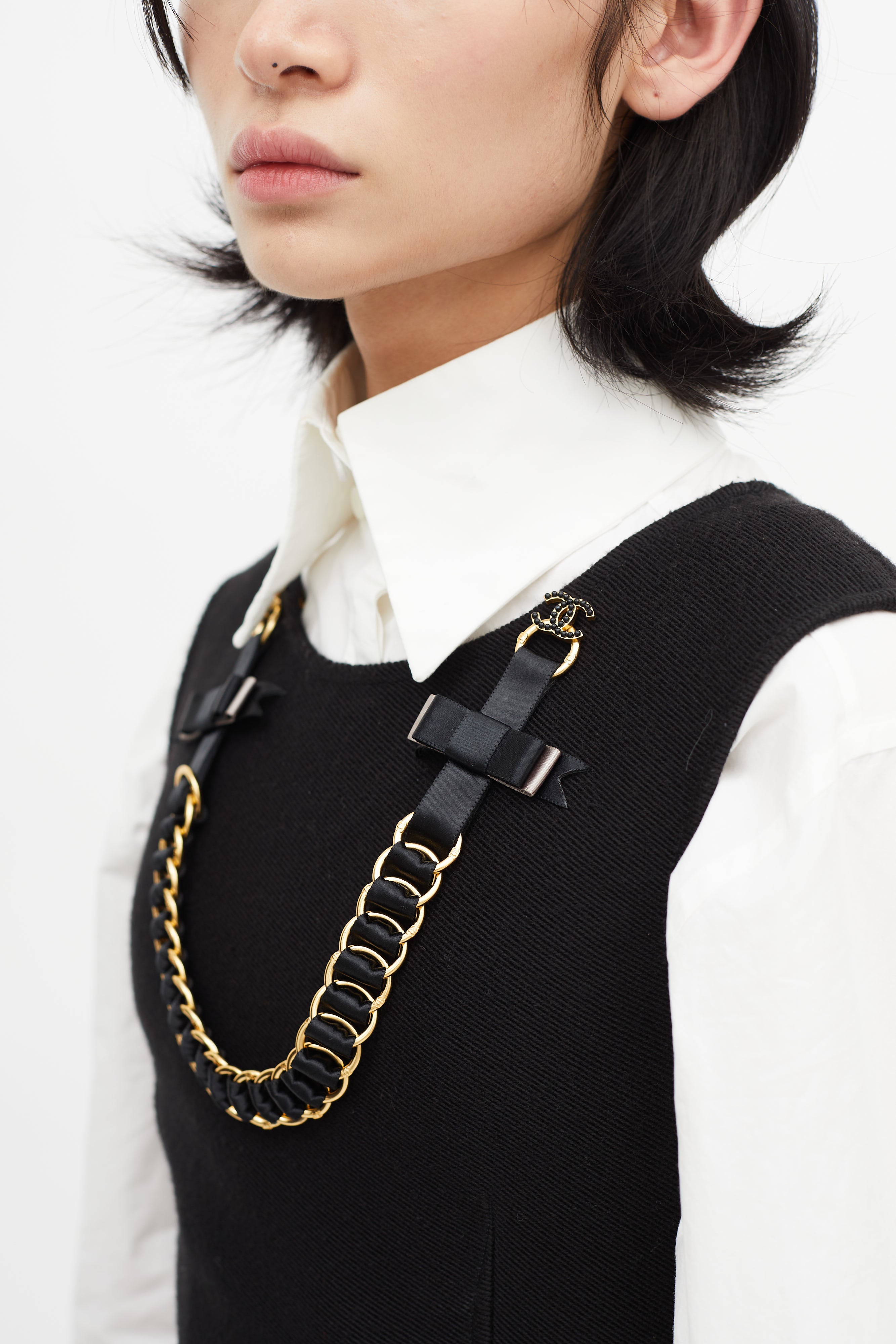 Pre-owned Chanel black and gold brooch featuring satin ribbon weave, gold tone chain link with embossed CC throughout, interlocking CC logo hardware tips with black beads embellishment, and pin backings. Styled as a collar tip. Comes with original box.