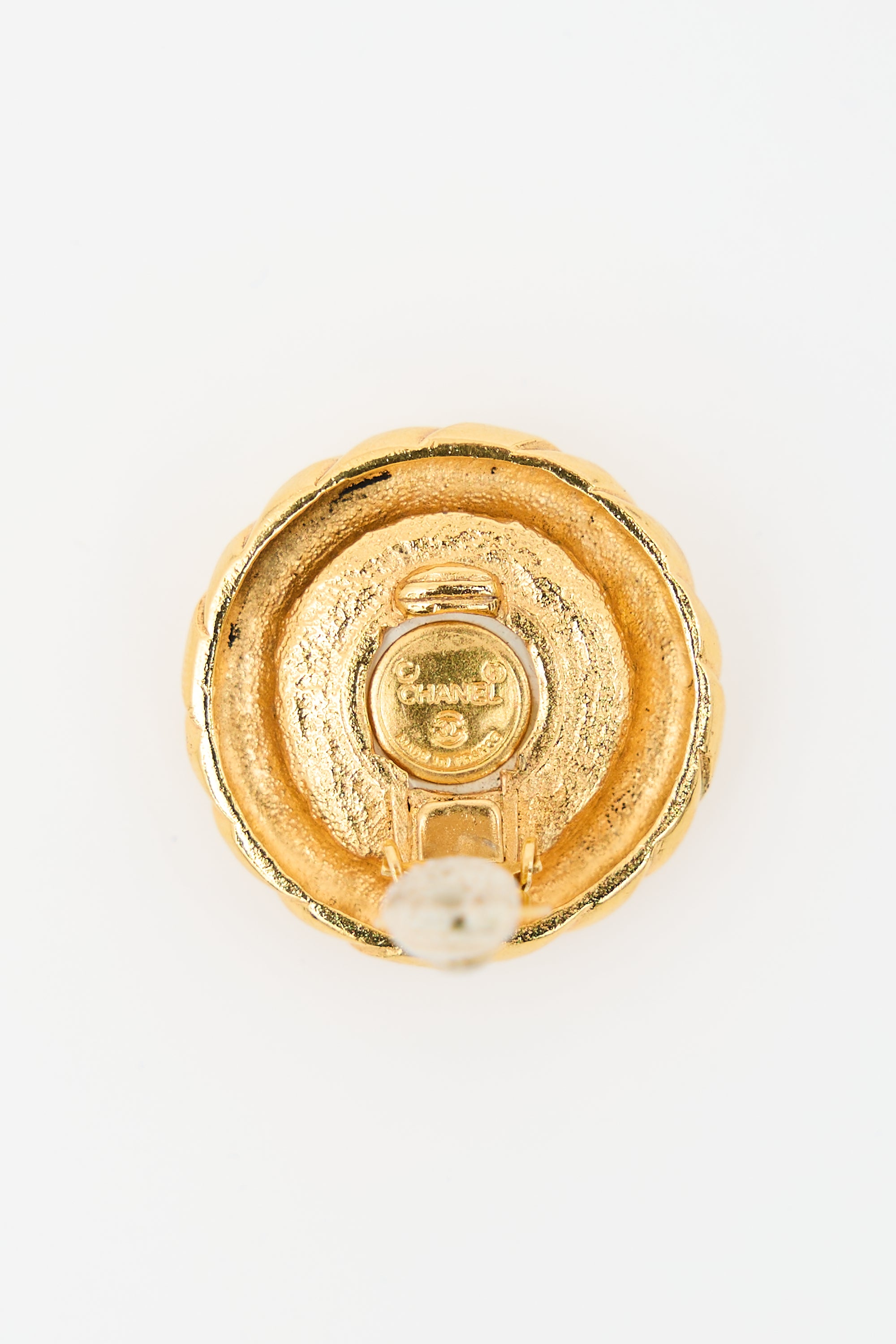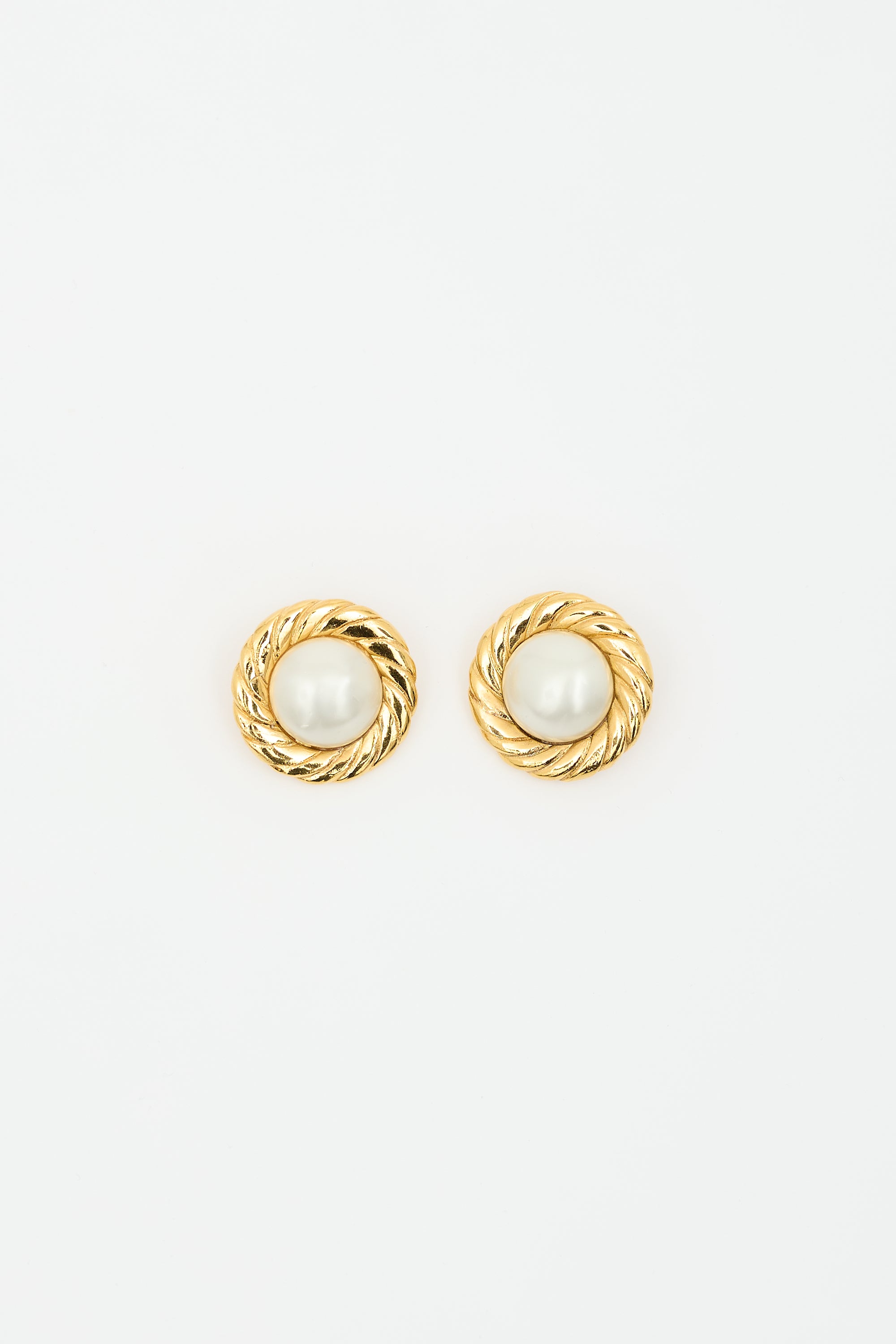 Pre-owned Chanel clip on earrings featuring a gold plated circular rope design, fix pearl centre, and hinged back.