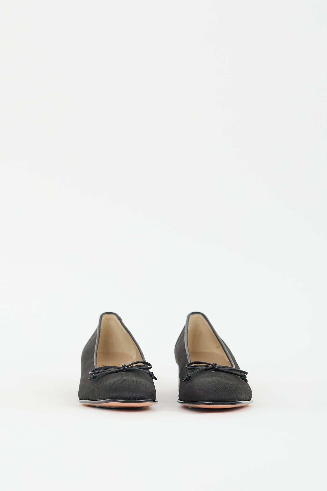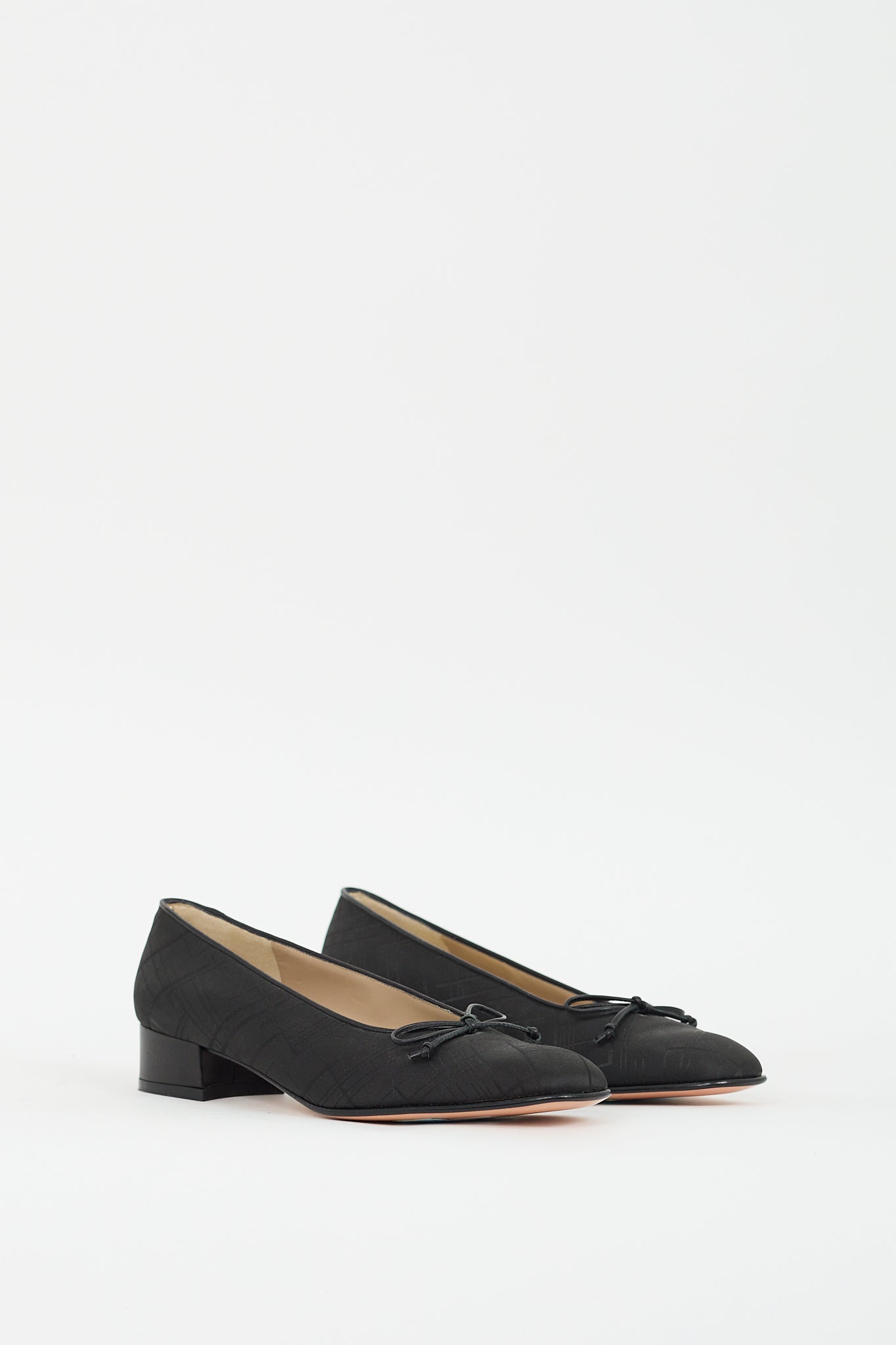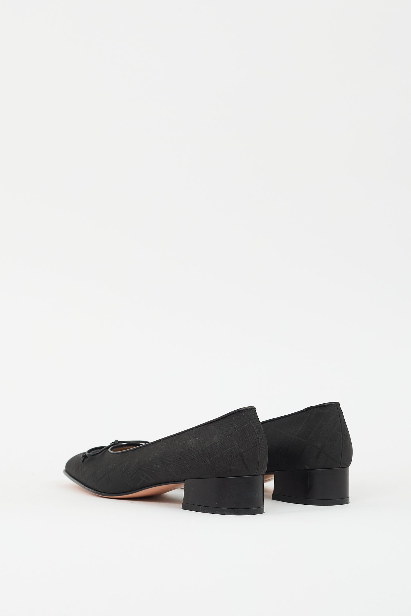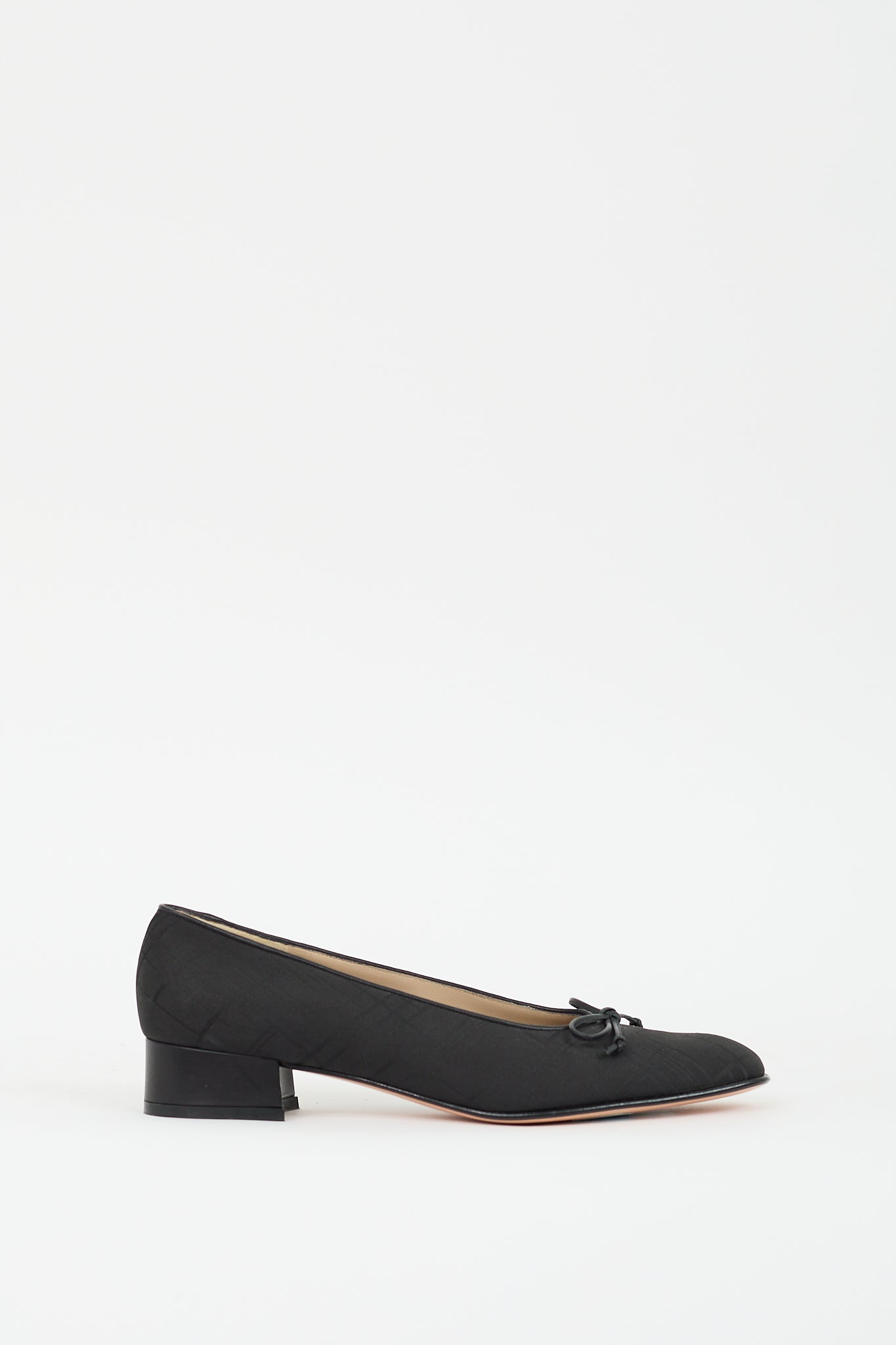 Pre-owned Ferragamo black plaid pumps featuring rounded square toe, bow at vamp, leather topline trim, covered block heel, and slip on entry.