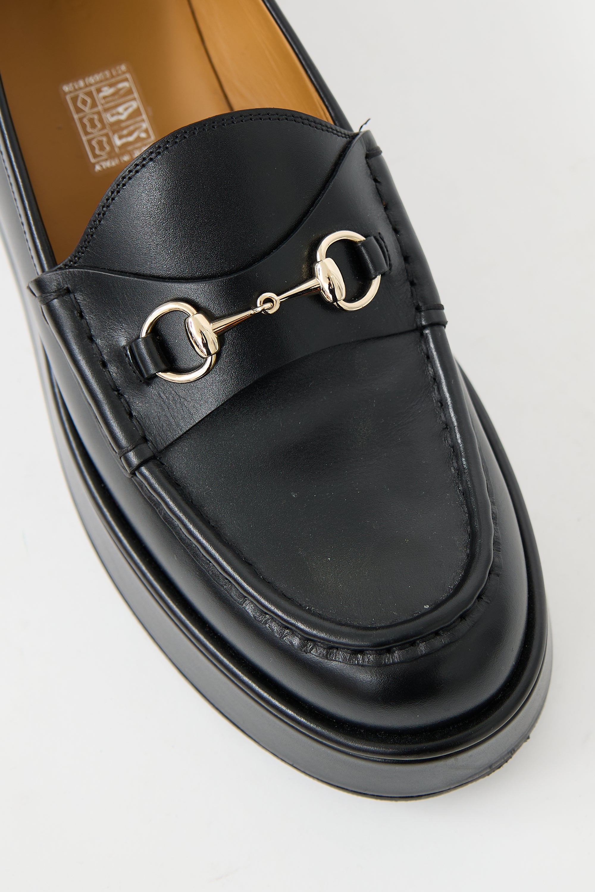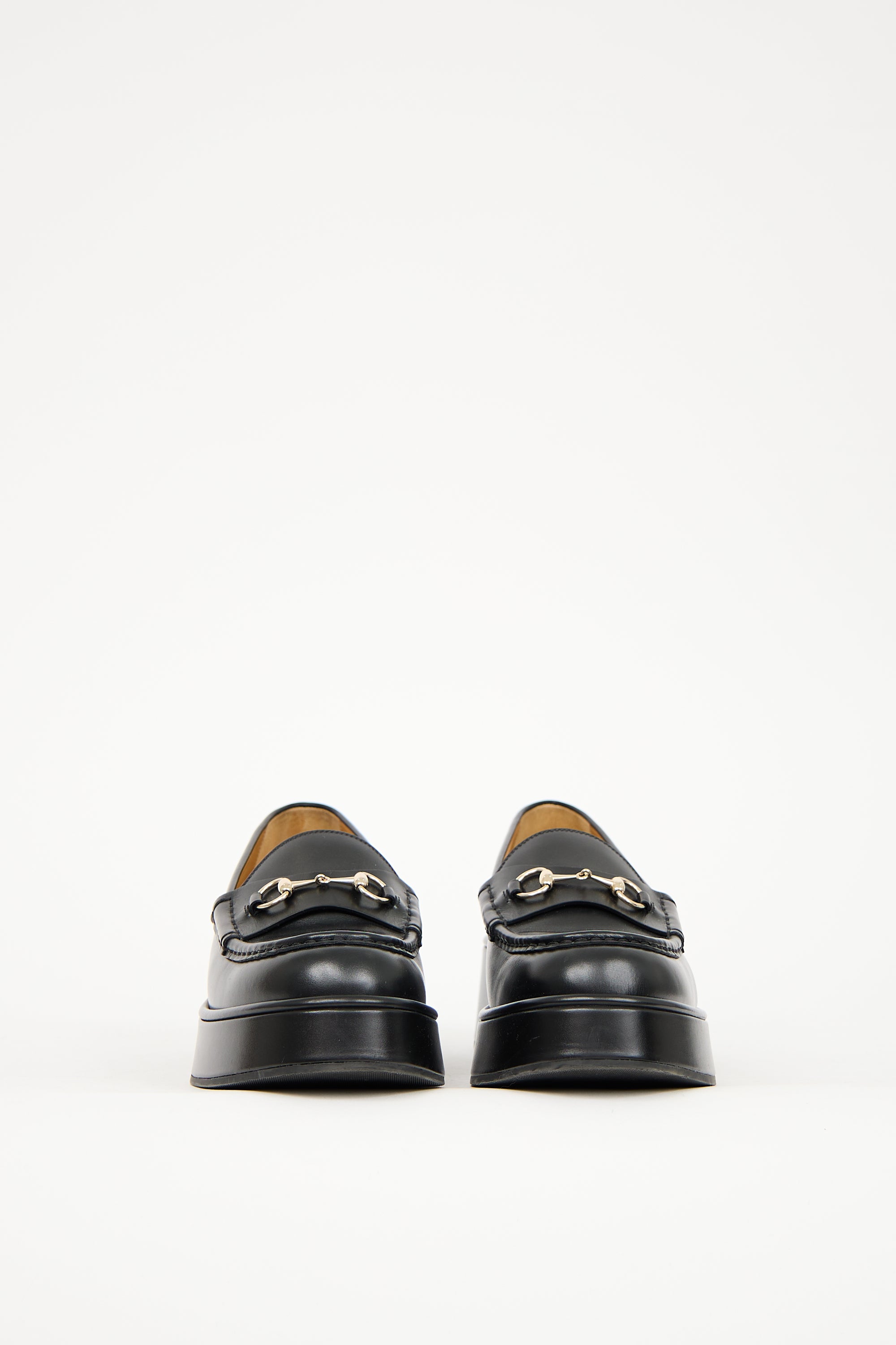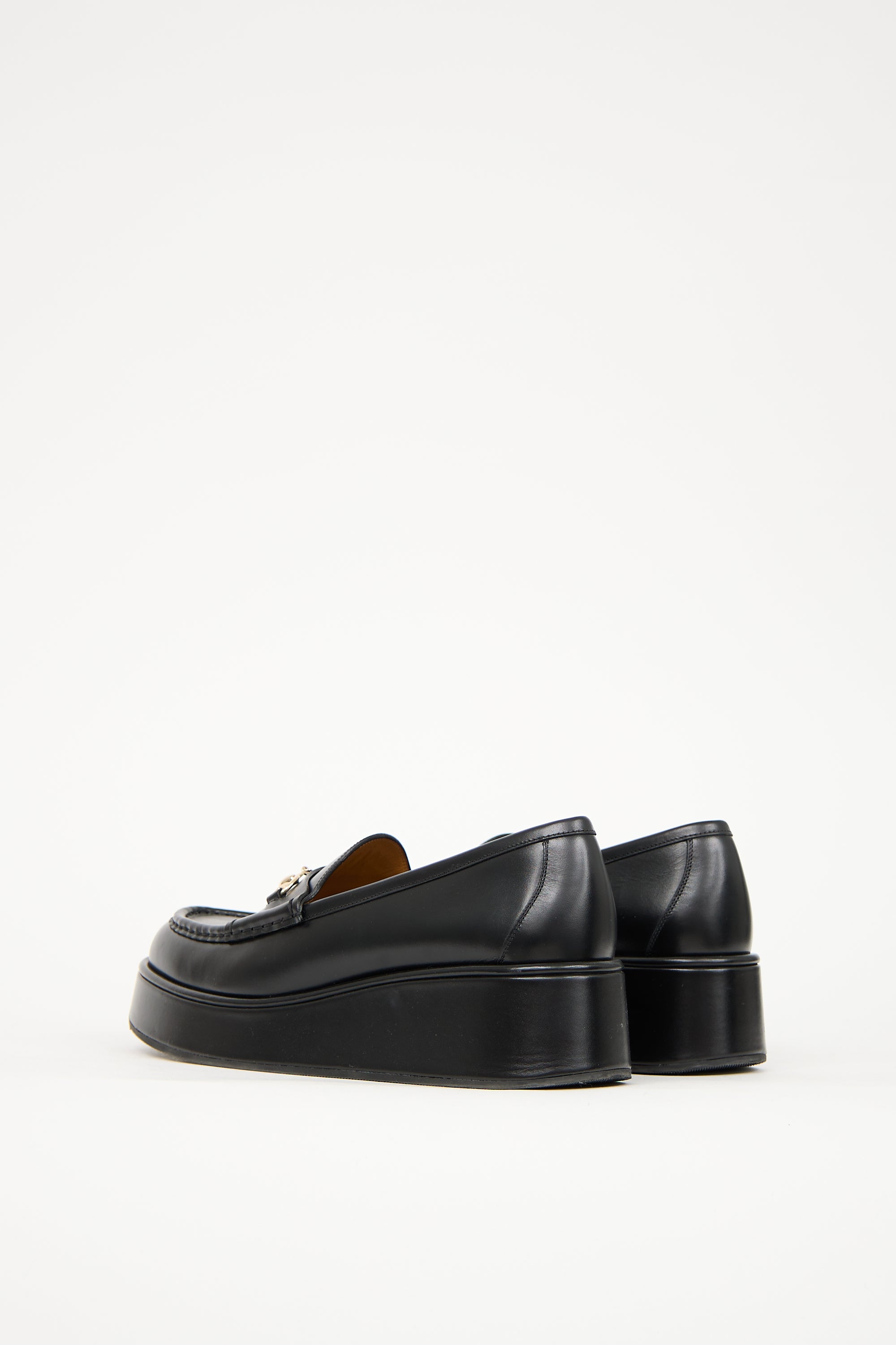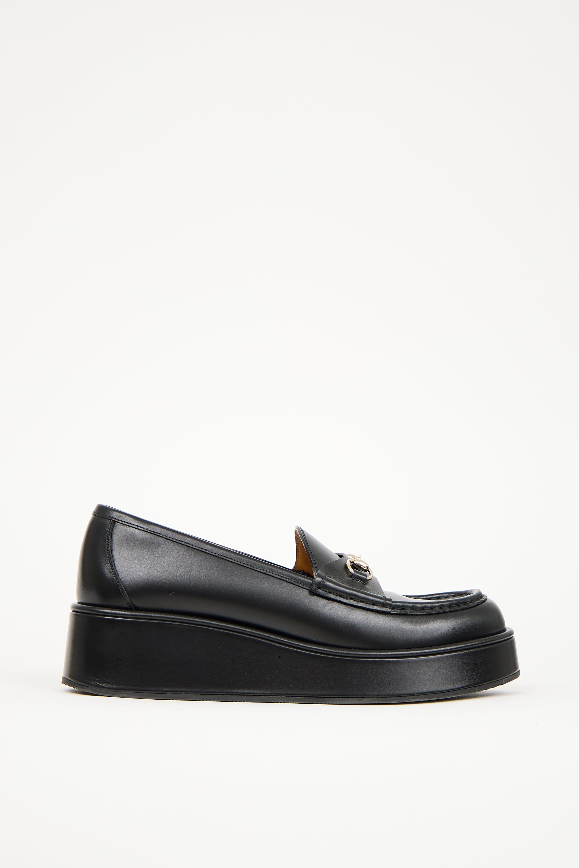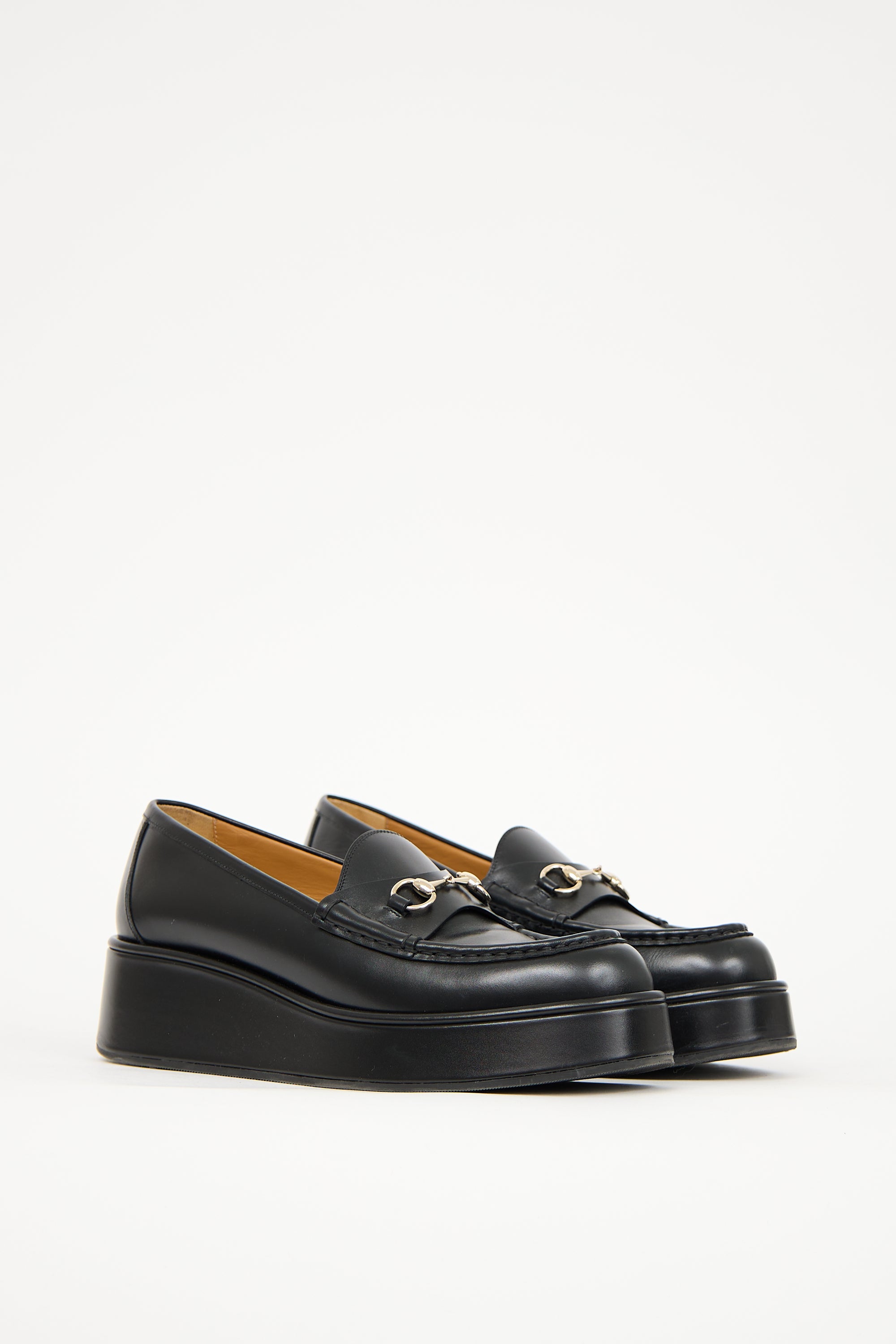 Pre-owned Gucci black leather platform wedge loafer featuring rounded toe, tonal stitching throughout, strap with silver tone Horsebit hardware across vamp, slip on entry, and covered wedge heel.