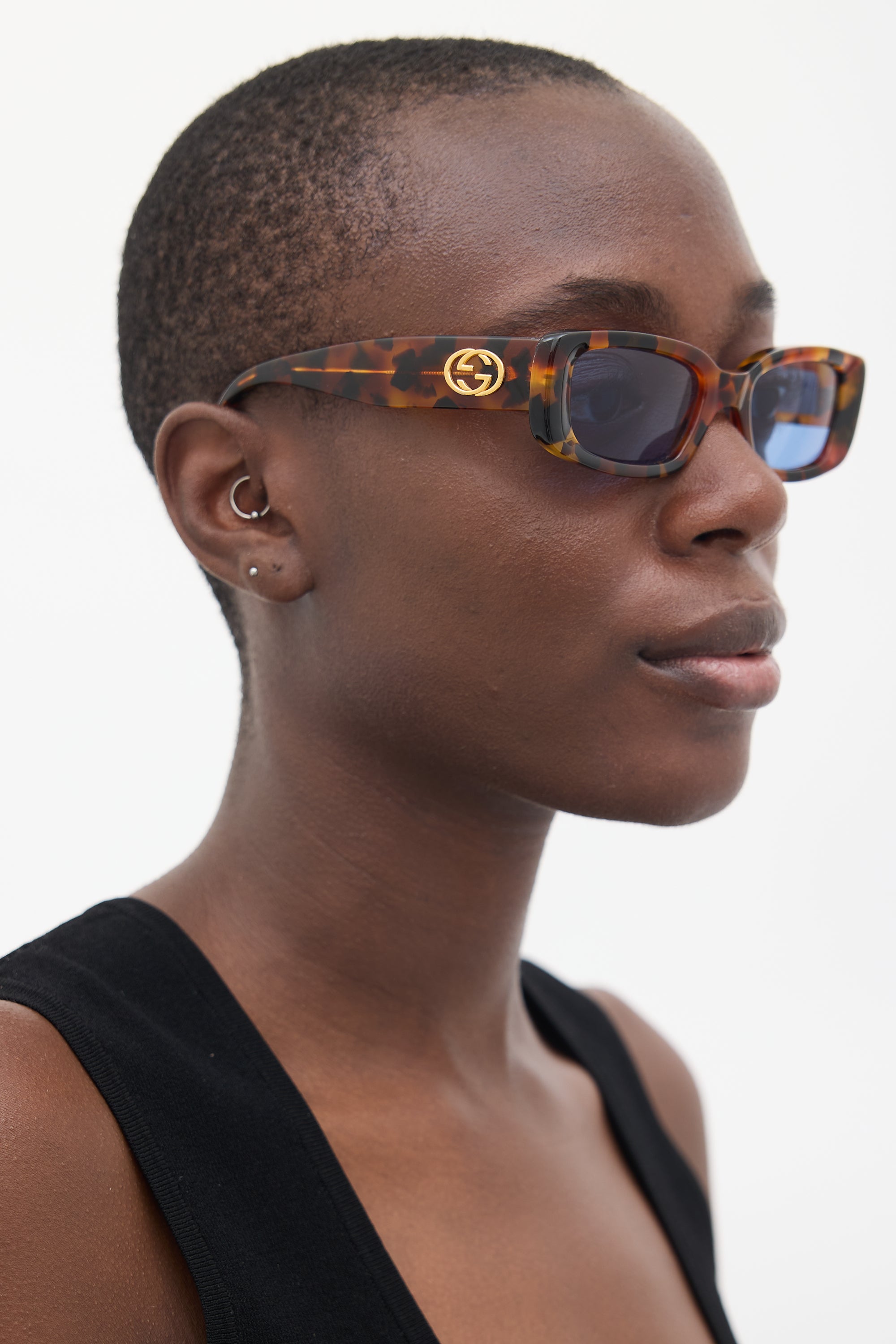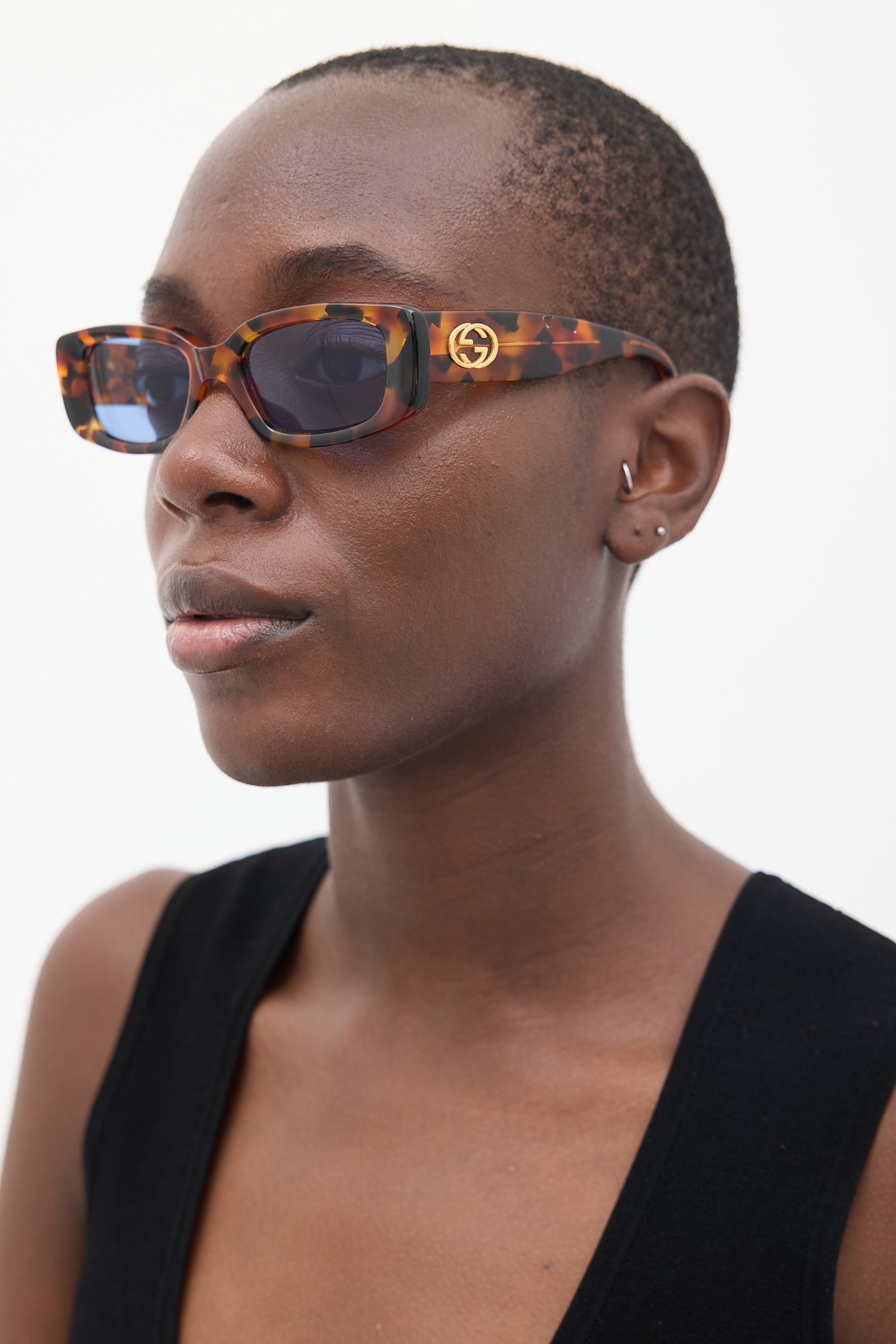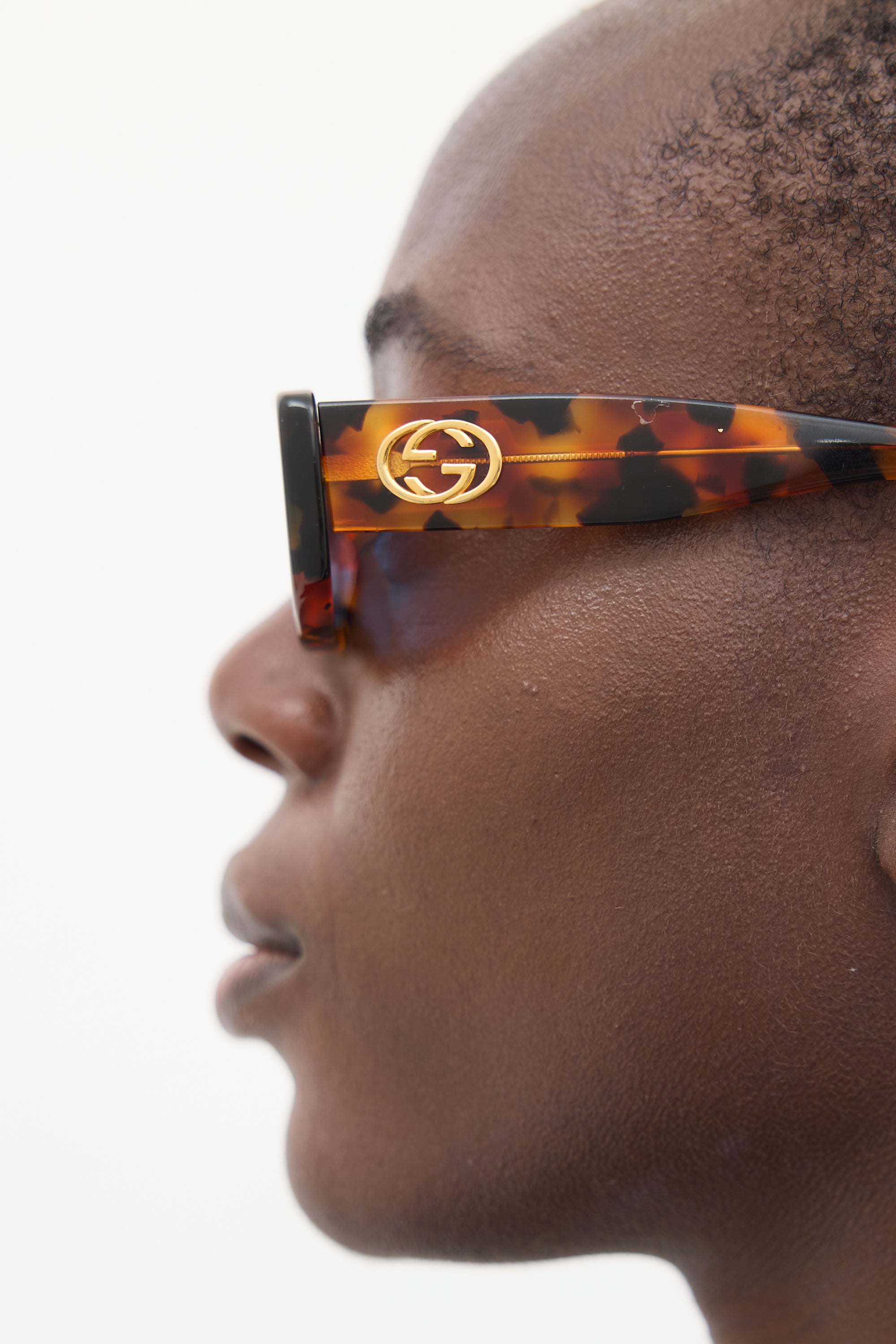 Pre-owned Gucci brown GG2409S sunglasses featuring a rectangular tortoise shell frame, tinted lenses, nose pads, and gold tone GG logo hardware at temples.
