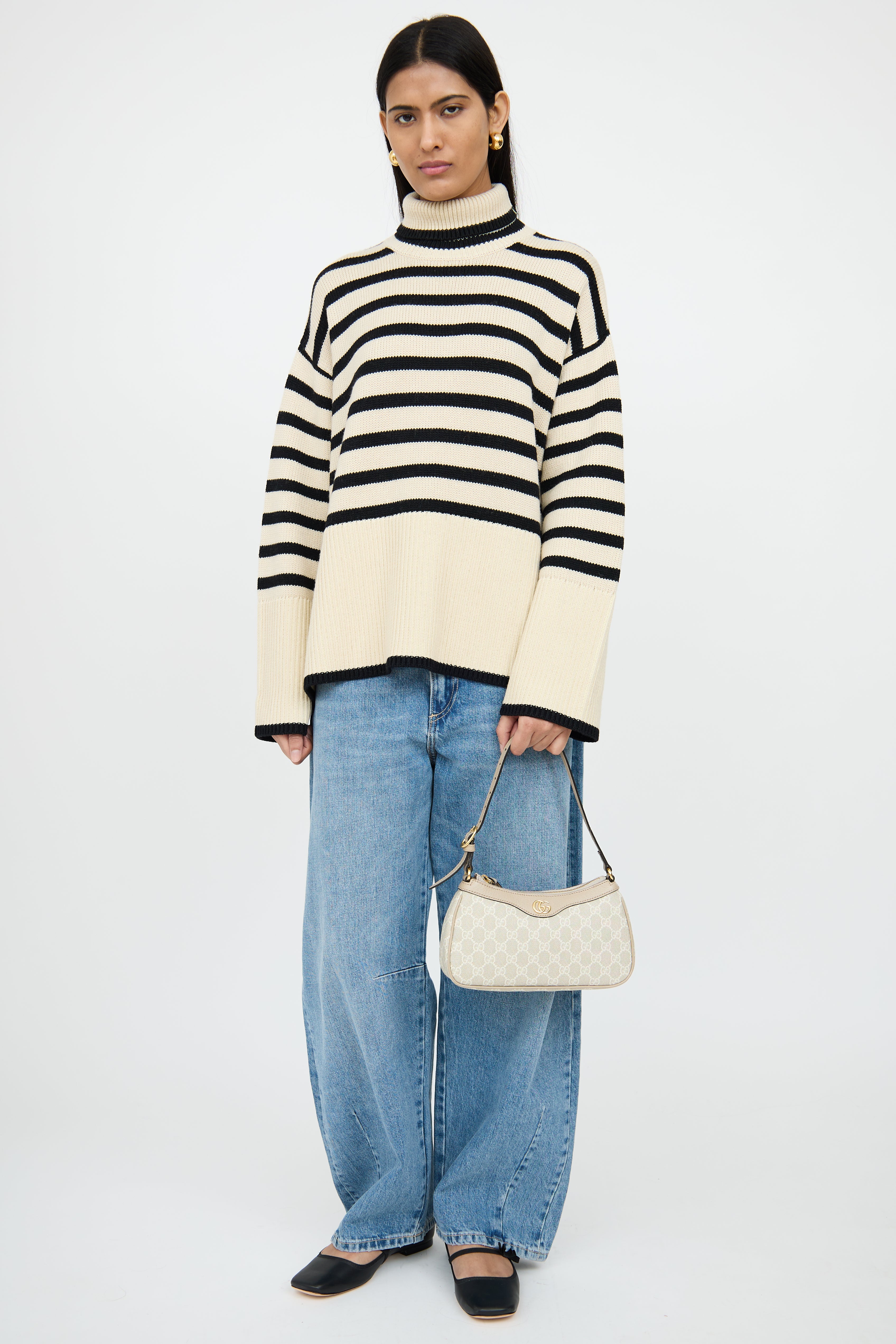 Pre-owned Gucci cream Supreme Ophidia bag featuring single flat adjustable shoulder strap, gold tone hardware, GG monogram throughout, rolled edge trim, GG logo plaque on front and zip closure top with tassel. Canvas lined main compartment and single slip pocket.