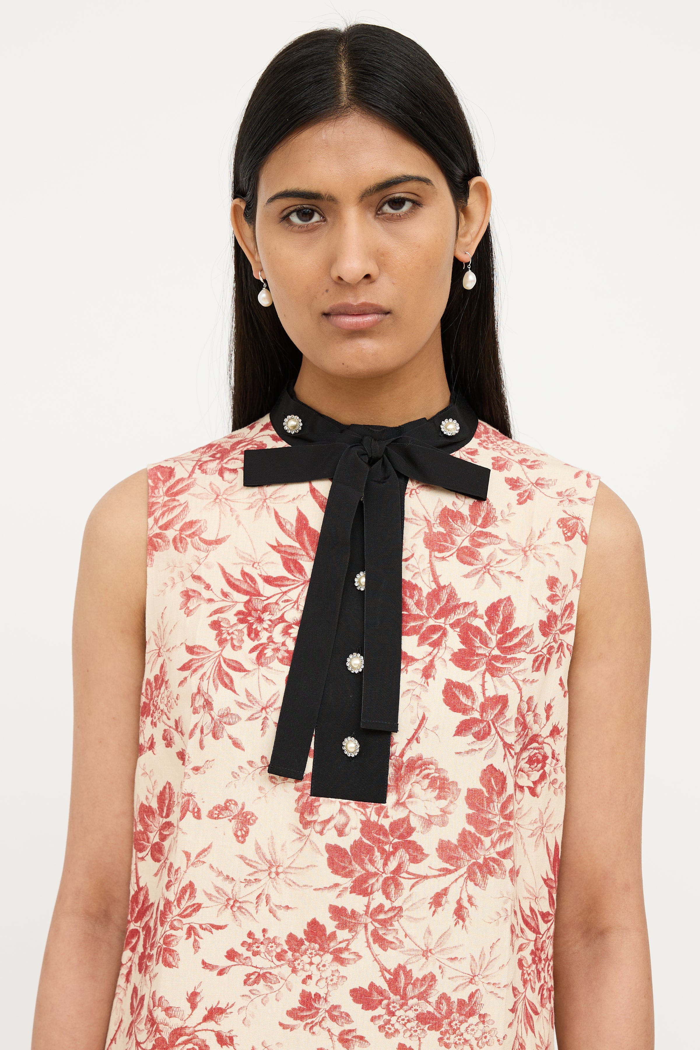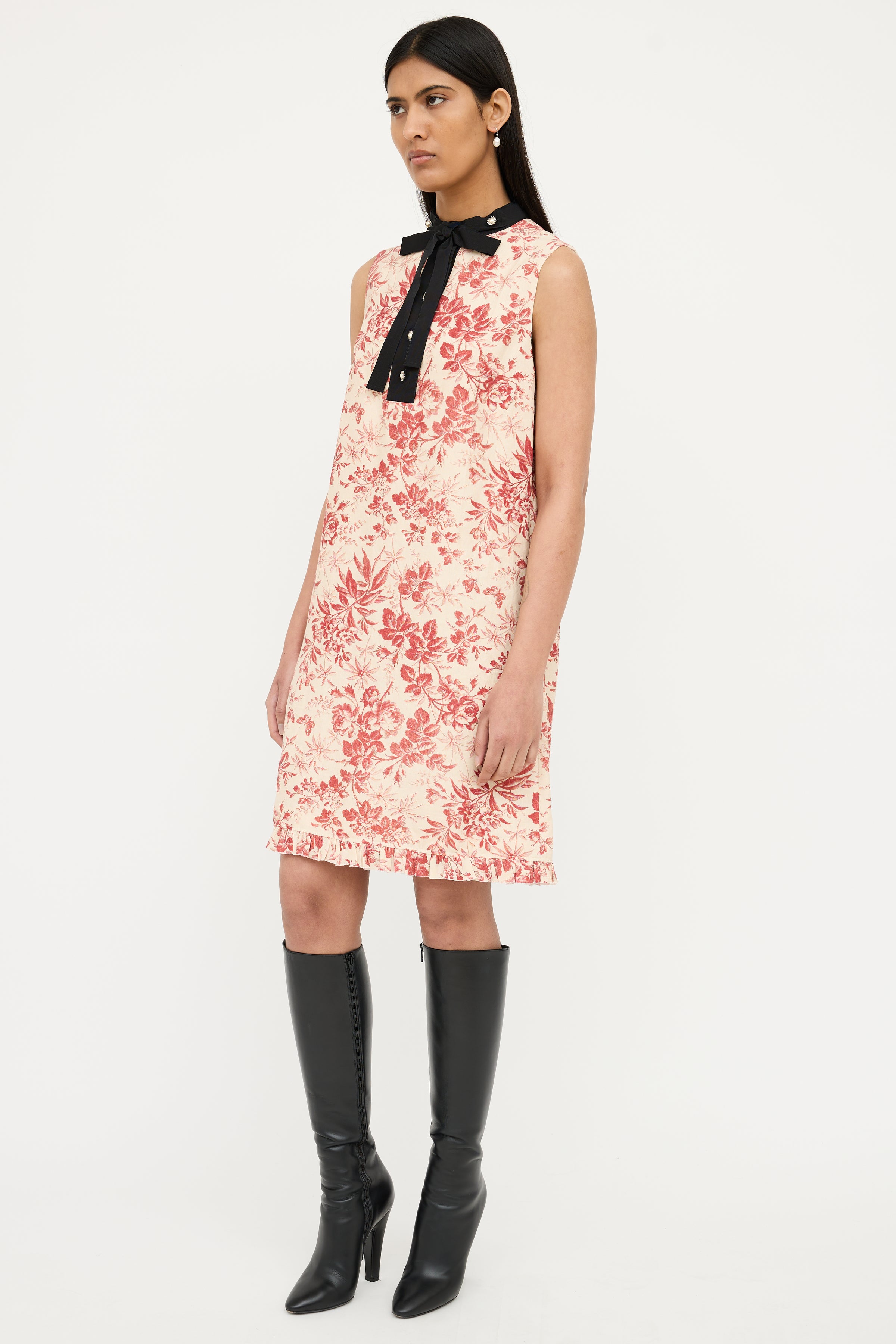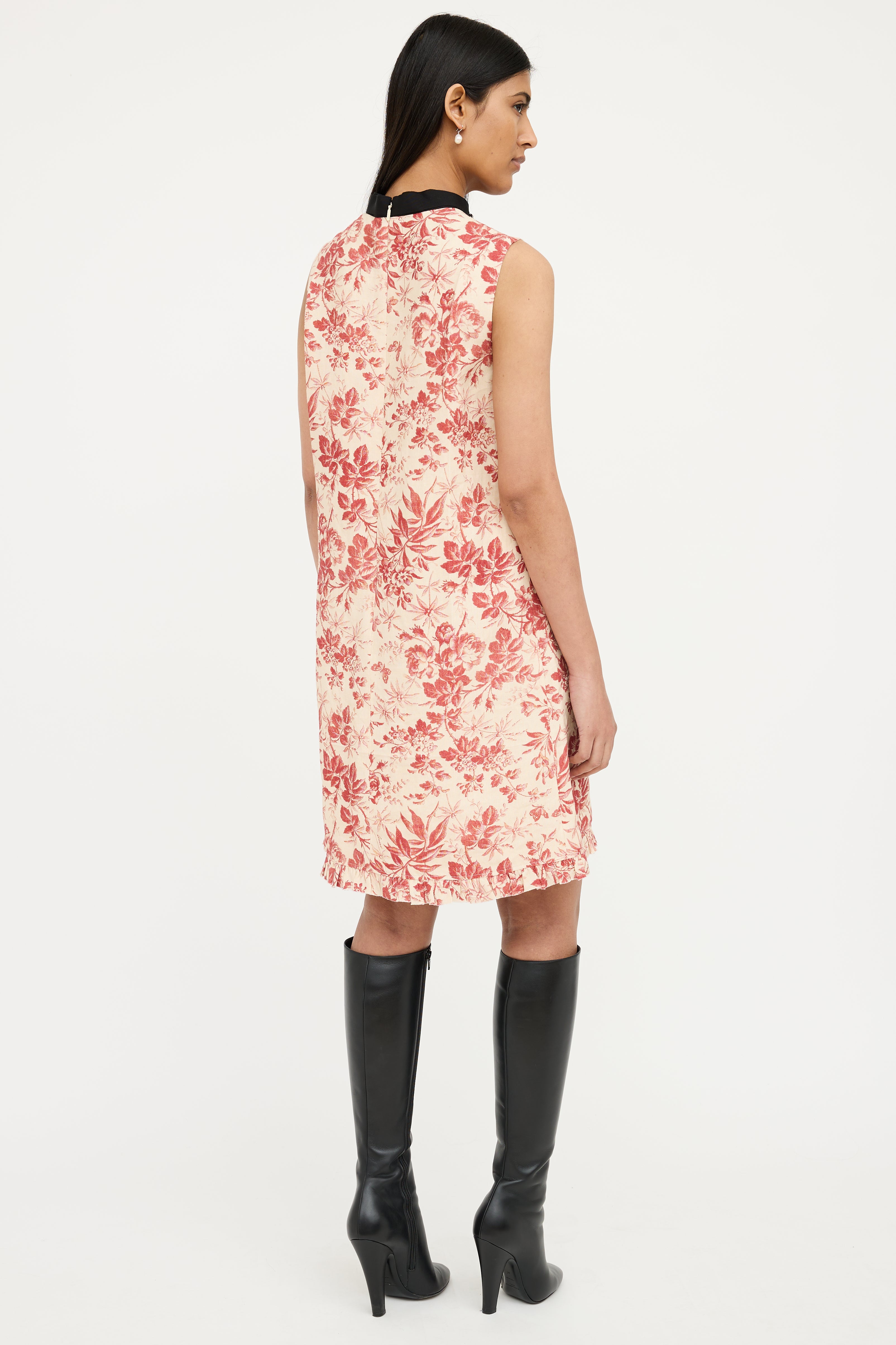 Pre-owned Gucci cream sleeveless dress featuring webbed round collar with black bow and pearlescent buttons, red floral print, ruffle hem and concealed zip back entry. Fully lined.