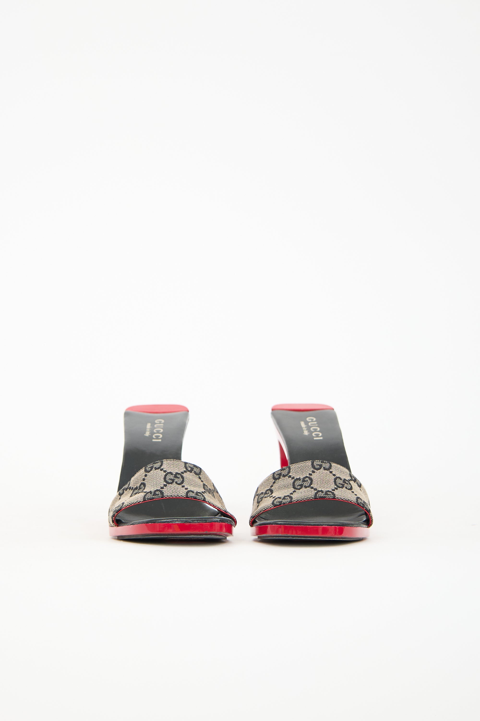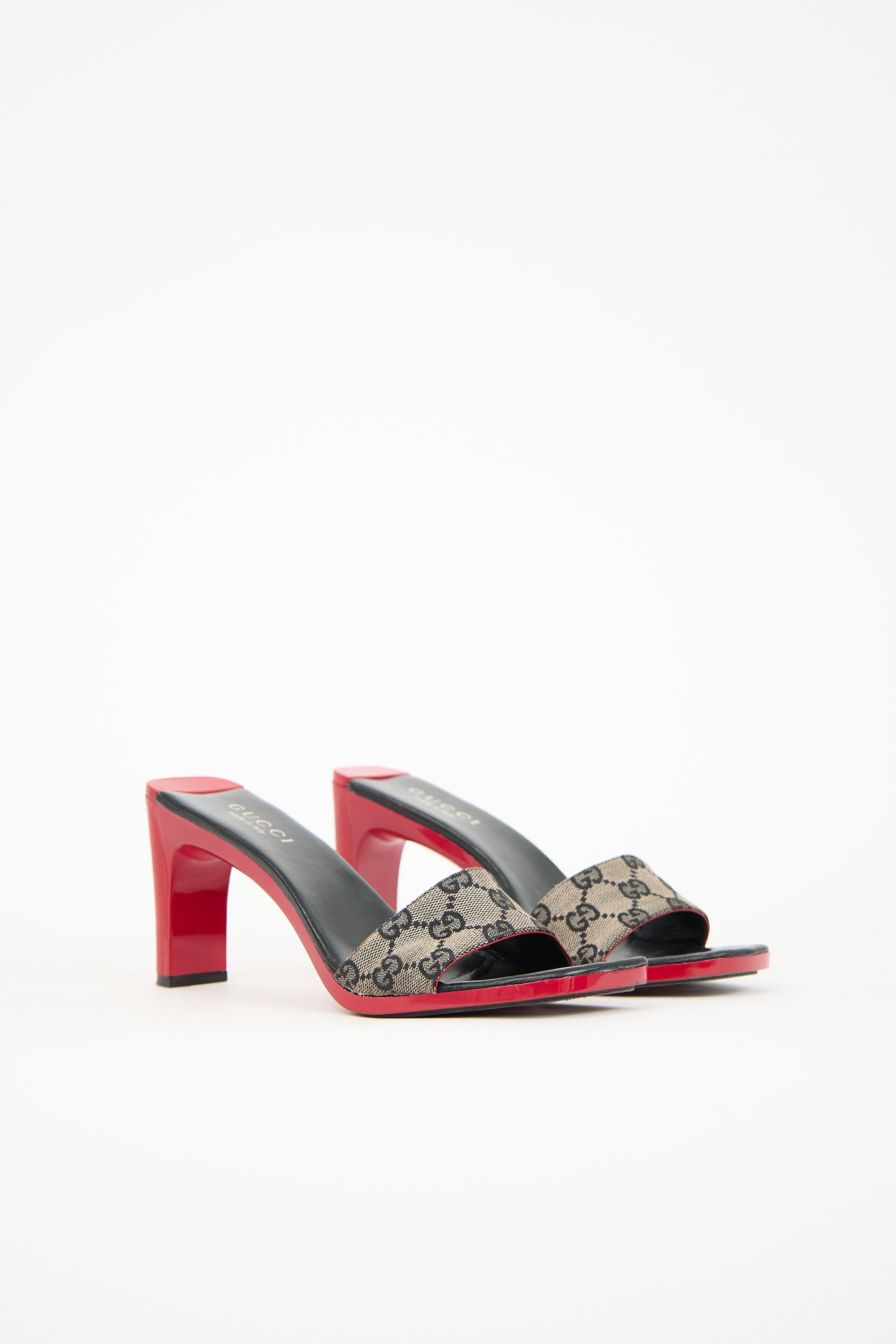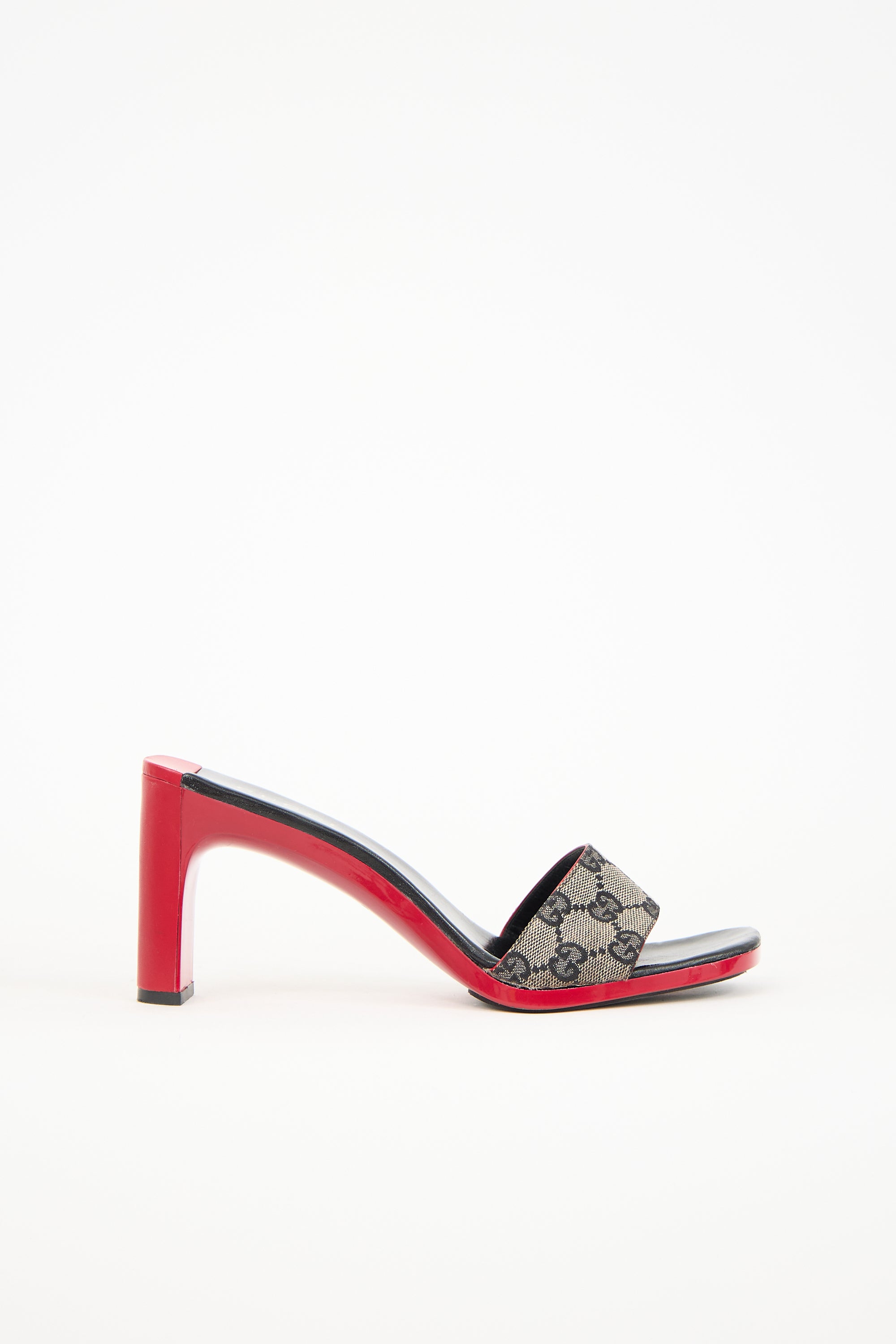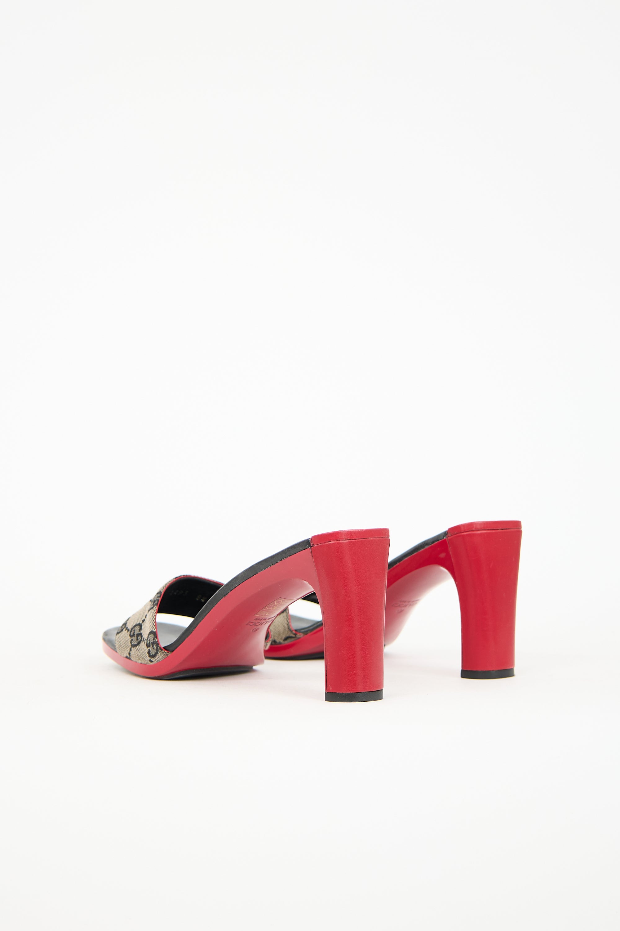 Pre-owned Gucci vintage heeled sandals featuring open square toe, GG Supreme canvas vamp strap, and red leather outsole and block heel.