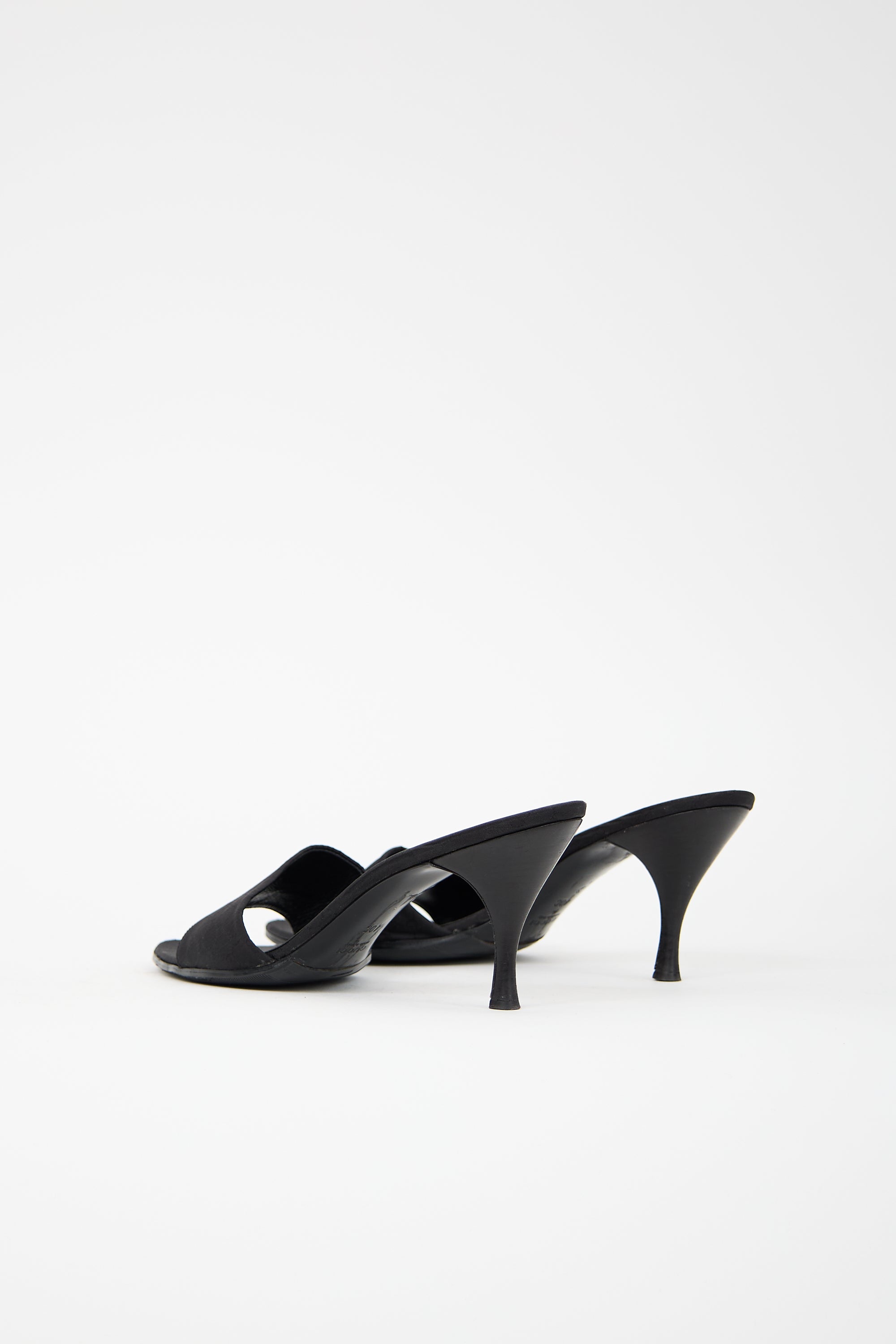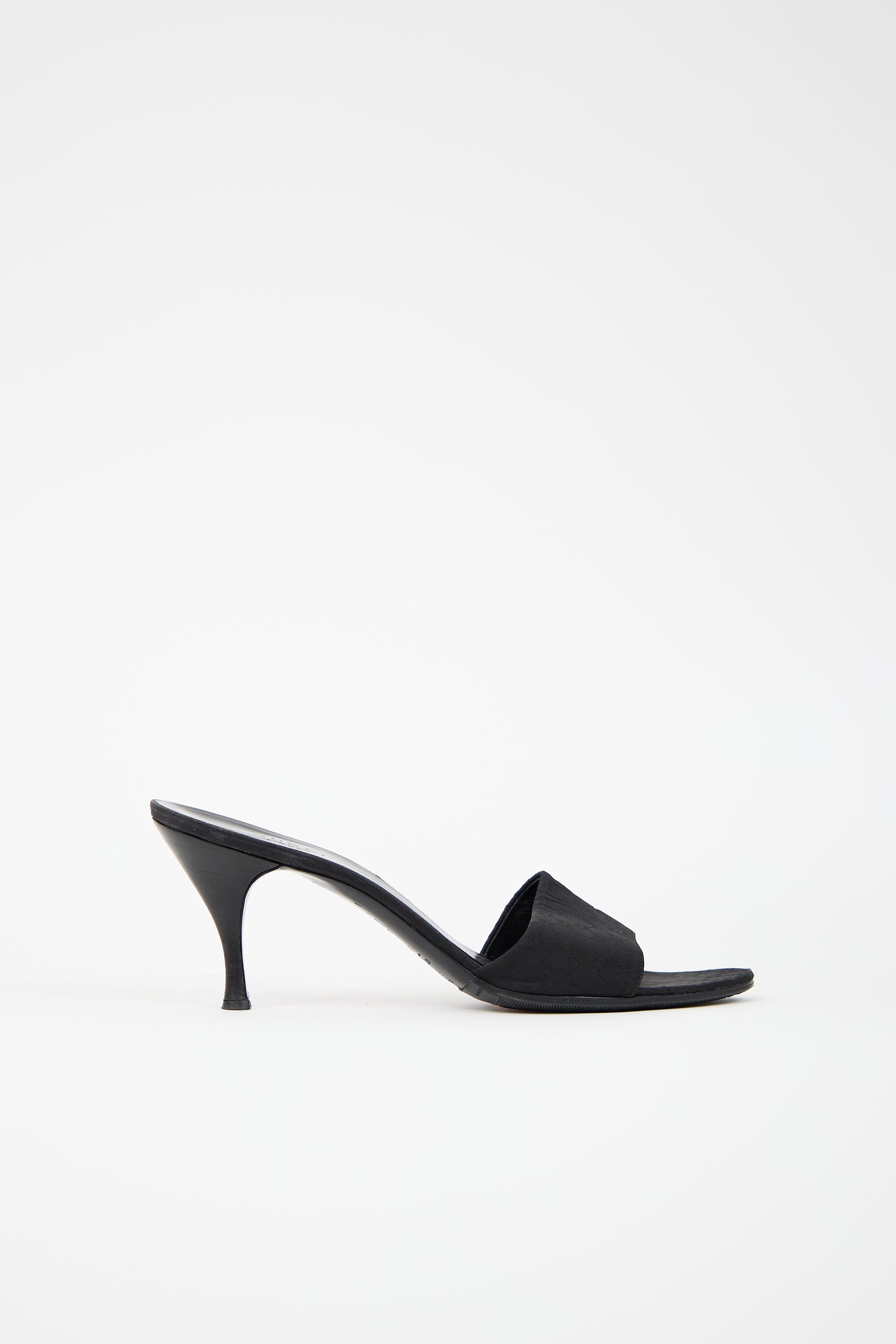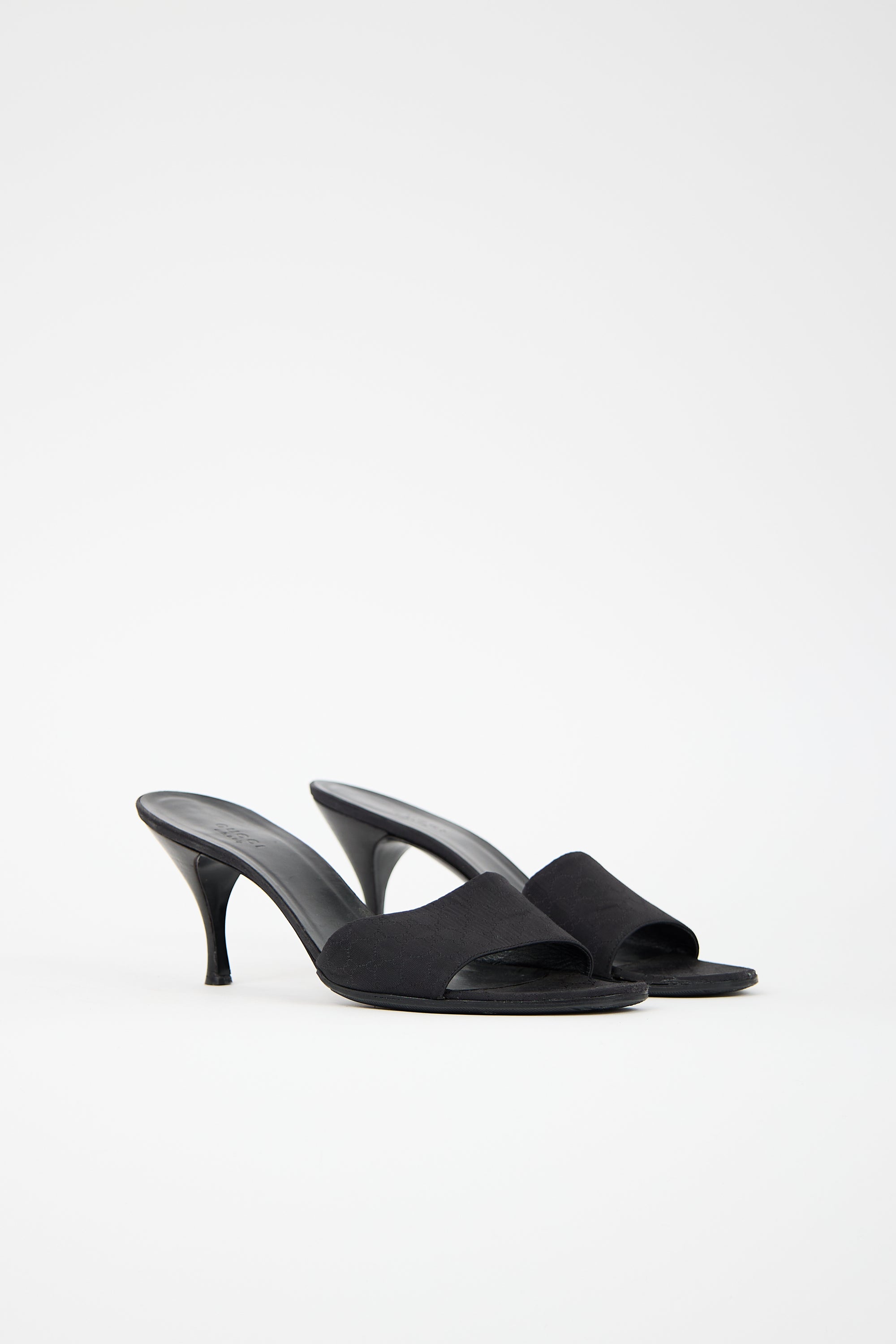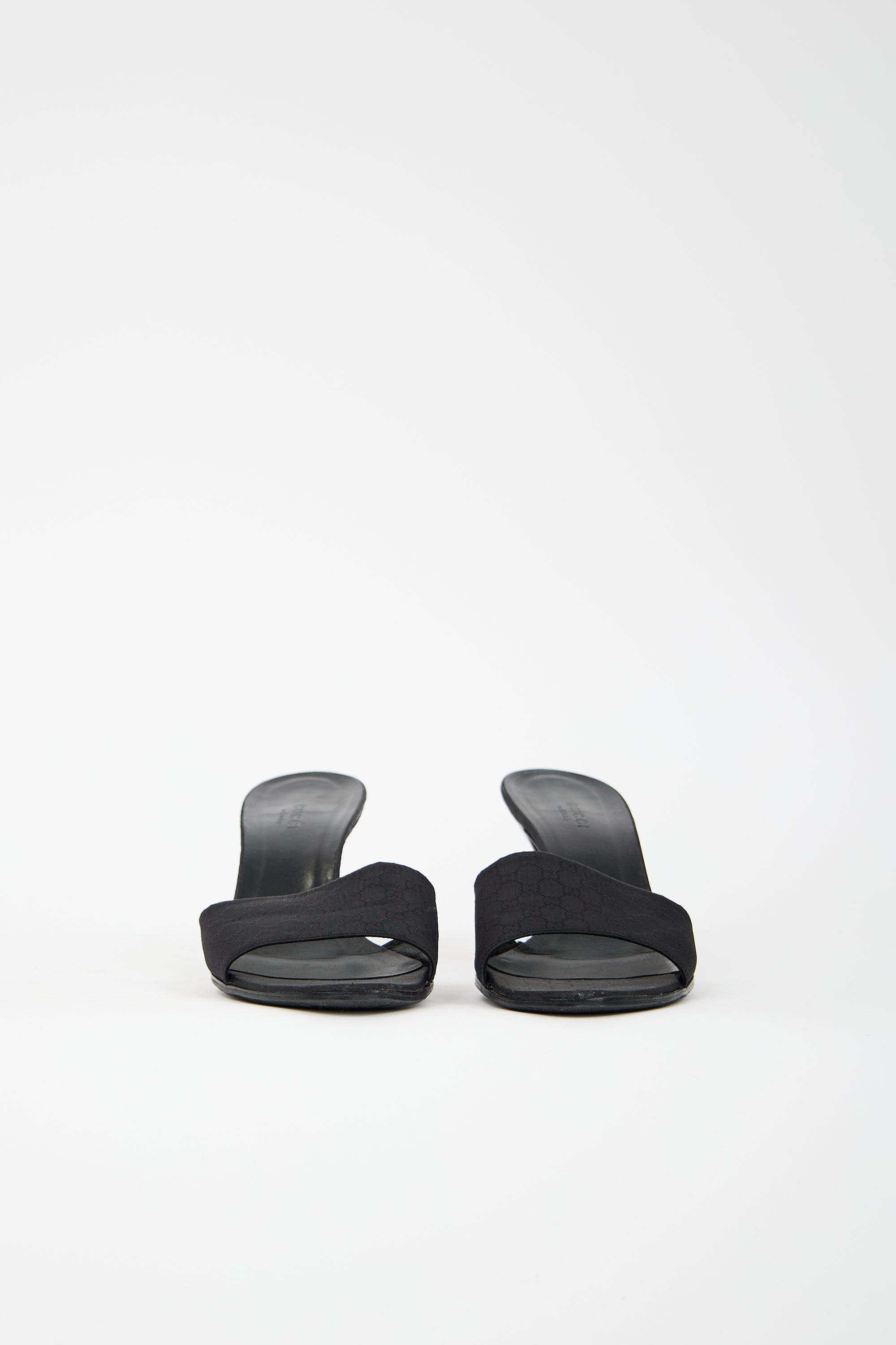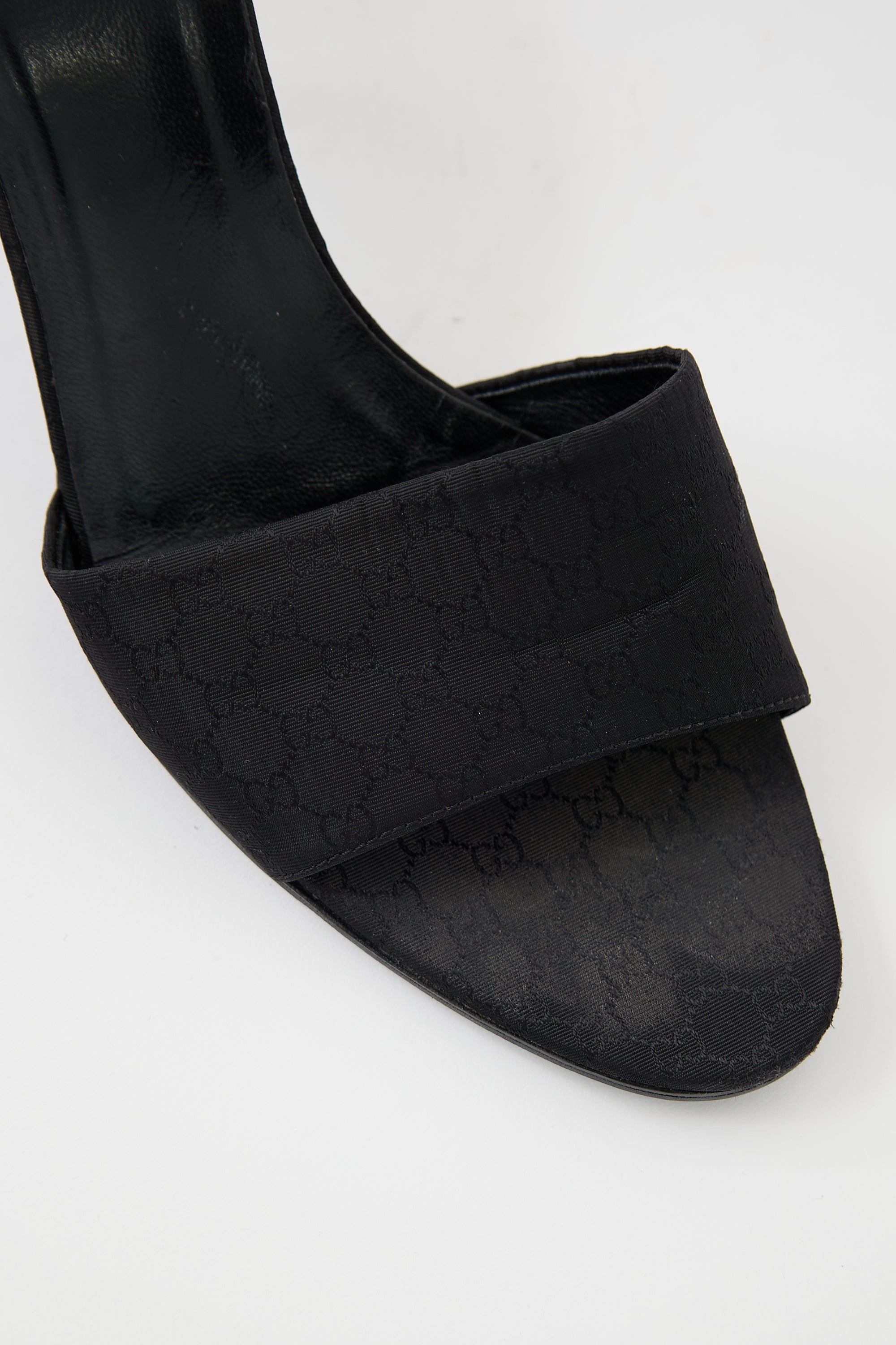 Pre-owned Gucci vintage black sandals featuring open almond toe, GG monogram canvas at vamp and toe, and stacked heel.