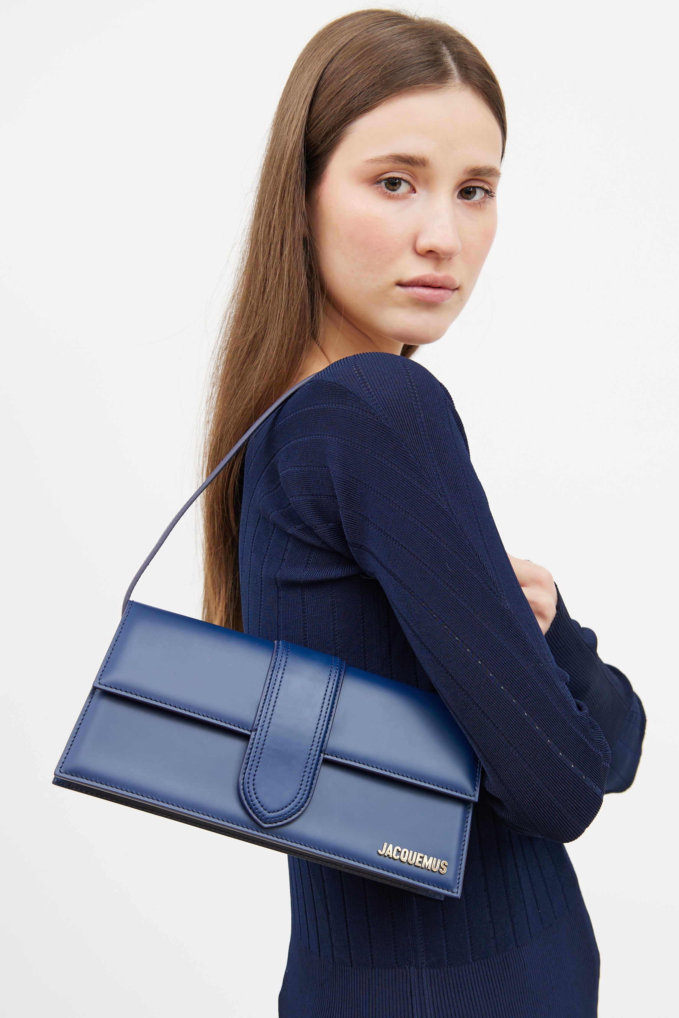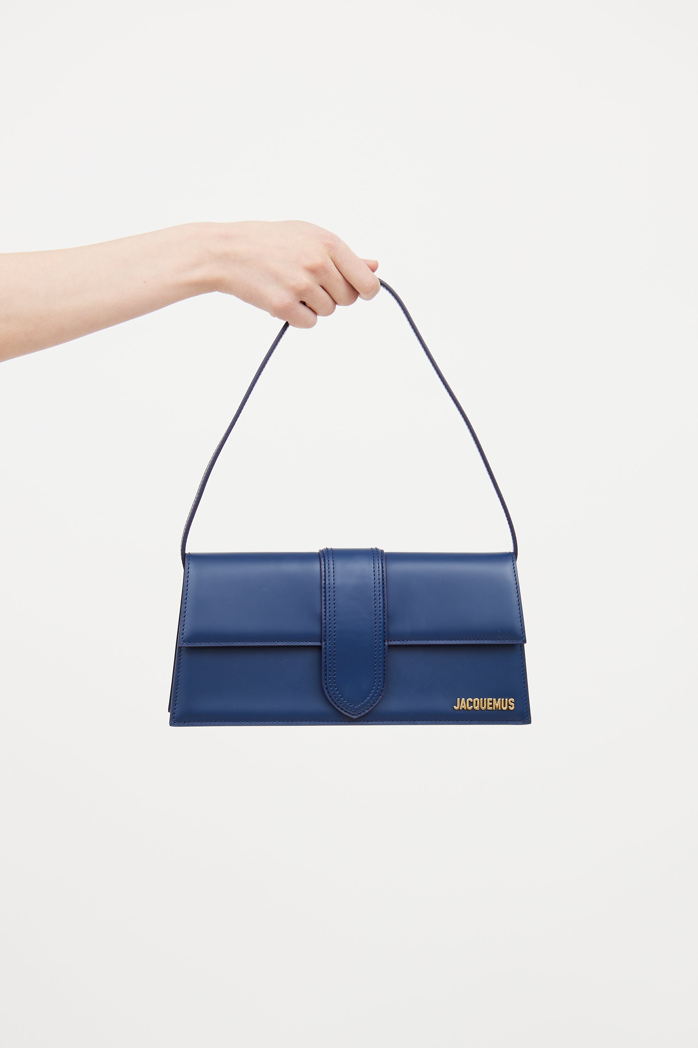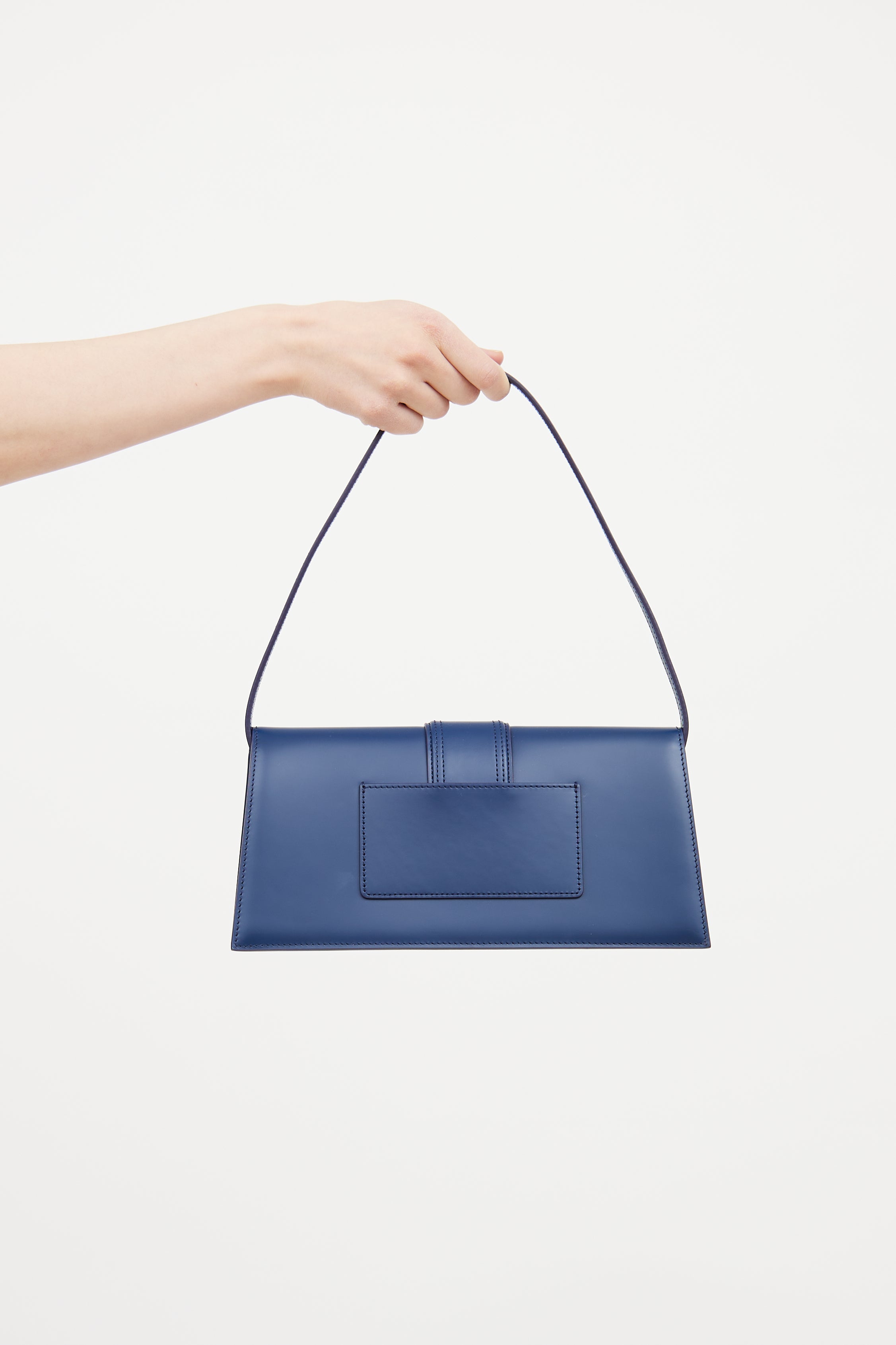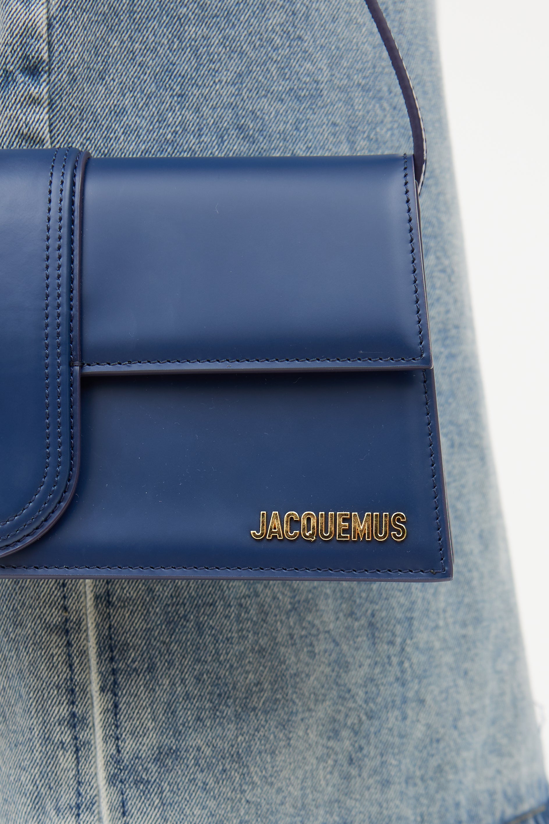 Pre-owned Jacquemus Le Bambino shoulder bag featuring navy smooth leather, tonal stitching, fold over front flap with magnetic button closure, single shoulder strap, slip pocket at back and gold tone metal logo detail at front. Interior features one main compartment and one slip pocket.