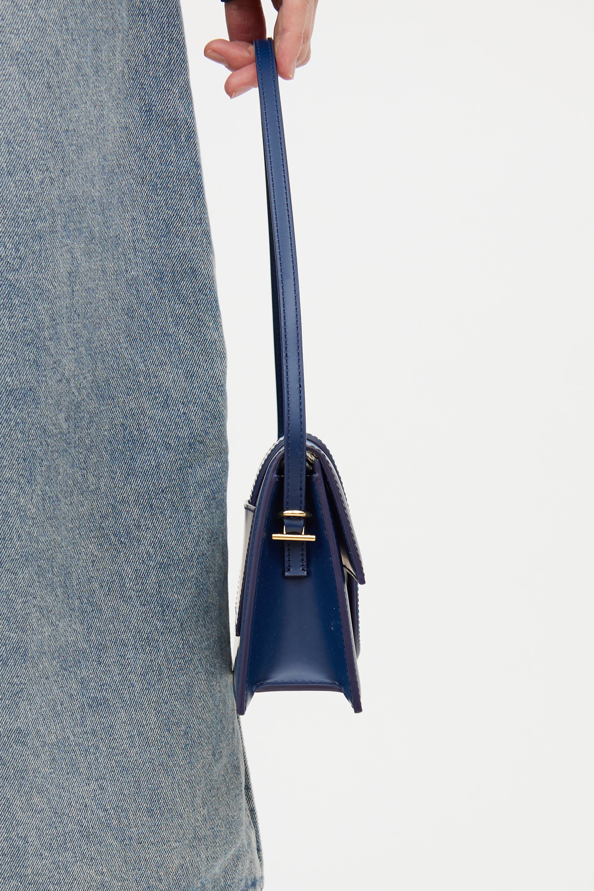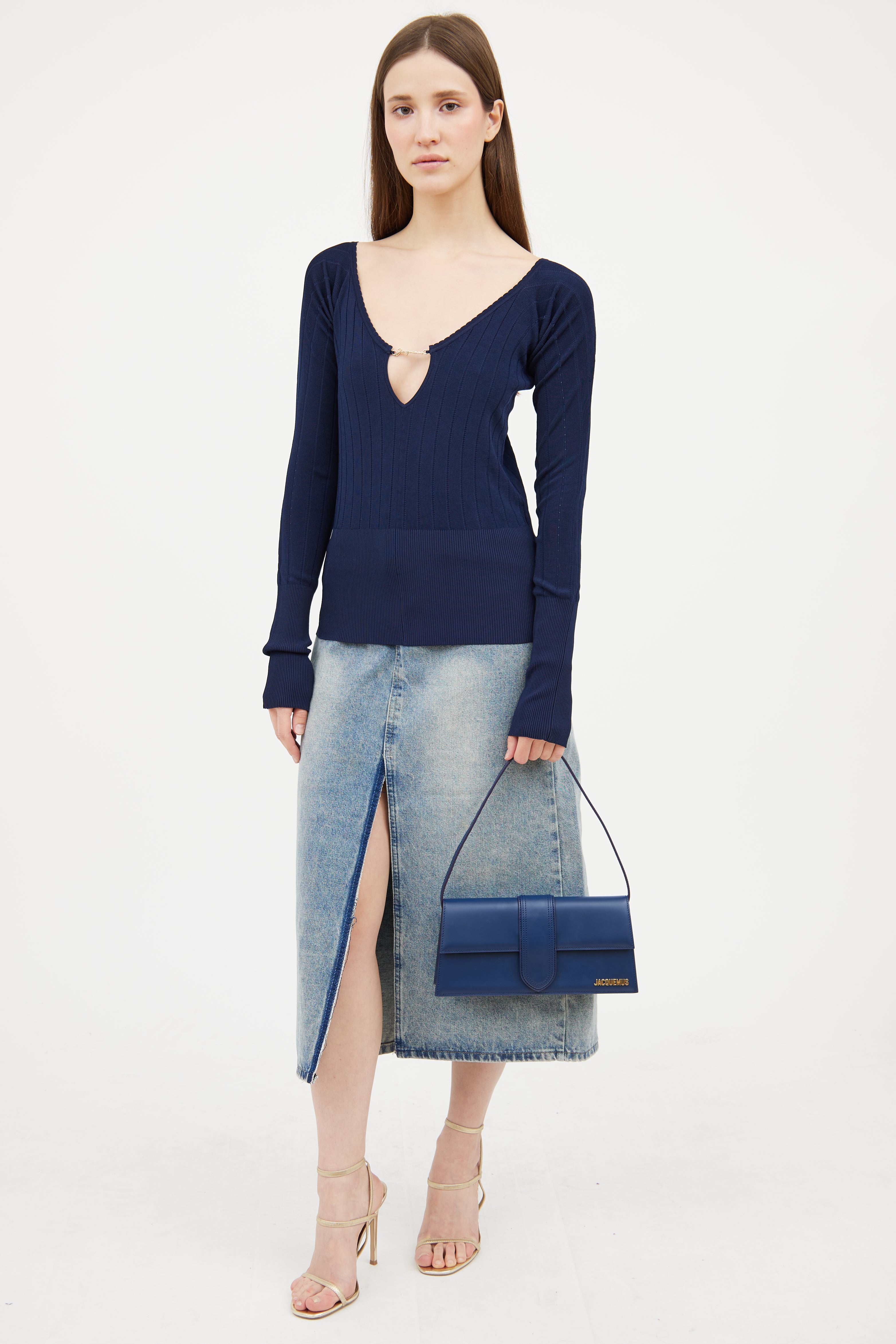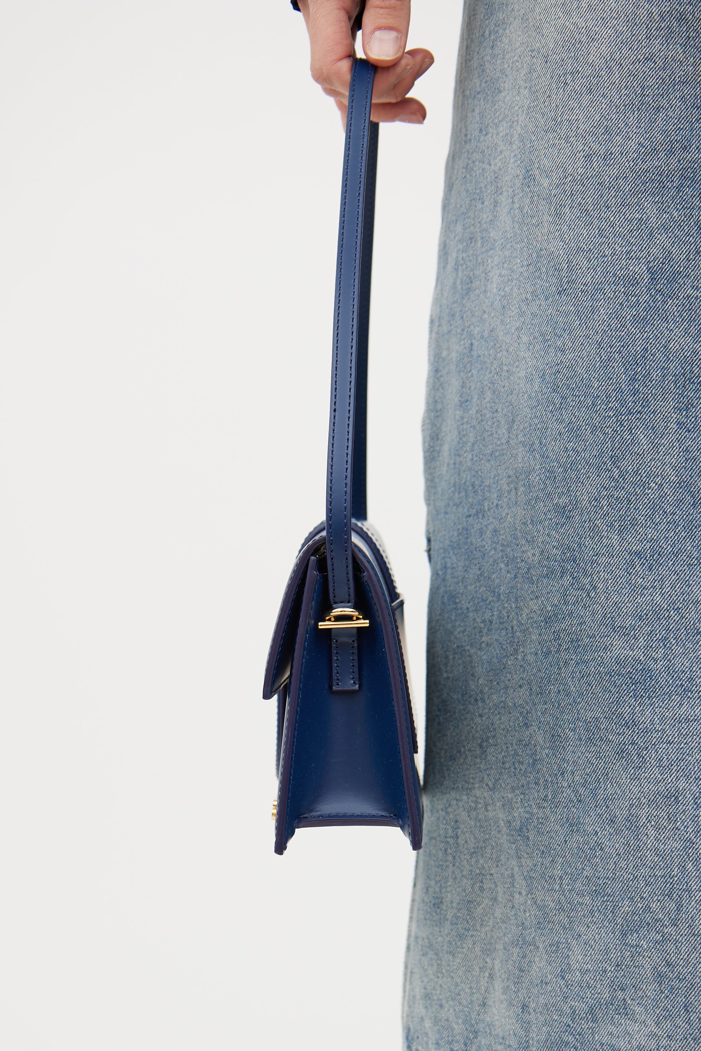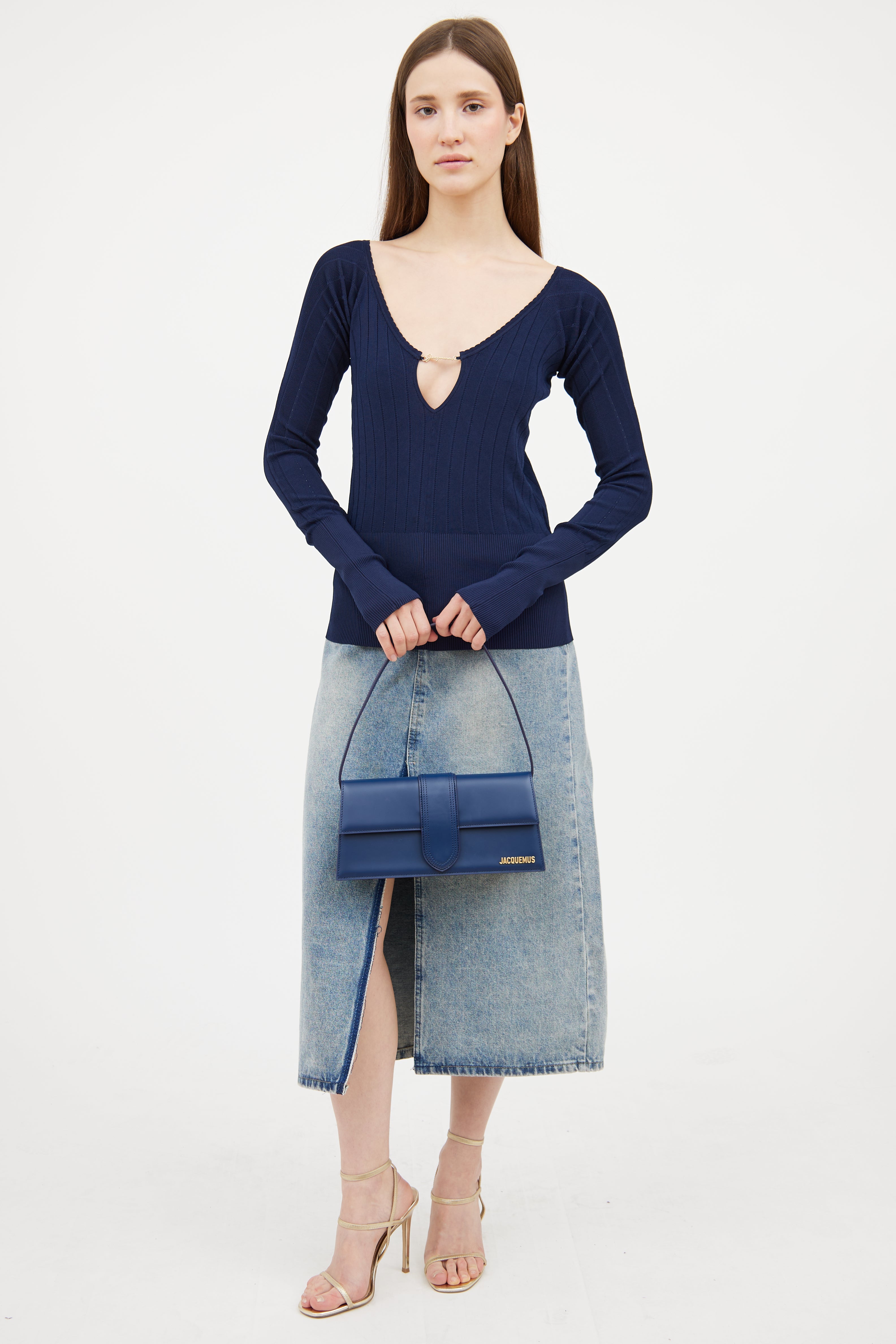 Pre-owned Jacquemus Le Bambino shoulder bag featuring navy smooth leather, tonal stitching, fold over front flap with magnetic button closure, single shoulder strap, slip pocket at back and gold tone metal logo detail at front. Interior features one main compartment and one slip pocket.