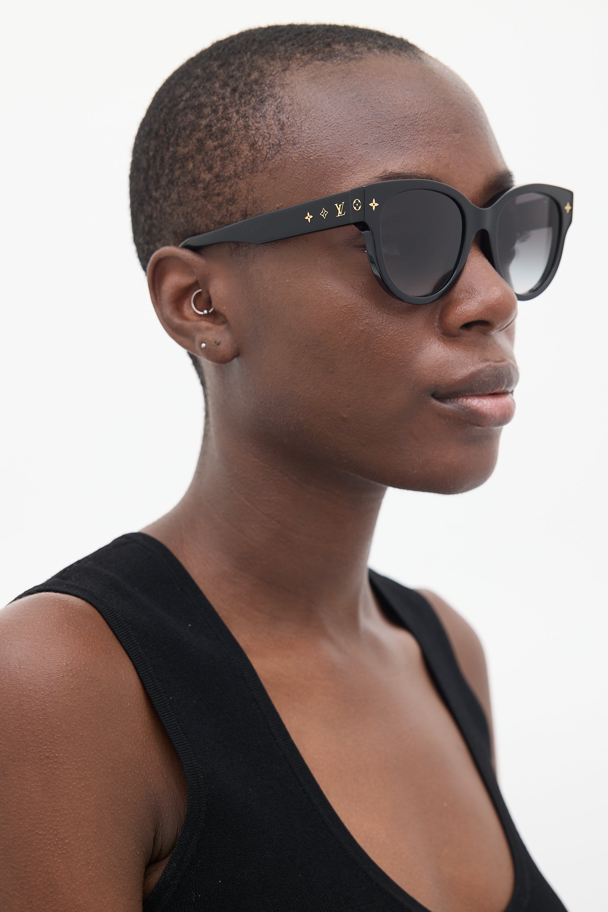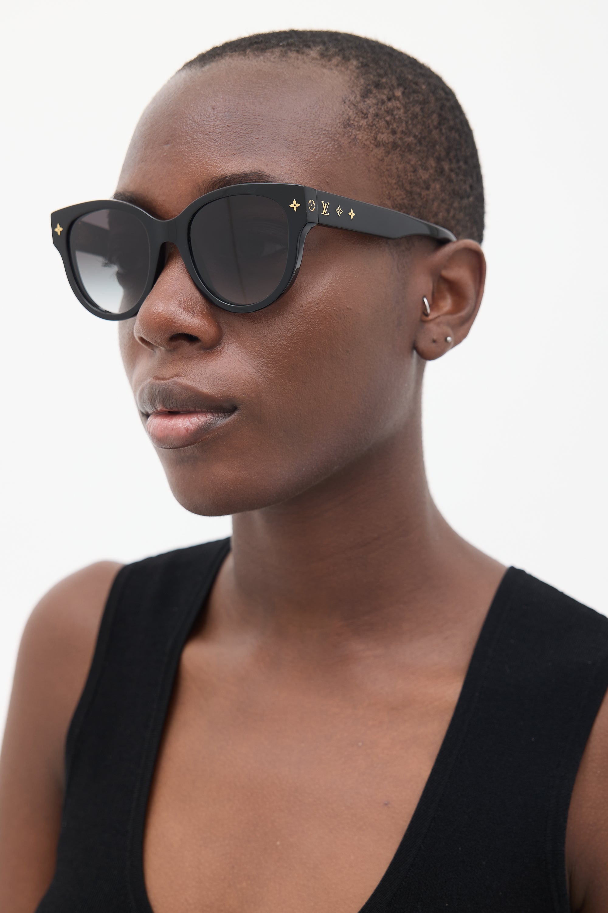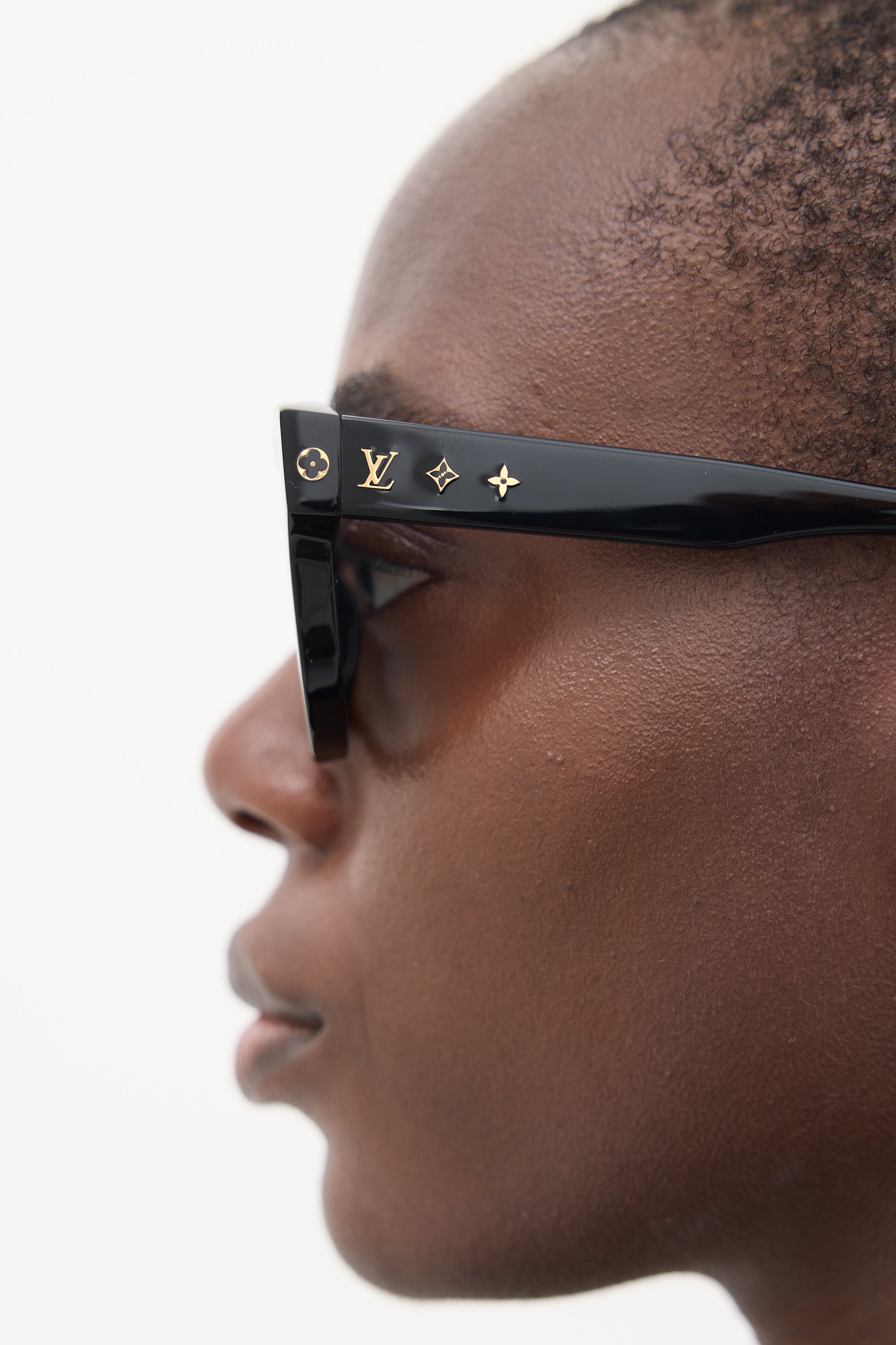 Pre-owned Louis Vuitton black Z1526W wayfarer sunglasses featuring tinted lenses, nose pads, and gold tone logo hardware detailing at sides. Comes with original case.