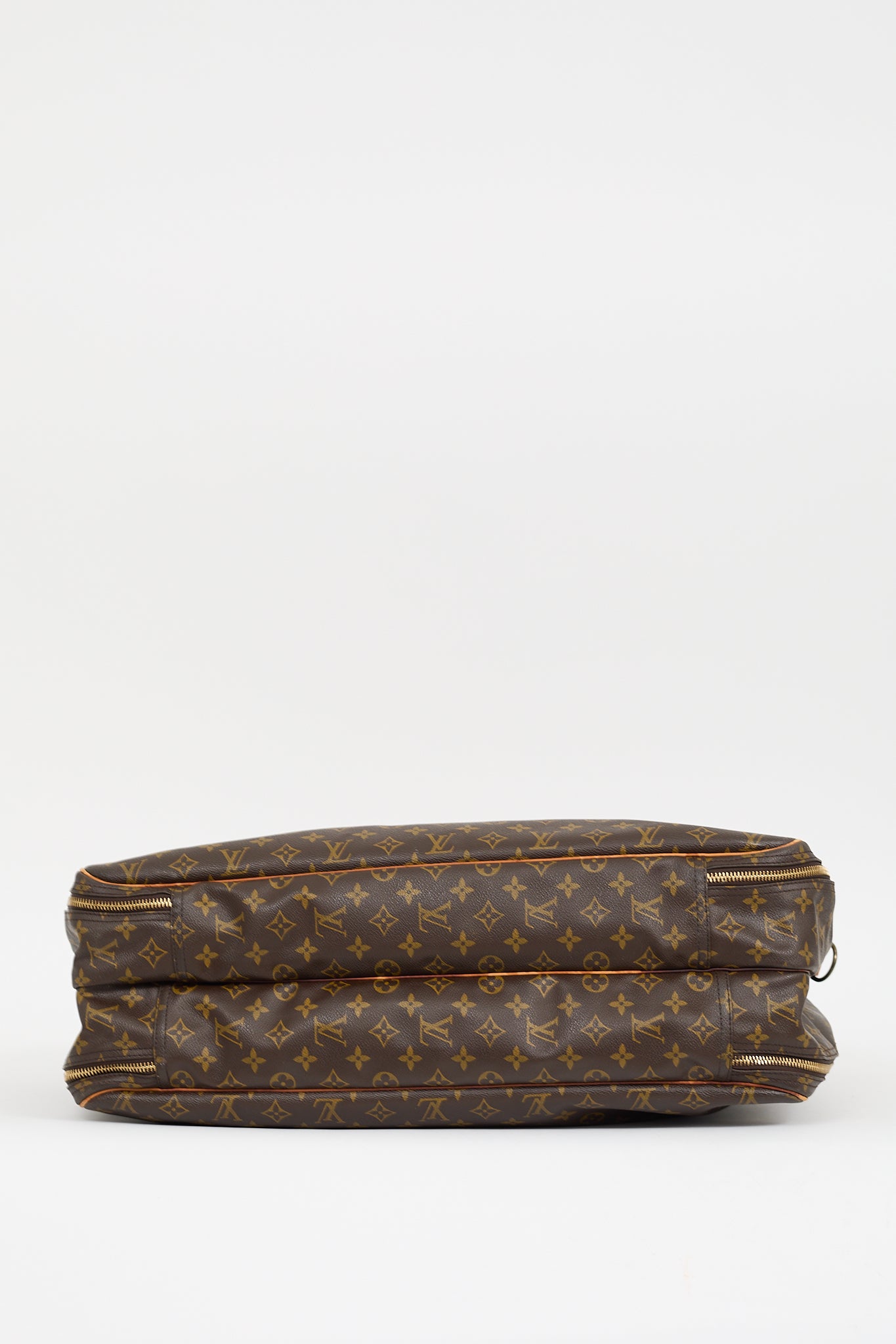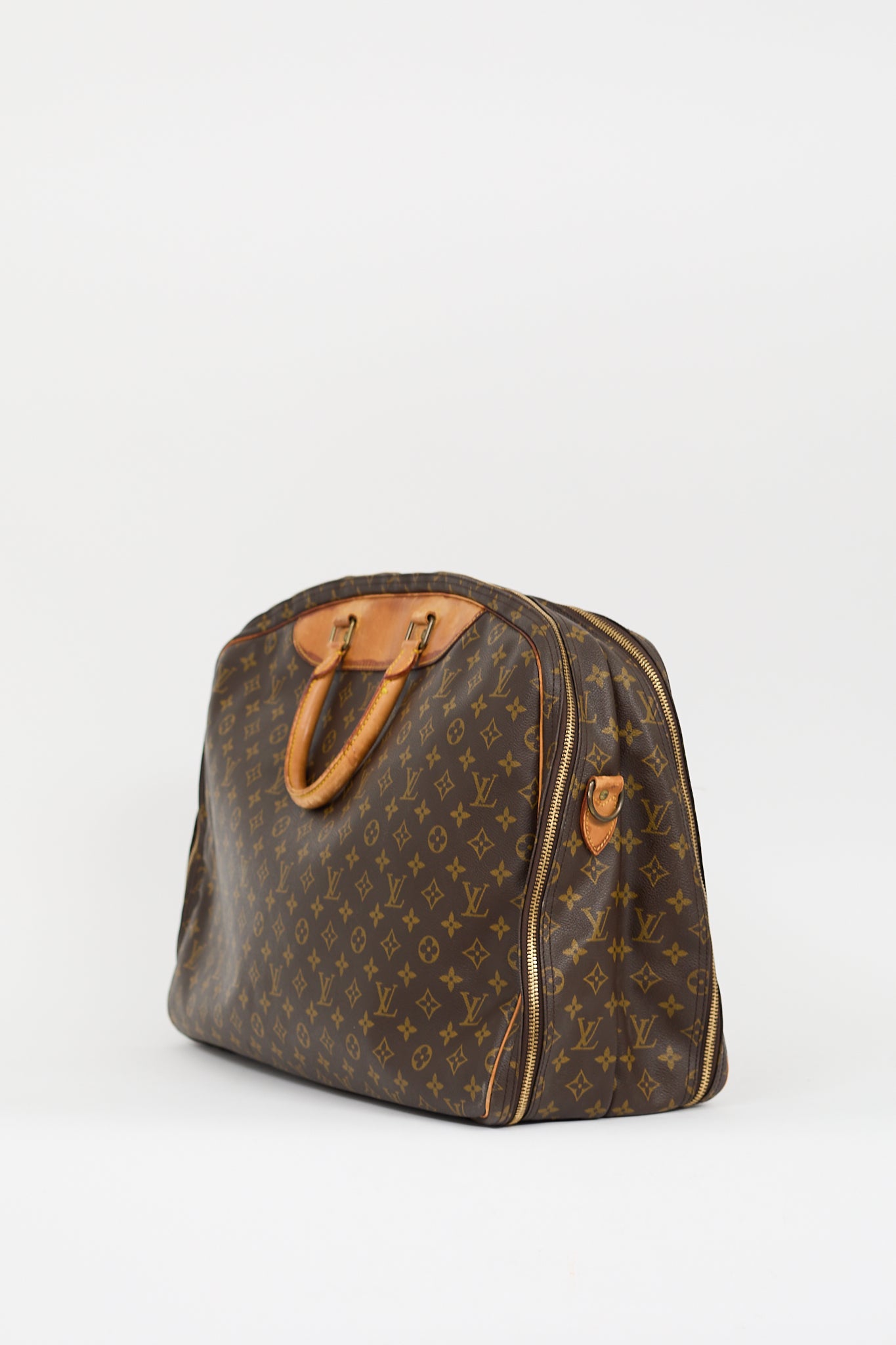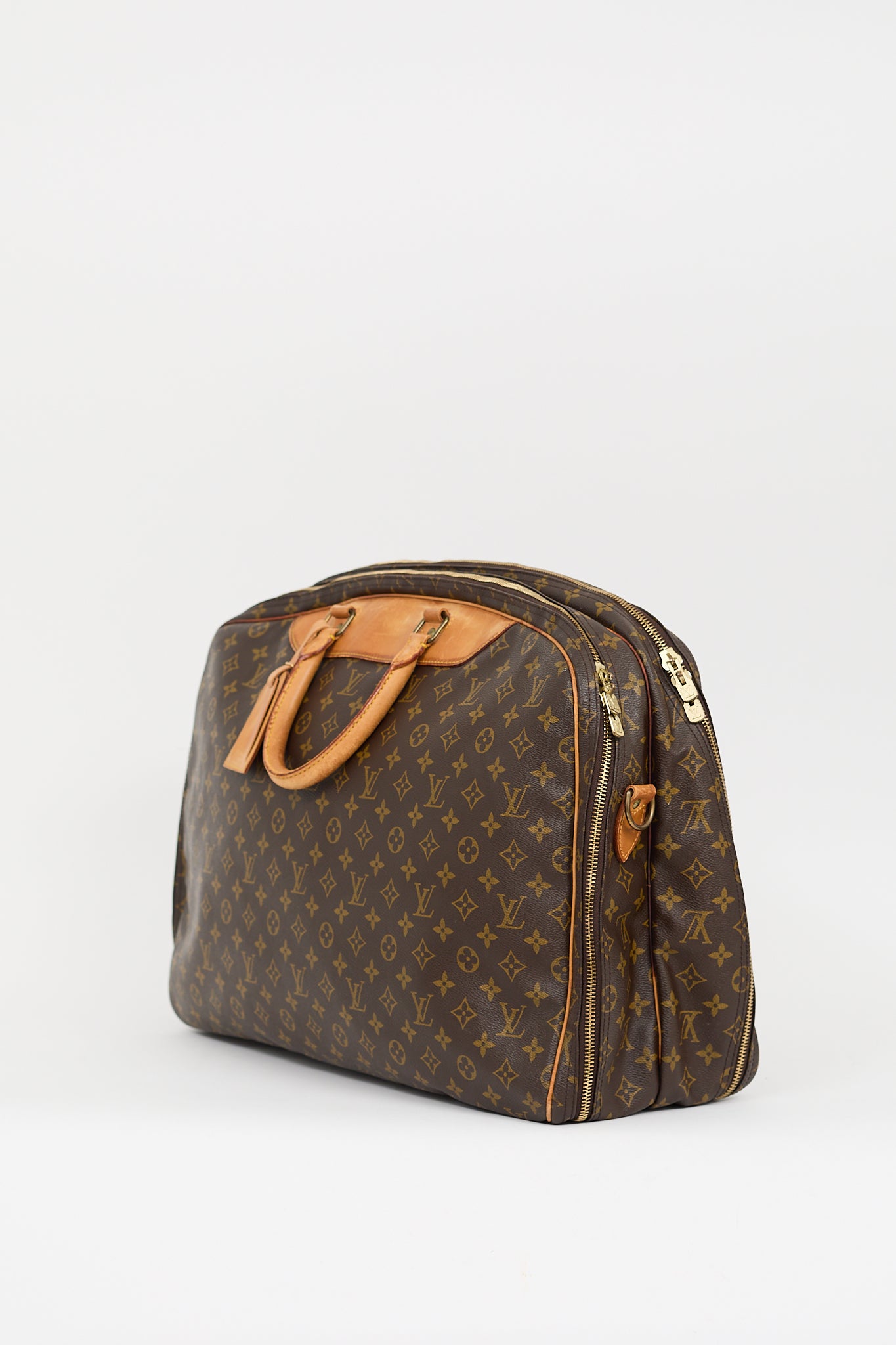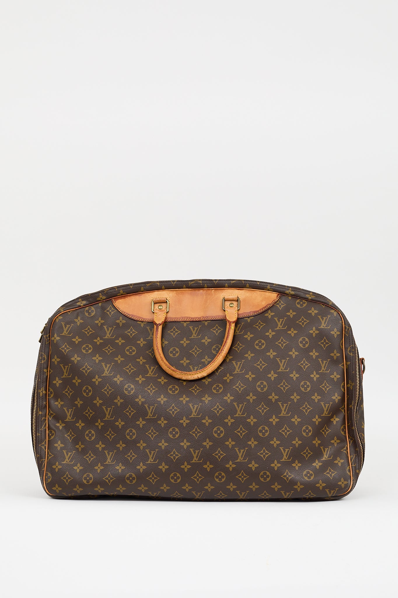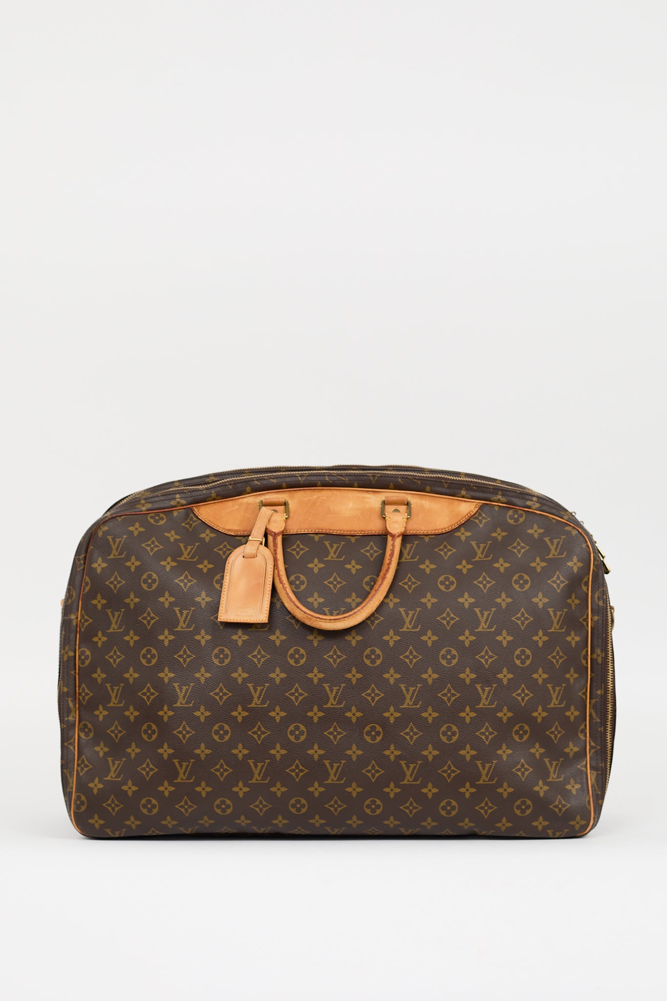Pre-owned Louis Vuitton vintage brown Alize duffle bag featuring monogram coated canvas, Vachetta leather trim, dual rolled top handles, detachable luggage tag, two D-ring at sides, all around zip closure, elastic compression straps at front compartment, and two buttoned loops and one slip pocket at back compartment.