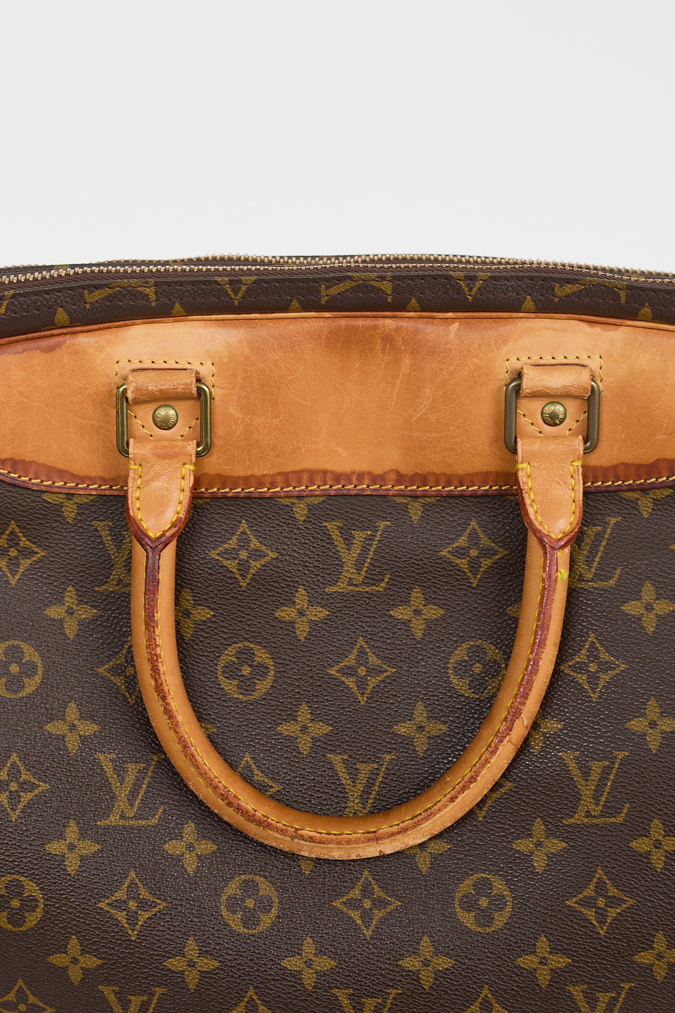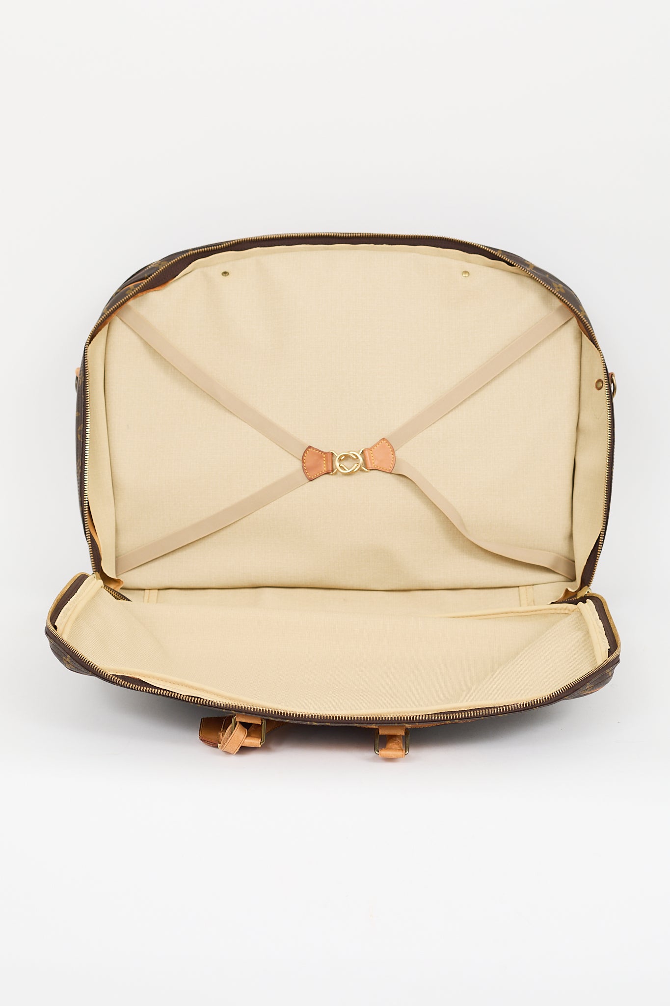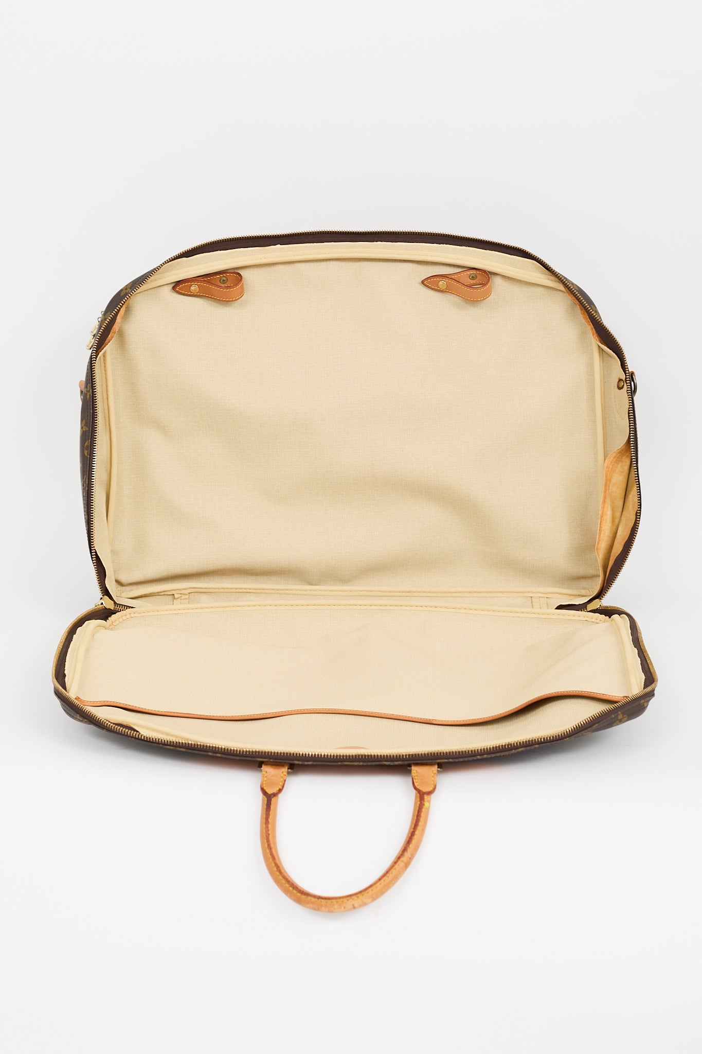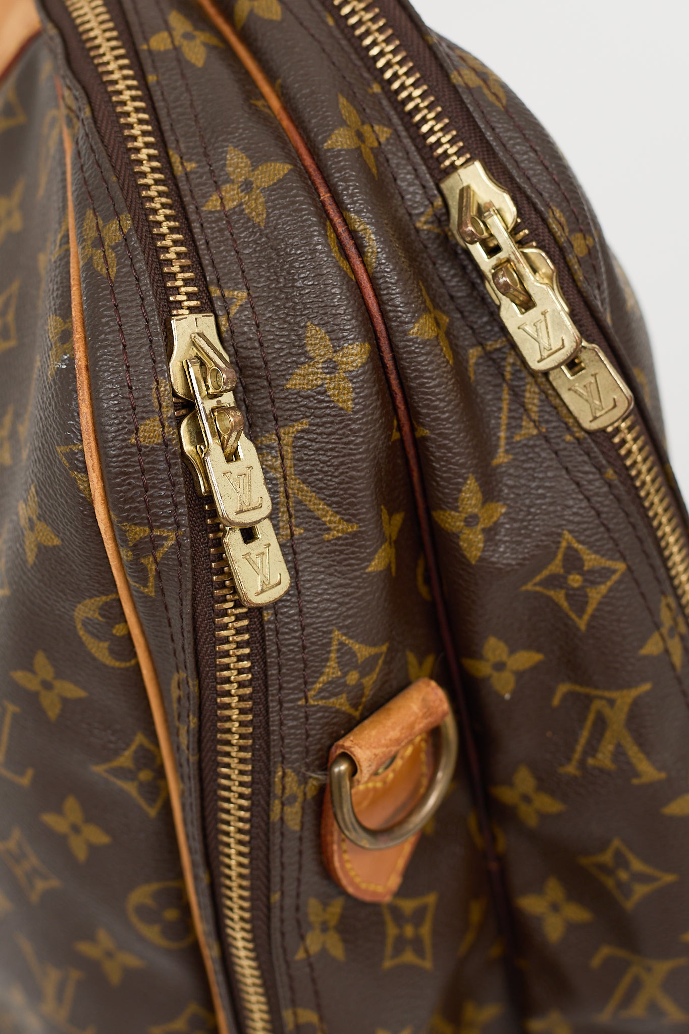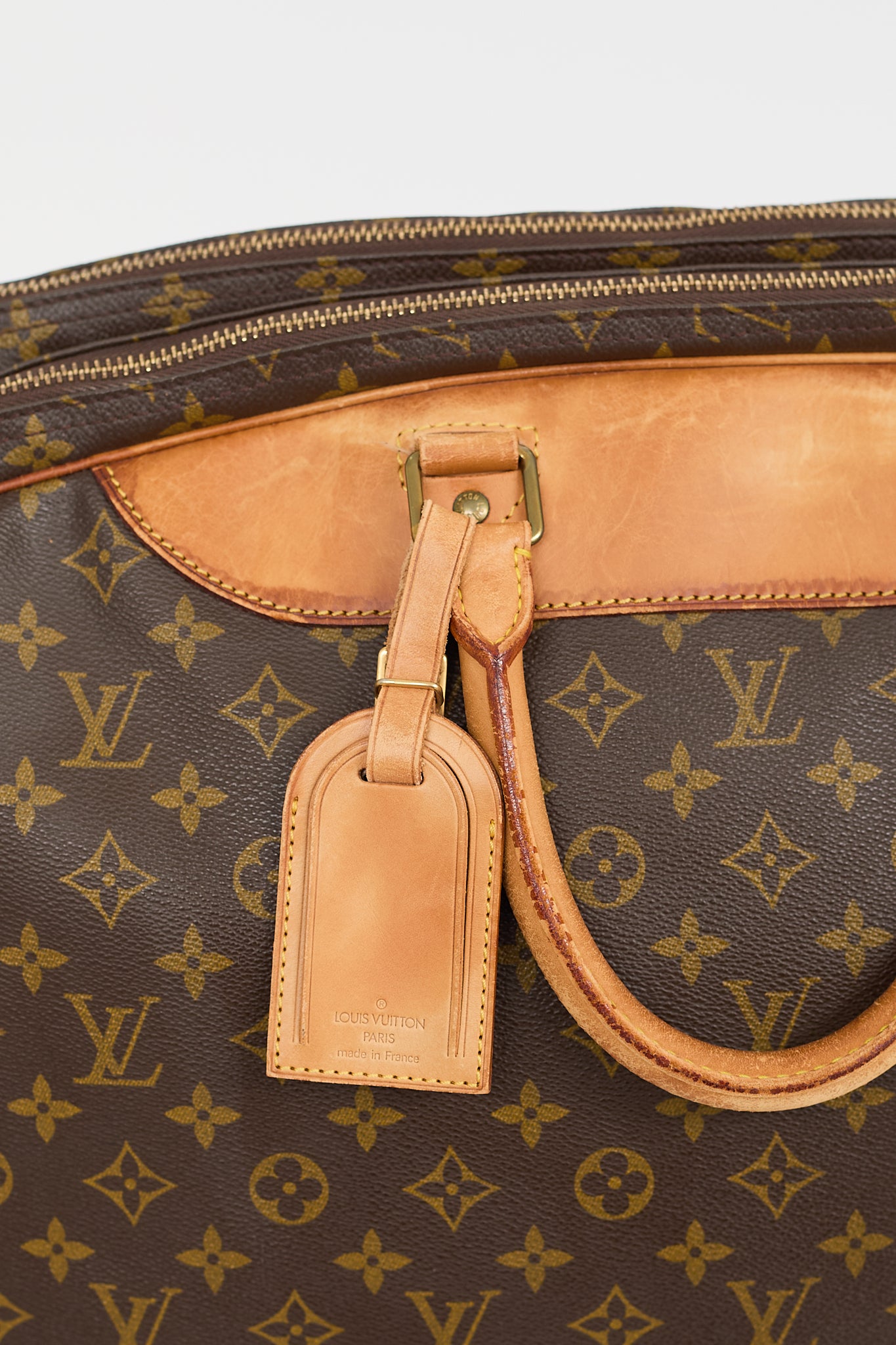 Pre-owned Louis Vuitton vintage brown Alize duffle bag featuring monogram coated canvas, Vachetta leather trim, dual rolled top handles, detachable luggage tag, two D-ring at sides, all around zip closure, elastic compression straps at front compartment, and two buttoned loops and one slip pocket at back compartment.