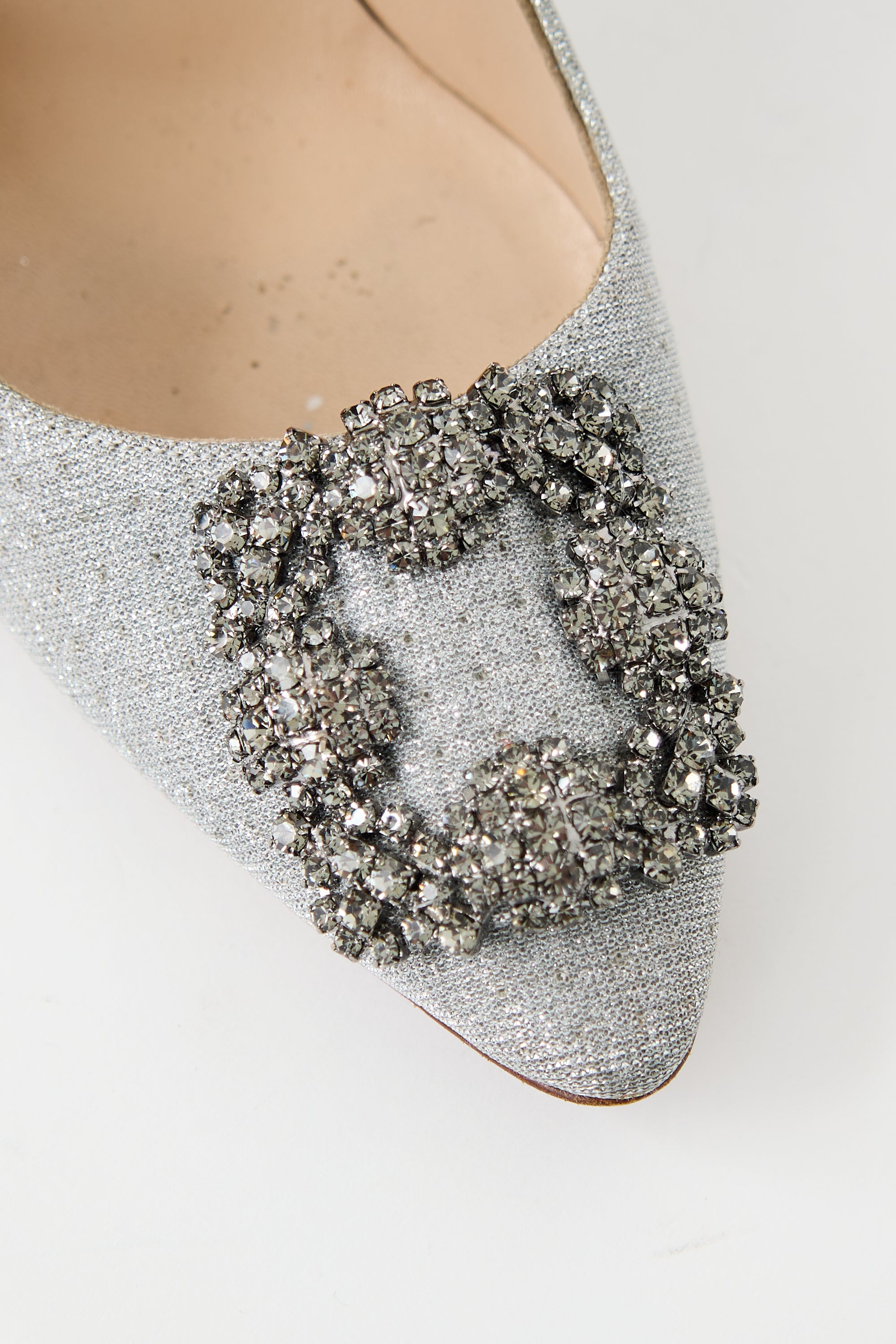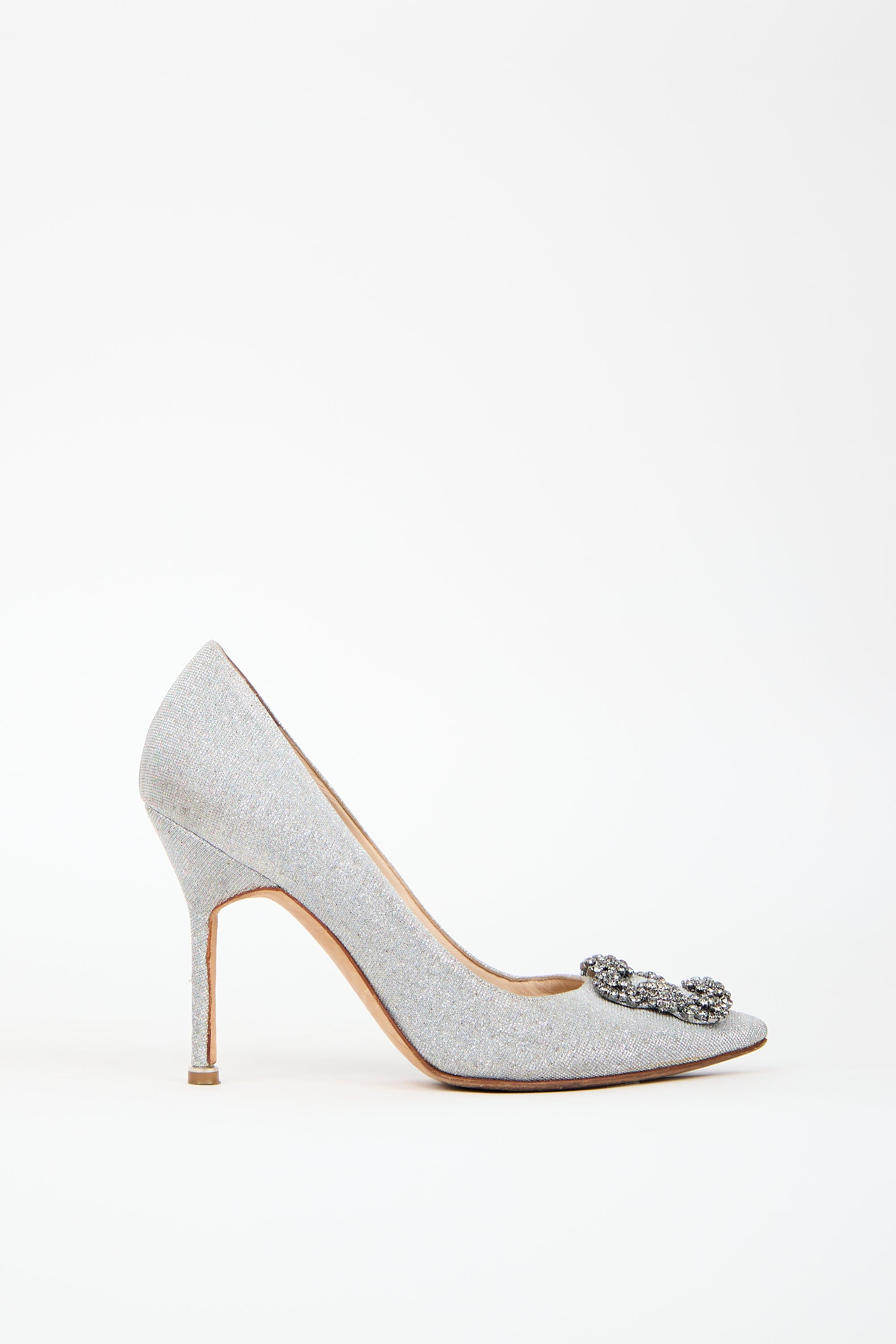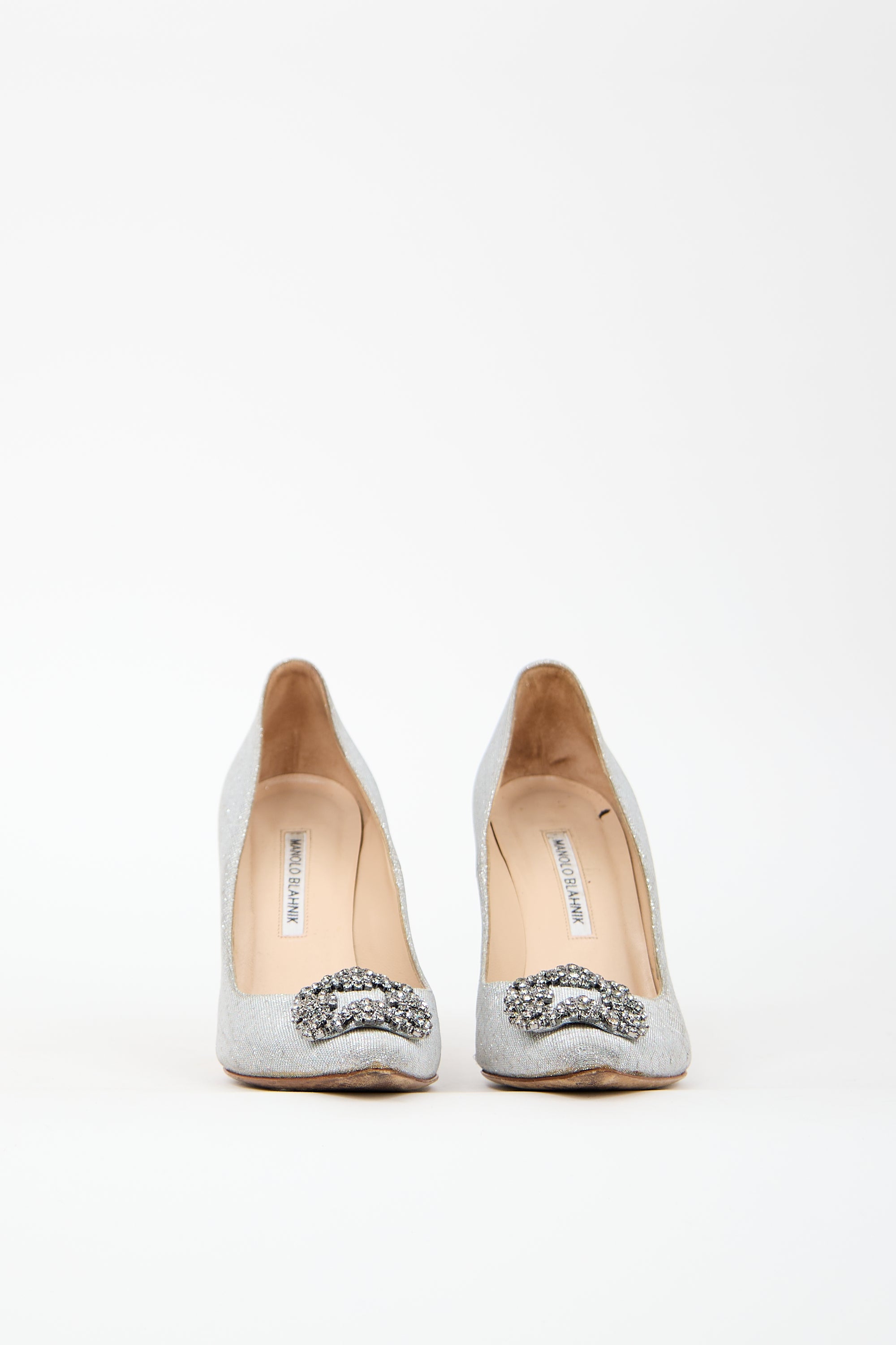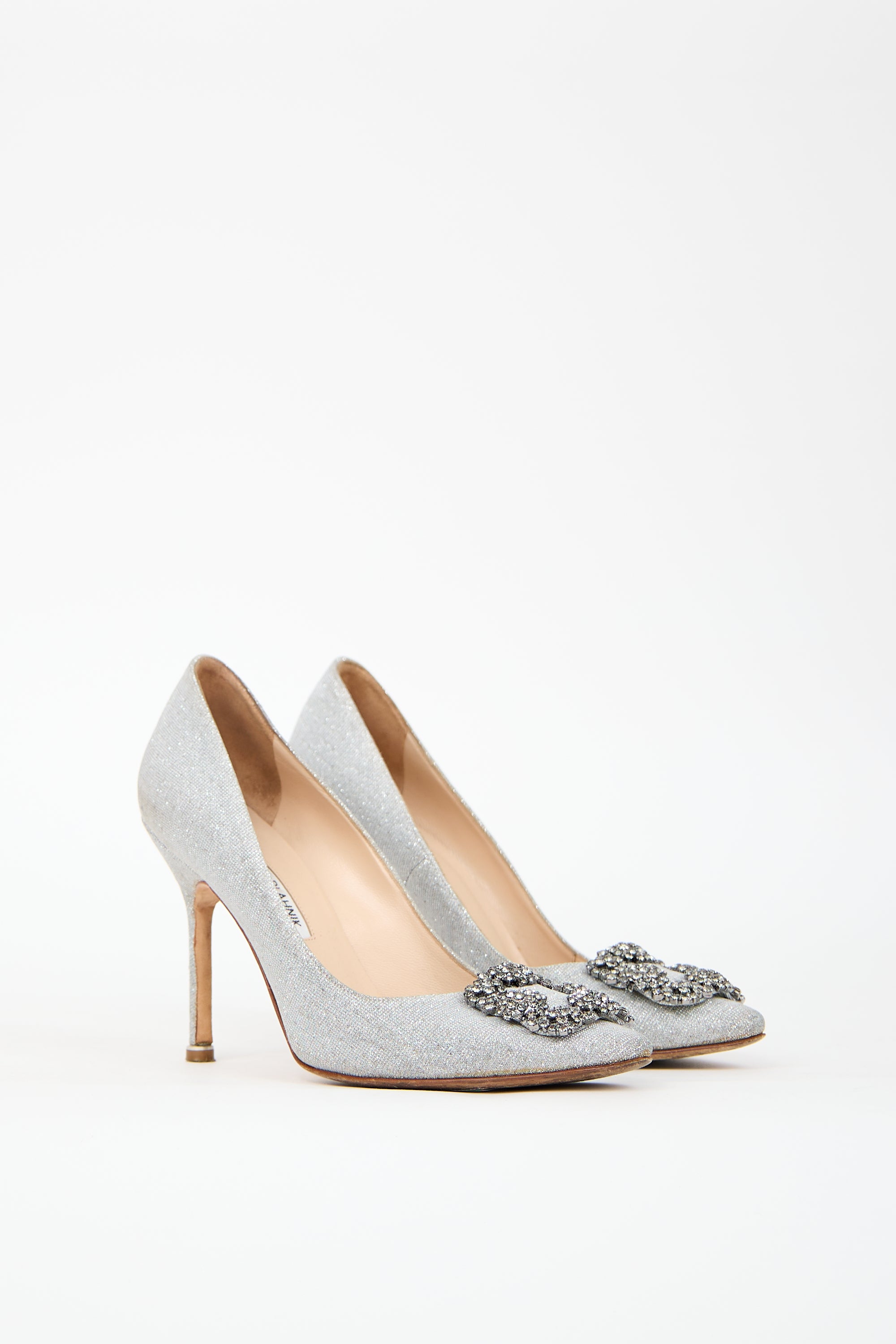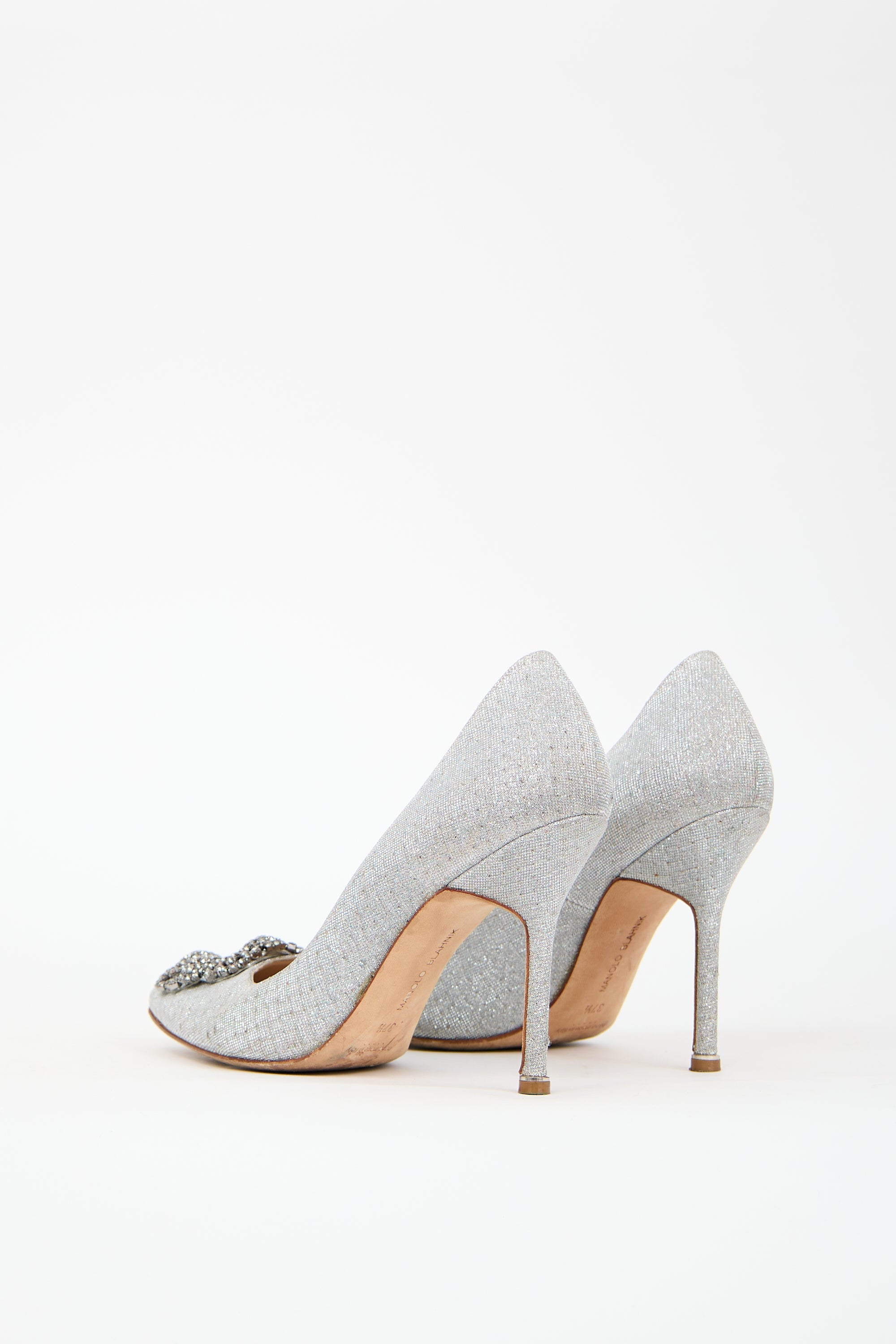 Pre-owned Manolo Blahnik silver sparkle Hangisi pumps featuring almond toe, signature jewel embellishment at vamp, slip on entry, and covered heel.