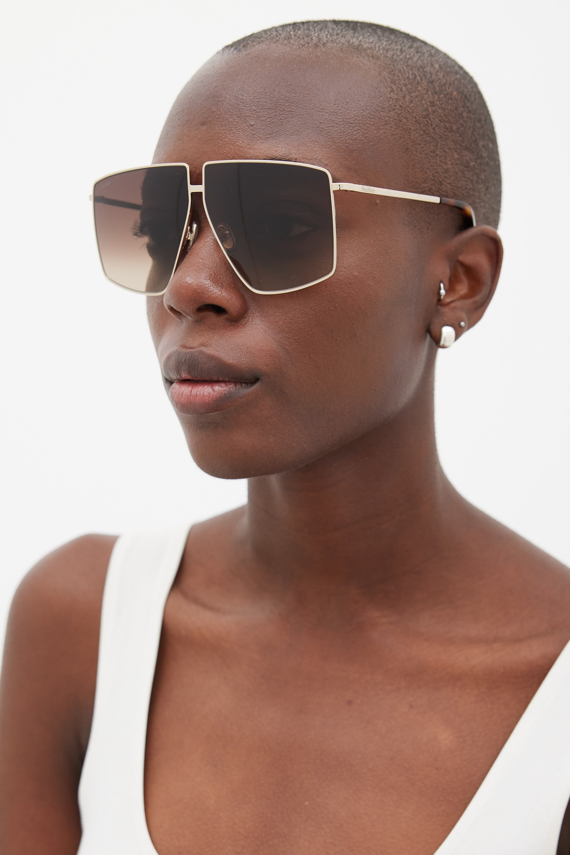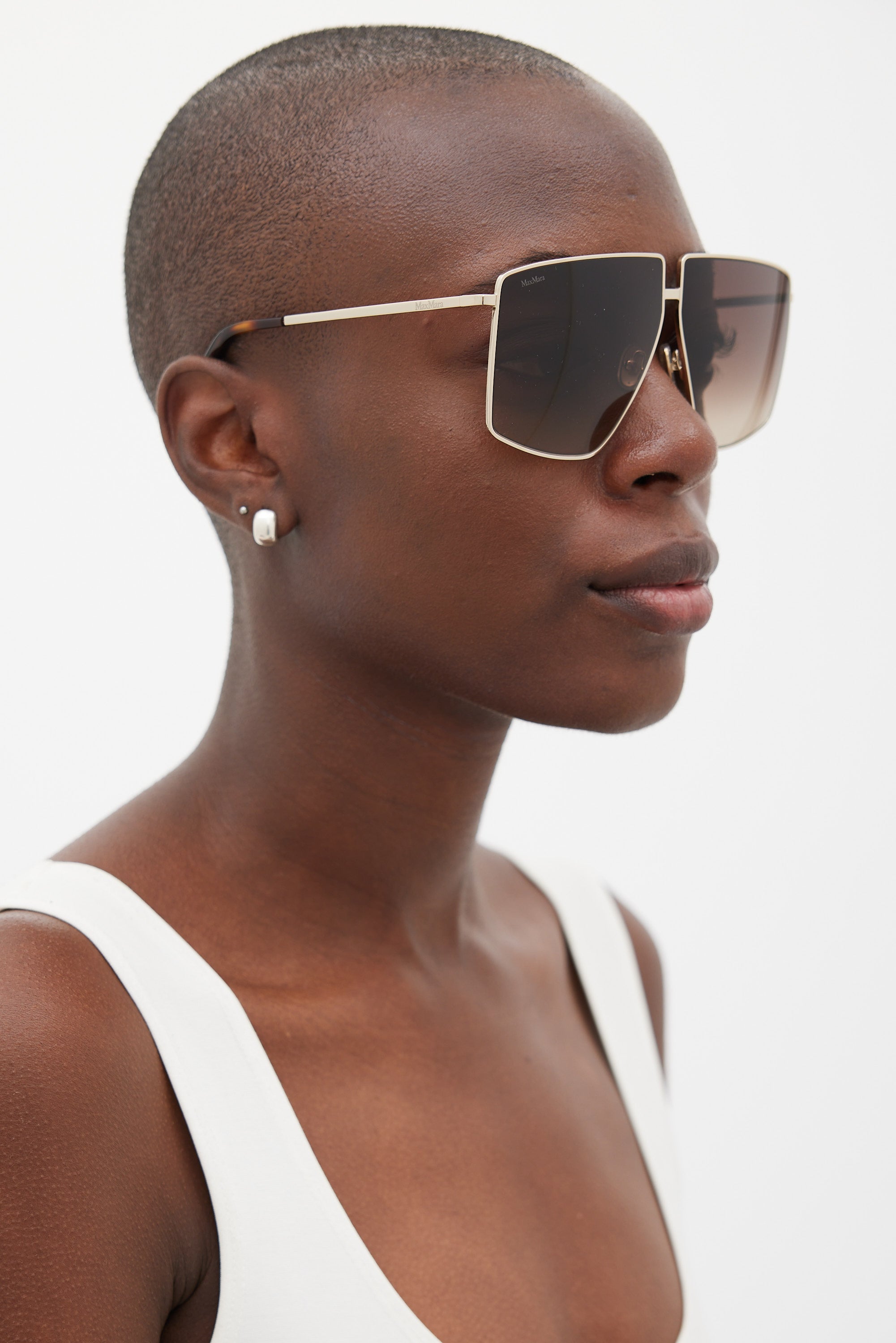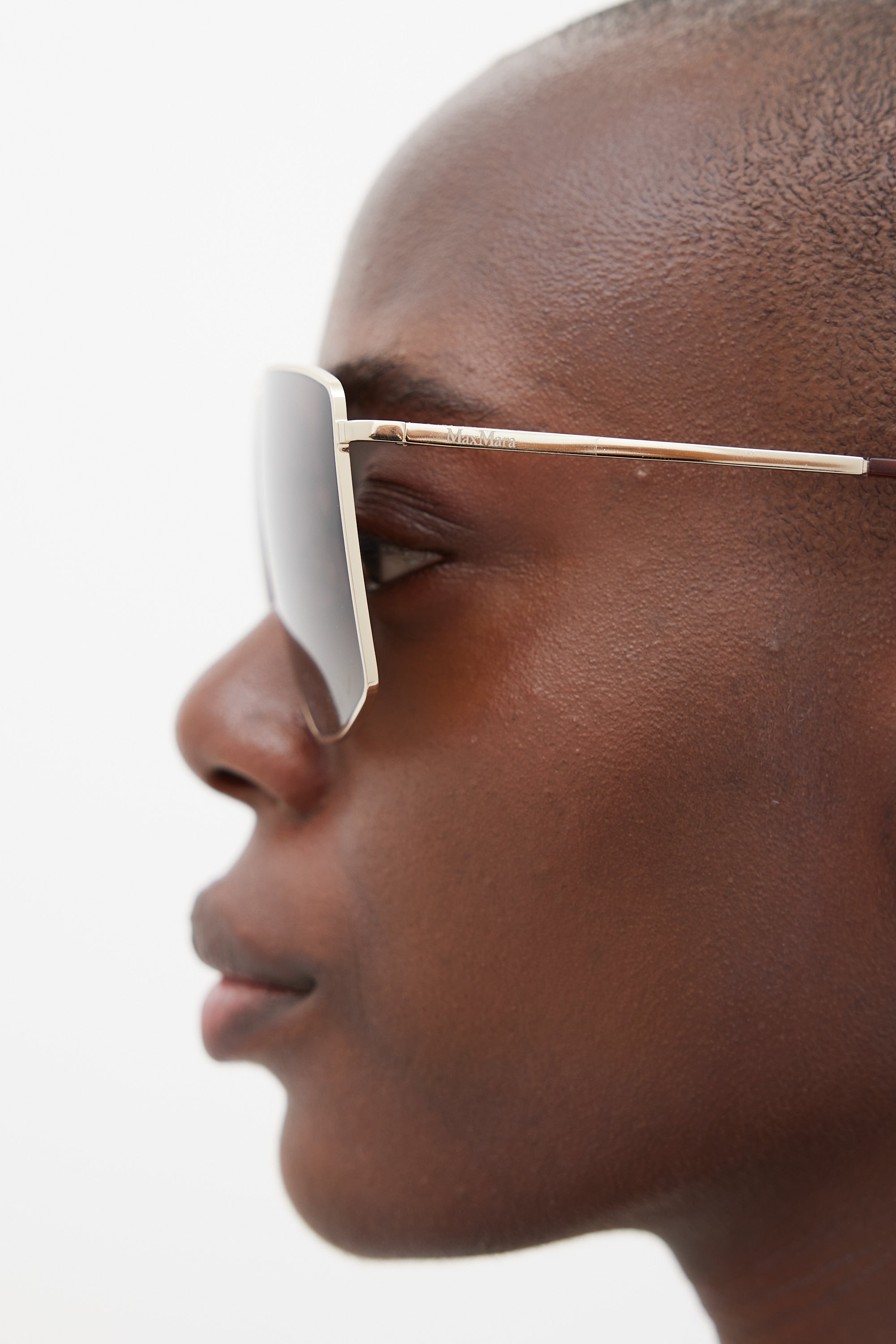 Pre-owned Max Mara MM0062 Lee sunglasses featuring a gold tone metal angular square frame, brown gradient lenses, logo printed at temples, and brown tortoiseshell arm tips. Comes with original case.