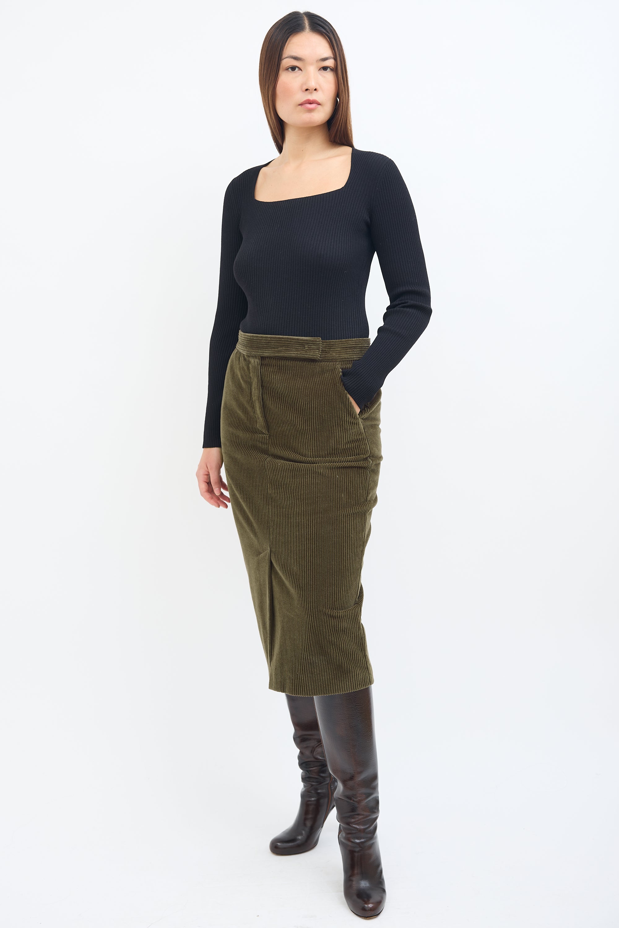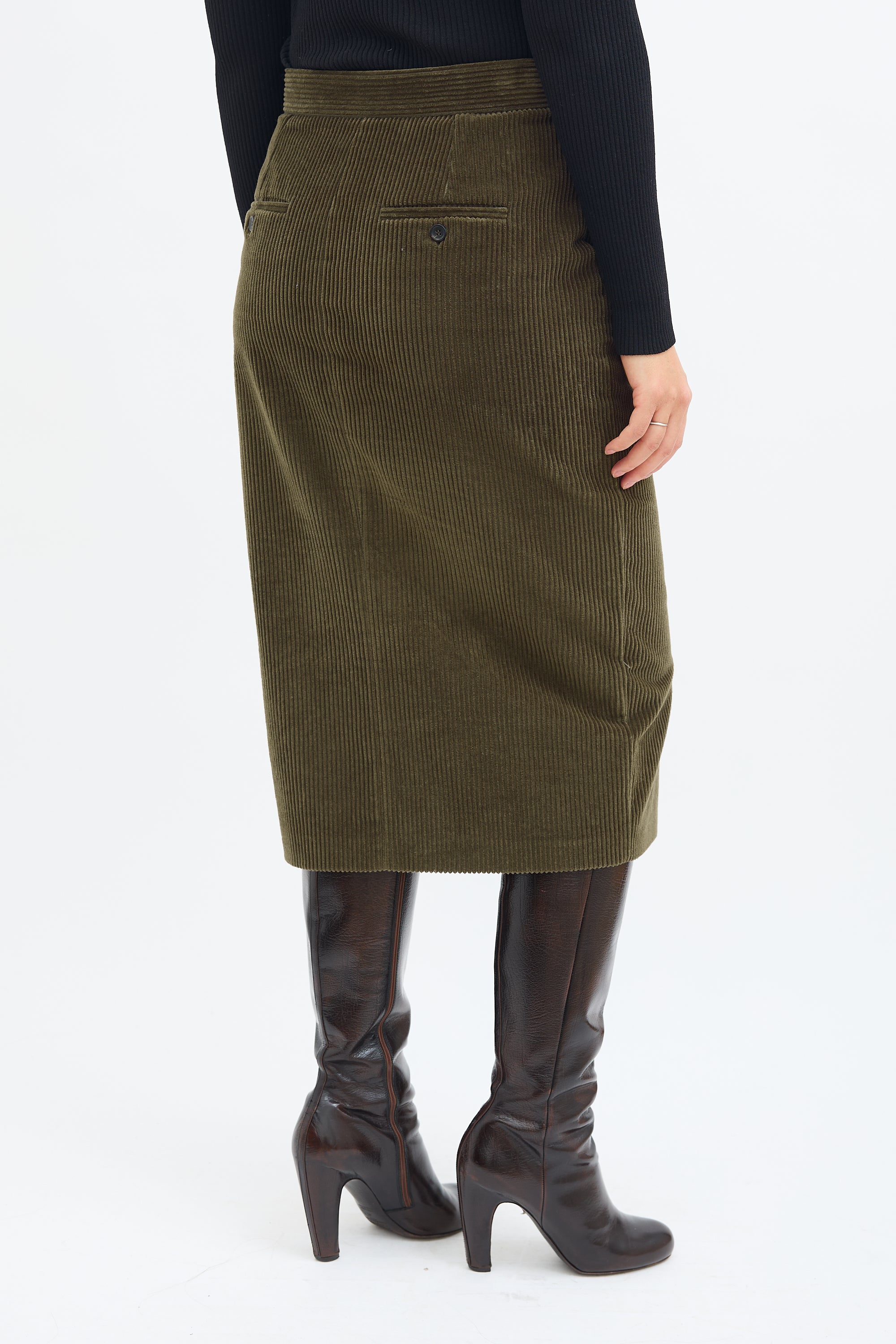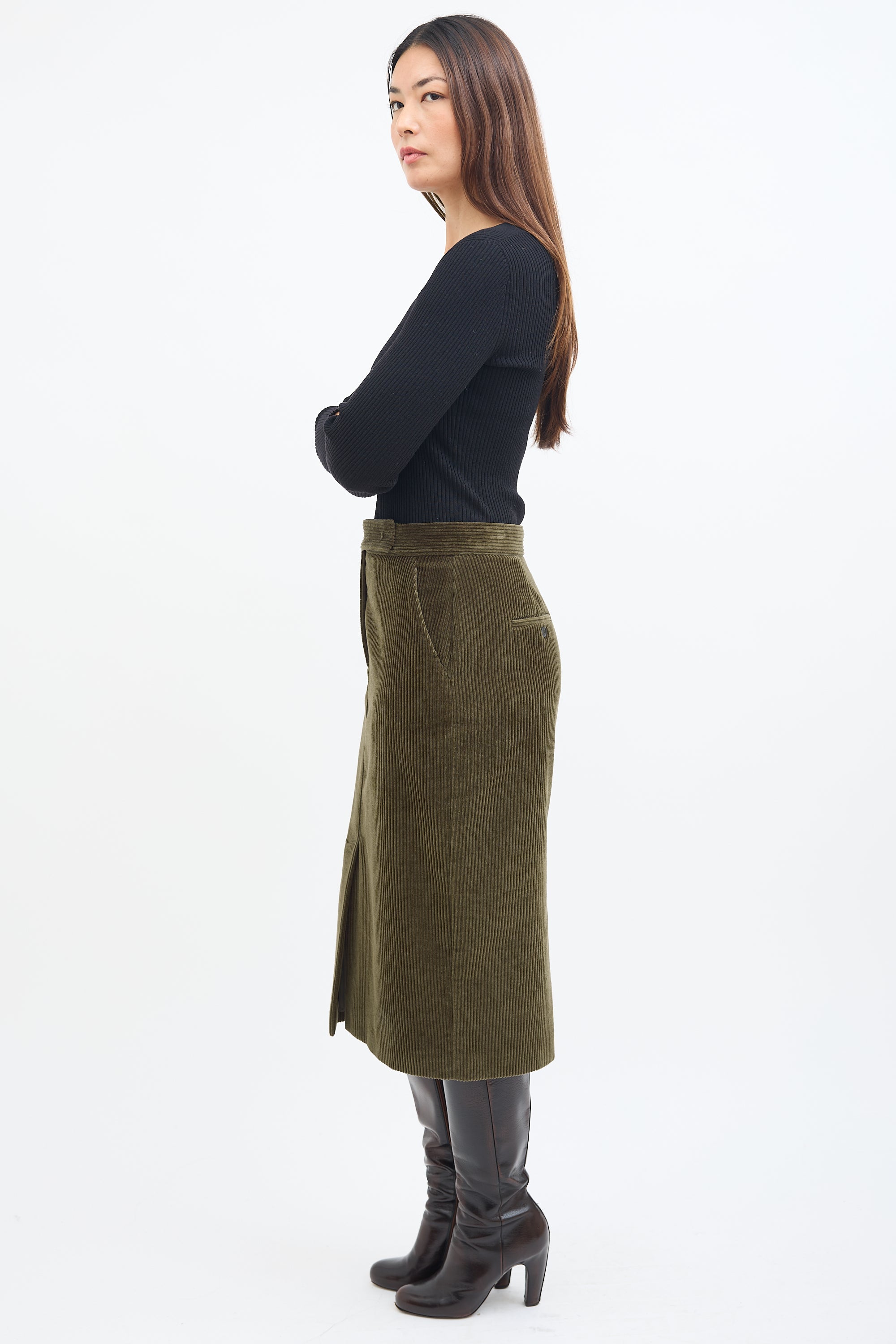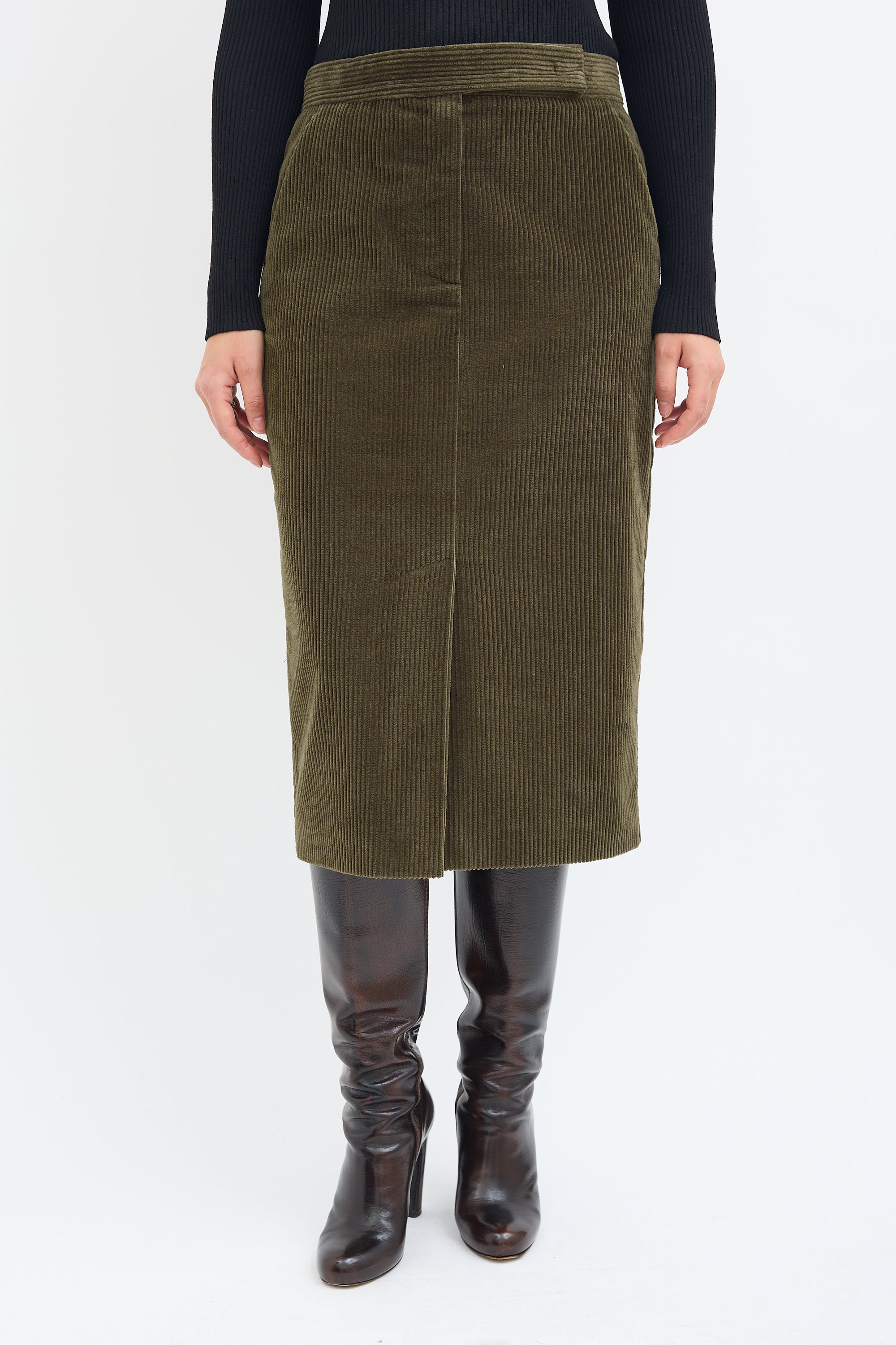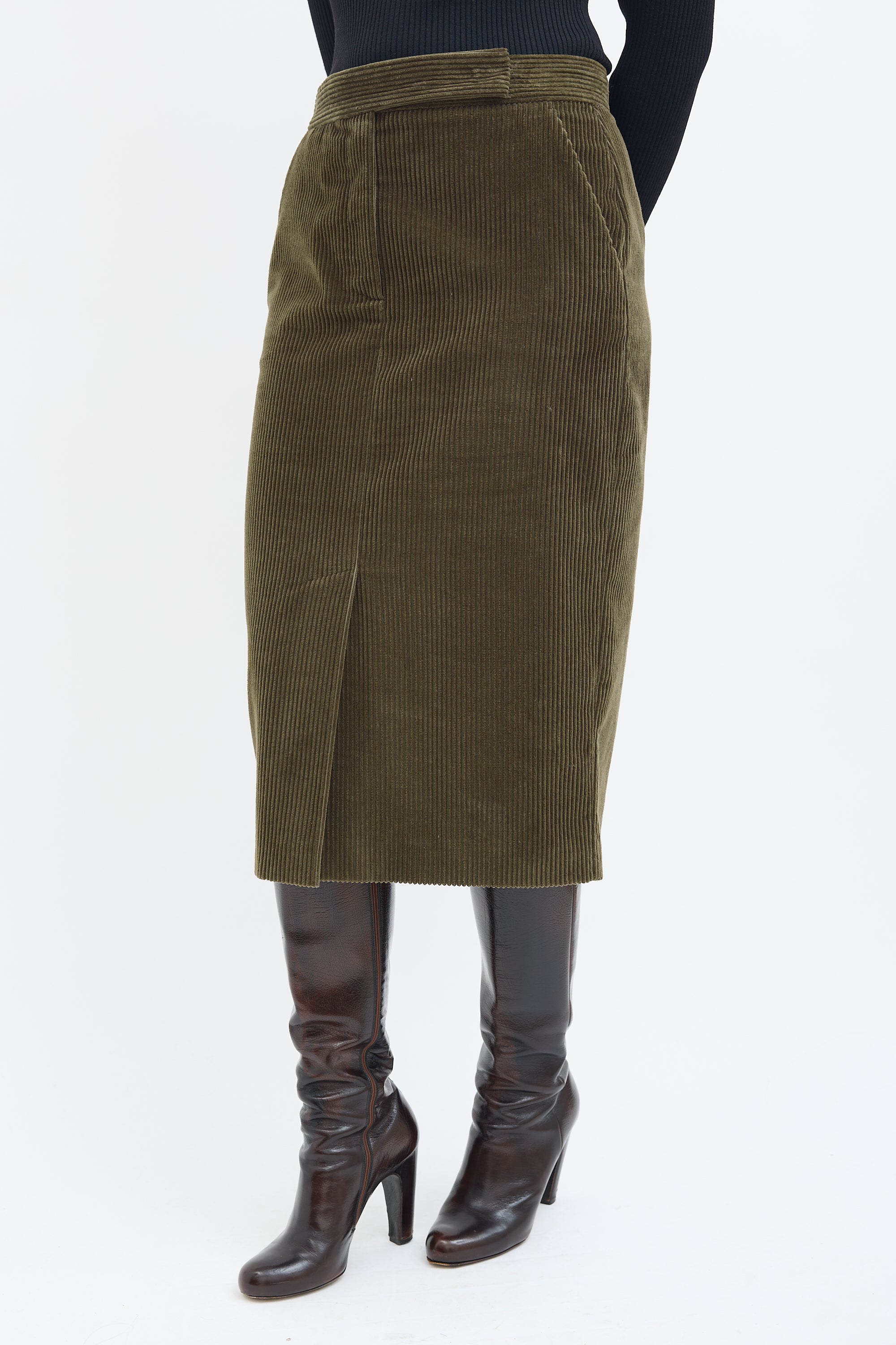 Pre-owned Max Mara green corduroy pencil skirt featuring zip fly with hook and eye fastening, two slip pockets at hips, two buttoned welt pockets at back, and front center vent.