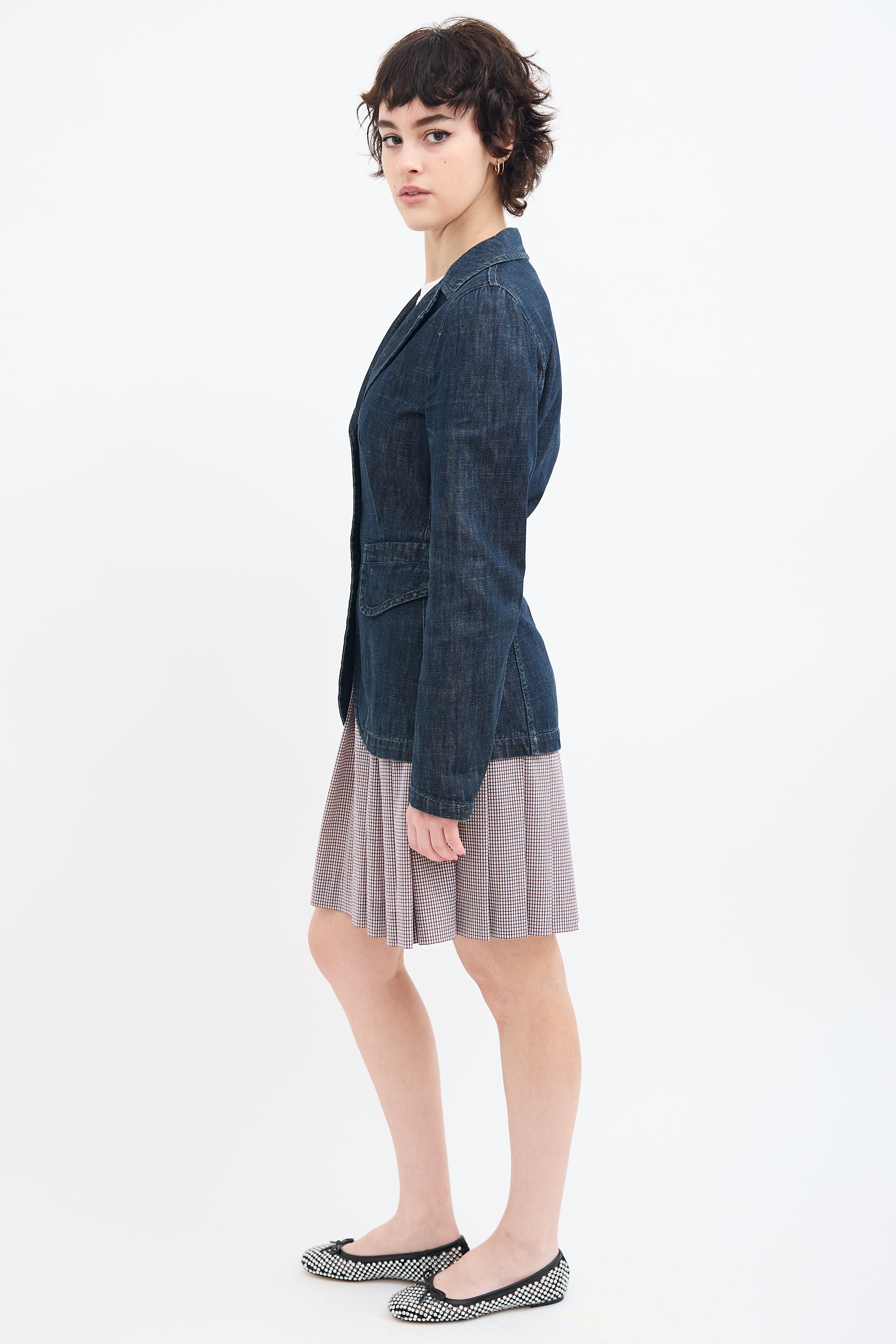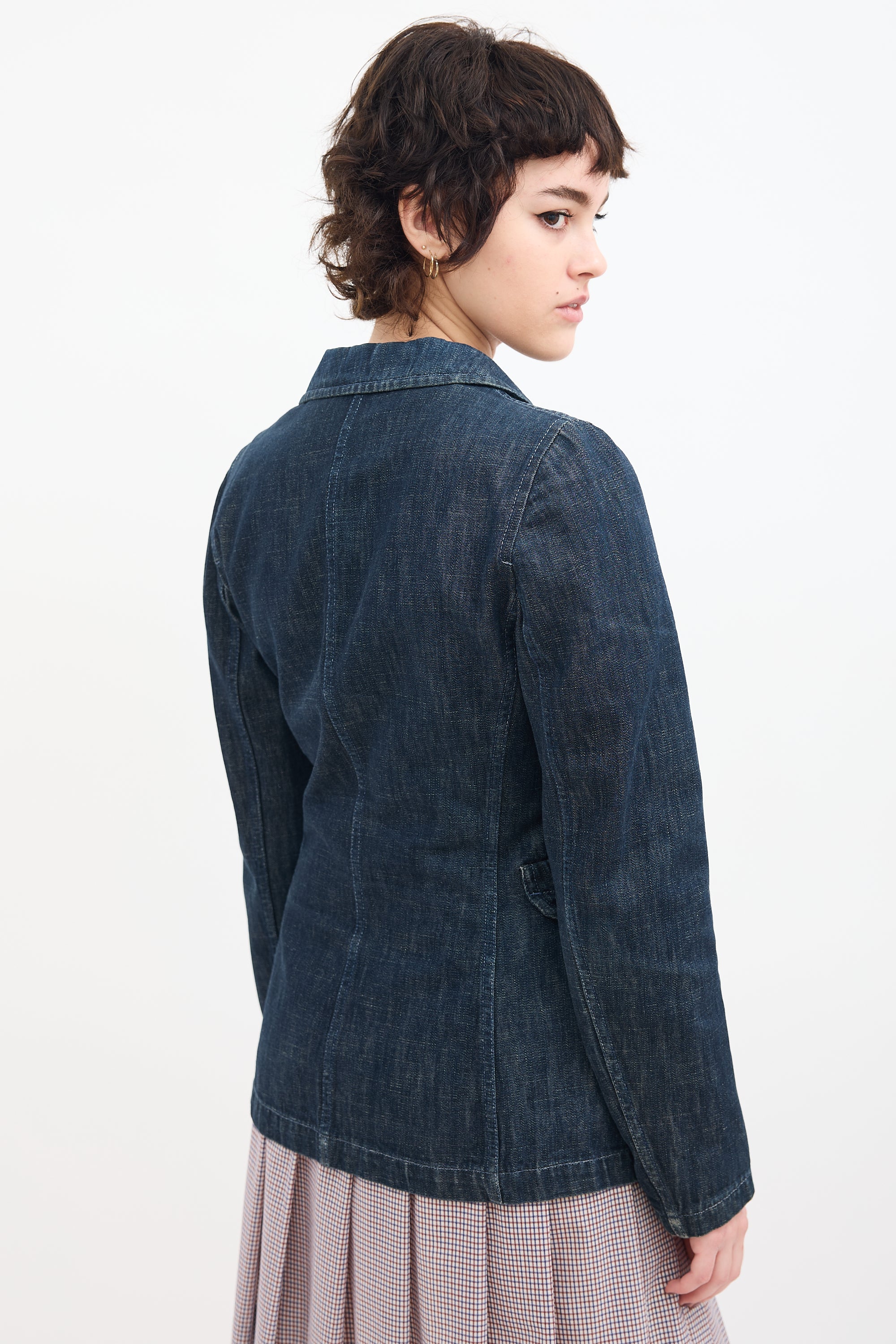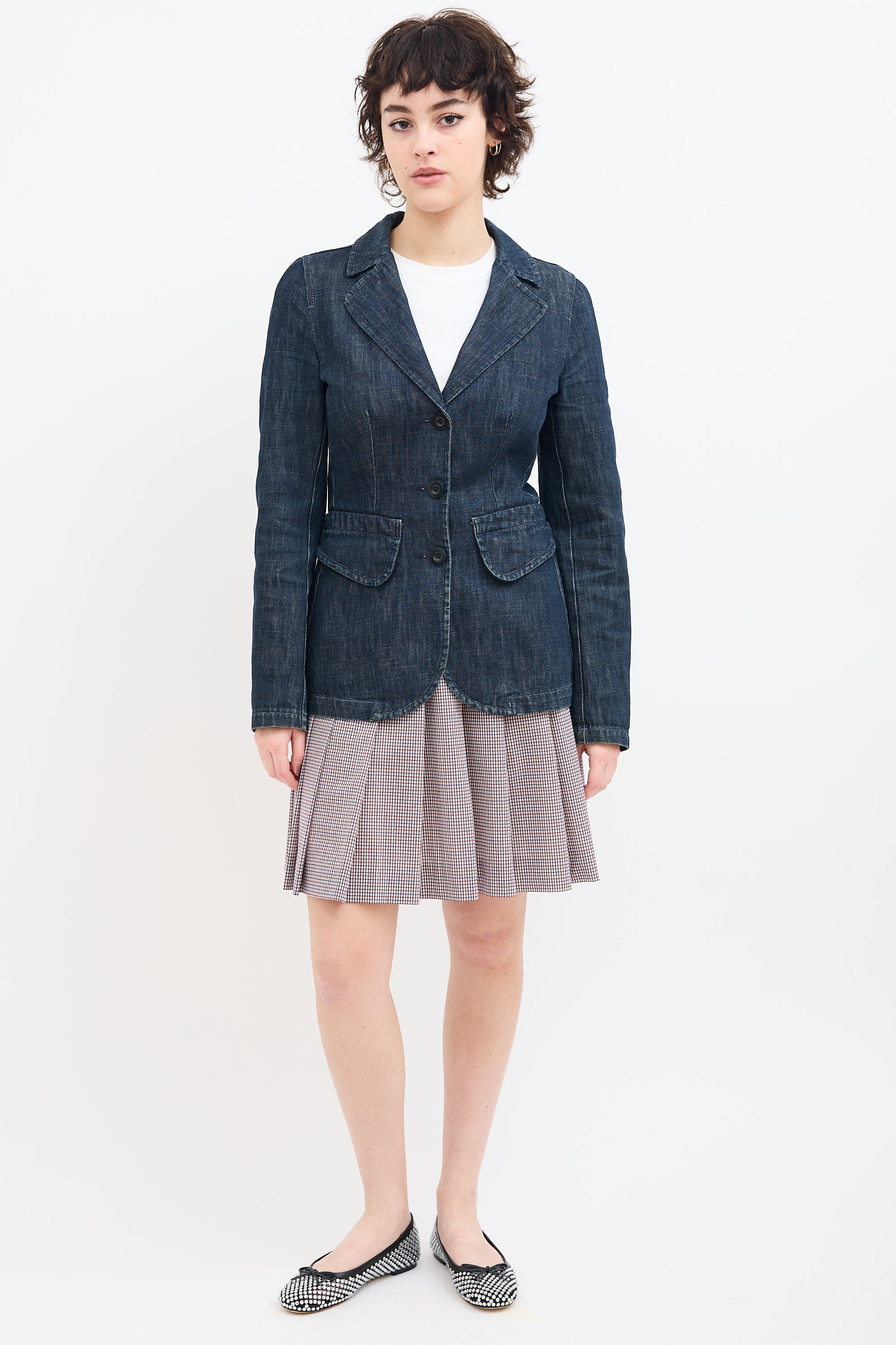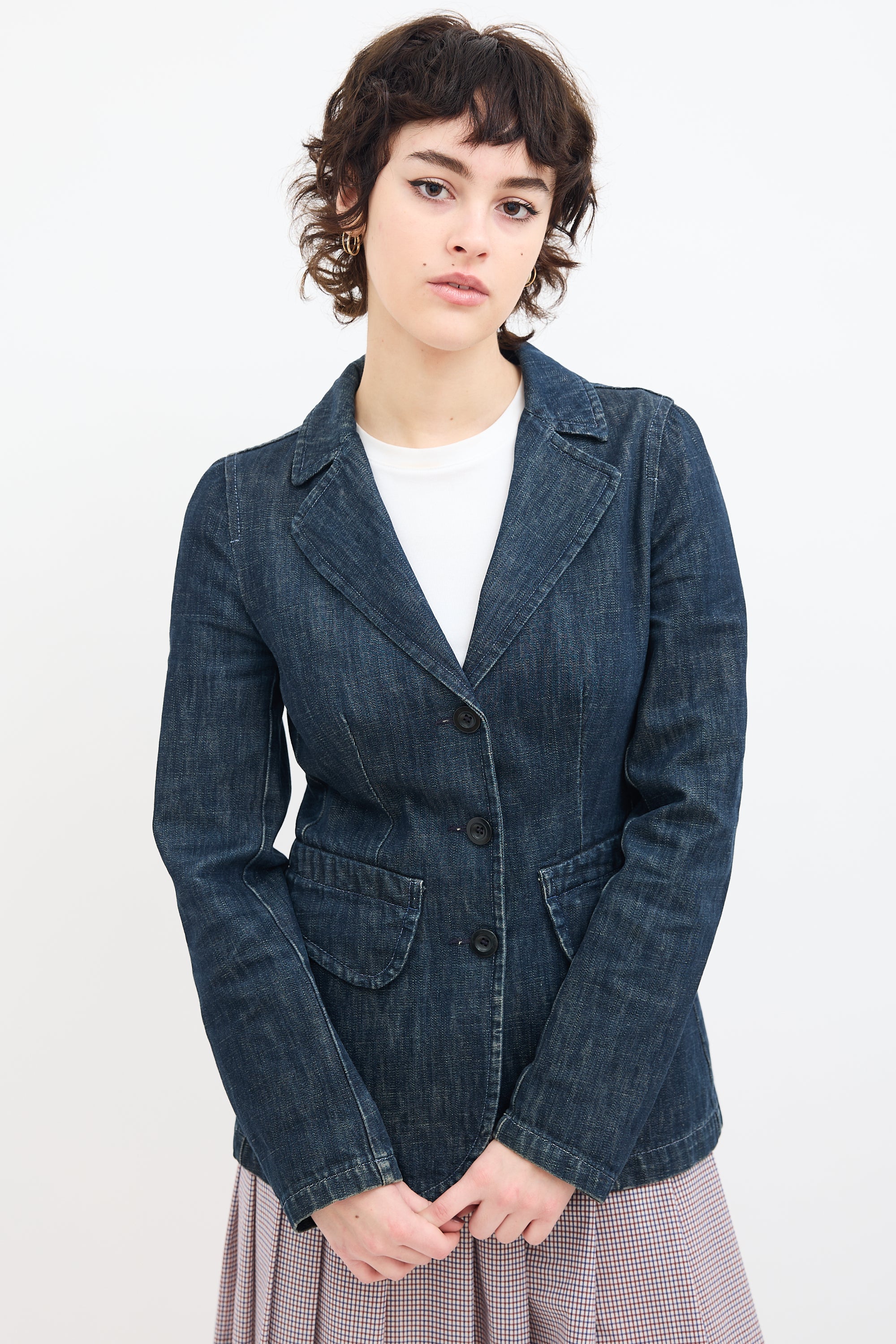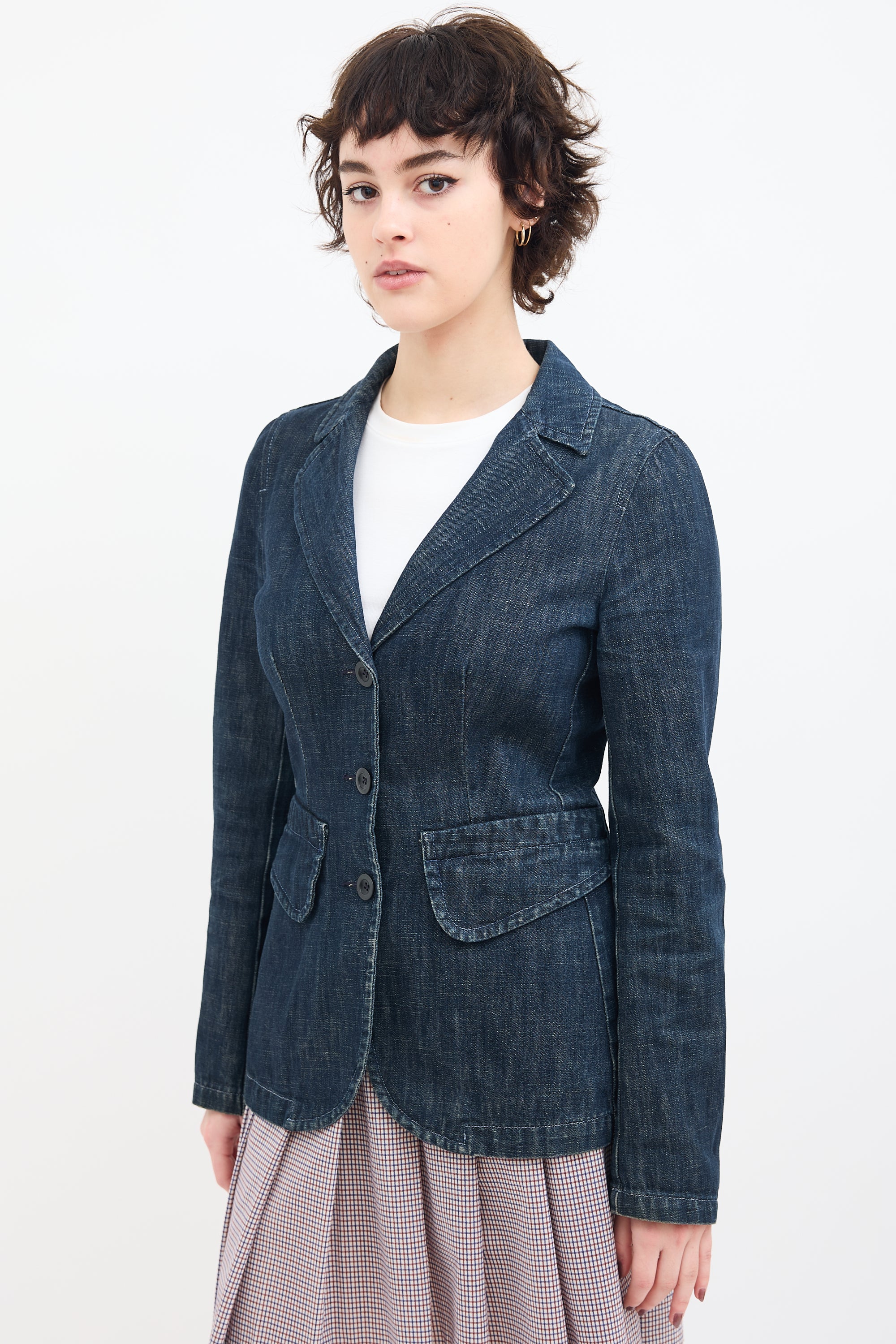 Pre-owned Miu Miu dark wash denim blazer featuring a peak lapel, button up front closure, and two front flap pockets.