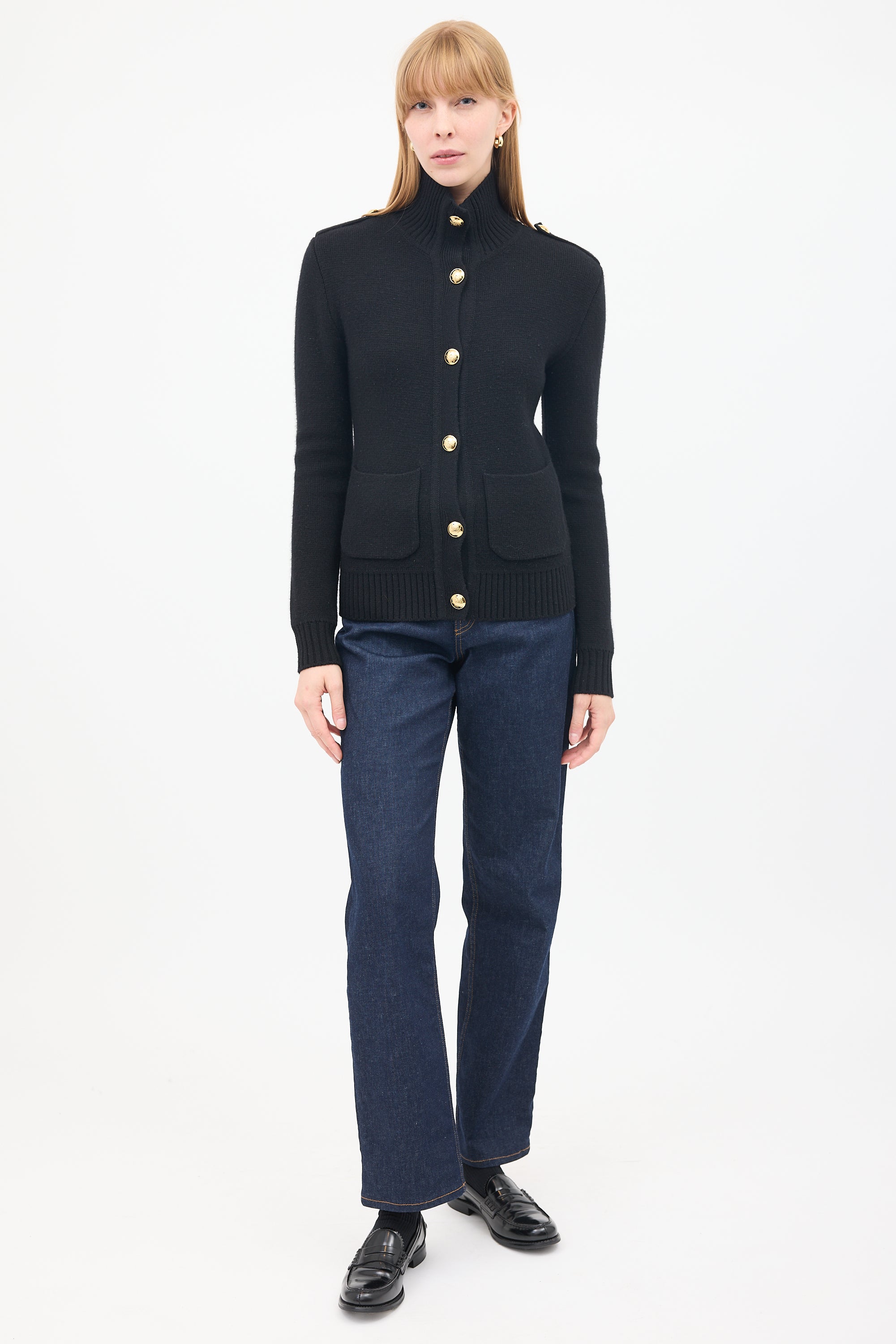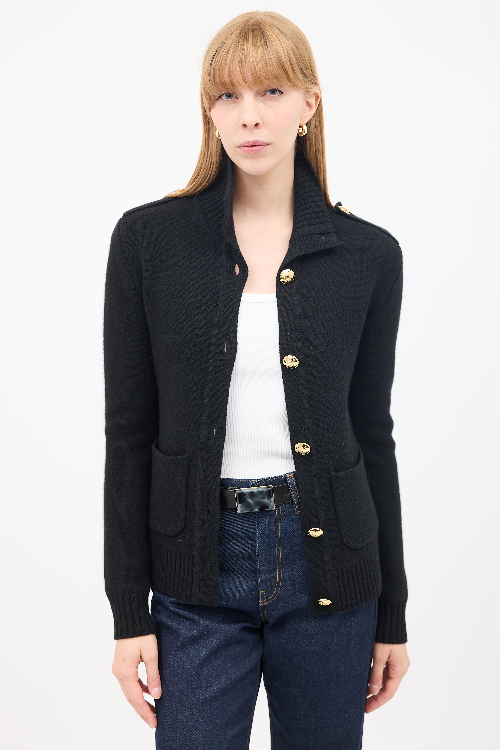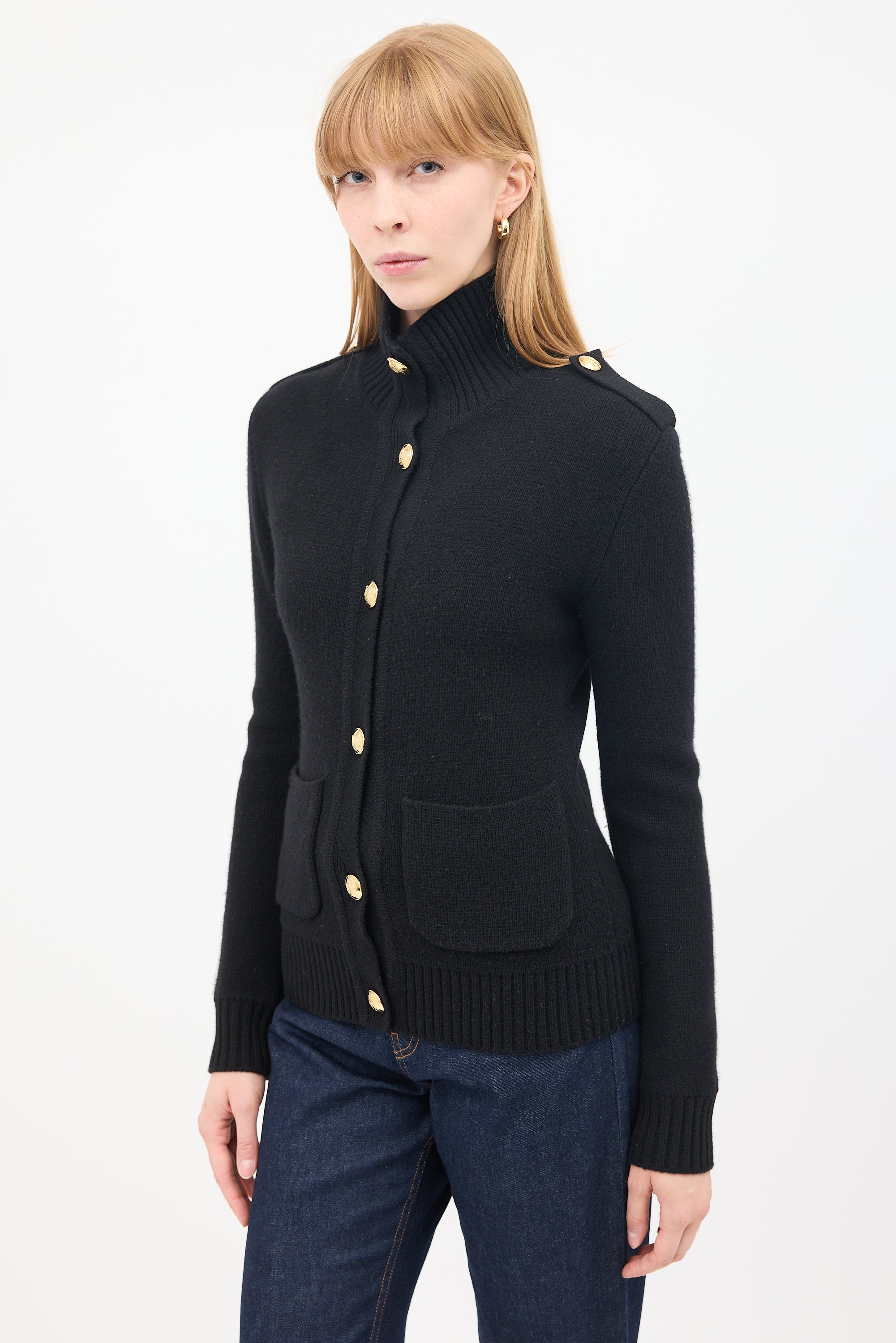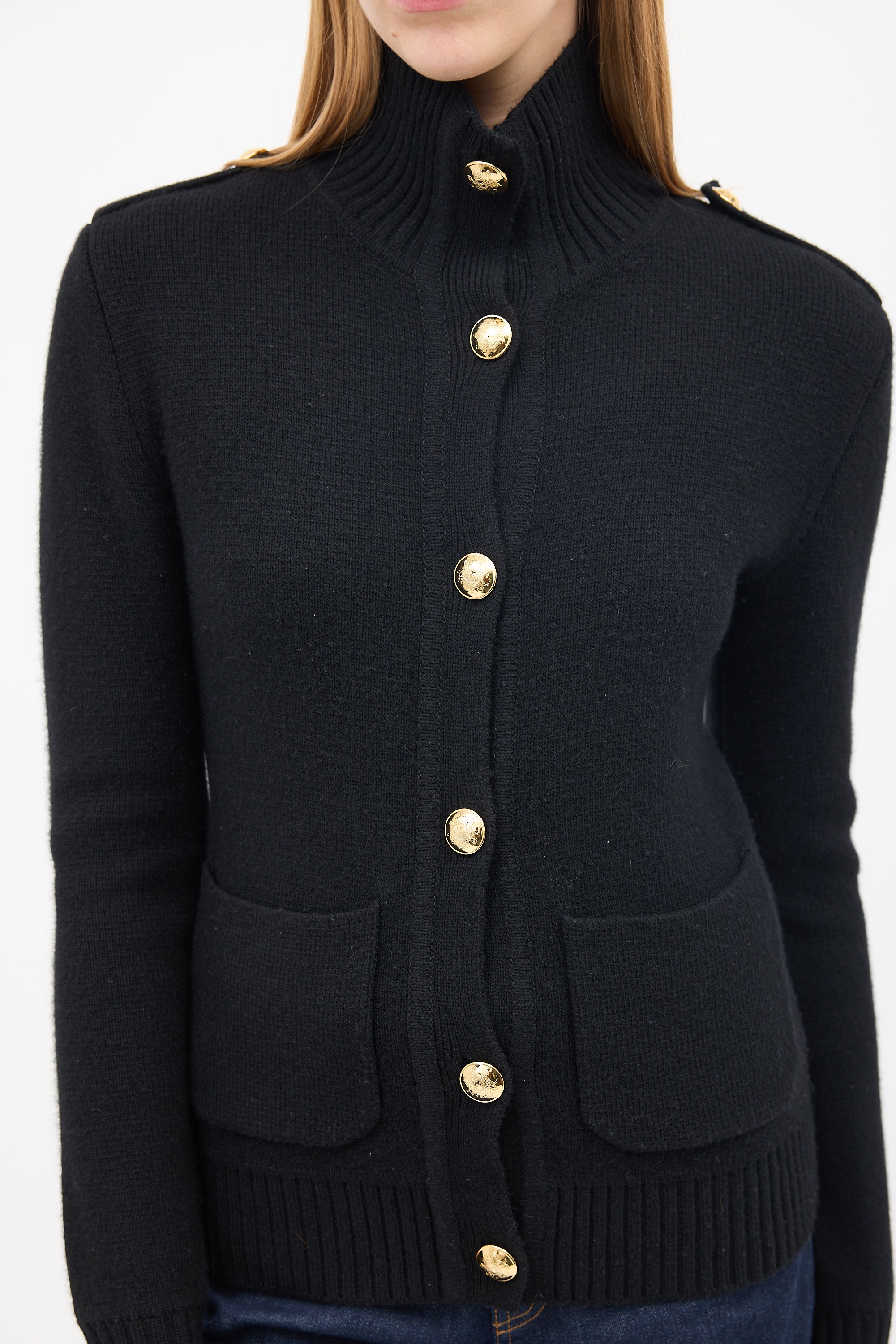 Pre-owned Nili Lotan black wool and cashmere blend Kala cardigan featuring a funnel neck, gold tone buttons with crest motif, button up front, two patch pockets at front waist, even hem, epaulettes at shoulders, long sleeves, and ribbing at collar, hem, and cuffs.