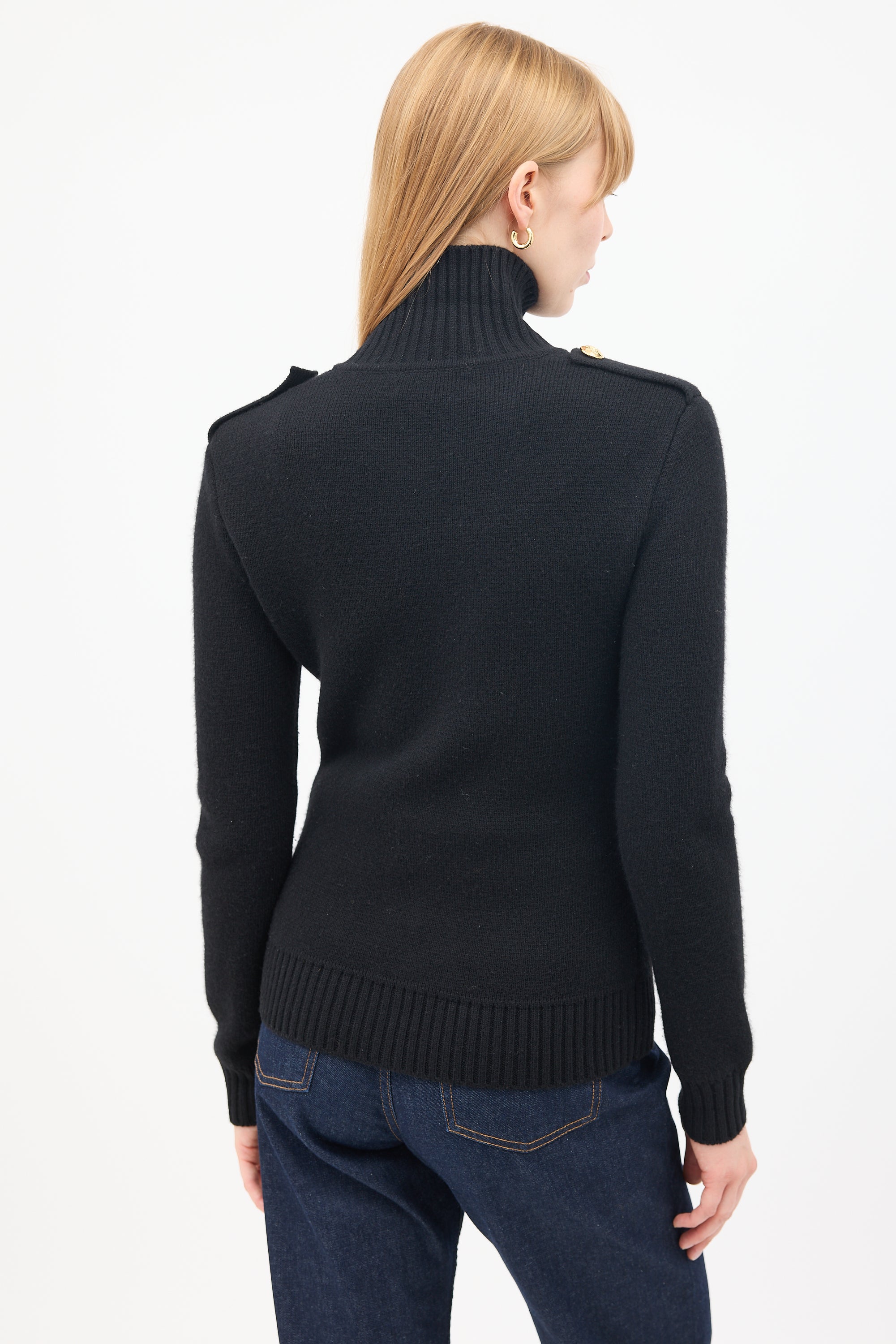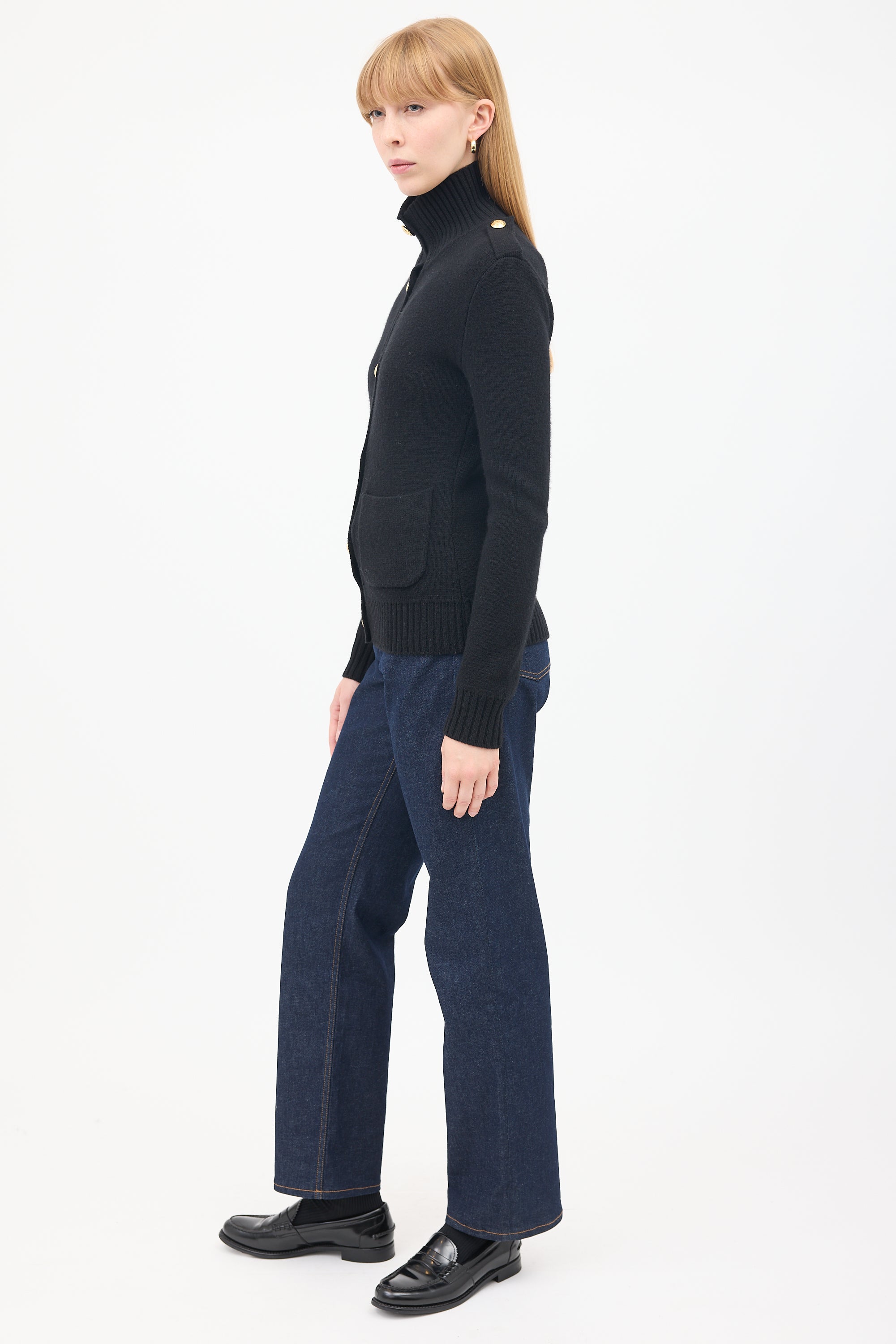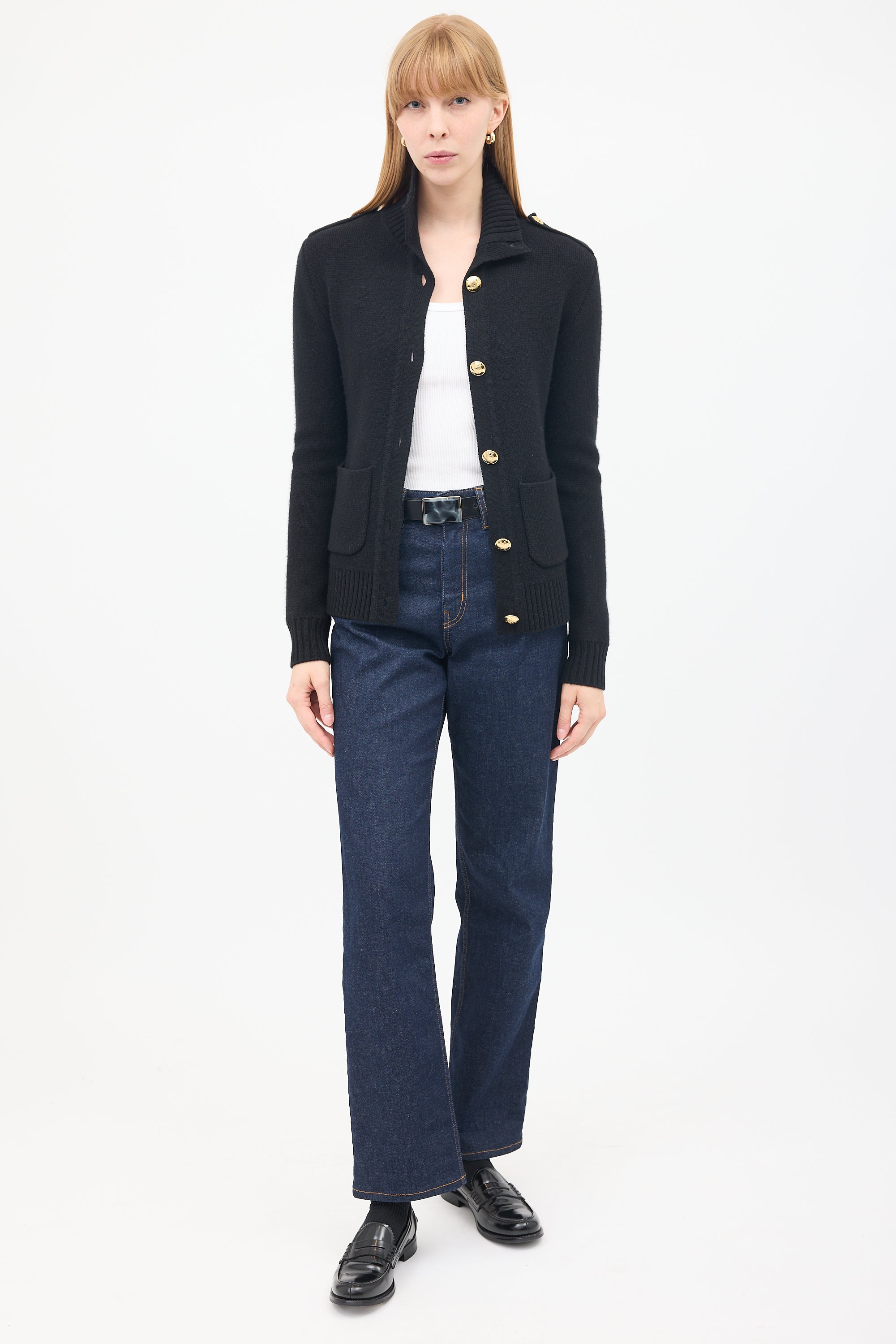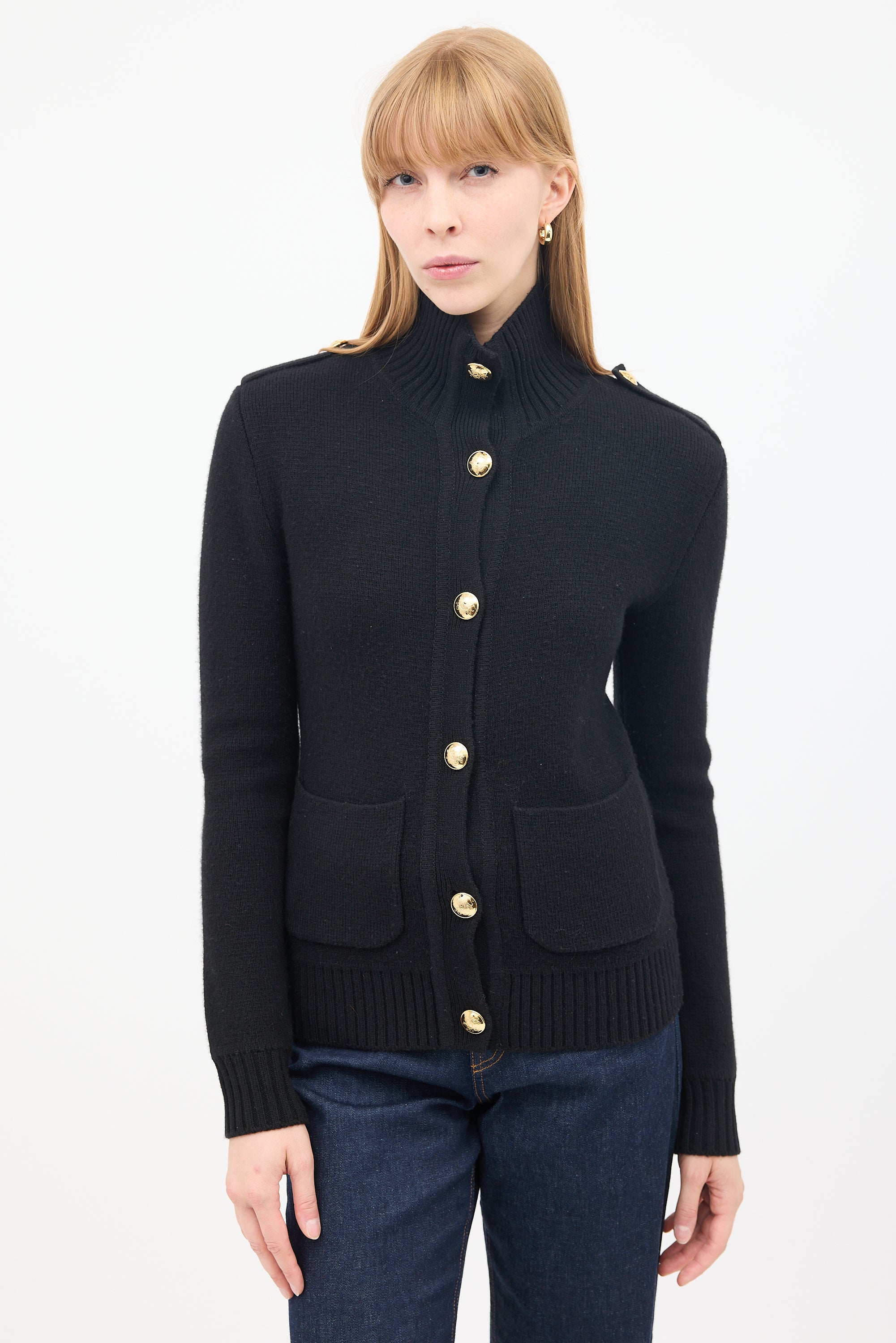 Pre-owned Nili Lotan black wool and cashmere blend Kala cardigan featuring a funnel neck, gold tone buttons with crest motif, button up front, two patch pockets at front waist, even hem, epaulettes at shoulders, long sleeves, and ribbing at collar, hem, and cuffs.