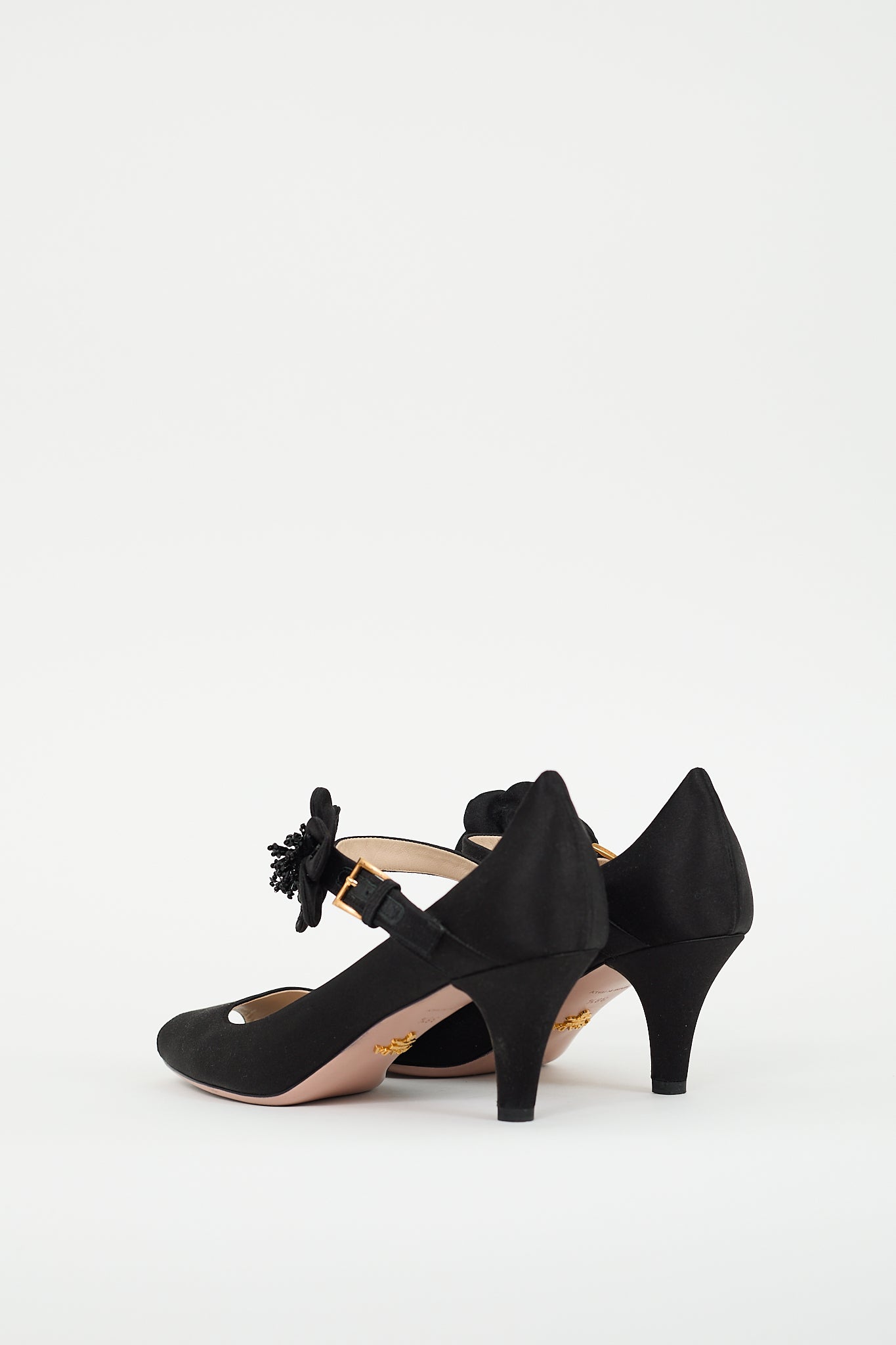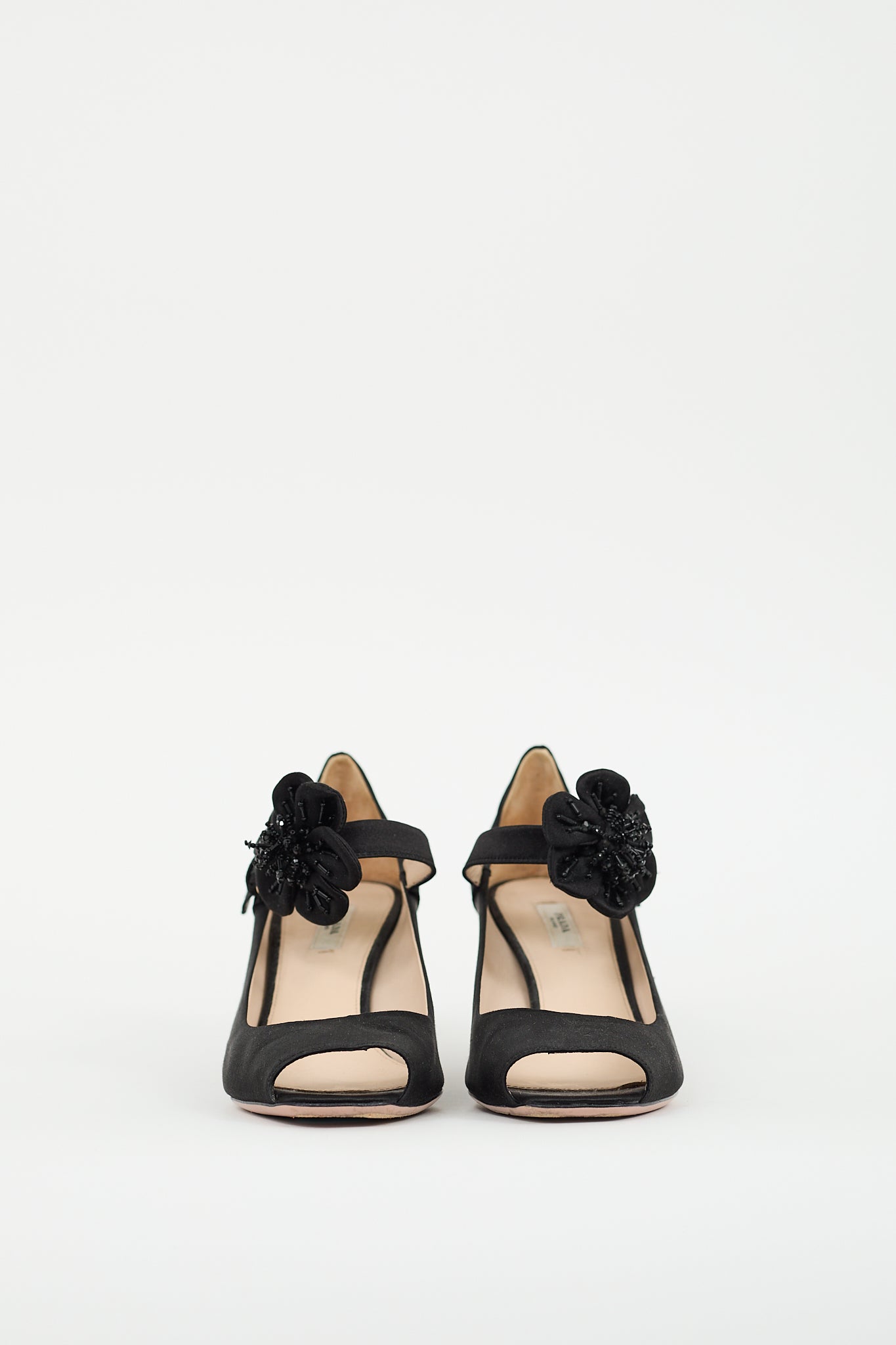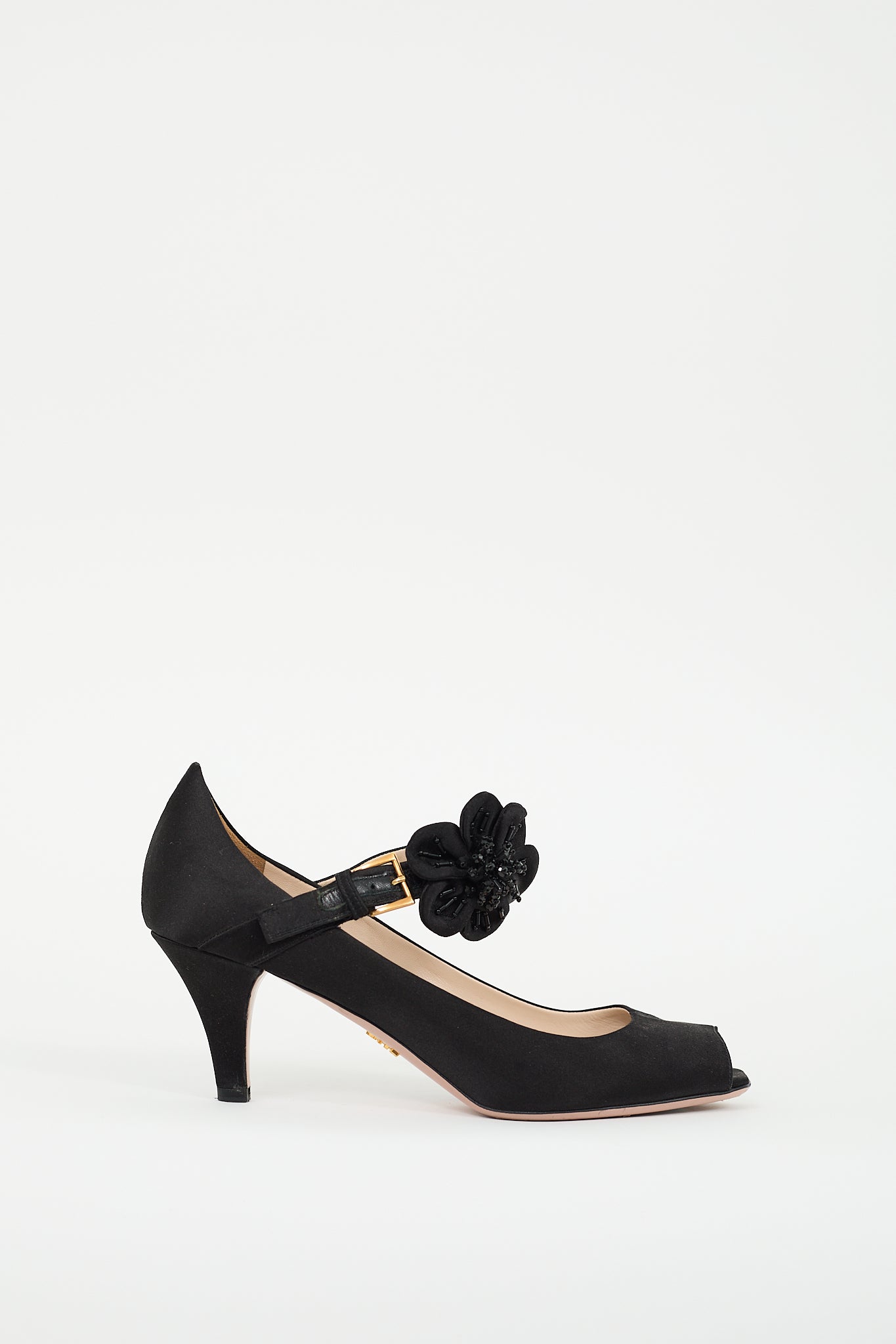Pre-owned Prada black satin pumps featuring square peep toe, adjustable strap across vamp with buckle fastening and beaded flower appliqué, and short covered heel.