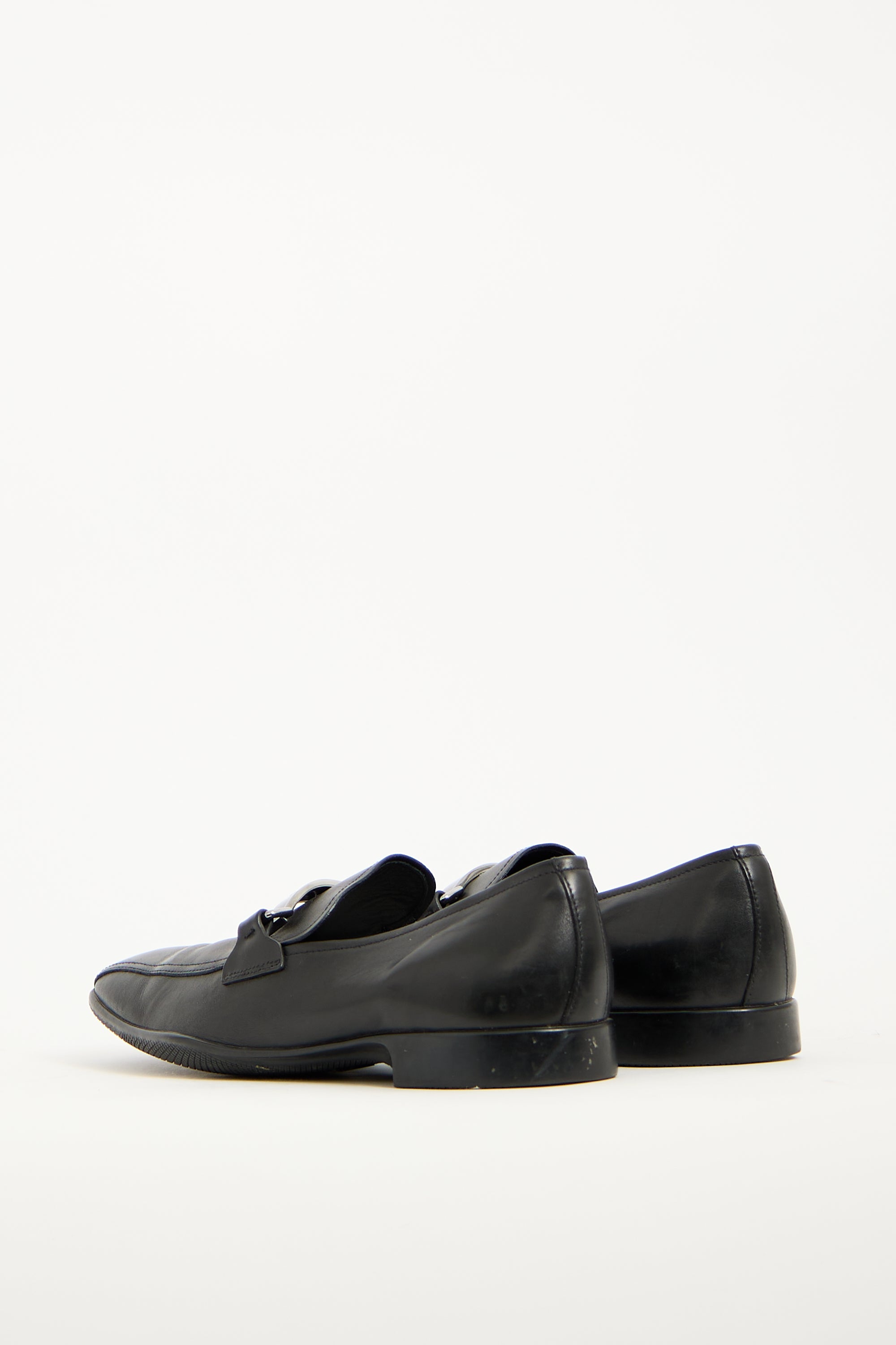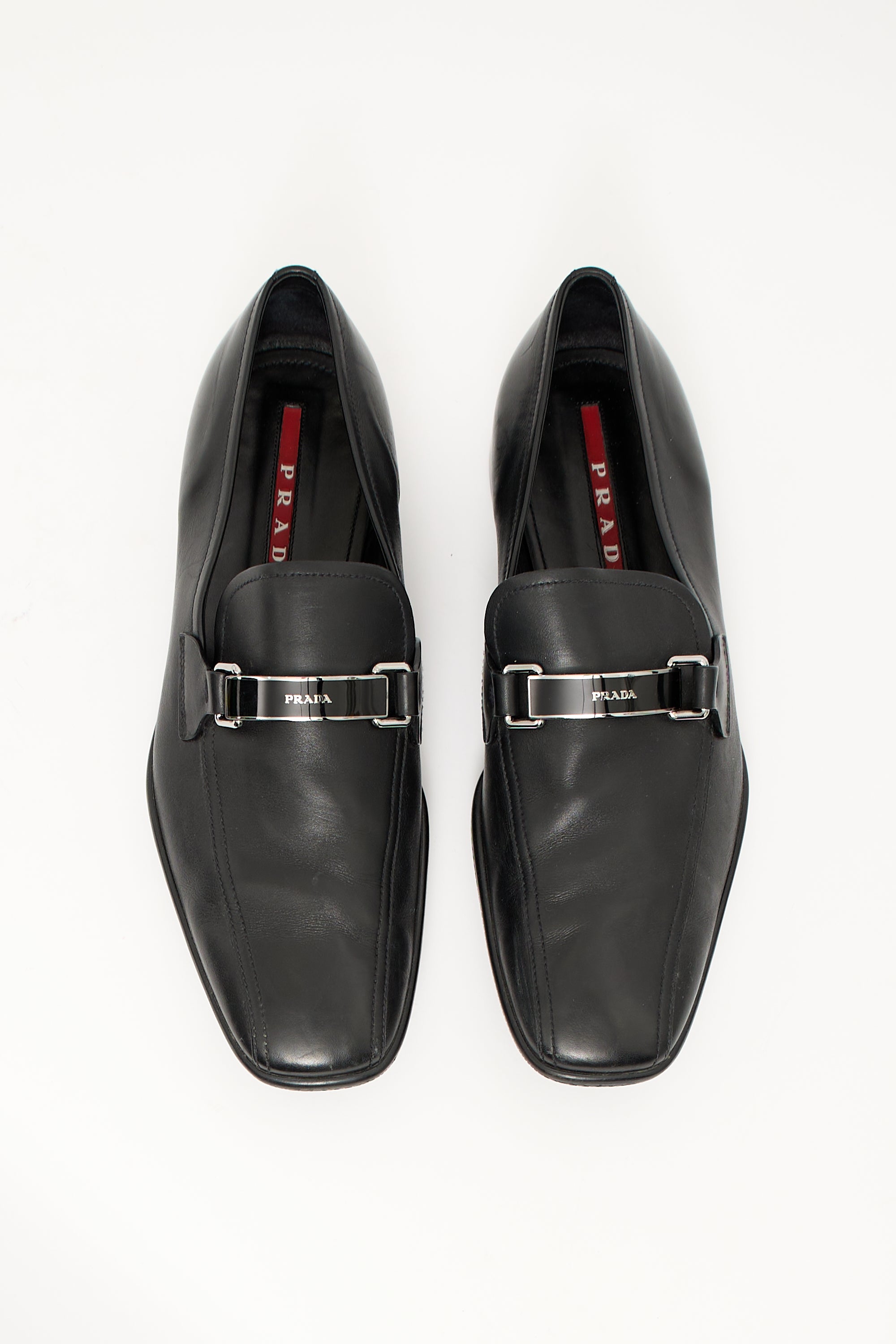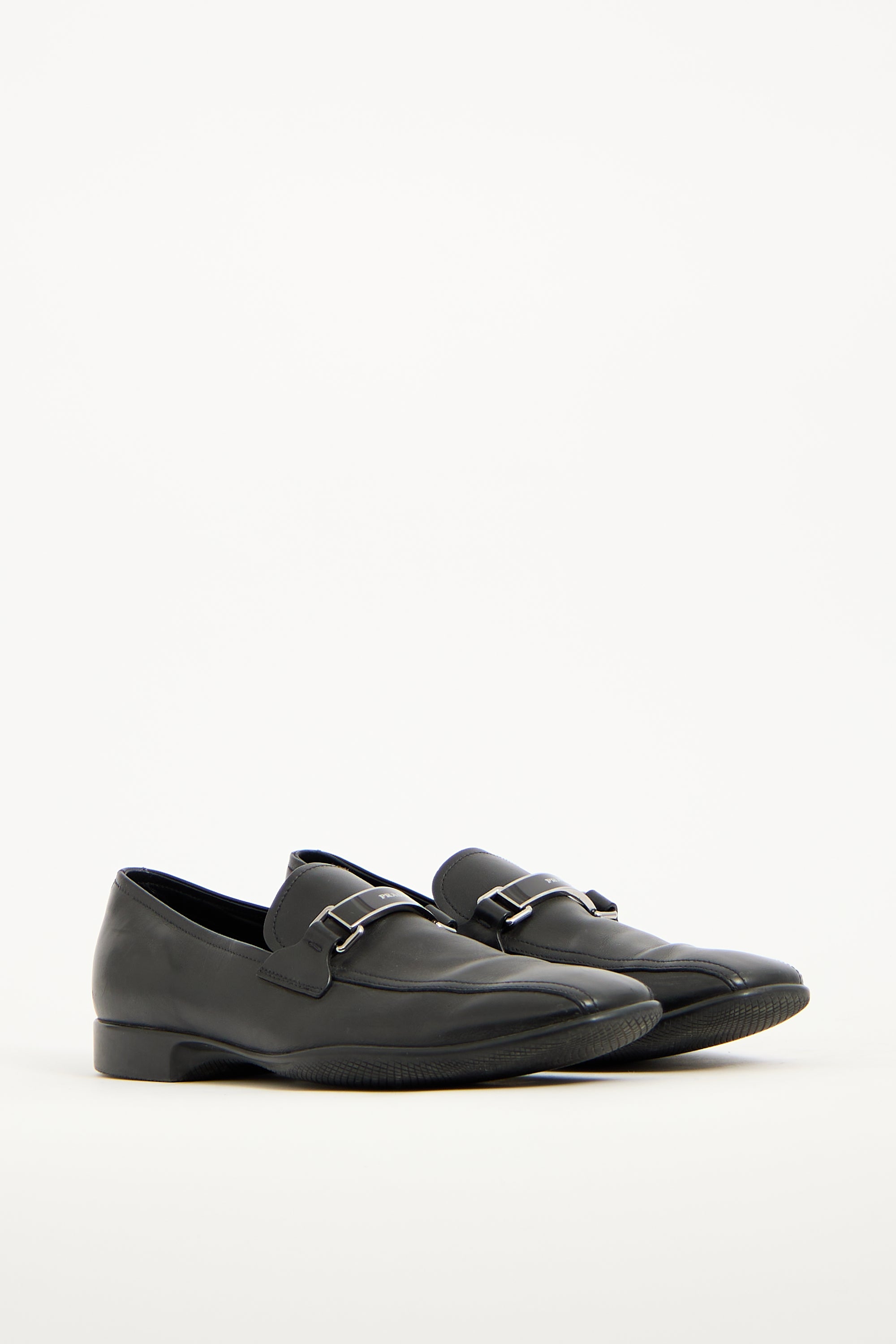 Pre-owned Prada vintage black leather loafers featuring tapered square toe, silver tone hardware logo upper, notched sides, and slip on entry. Comes with original dust bag.