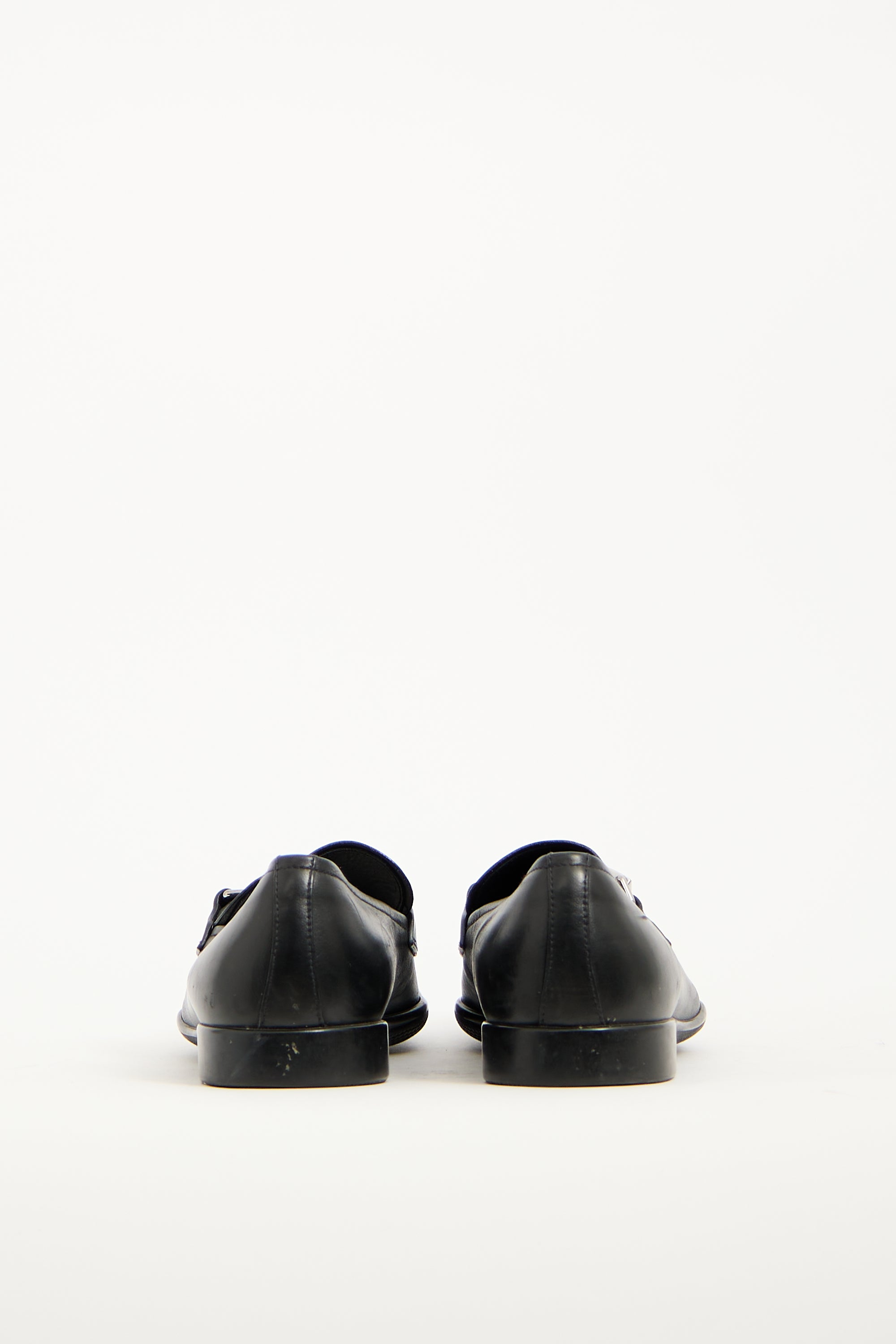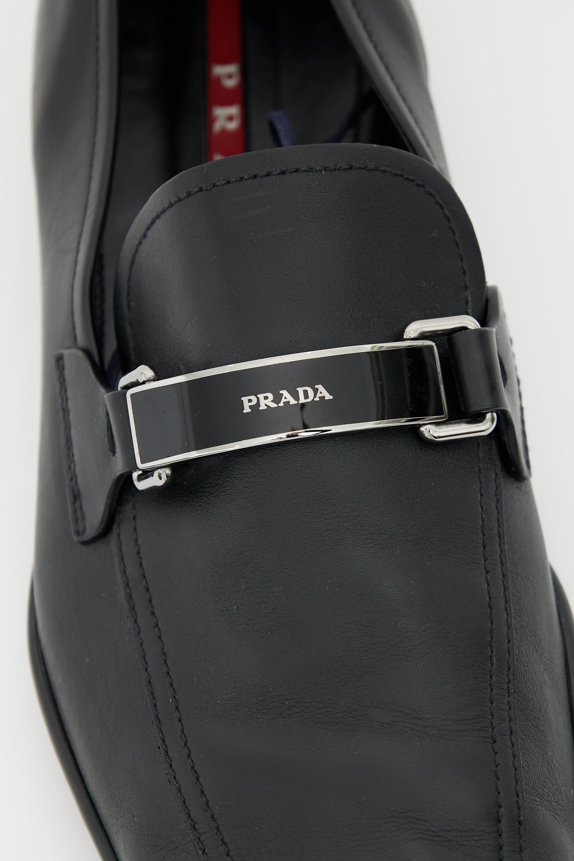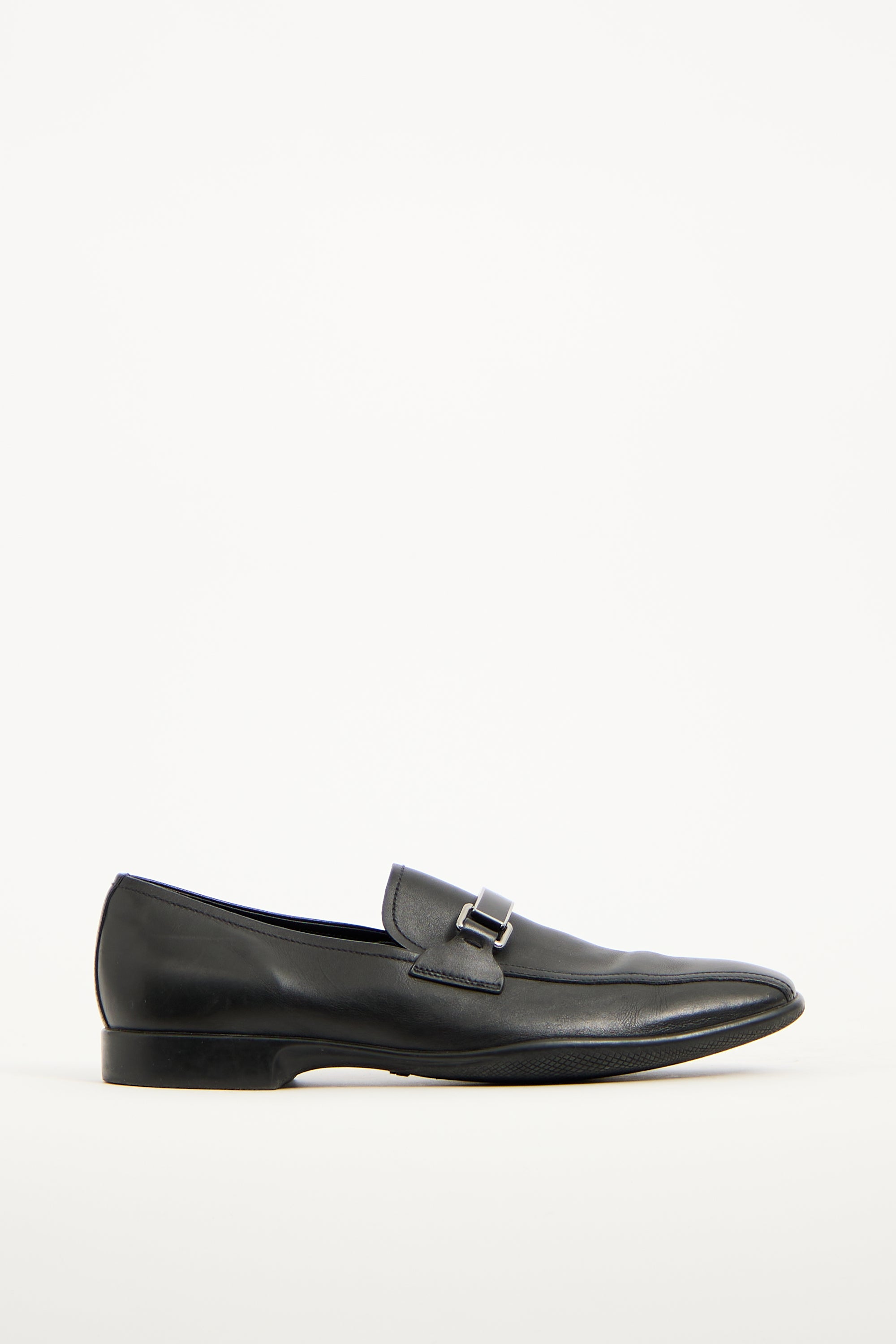 Pre-owned Prada vintage black leather loafers featuring tapered square toe, silver tone hardware logo upper, notched sides, and slip on entry. Comes with original dust bag.