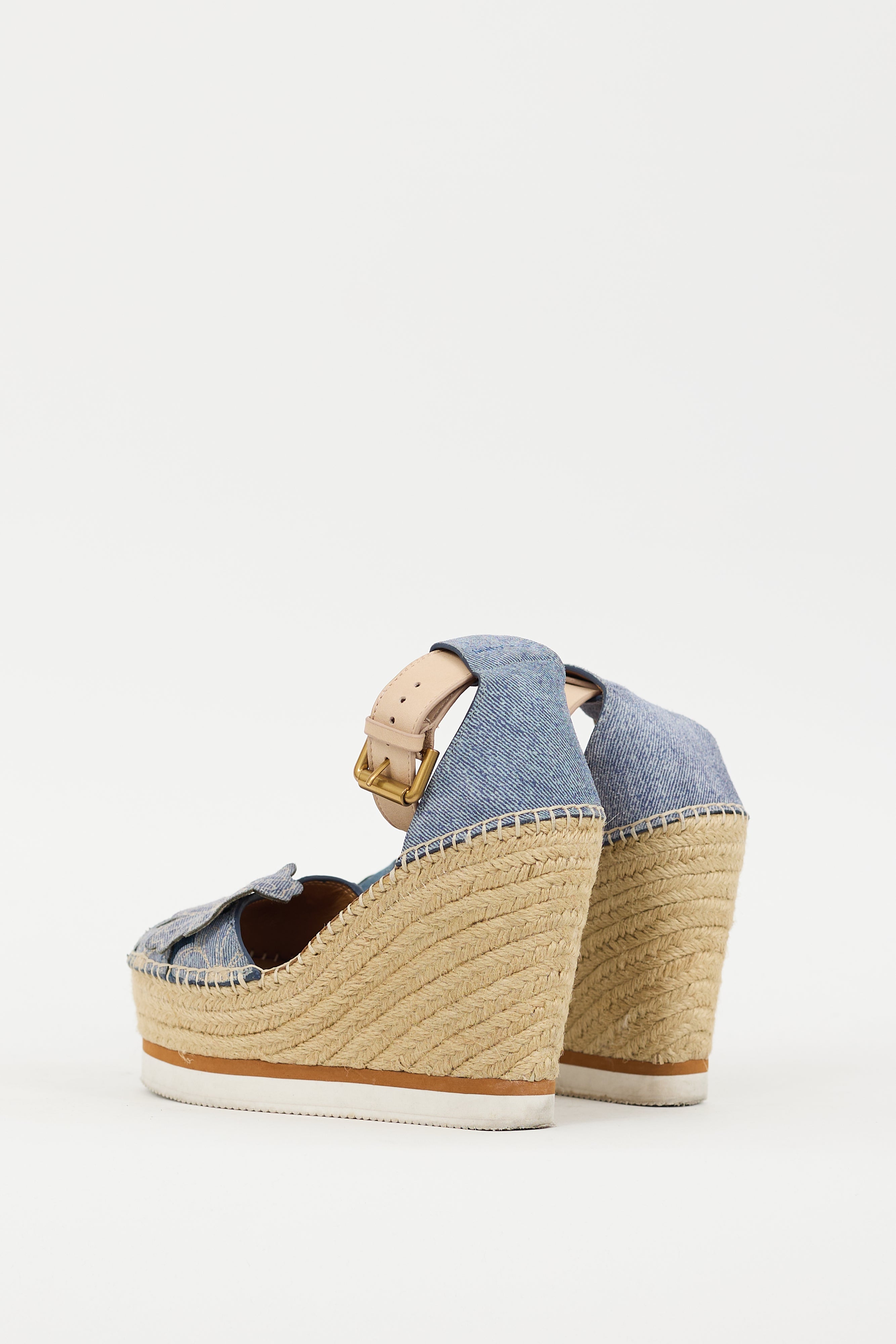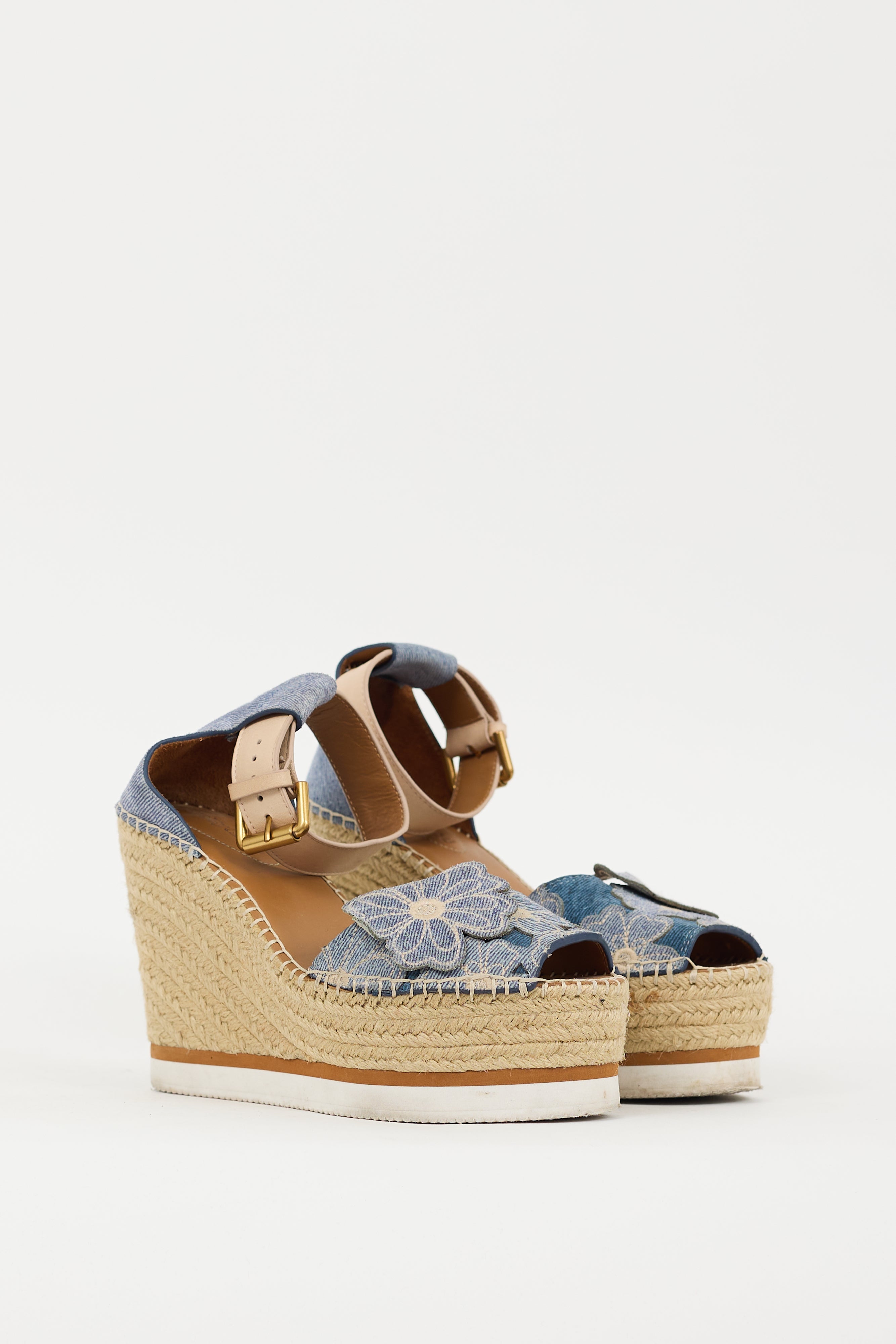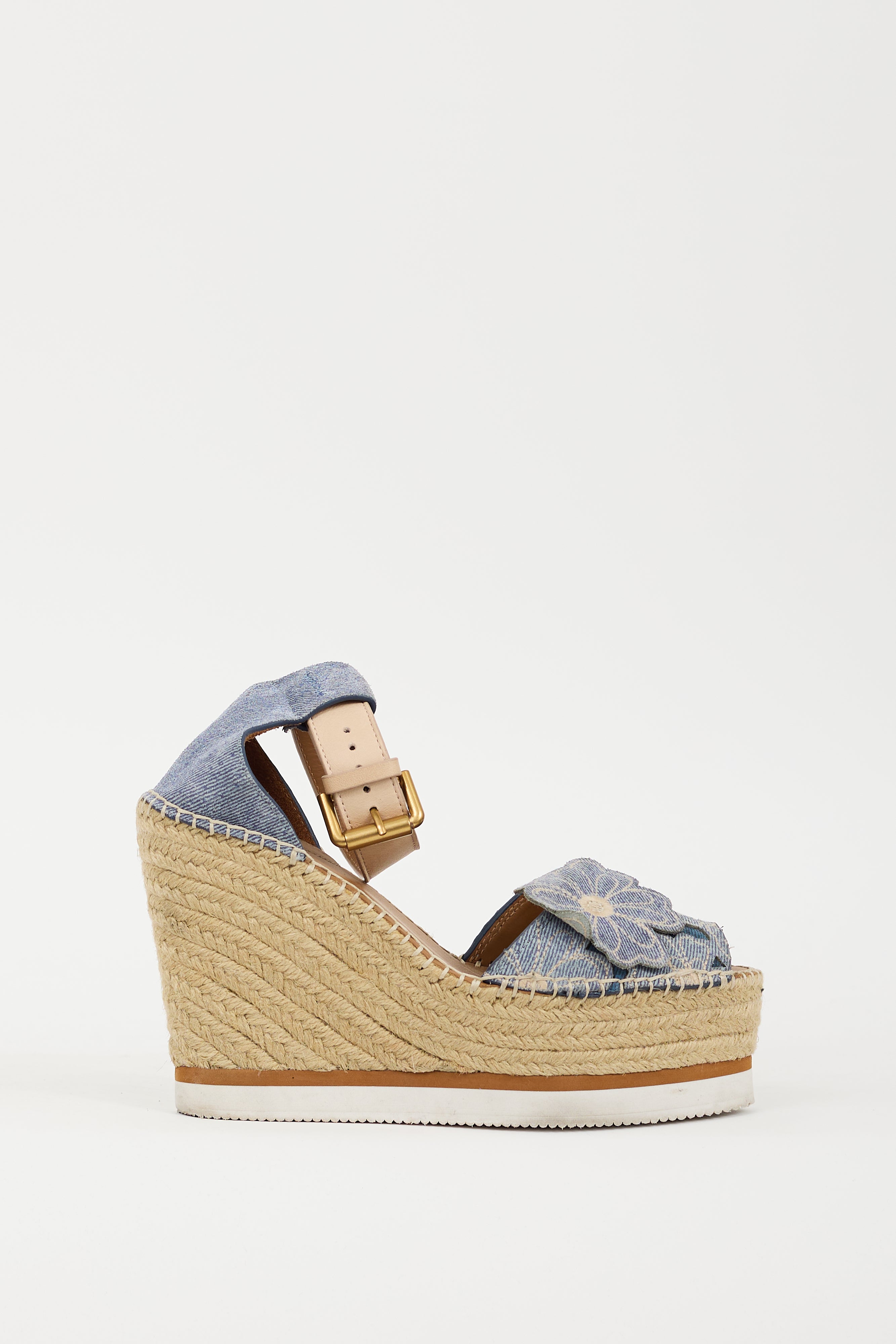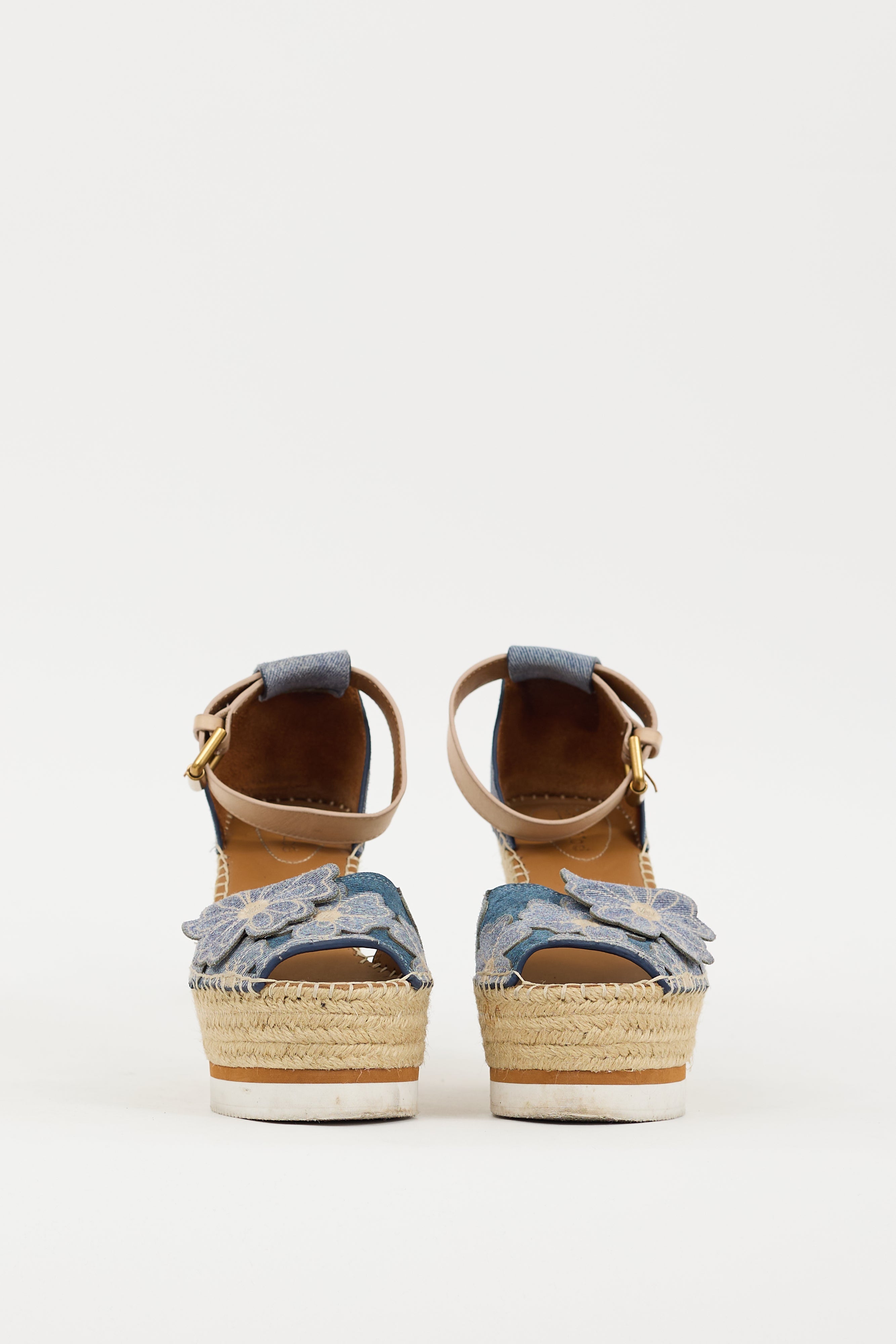 Pre-owned See By Chloé blue denim sandals featuring open rounded toe, vamp strap with floral applique, ankle strap with buckle closure, and jute wedge heel.