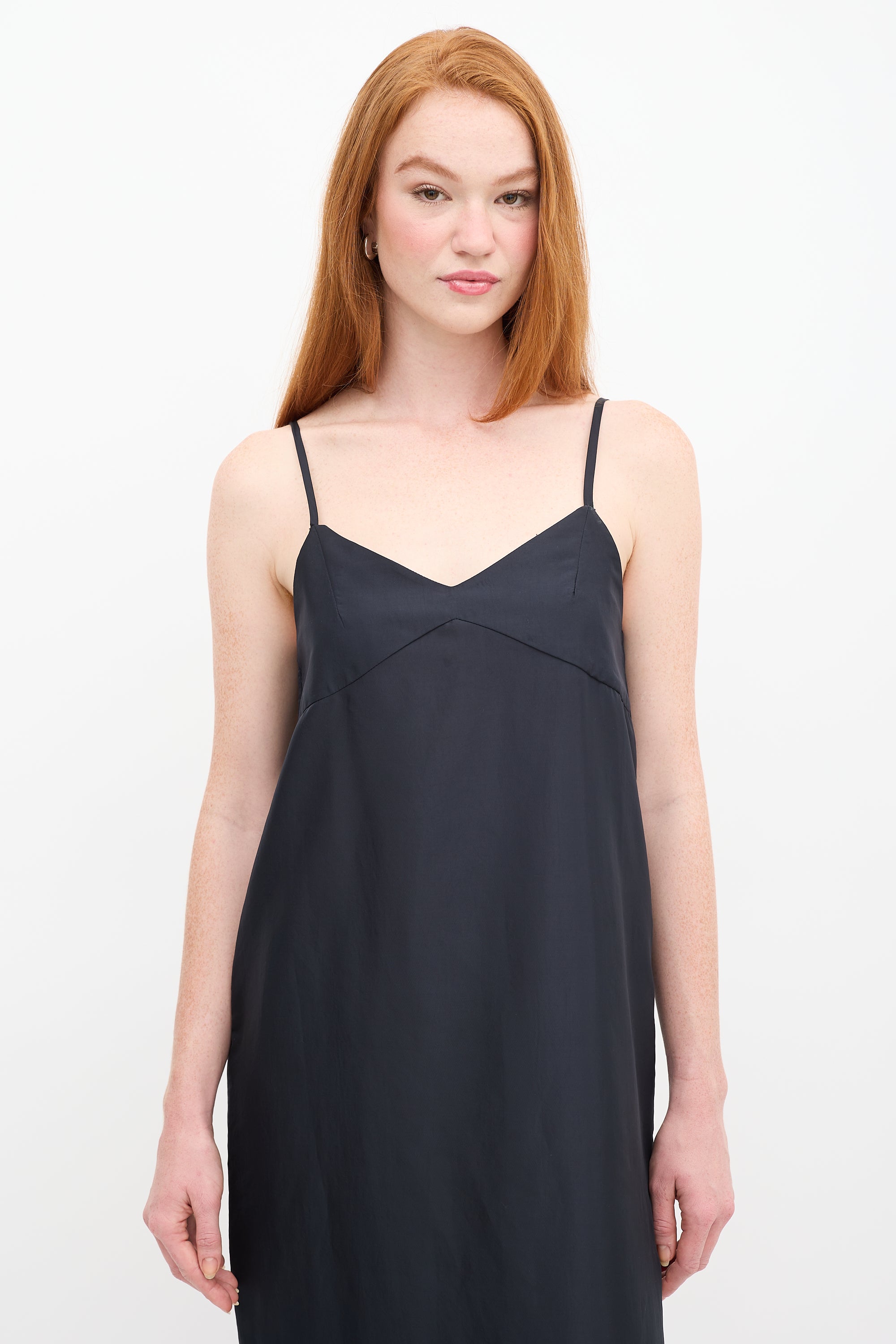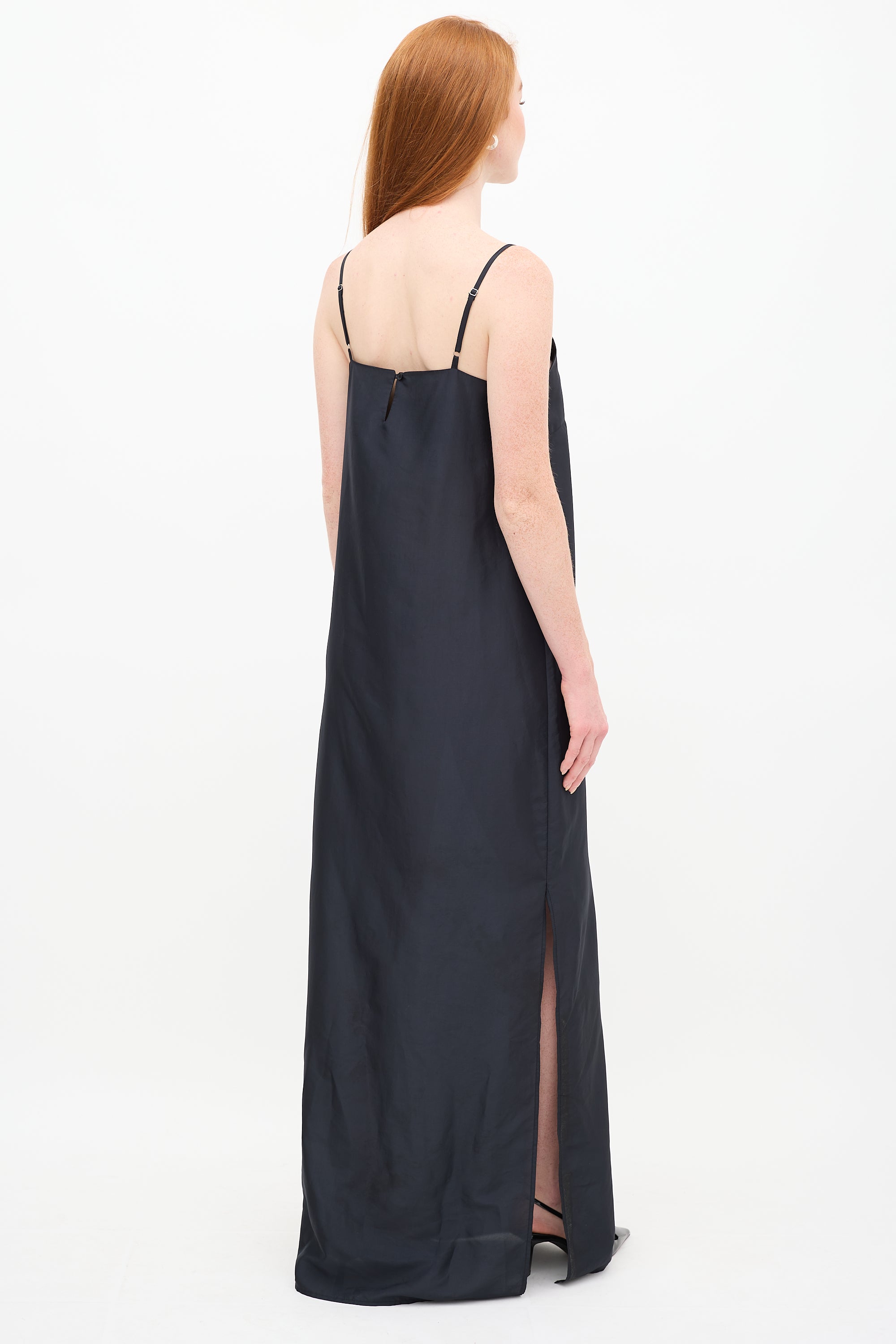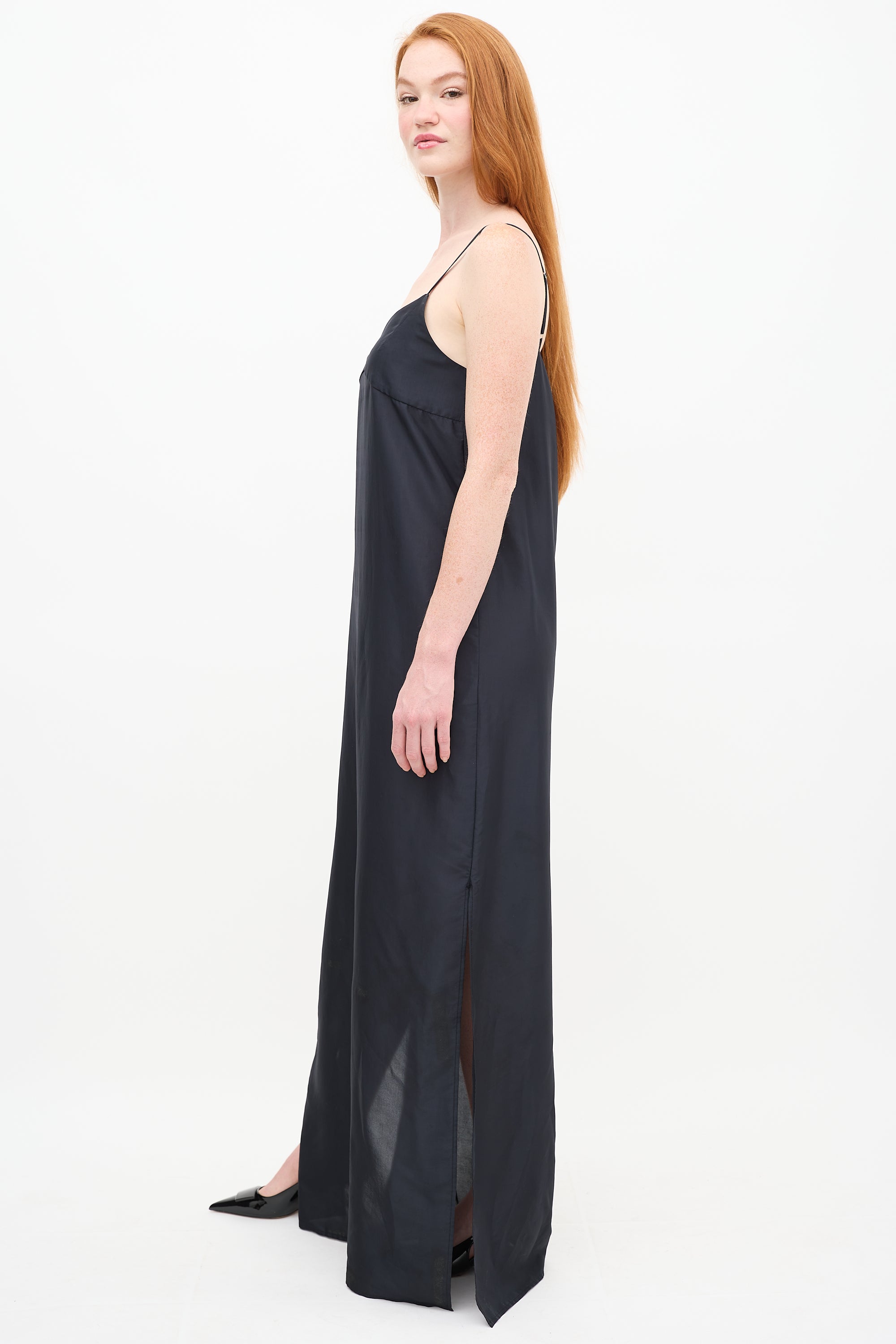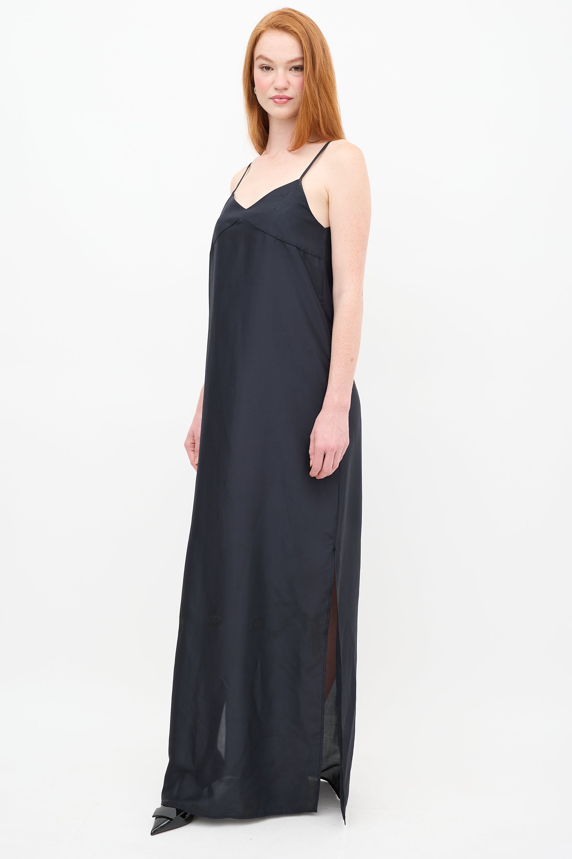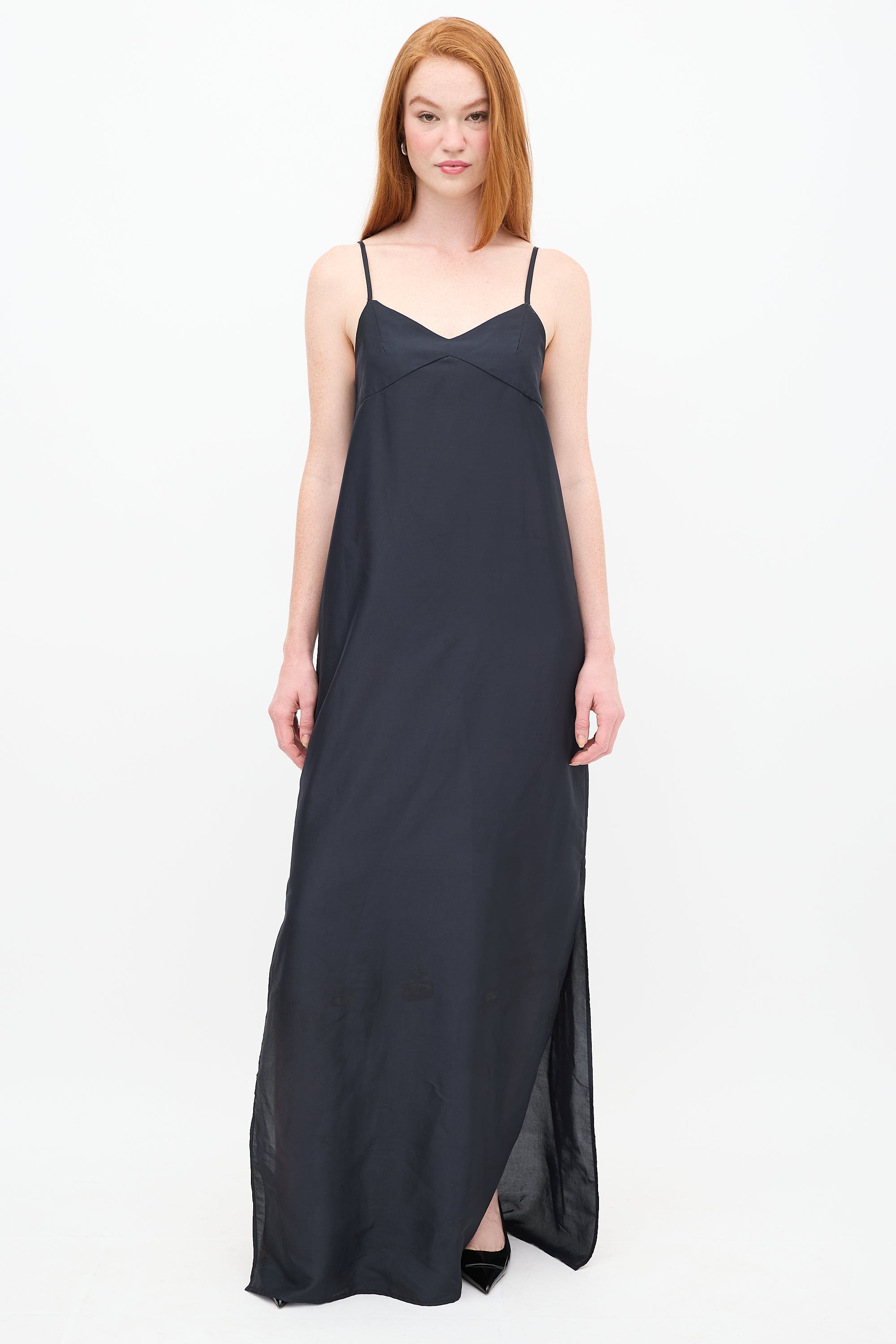 Pre-owned The Frankie Shop black nylon maxi dress featuring a sweetheart neckline, seam at bust, slits at hem, and button closure at back.