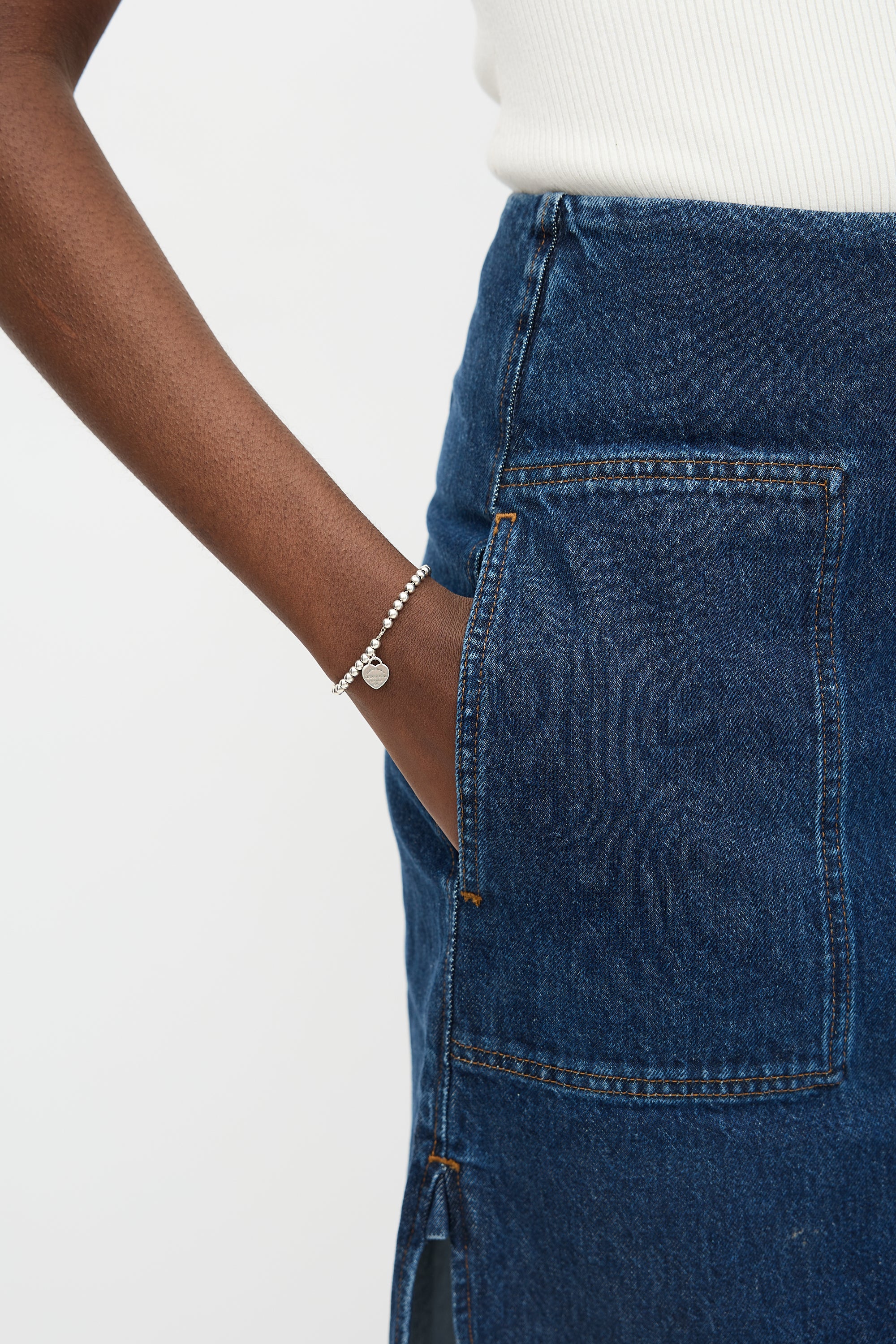 Pre-owned Tiffany & Co. sterling silver bracelet featuring beaded stand, heart tag pendant with "Please Return To Tiffany" engraved logo, circle logo charm at one end, and lobster clasp closure. Comes with original pouch.