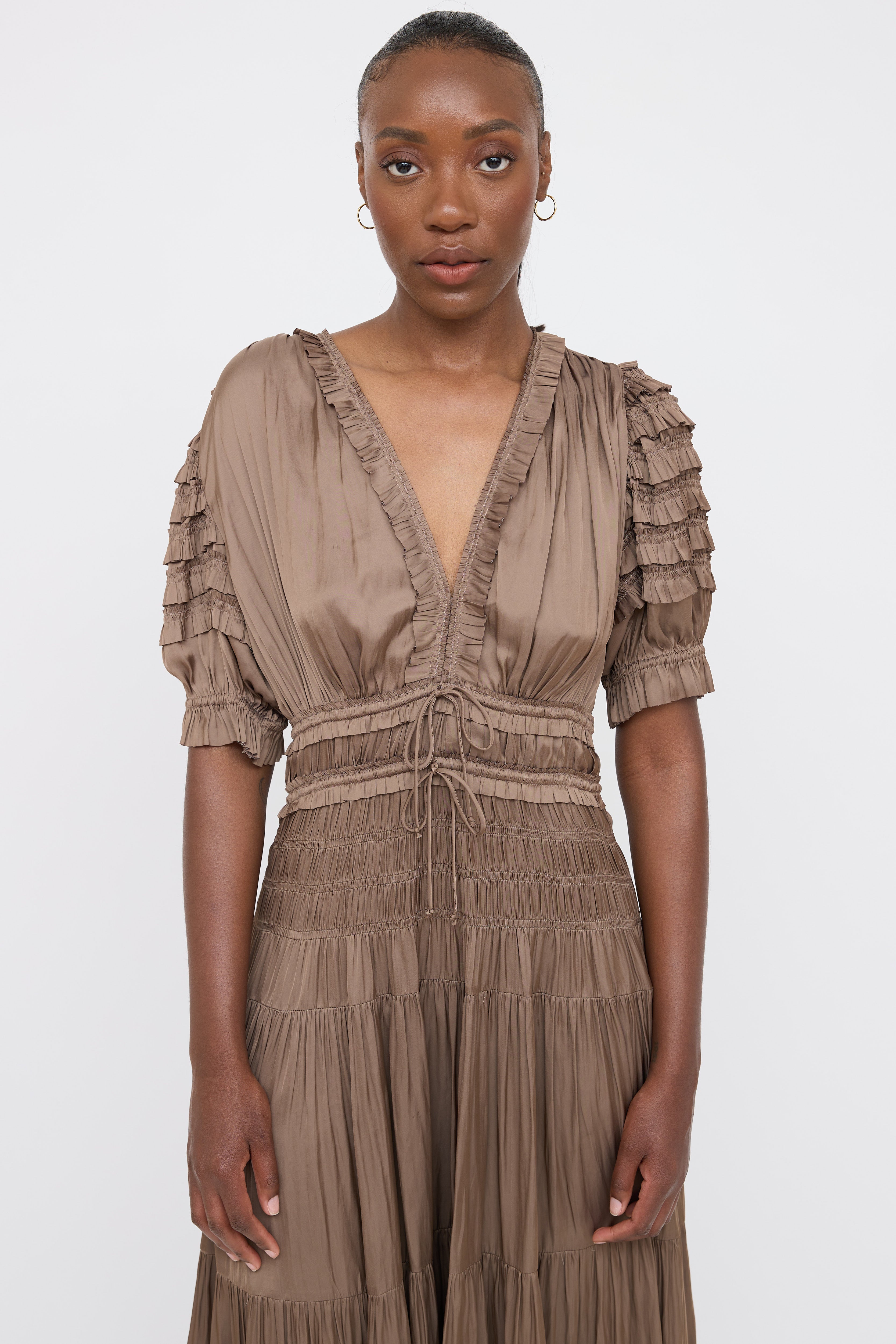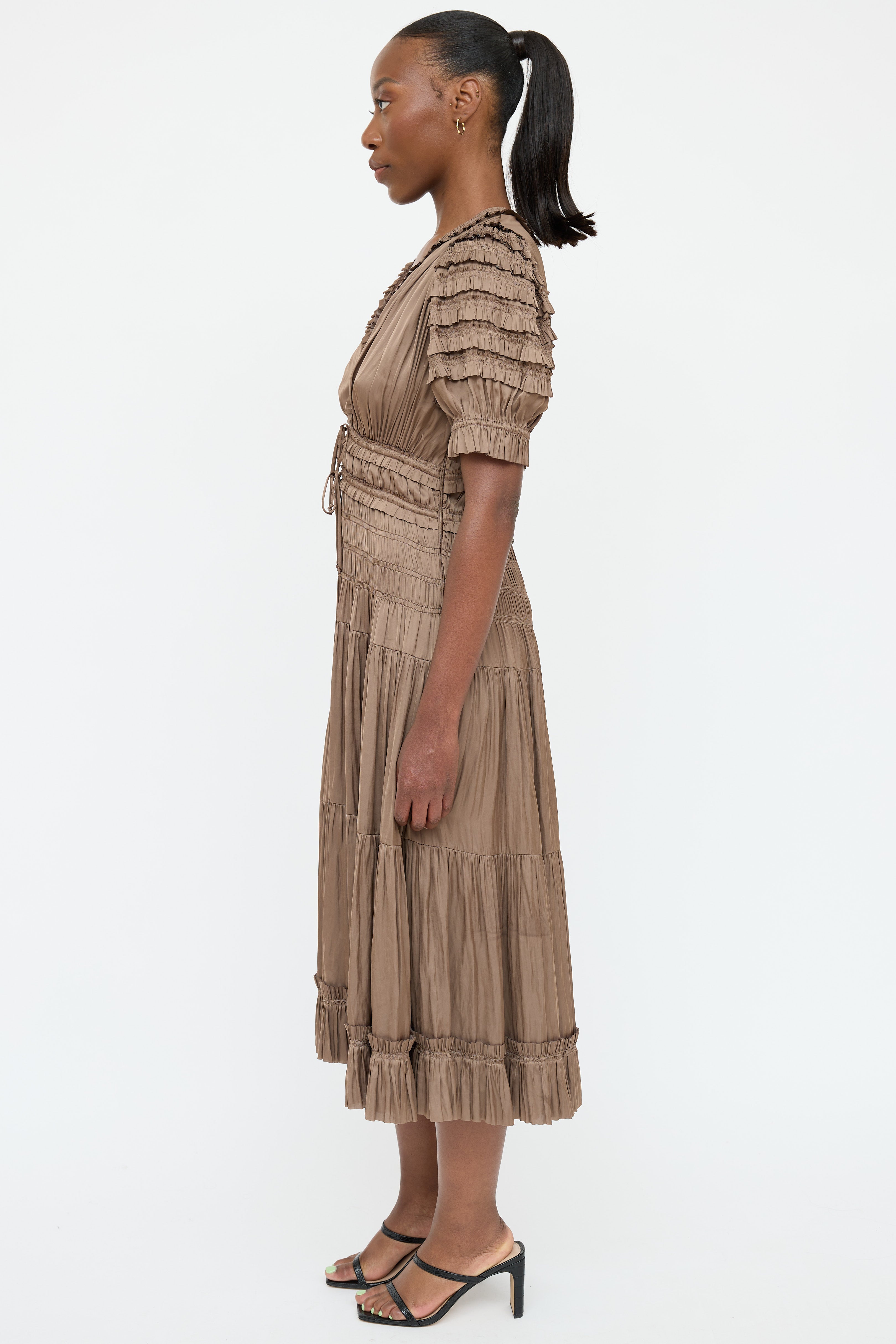 Pre-owned Ulla Johnson brown short sleeve dress featuring v-neckline, dual drawstring ties at waist, ruched bodice with ruffle trim, shirred tiered skirt, and concealed zip at side.