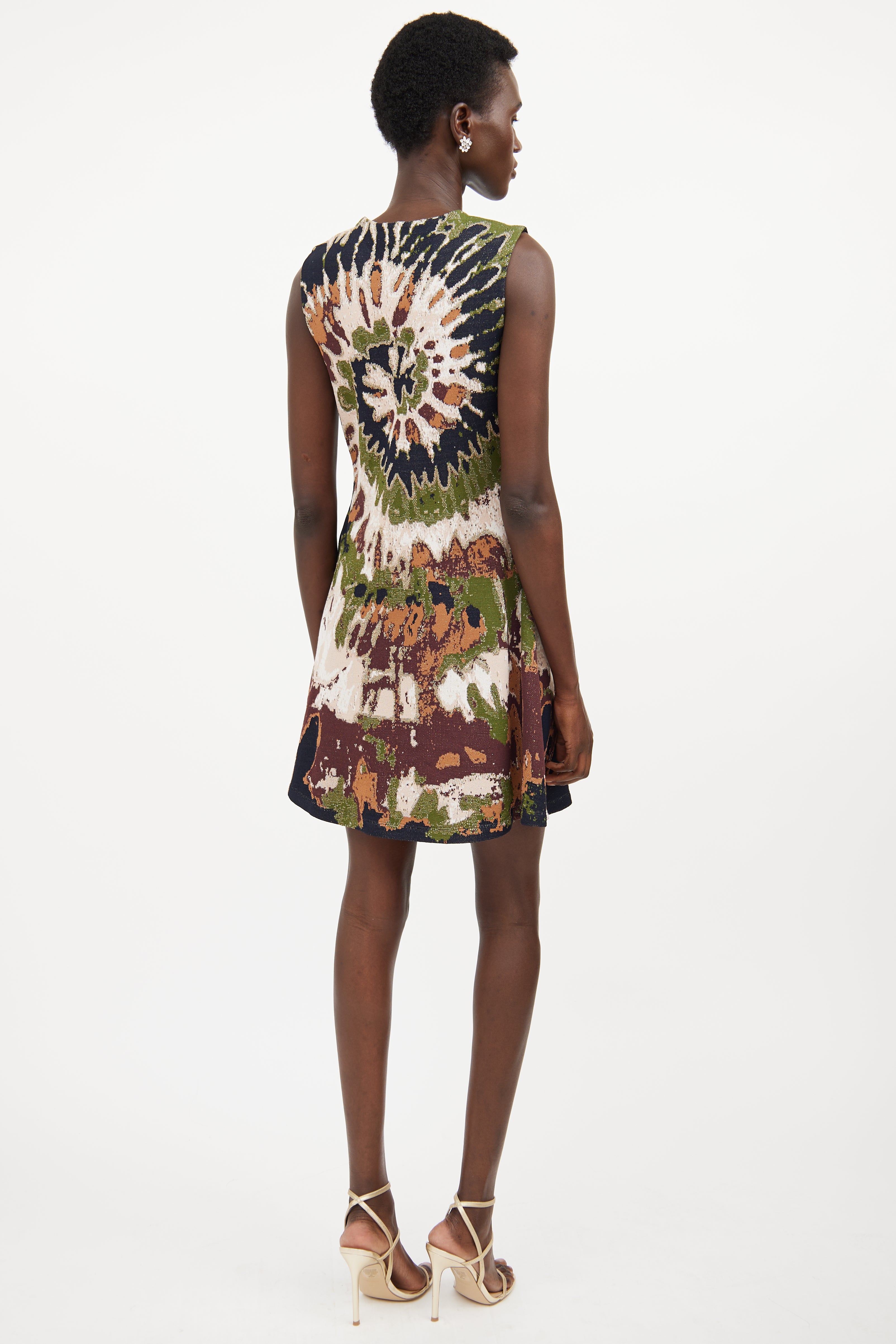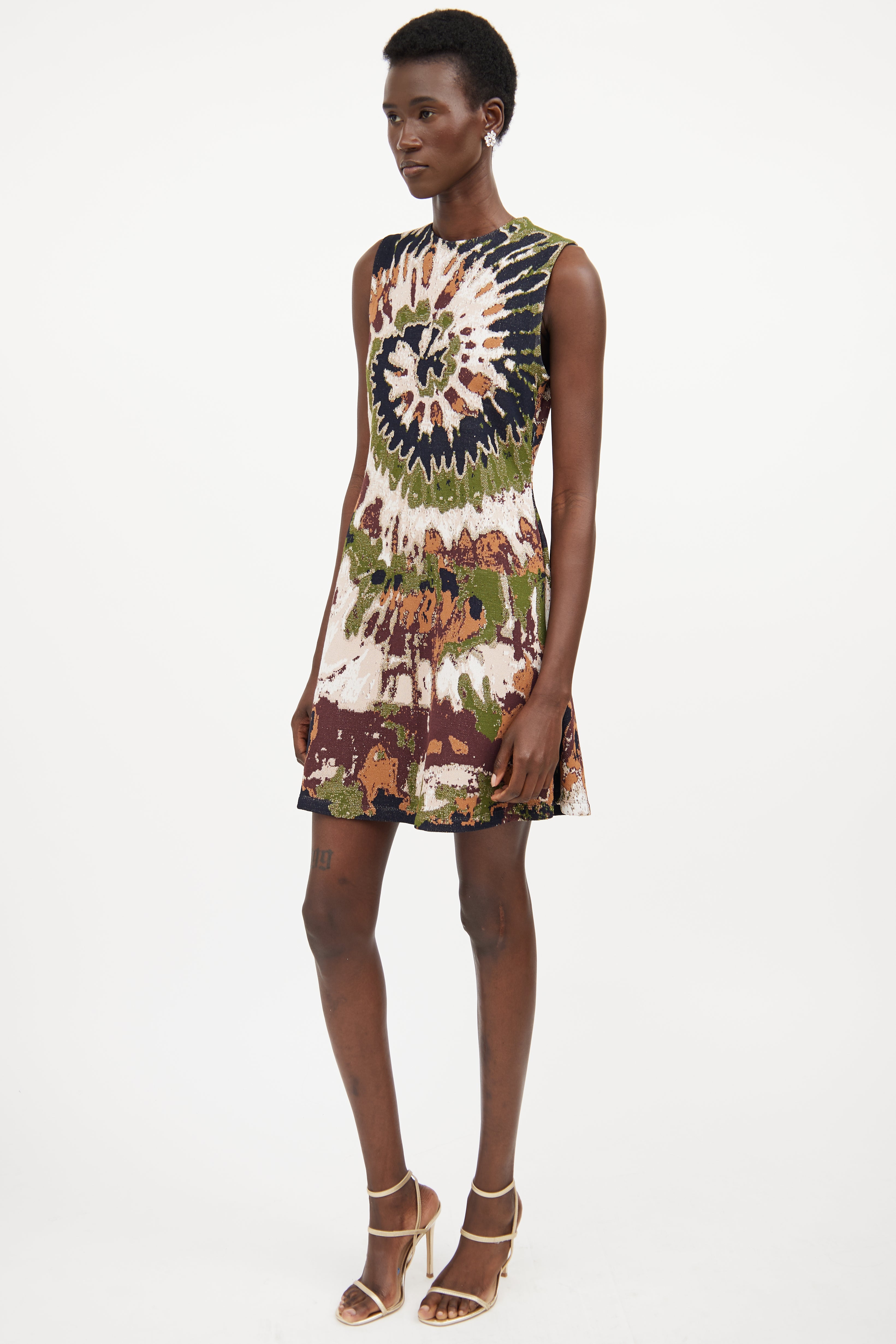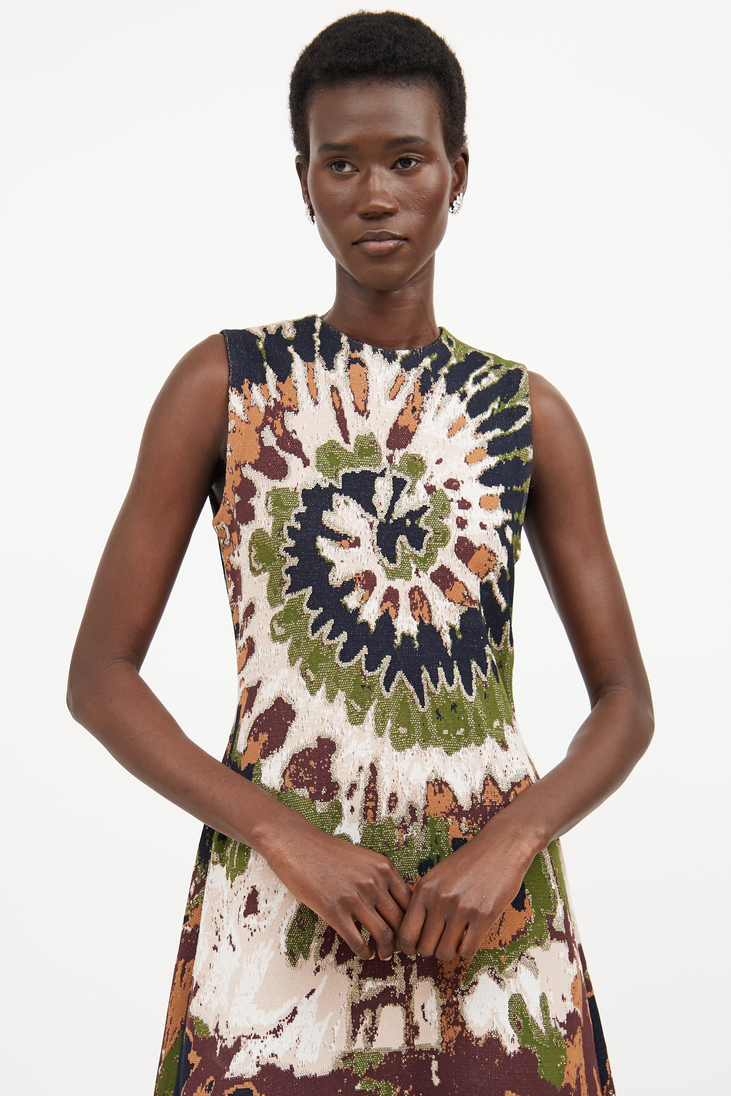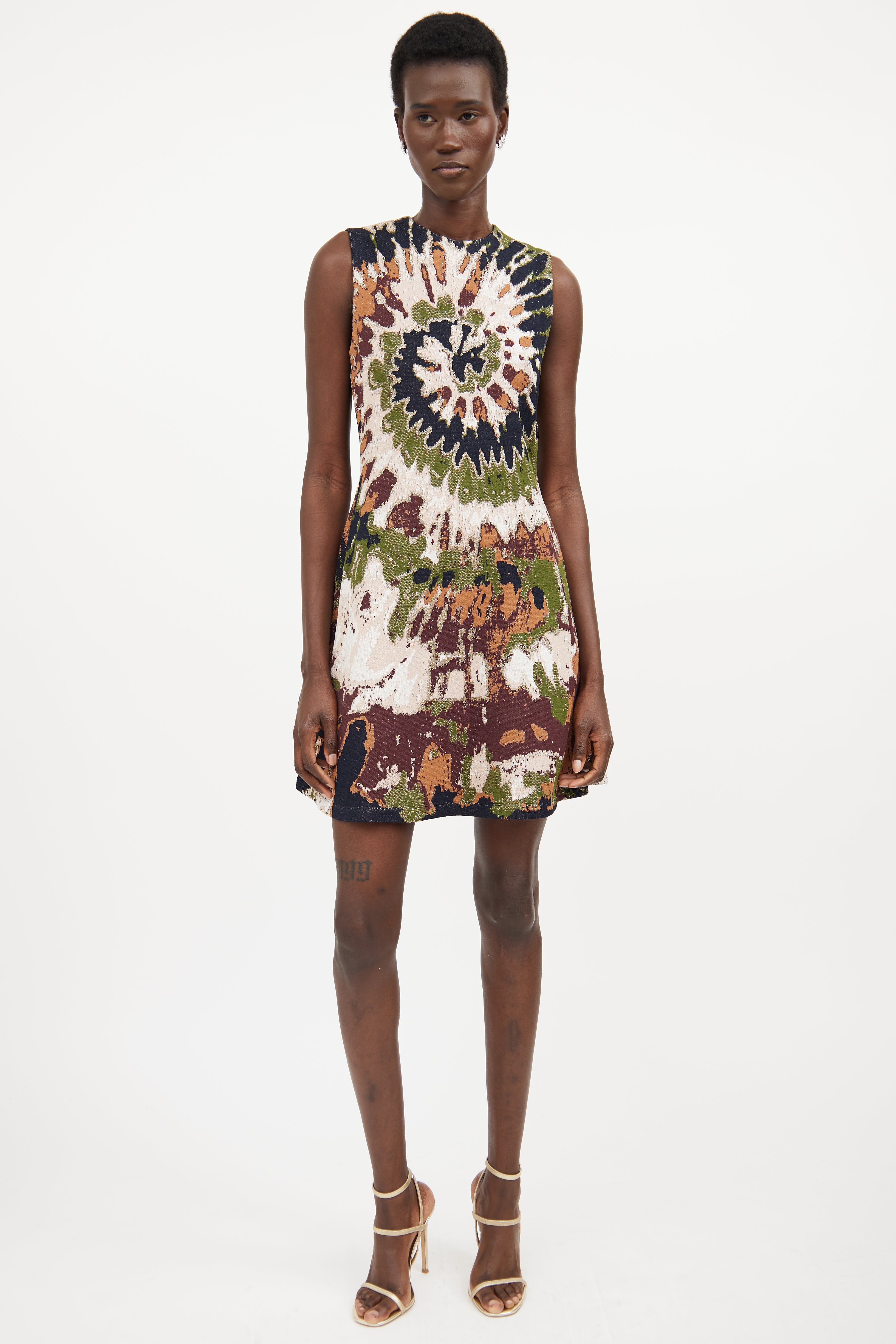 Pre-owned Valentino brown woven dress featuring a multicolour tie dye pattern throughout, round neckline, sleeveless styling, flared hem, and zip closure at side.