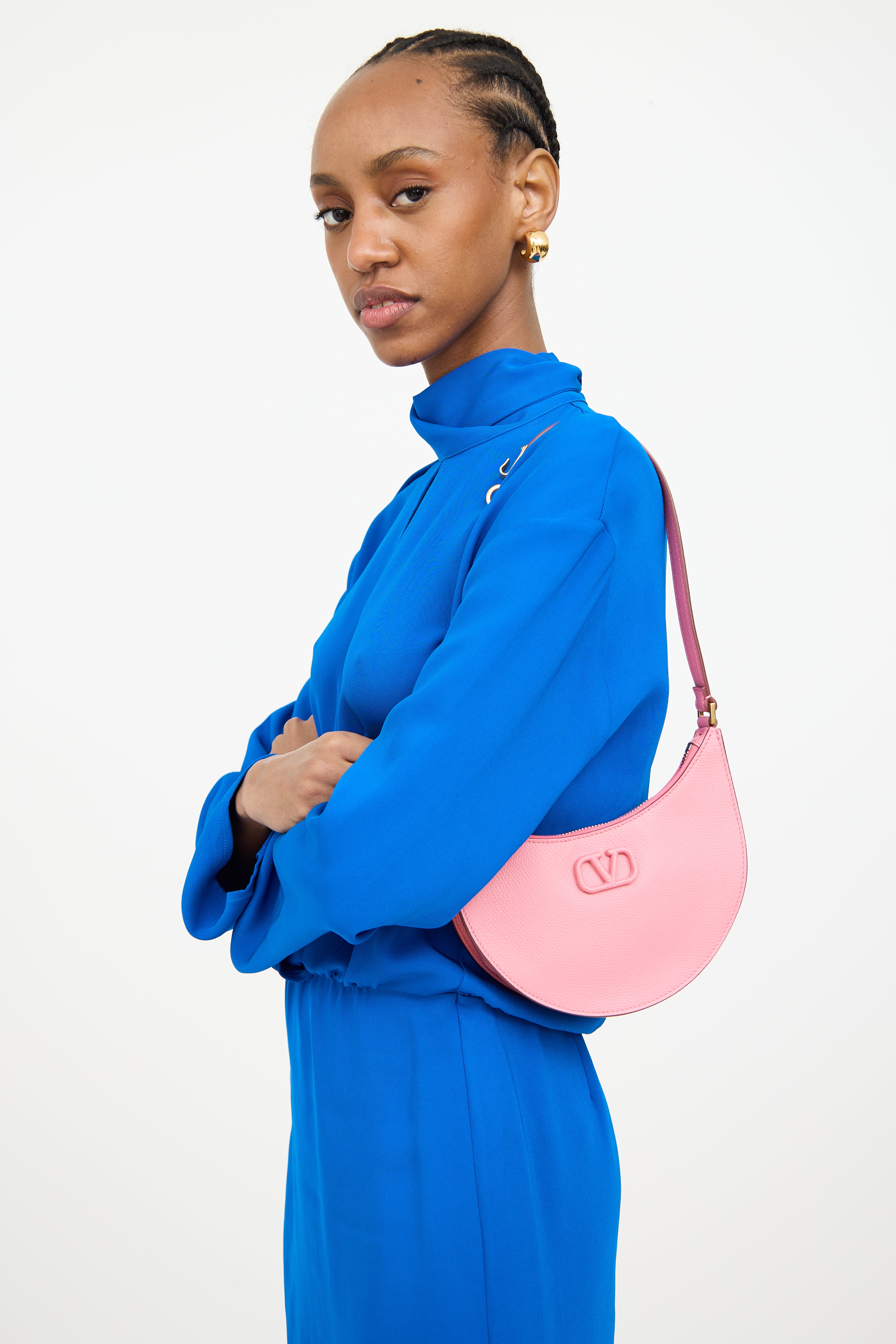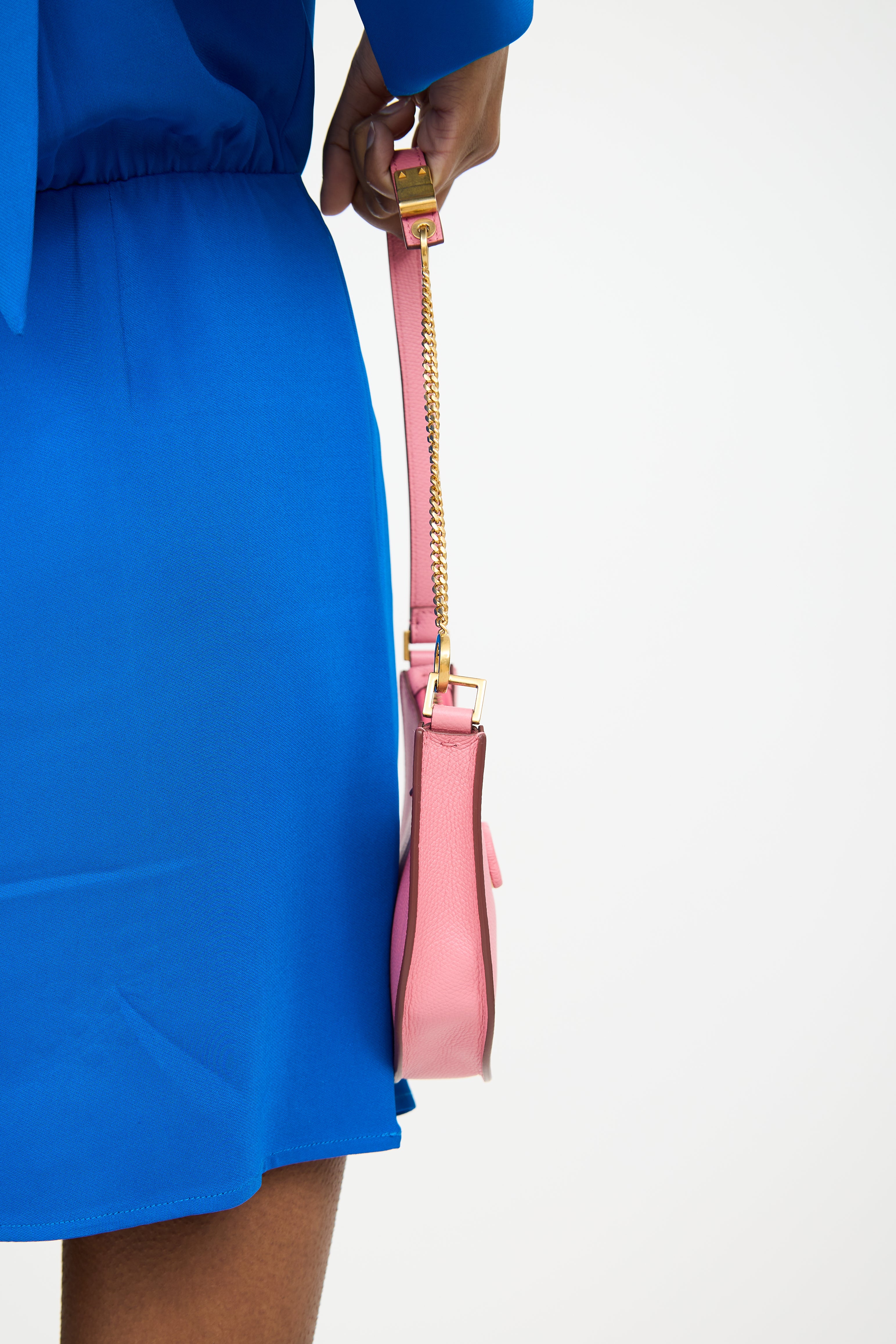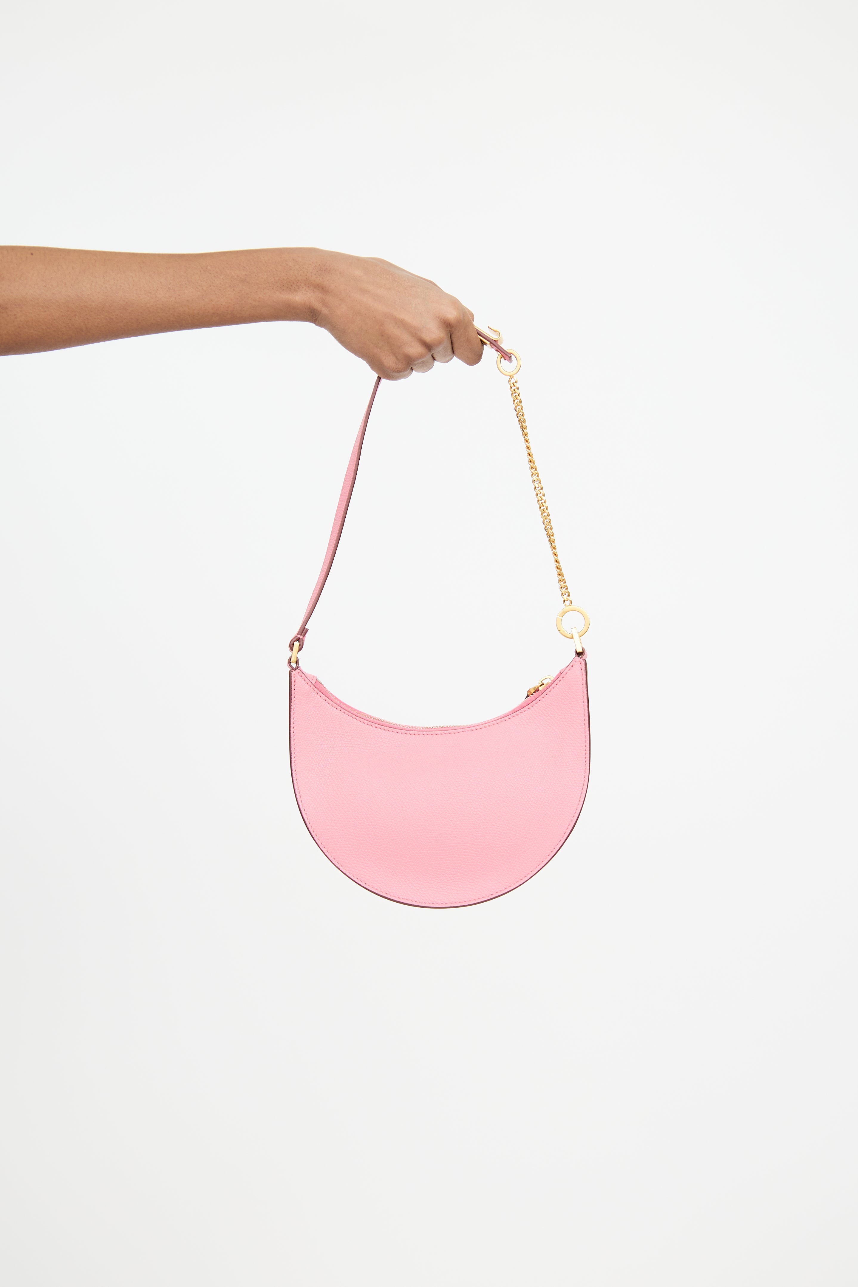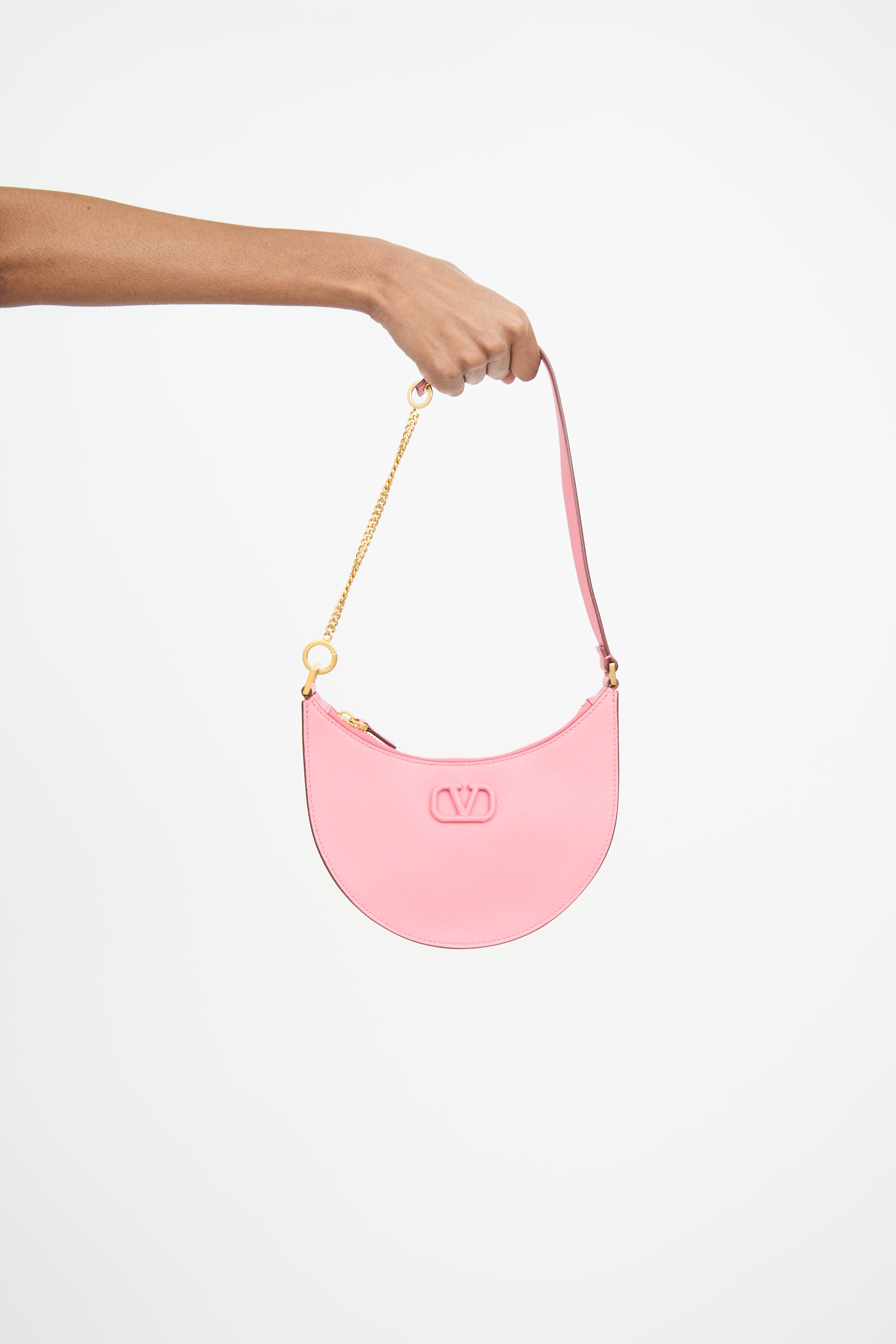 Pre-owned Valentino pink Vlogo leather bag featuring an embellished logo at front, one main compartment with one slip pocket, chain link shoulder strap, and top zip closure.