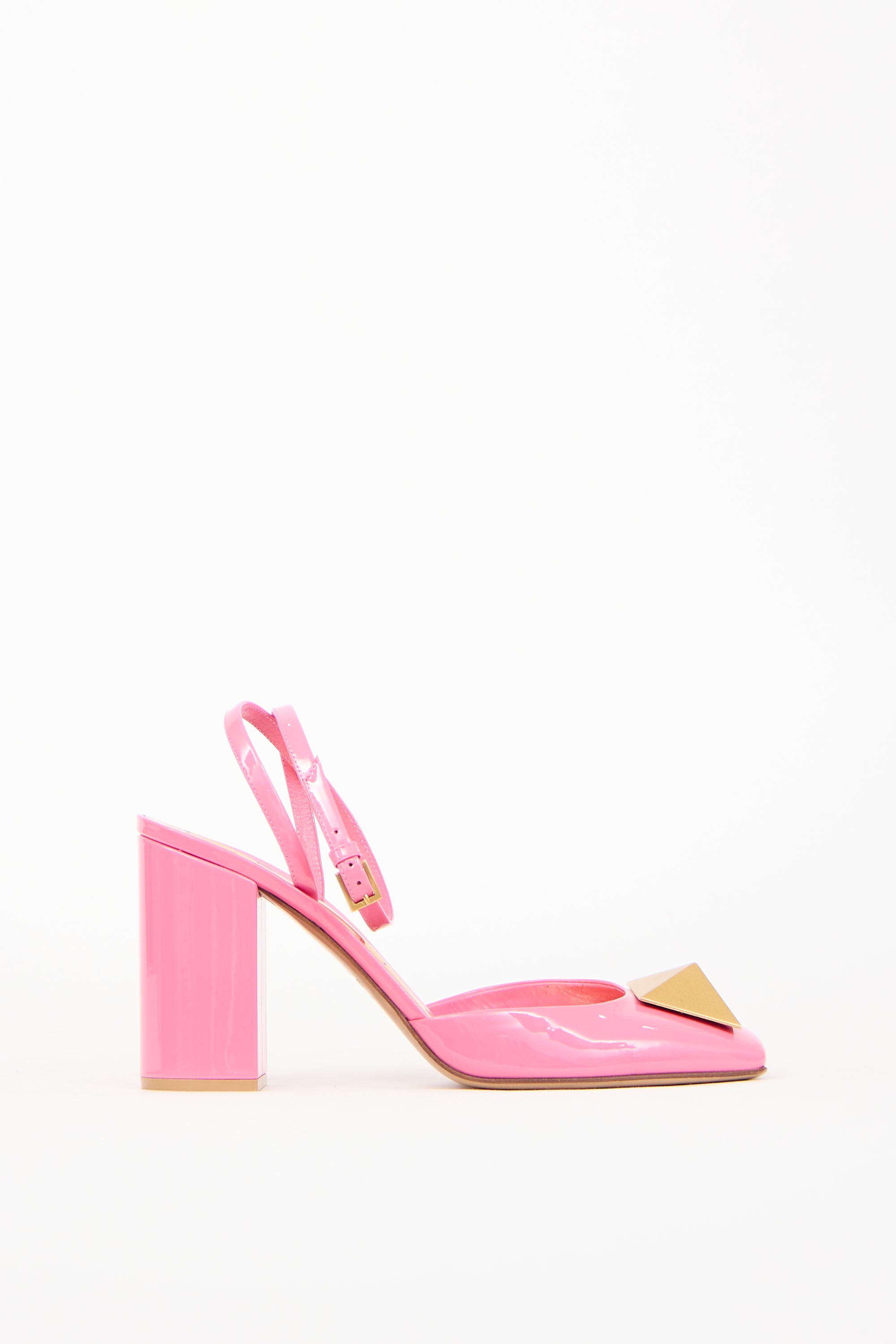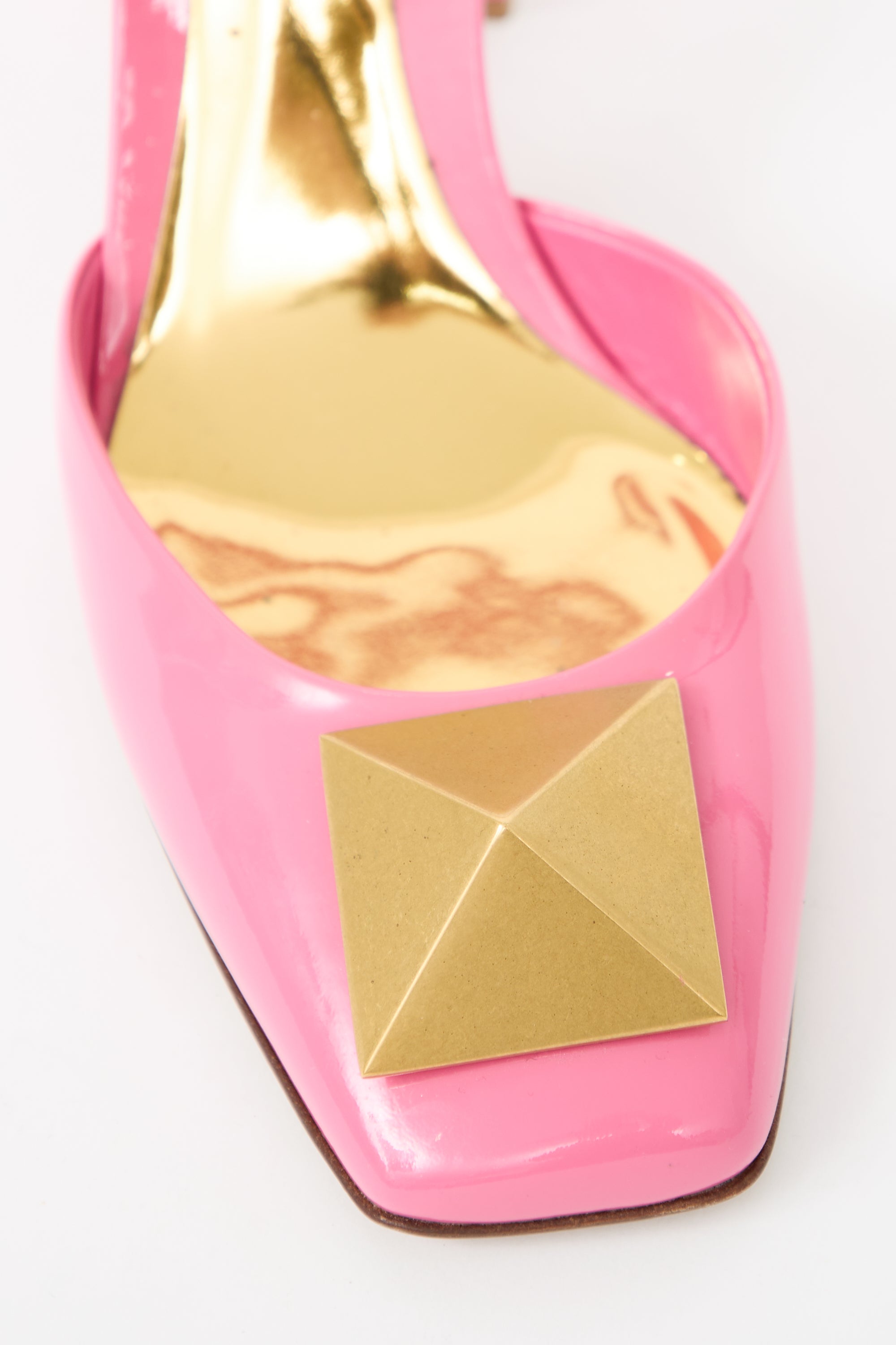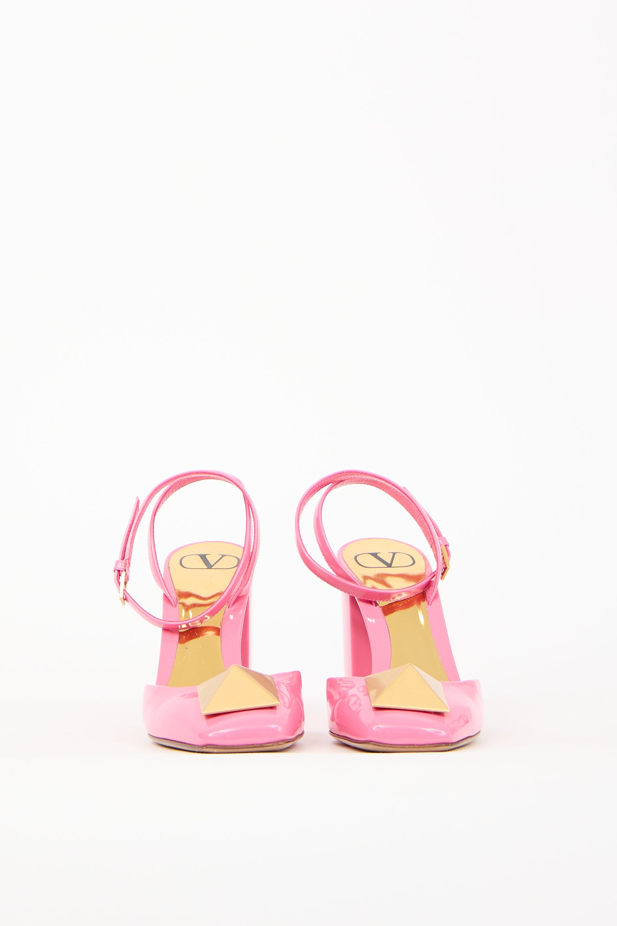 Pre-owned Valentino pink patent leather heels featuring tapered square toe, gold tone Rockstud embellishment at vamp, adjustable ankle strap, and covered block heel.