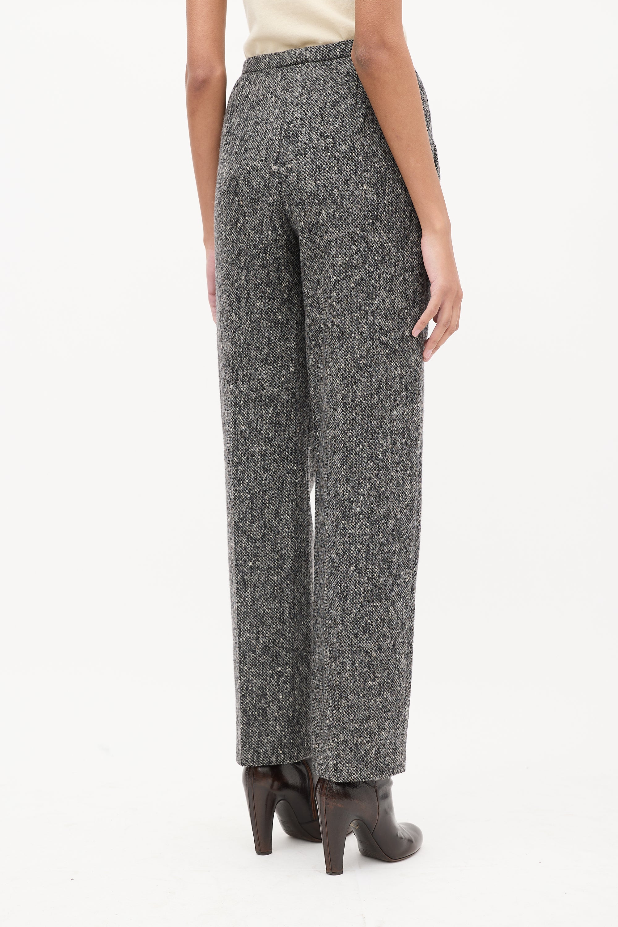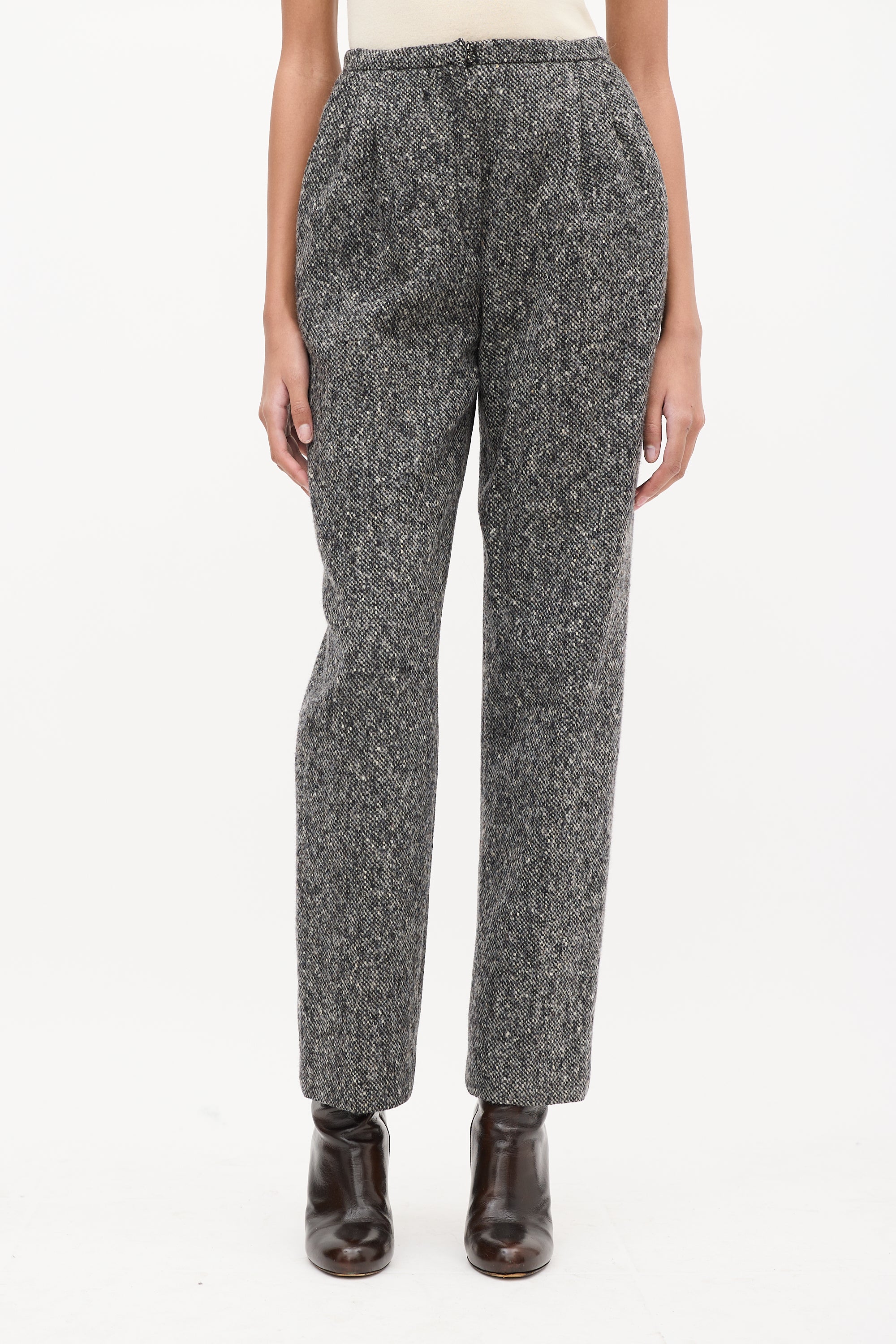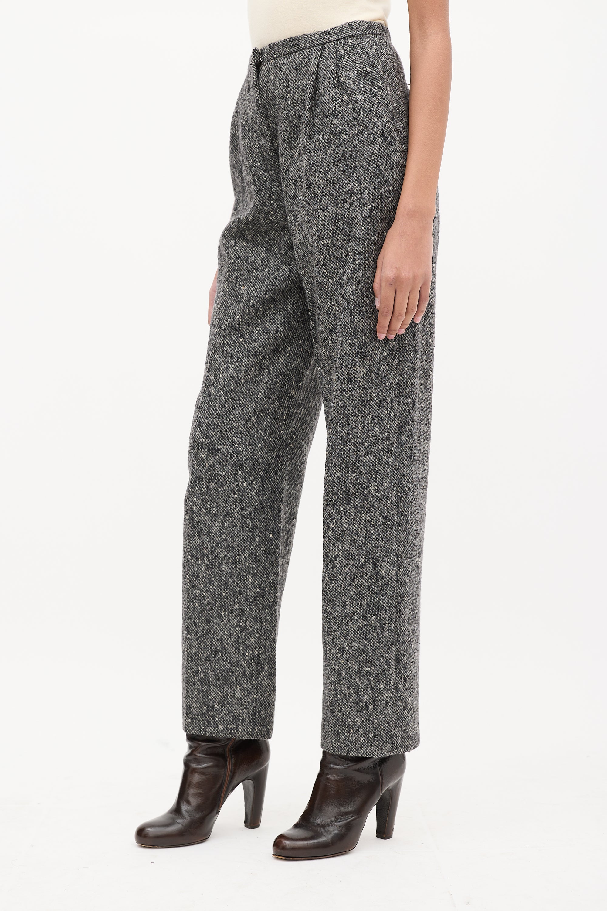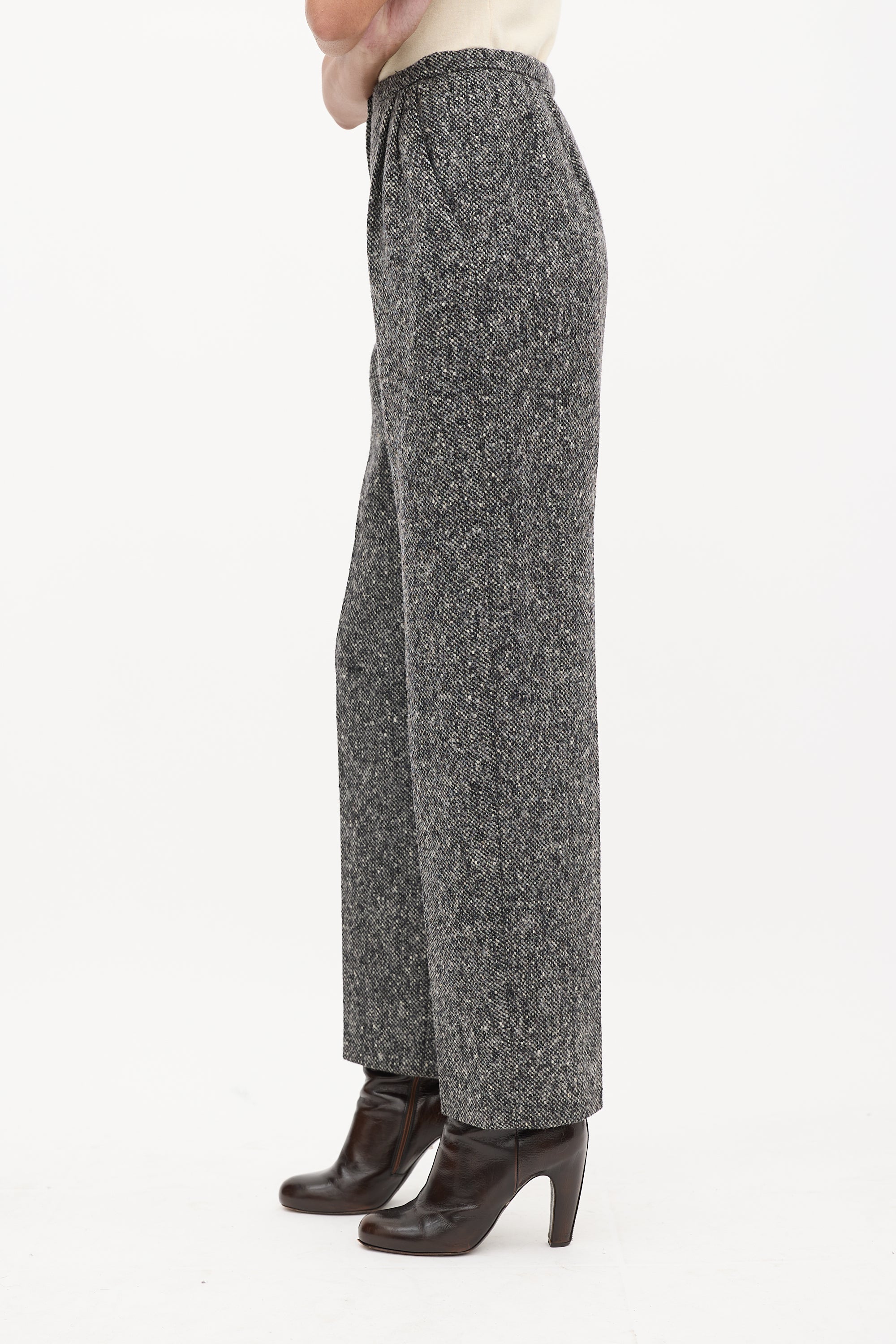 Pre-owned Valentino vintage dark grey melange tweed trousers featuring a high pleated waist, straight leg with creases, two front slash pockets, and zip fly. Lined. c. 1980s. Clipped to fit model.